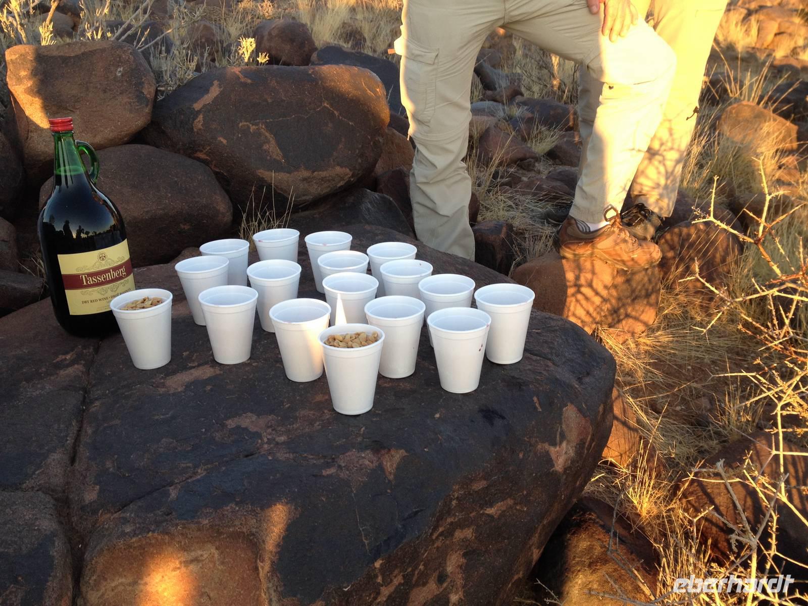 Als krönender Abschluss unseres Besuchs kosteten wir sowohl die leckeren Rot- und Weißweine als auch den Nappa, den namibianischen Grappa aus Datteln, Feigen und vielen anderen Früchten. Für unsere Weiterreise haben wir sogar noch eine ganze Kiste beste Datteln aus eigener Ernte bekommen! Vielen Dank für die Gastfreundschaft ihr beiden!