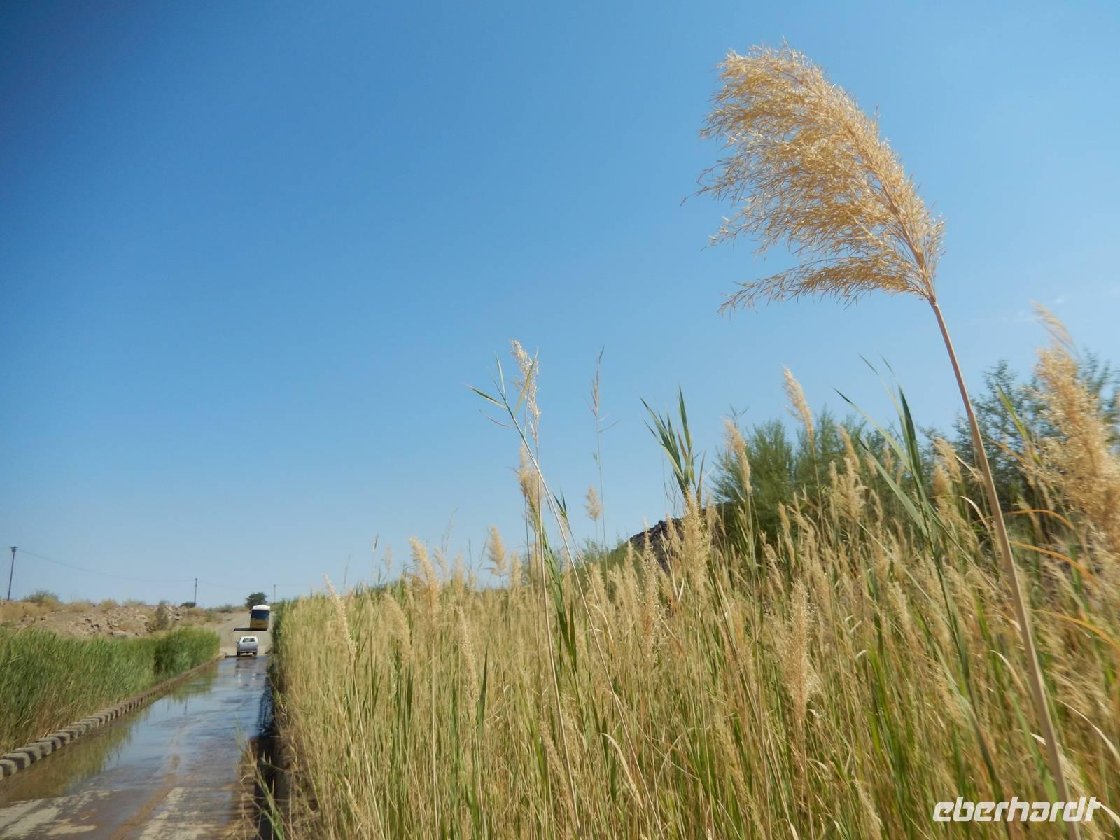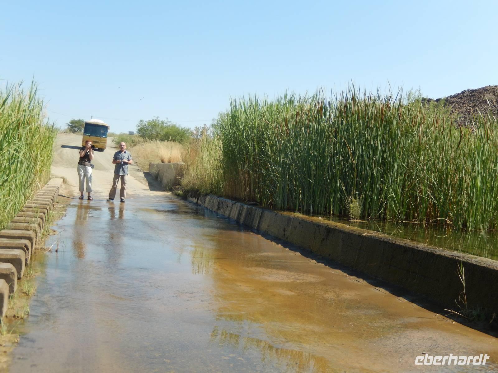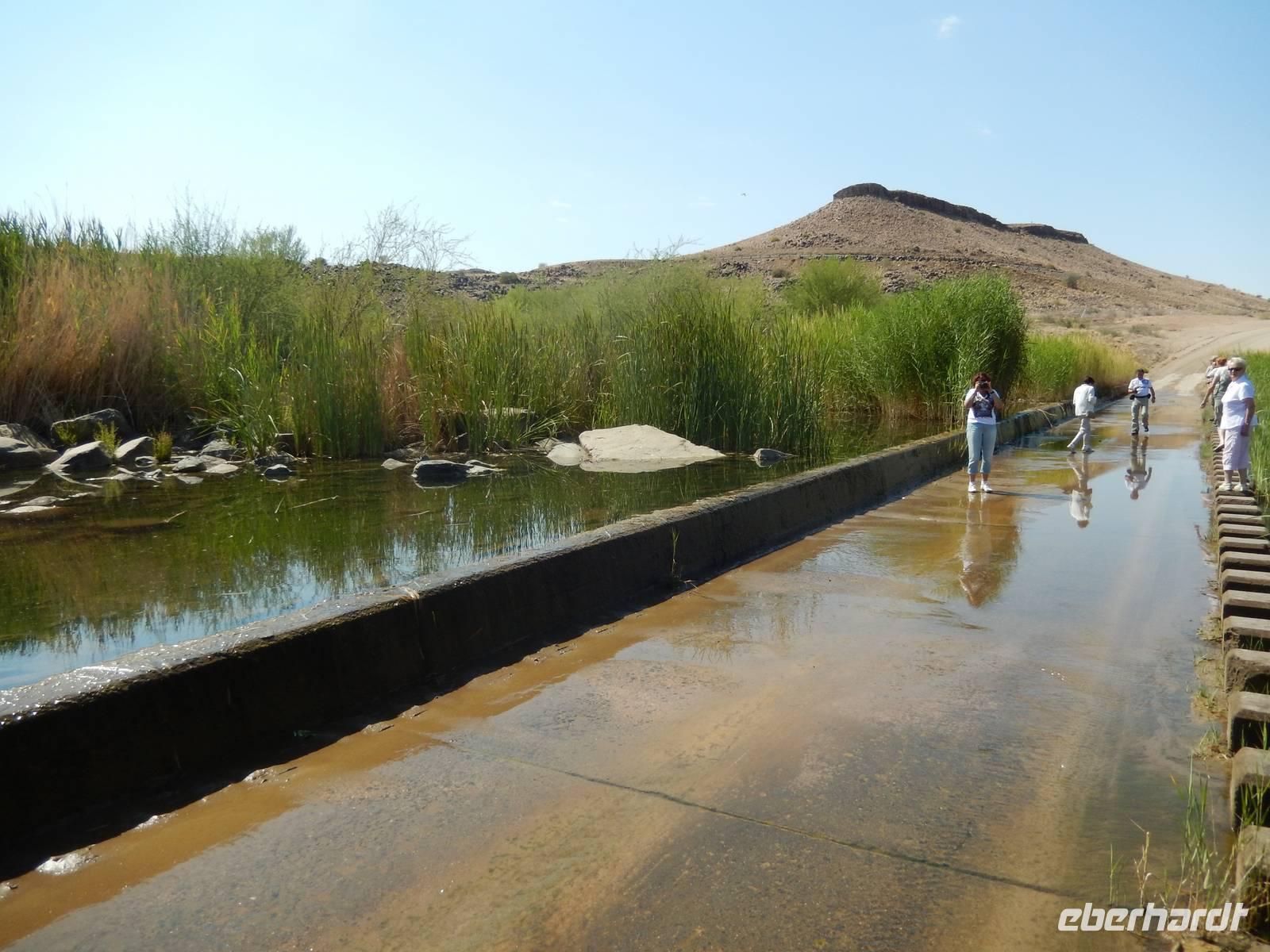 An einer kleinen Kreuzung drehten wir nach links auf eine schmale Schotterpiste ab und vor uns erhoben sich schon die Kleinen Karasberge, ein bis zu 1.500 Meter hohes Faltengebirge. Um zum Staudamm zu gelangen, mussten wir durch das Löwen-Rivier! Doch das klingt schlimmer als es ist. Denn es erwarteten uns nicht die Könige der Tiere, sondern ein kleiner Flusslauf, den wir sogar zu Fuß überqueren konnten. Denn das Wort "Rivier" bedeutet in Namibia nichts anderes als "zeitweilig wasserführenden Flusslauf". Der Weg dorthin war vom typischen Bild Namibias geprägt: Wüste, Sand und Staub. Aber als ob jemand einen Farbklecks mitten in die Landschaft gepinselt hätte, wurde es plötzlich grün. Der Damm wurde zur Wasserversorgung umliegender Ortschaften und zur Bewässerung der angelegten Obstplantagen angelegt. Auf ehemals 200 Hektar unfruchtbarem Steppenland gedeihen nun Tafeltrauben, Datteln, Kaktusfeigen, Affenorangen und Granatäpfel.