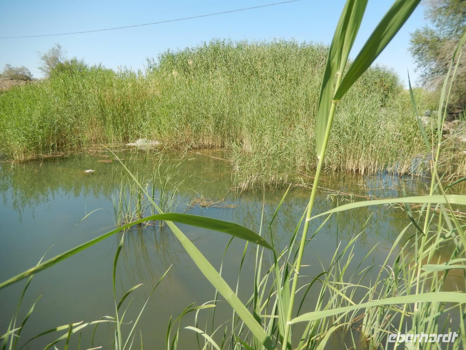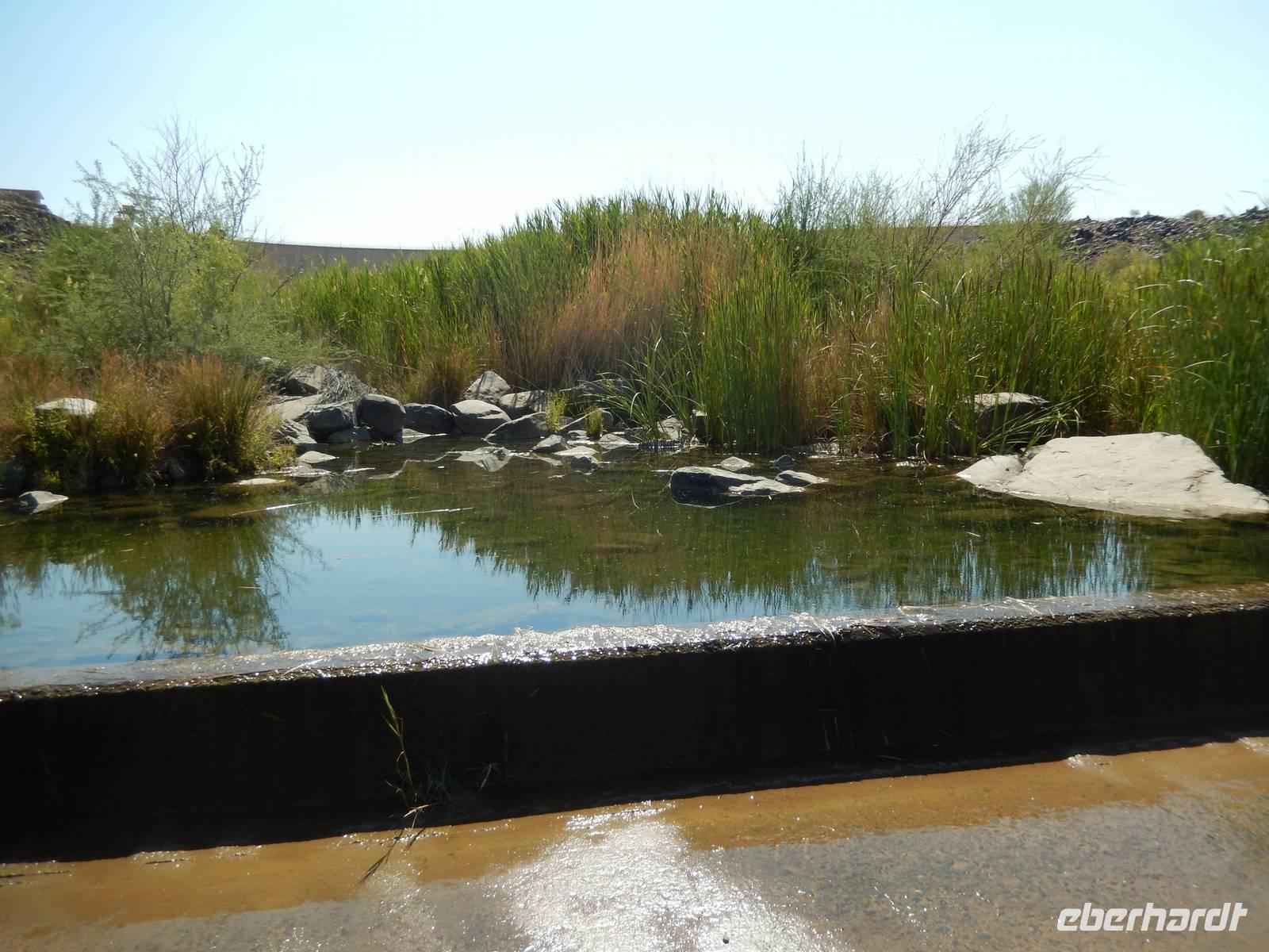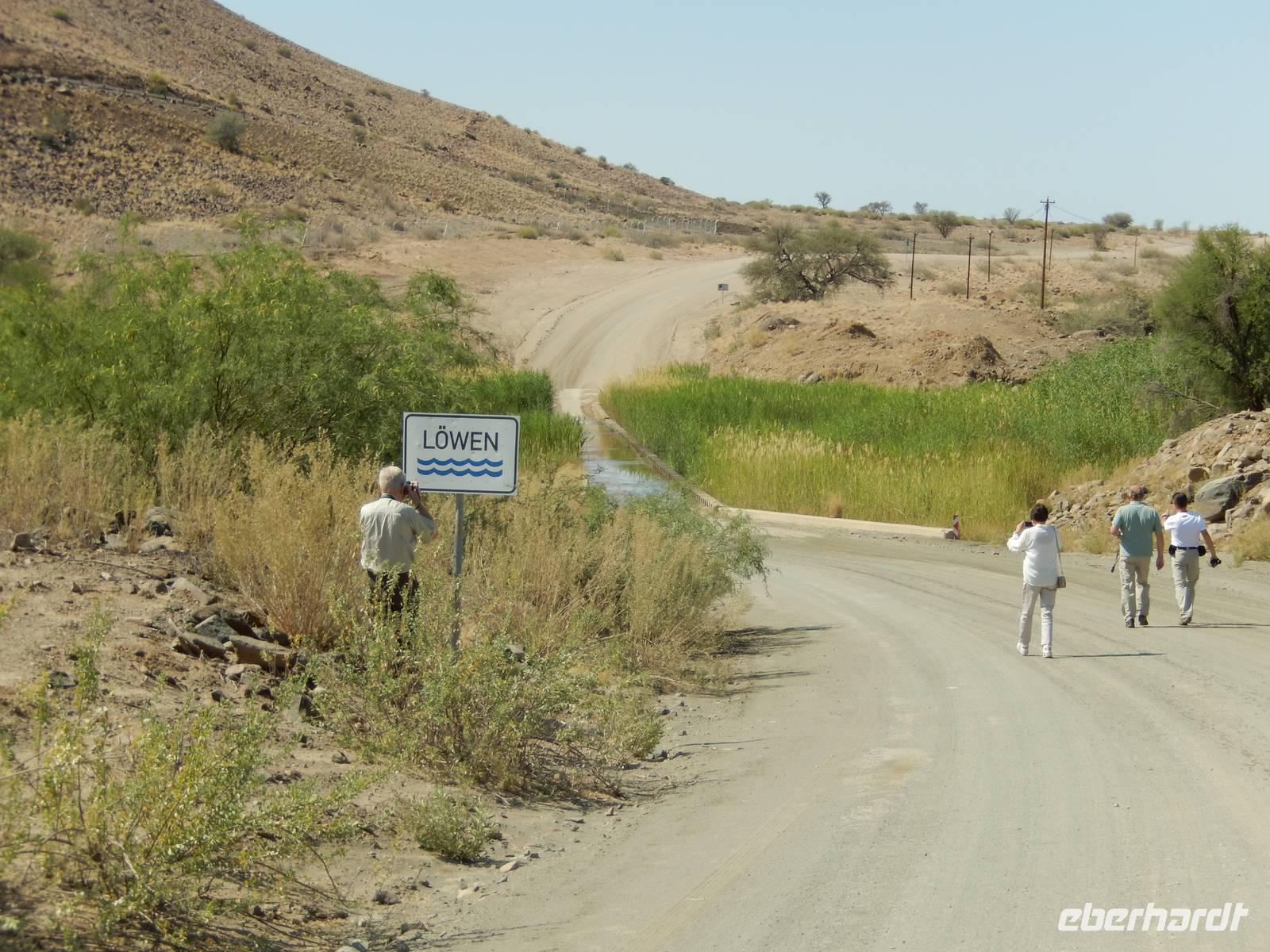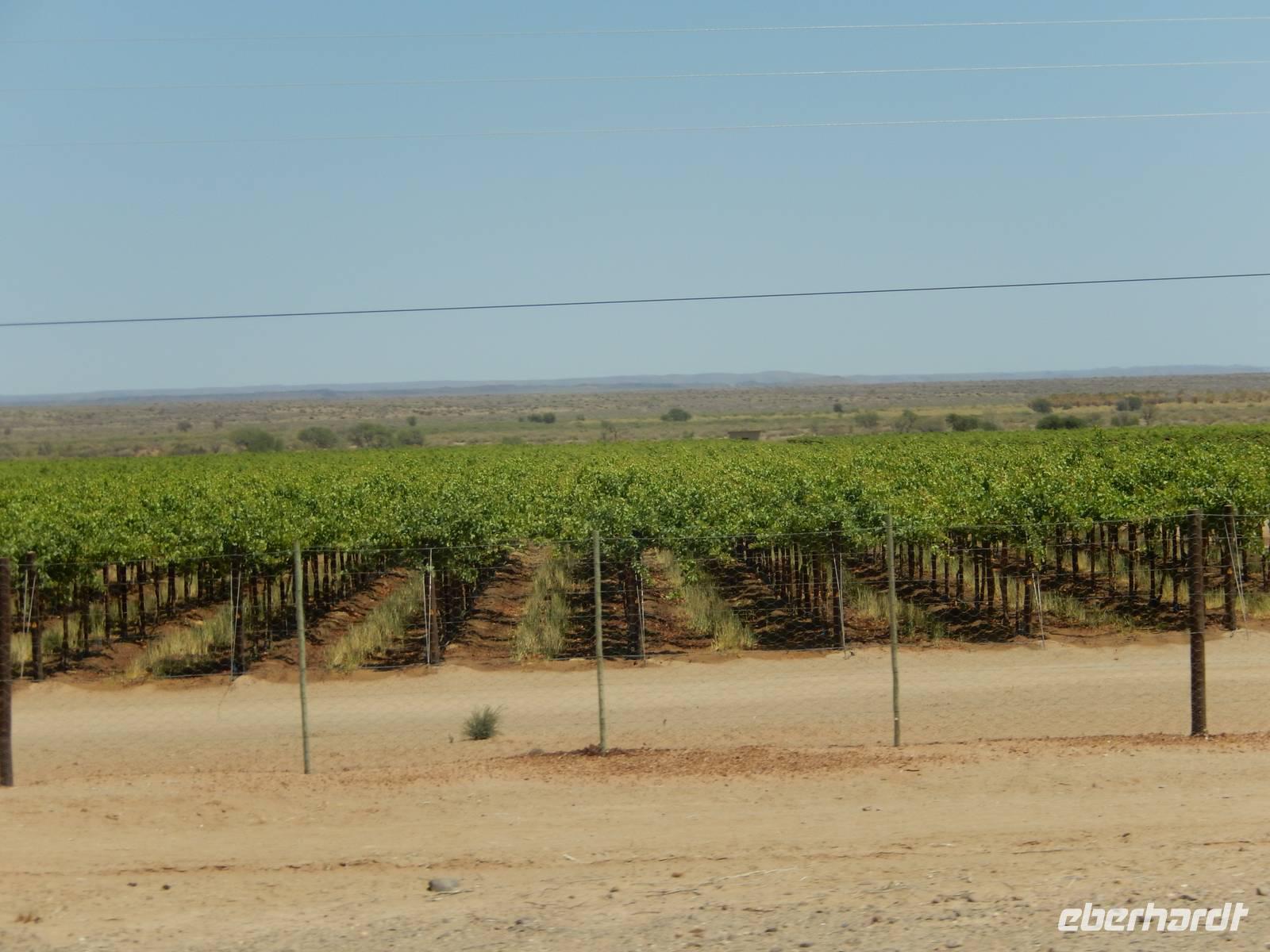 An einer kleinen Kreuzung drehten wir nach links auf eine schmale Schotterpiste ab und vor uns erhoben sich schon die Kleinen Karasberge, ein bis zu 1.500 Meter hohes Faltengebirge. Um zum Staudamm zu gelangen, mussten wir durch das Löwen-Rivier! Doch das klingt schlimmer als es ist. Denn es erwarteten uns nicht die Könige der Tiere, sondern ein kleiner Flusslauf, den wir sogar zu Fuß überqueren konnten. Denn das Wort "Rivier" bedeutet in Namibia nichts anderes als "zeitweilig wasserführenden Flusslauf". Der Weg dorthin war vom typischen Bild Namibias geprägt: Wüste, Sand und Staub. Aber als ob jemand einen Farbklecks mitten in die Landschaft gepinselt hätte, wurde es plötzlich grün. Der Damm wurde zur Wasserversorgung umliegender Ortschaften und zur Bewässerung der angelegten Obstplantagen angelegt. Auf ehemals 200 Hektar unfruchtbarem Steppenland gedeihen nun Tafeltrauben, Datteln, Kaktusfeigen, Affenorangen und Granatäpfel.