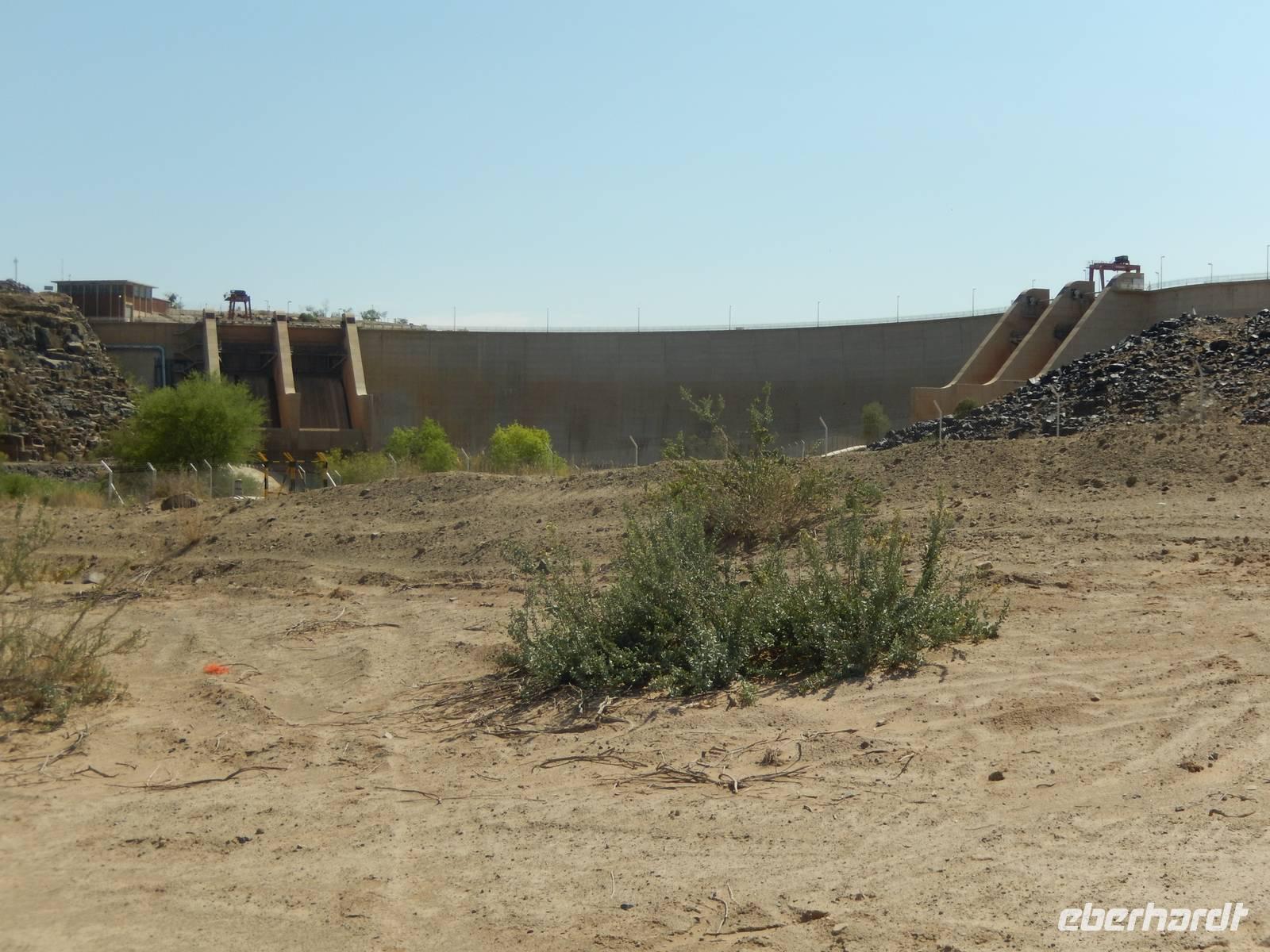 Obwohl der Naute-Damm der drittgrößte Staudamm des Landes ist, ließen wir die Staumauer (450 Meter lang, 37 Meter) nach einem schnellen Foto links liegen und widmeten uns dem Weinanbau in Namibia. Erst seit kurzem haben sich hier am Damm Familie Weder niedergelassen. Die Weinproduzenten aus Omaruru (nördlich von Windhoek) sind gerade dabei, unter dem Motto "Naute Dam Brennerei" eine neue Brennerei hier zu etablieren. Auch wenn die Bauarbeiten gerade in vollem Gange waren, haben uns Katrin und Michael kurzum die Tore geöffnet und uns über die Geheimnisse und Schwierigkeiten einer solchen Anlage hier in Namibia berichtet. Voller Ehrgeiz und Beharrlichkeit stellen sie hier etwas Tolles auf die Beine. Ja, es sie noch, die unbekümmerten Pioniere, mit der Freude am Anpacken und Vorantreiben!