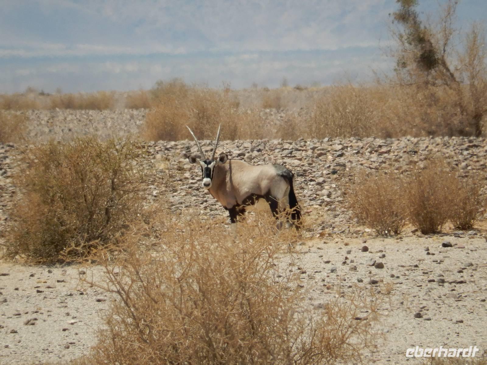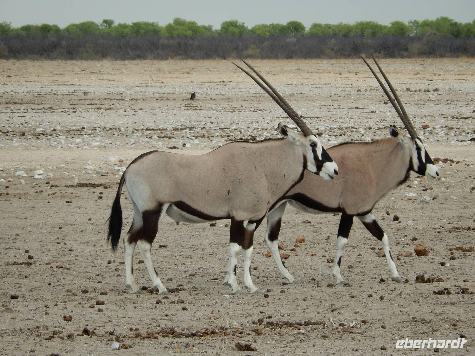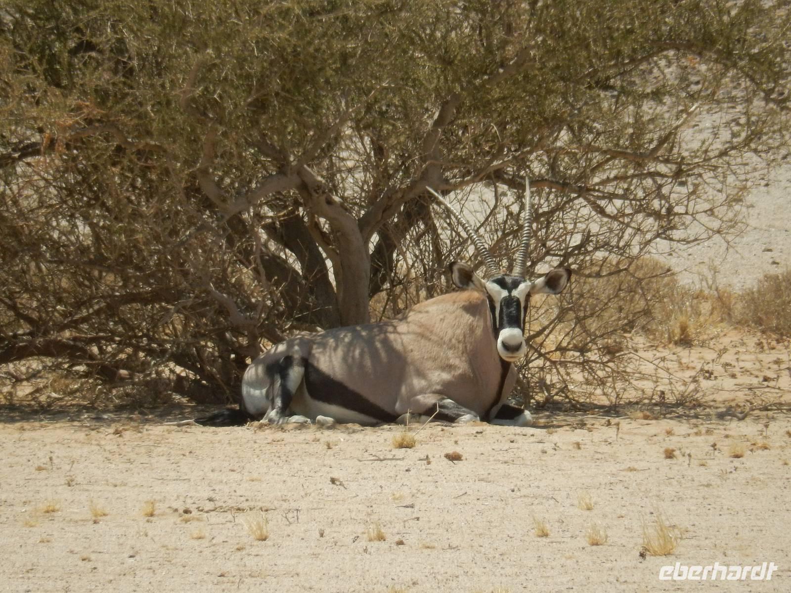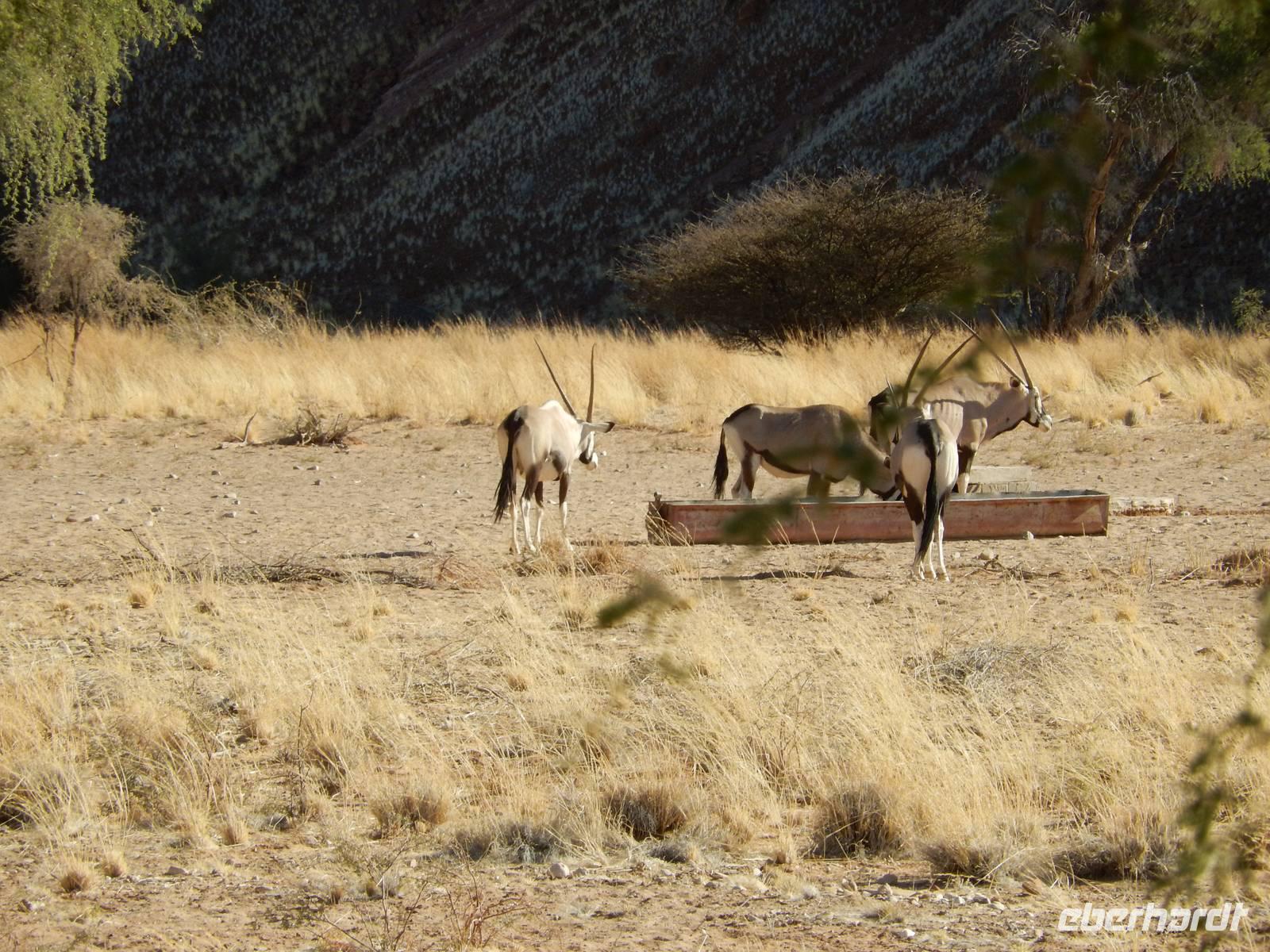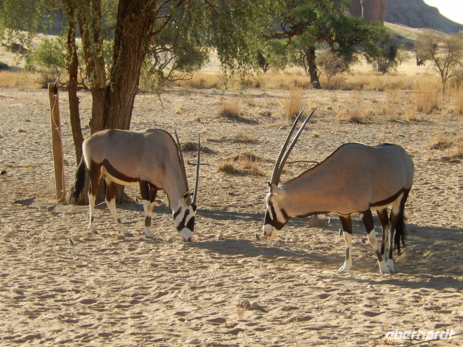 Nach diesem tollen Erlebnis düsten wir auf der Schotterpiste weiter in Richtung unserer heutigen Unterkunft - der Canon Village Lodge. Doch zuvor zückten wir unsere Kameras und fotografierten die ersten Oryx-Antilopen an der Strecke - stattliche Tiere sind das!