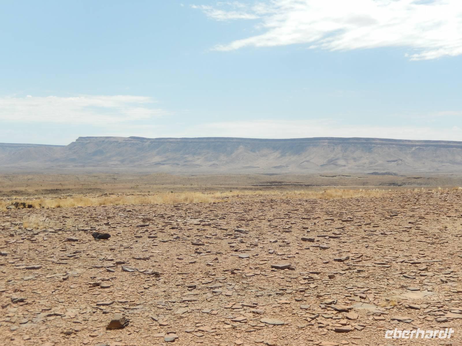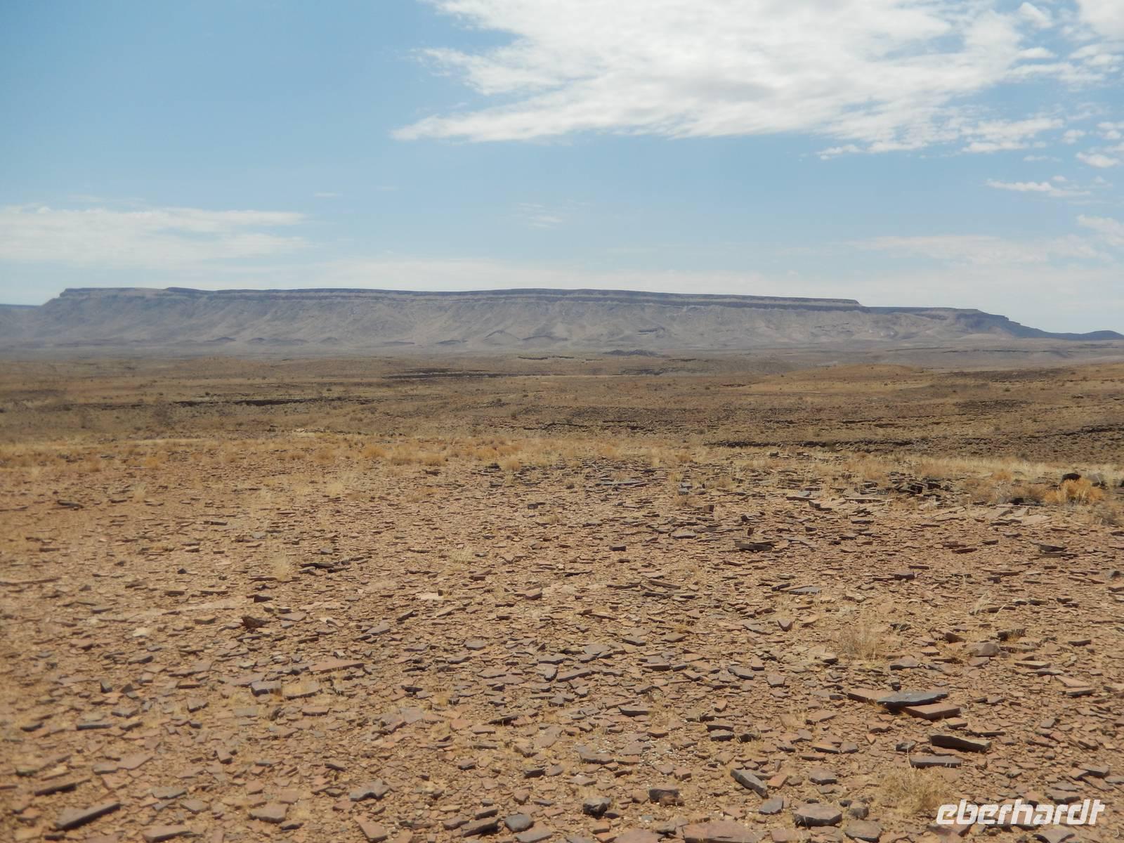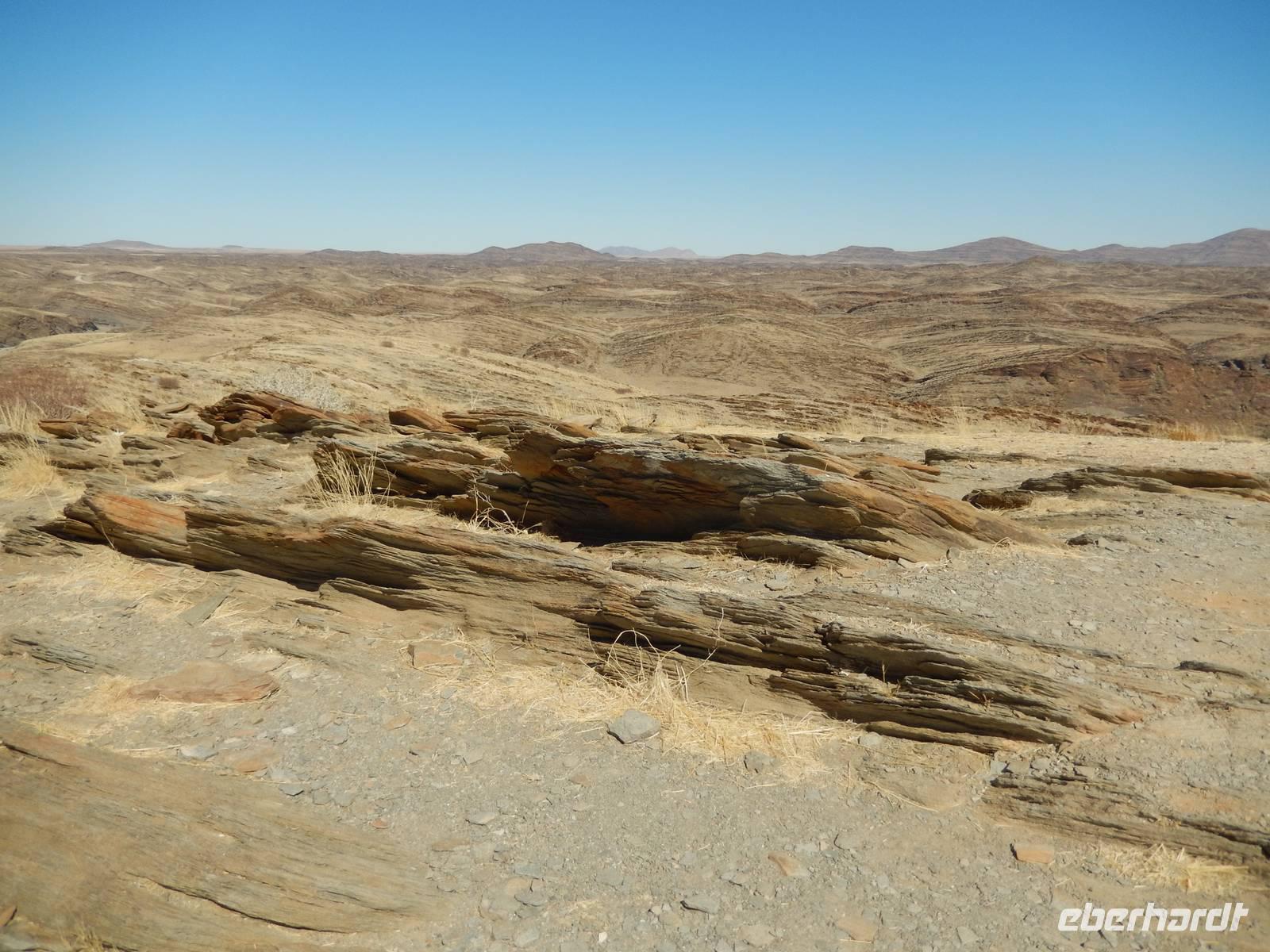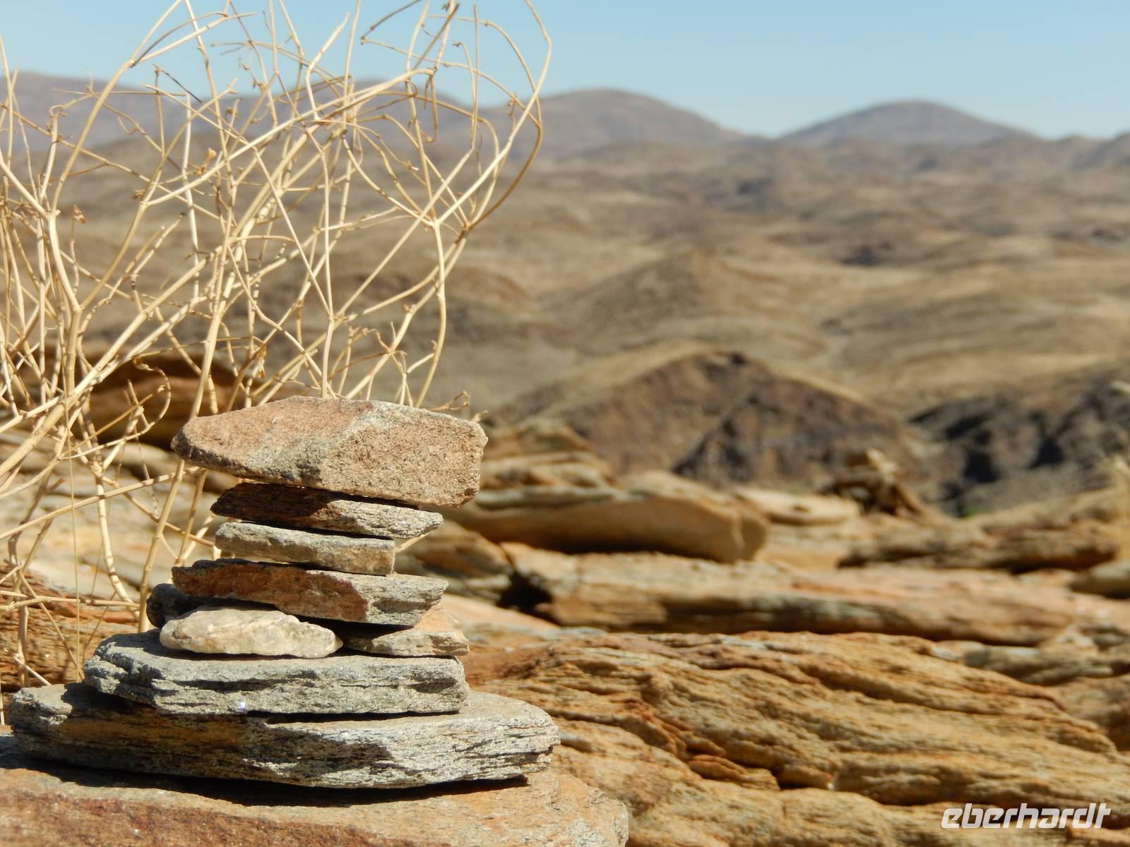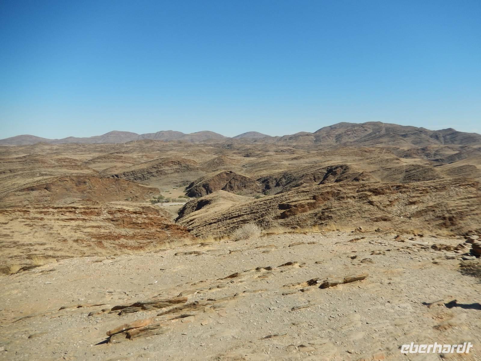 Auf der wohl bisher schlechtesten Piste der Reise, rechts und links von uns Leere soweit das Auge reicht, führte uns die Fahrt in Richtung Küste. Bei den "singenden Steinen" haben wir einen kurzen Halt gemacht, bevor wir weiter in Richtung Welwitschia-Drive gefahren sind.