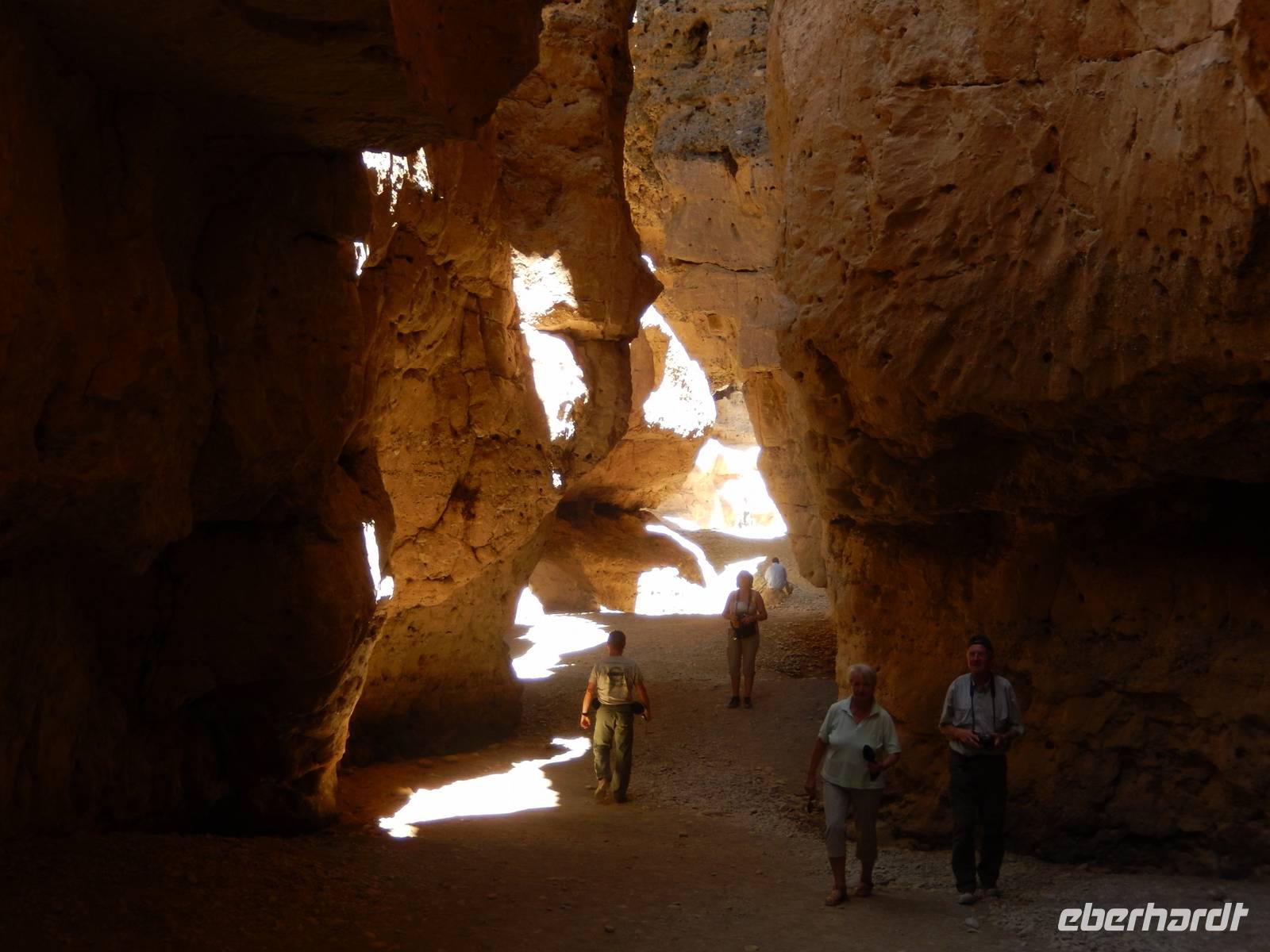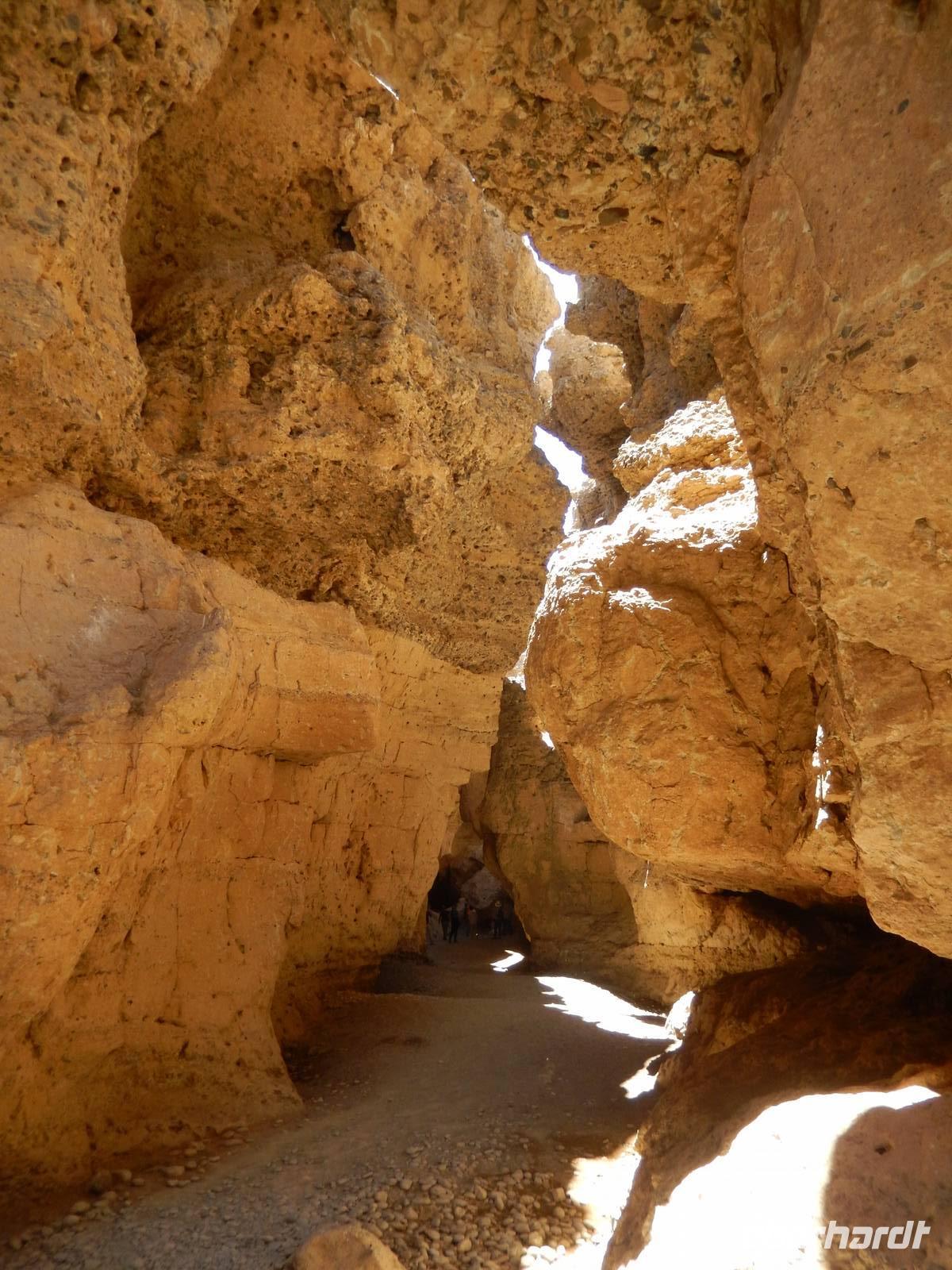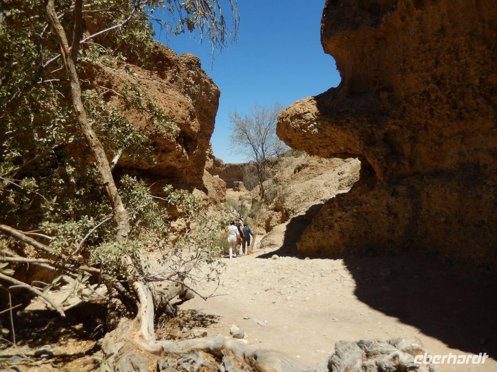 Nach diesem Erlebnis brachten uns die Jeeps wieder zurück zum Bus. Der letzte Programmpunkt war nun der Sesriem Canyon, den der Trockenfluss Tsauchab im Zeitraum von zwei Millionen Jahren 80 Kilometer westlich seines Ursprungs ca. ein Kilometer lang und bis zu 30 Meter tief in das Sedimentgestein hineingefressen hat. Der Name bedeutet "Sechs Riemen", denn sechs Lederriemen, mit jeweils einer Länge von drei Metern, mussten zusammengeknüpft werden, um einen Eimer Wasser aus dem Canyon zu ziehen. In dieser abstrakten, schattigen Schlucht wanderten wir etwas umher und ließen unserer Phantasie wieder freien Lauf, was die Felsformationen wohl darstellen könnten.