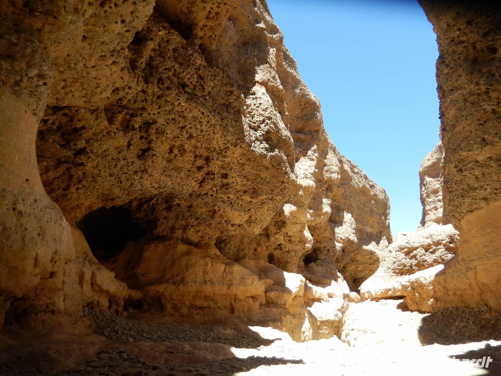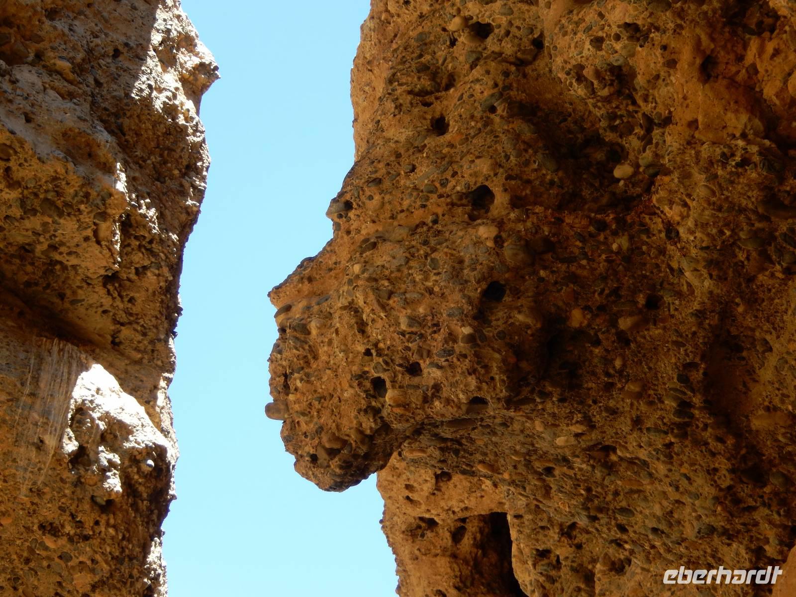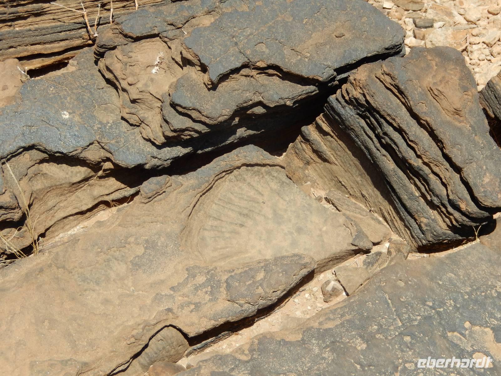 Nach diesem Erlebnis brachten uns die Jeeps wieder zurück zum Bus. Der letzte Programmpunkt war nun der Sesriem Canyon, den der Trockenfluss Tsauchab im Zeitraum von zwei Millionen Jahren 80 Kilometer westlich seines Ursprungs ca. ein Kilometer lang und bis zu 30 Meter tief in das Sedimentgestein hineingefressen hat. Der Name bedeutet "Sechs Riemen", denn sechs Lederriemen, mit jeweils einer Länge von drei Metern, mussten zusammengeknüpft werden, um einen Eimer Wasser aus dem Canyon zu ziehen. In dieser abstrakten, schattigen Schlucht wanderten wir etwas umher und ließen unserer Phantasie wieder freien Lauf, was die Felsformationen wohl darstellen könnten.