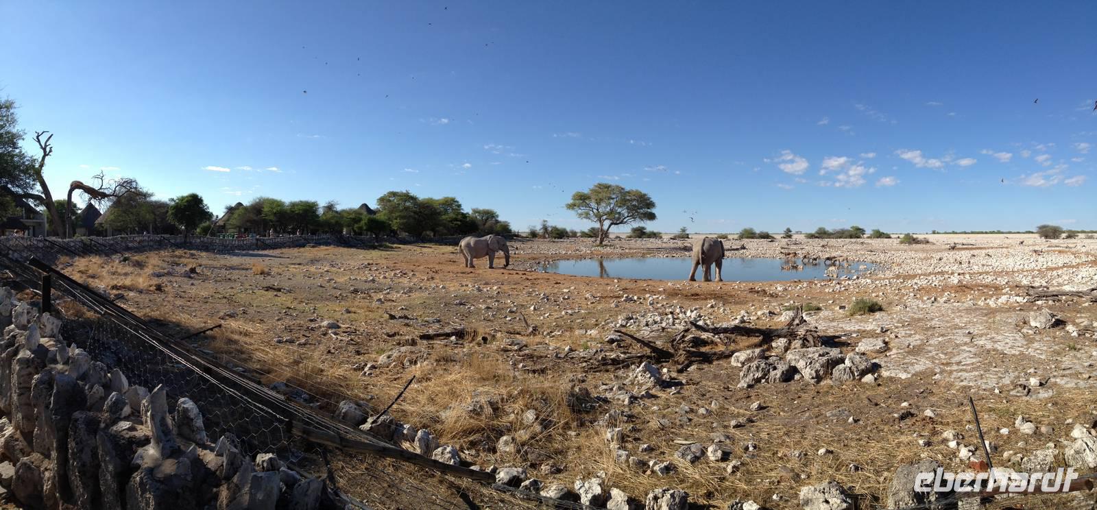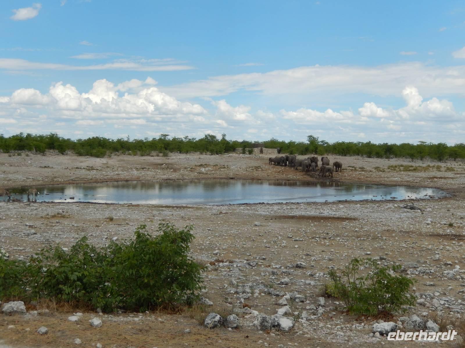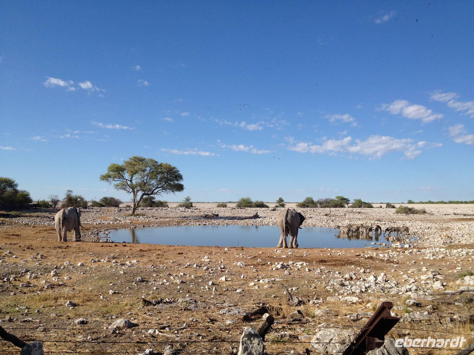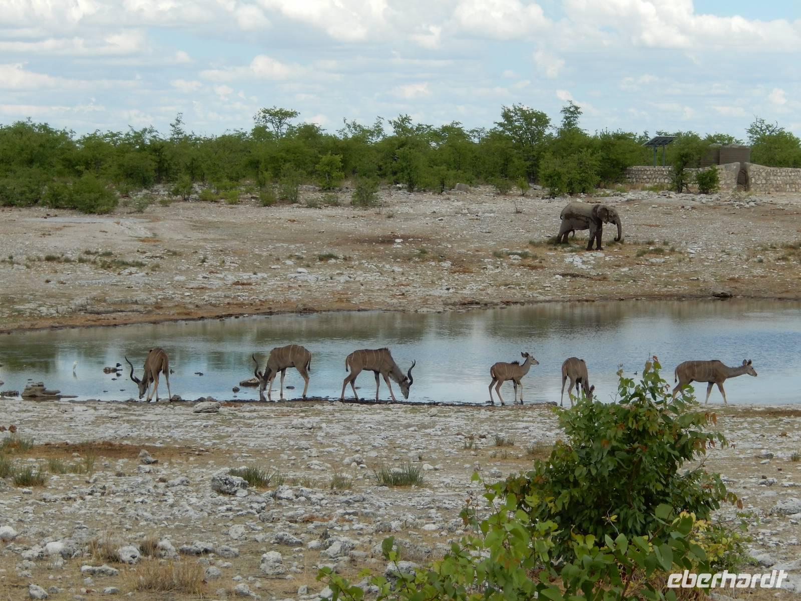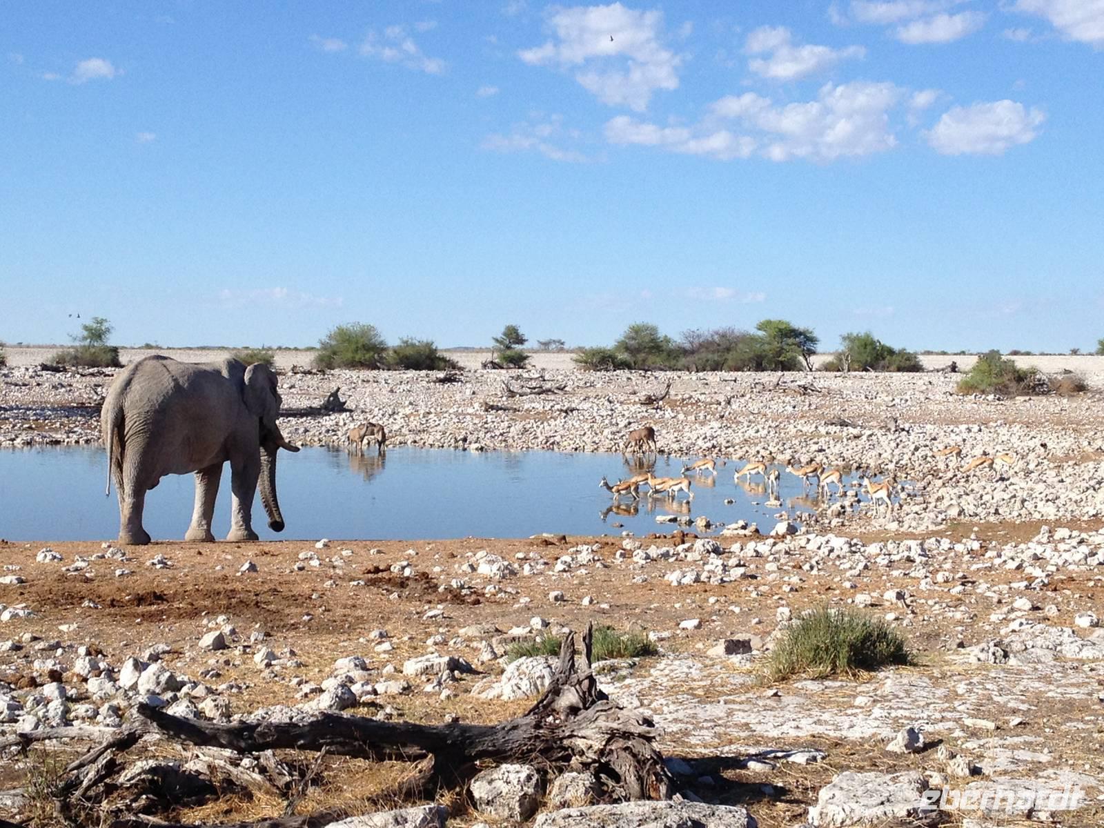 Nach dem Frühstück und dem Kofferladen war noch etwas Zeit bis zur Abfahrt. Einige der Gruppe flitzen nochmal hinunter zum Wasserloch um zu schauen, ob noch etwas zu sehen ist. Wir haben nicht wirklich daran geglaubt, aber es war wie bei "König der Löwen" - nur ohne Löwen. Wir bekamen das RICHTIGE Afrika-Bild geboten. Elefanten, Steppenzebras, Kudus und Springböcke stillten ihren Durst am morgendlichen Wasserloch direkt neben unserem Camp - so fing der Tag schon wieder "tierisch" gut an.