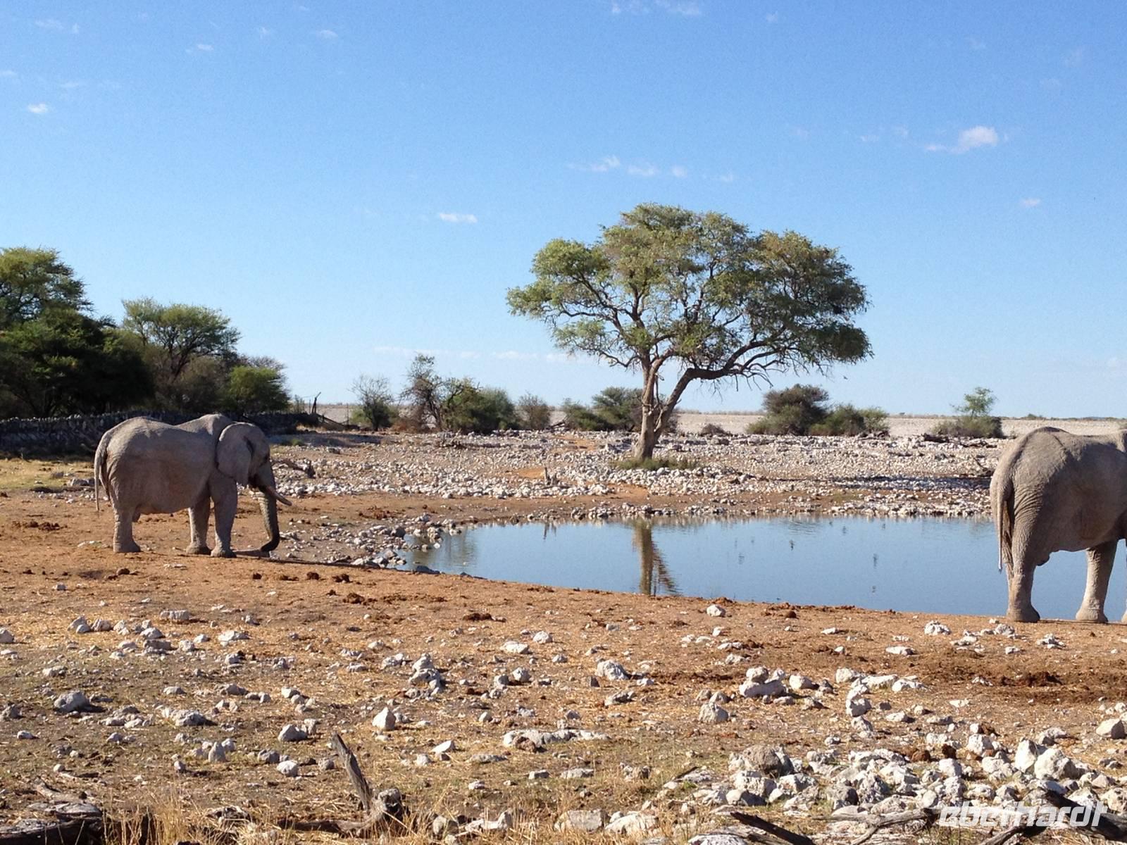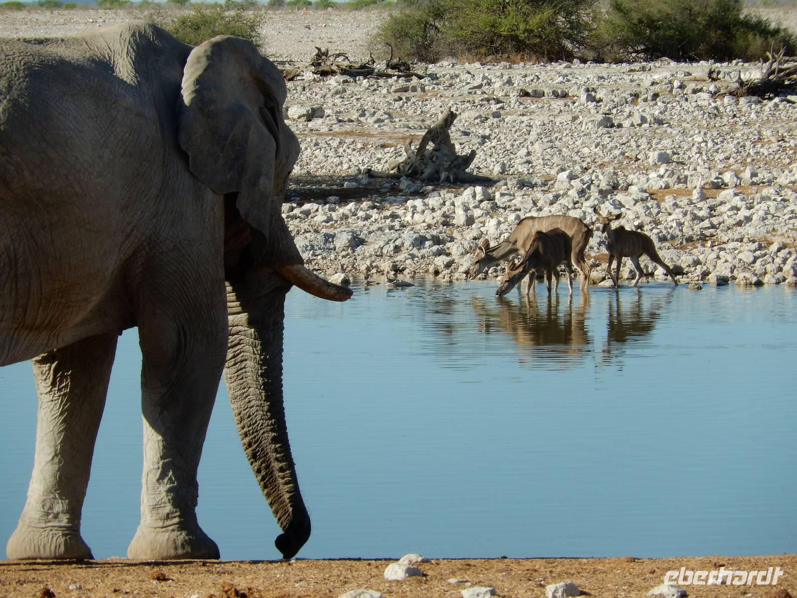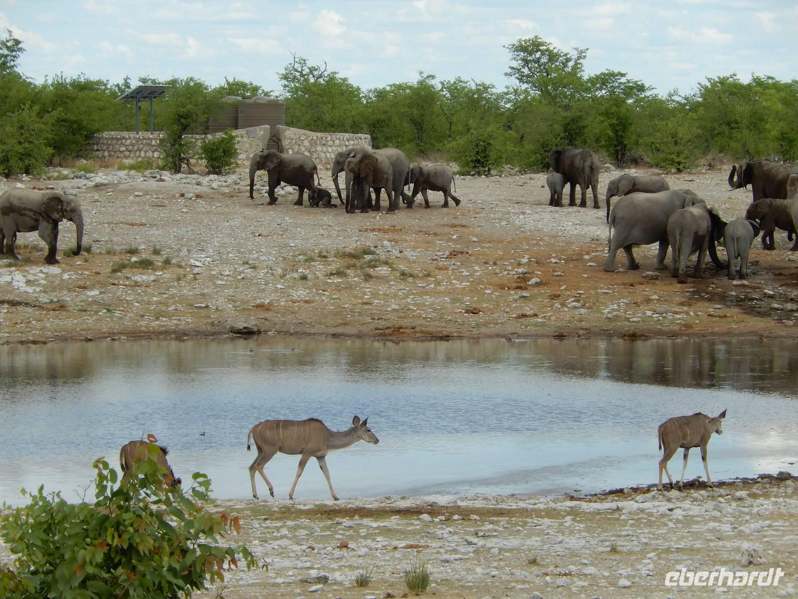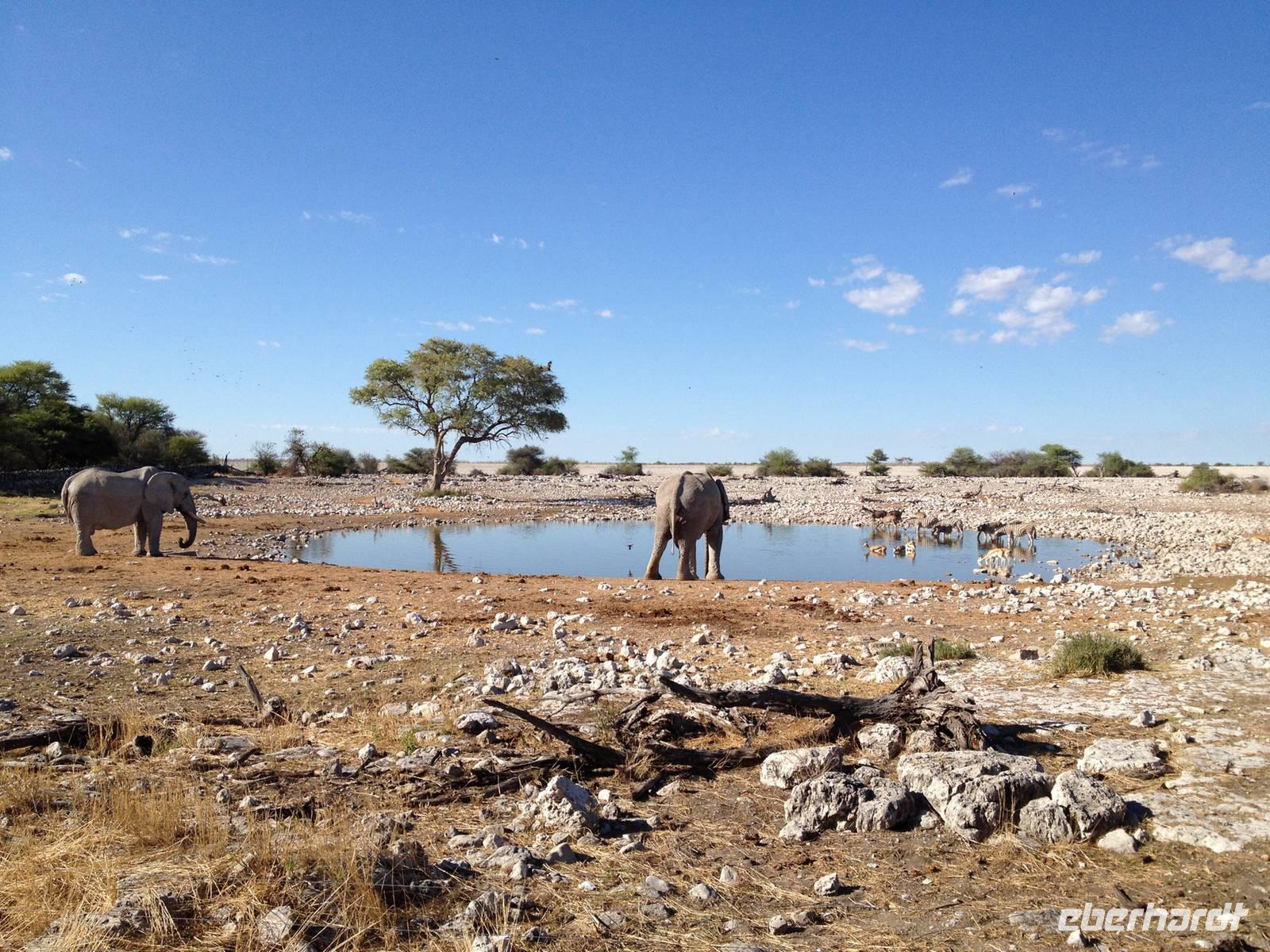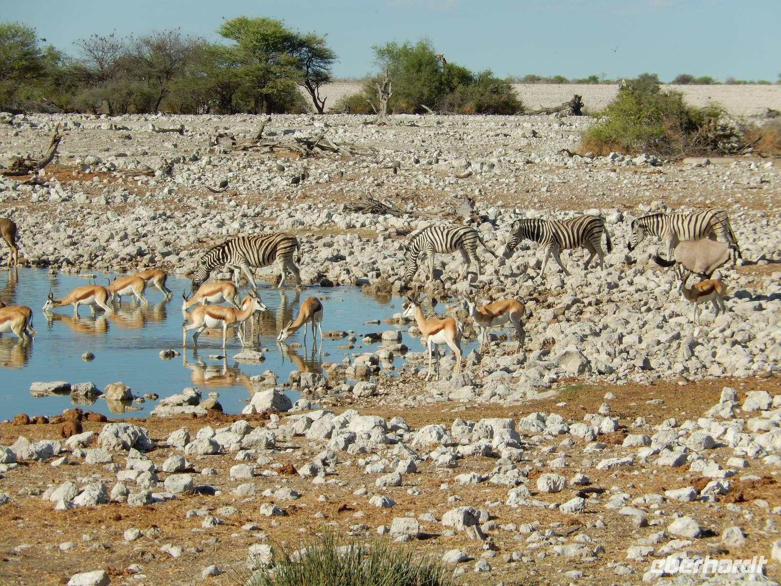 Nach dem Frühstück und dem Kofferladen war noch etwas Zeit bis zur Abfahrt. Einige der Gruppe flitzen nochmal hinunter zum Wasserloch um zu schauen, ob noch etwas zu sehen ist. Wir haben nicht wirklich daran geglaubt, aber es war wie bei "König der Löwen" - nur ohne Löwen. Wir bekamen das RICHTIGE Afrika-Bild geboten. Elefanten, Steppenzebras, Kudus und Springböcke stillten ihren Durst am morgendlichen Wasserloch direkt neben unserem Camp - so fing der Tag schon wieder "tierisch" gut an.
