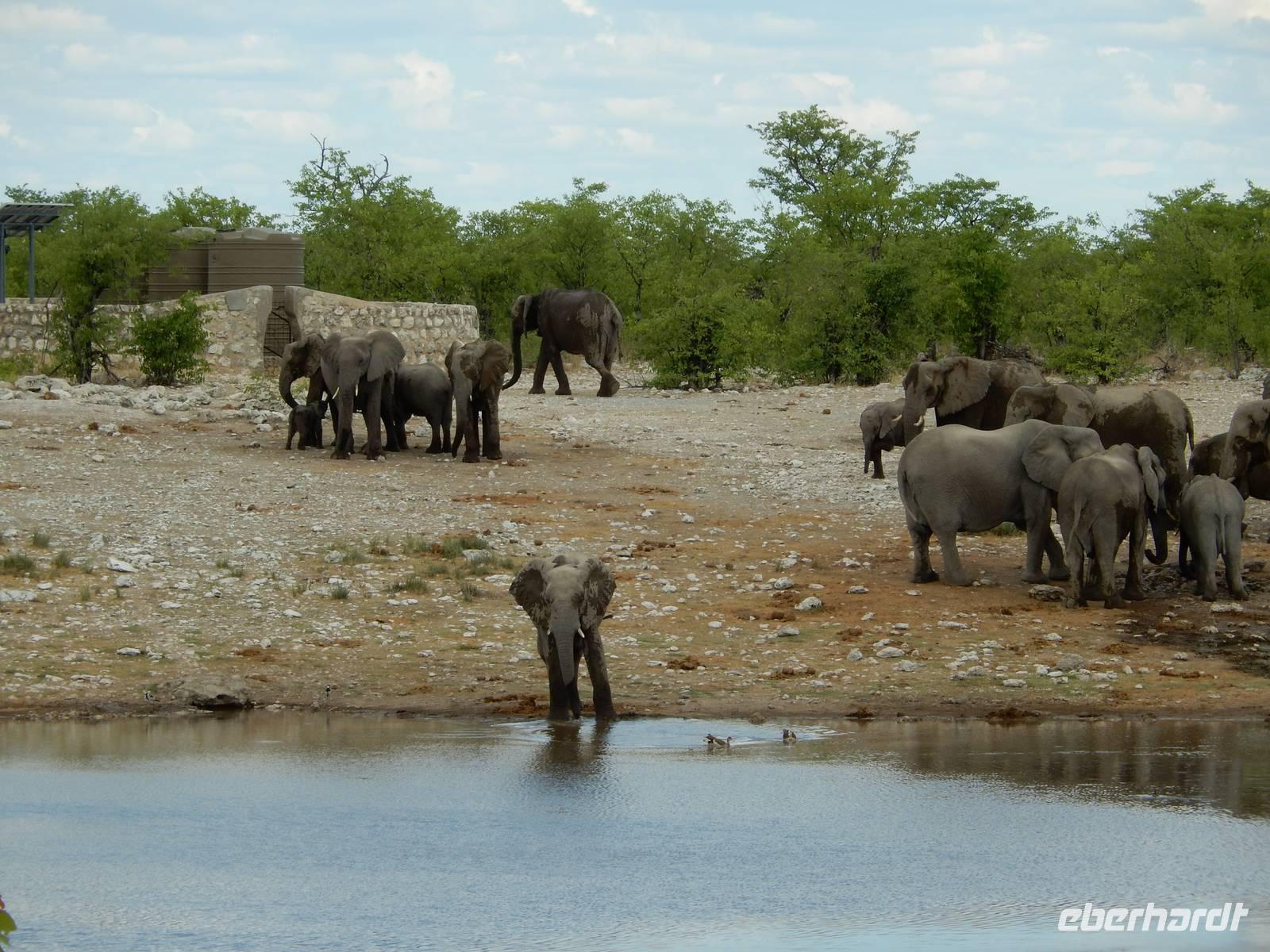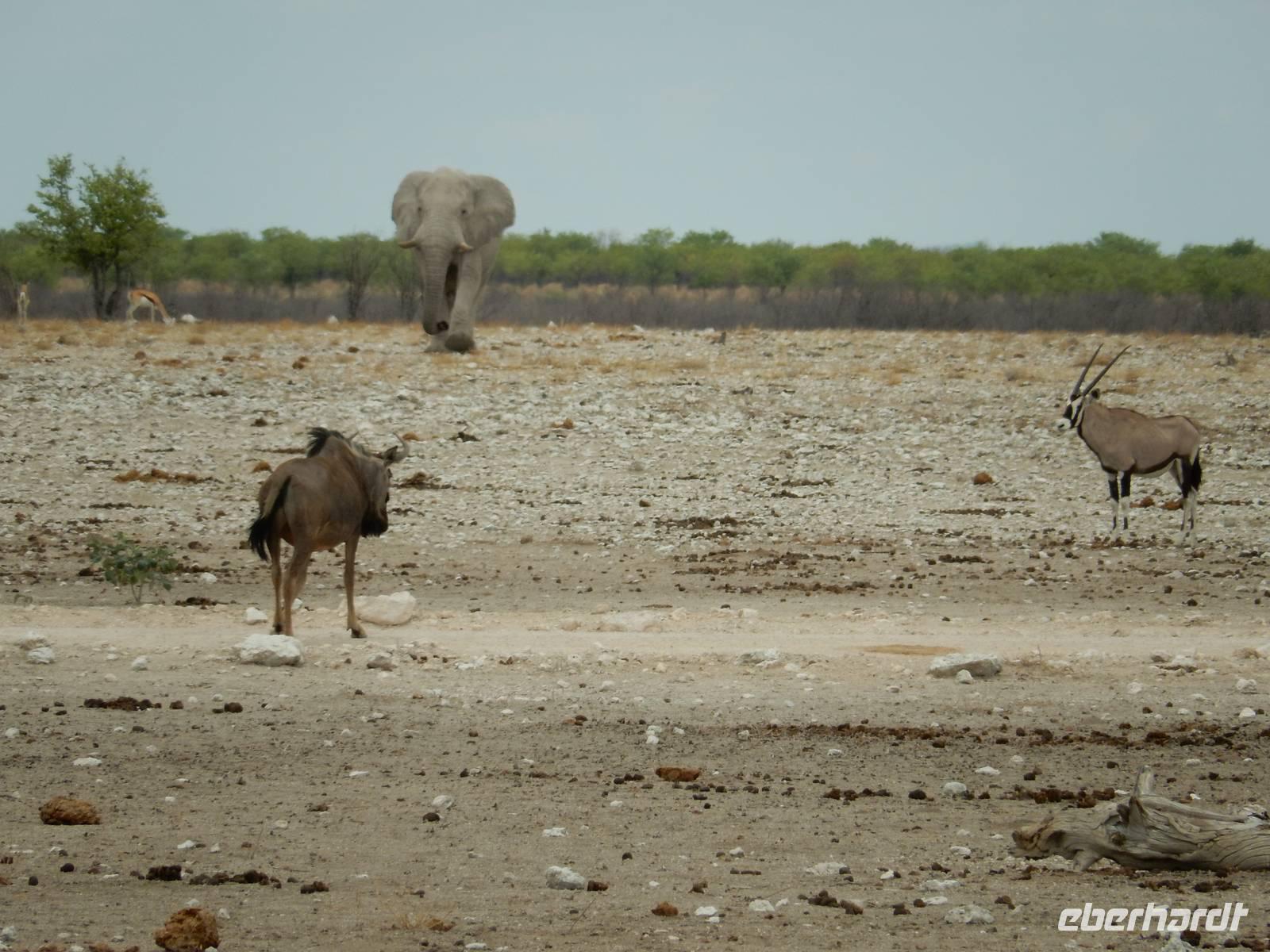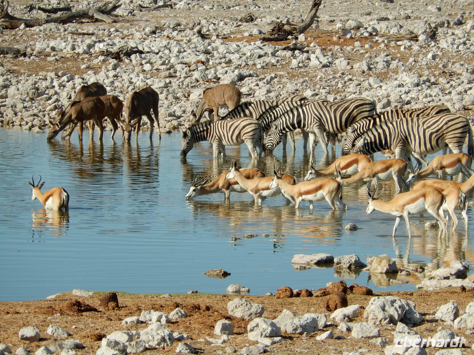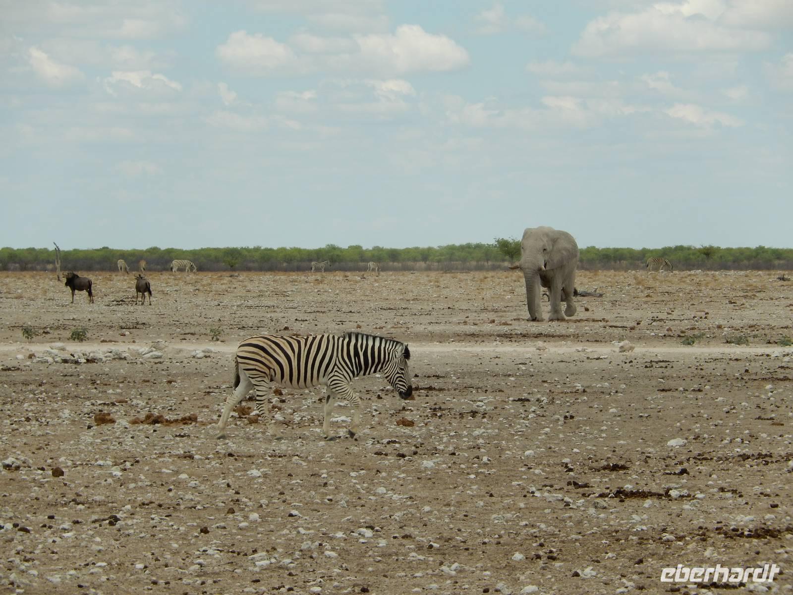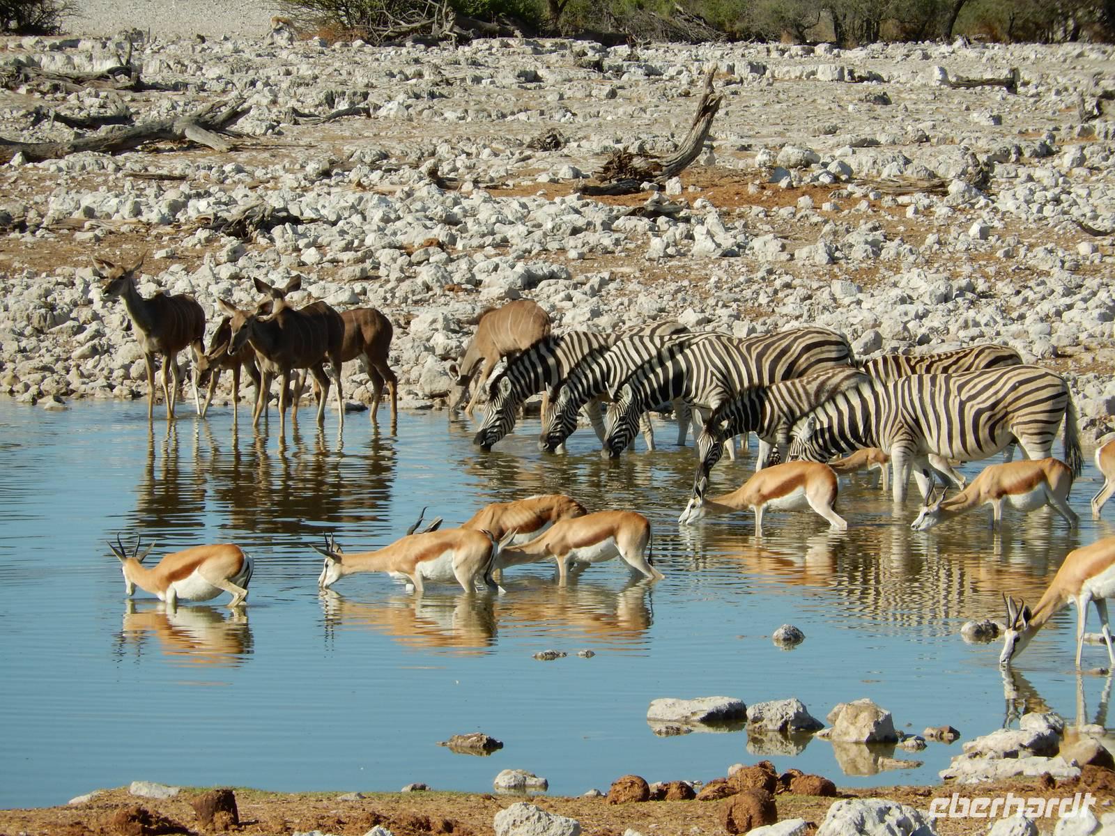 Nach dem Frühstück und dem Kofferladen war noch etwas Zeit bis zur Abfahrt. Einige der Gruppe flitzen nochmal hinunter zum Wasserloch um zu schauen, ob noch etwas zu sehen ist. Wir haben nicht wirklich daran geglaubt, aber es war wie bei "König der Löwen" - nur ohne Löwen. Wir bekamen das RICHTIGE Afrika-Bild geboten. Elefanten, Steppenzebras, Kudus und Springböcke stillten ihren Durst am morgendlichen Wasserloch direkt neben unserem Camp - so fing der Tag schon wieder "tierisch" gut an.