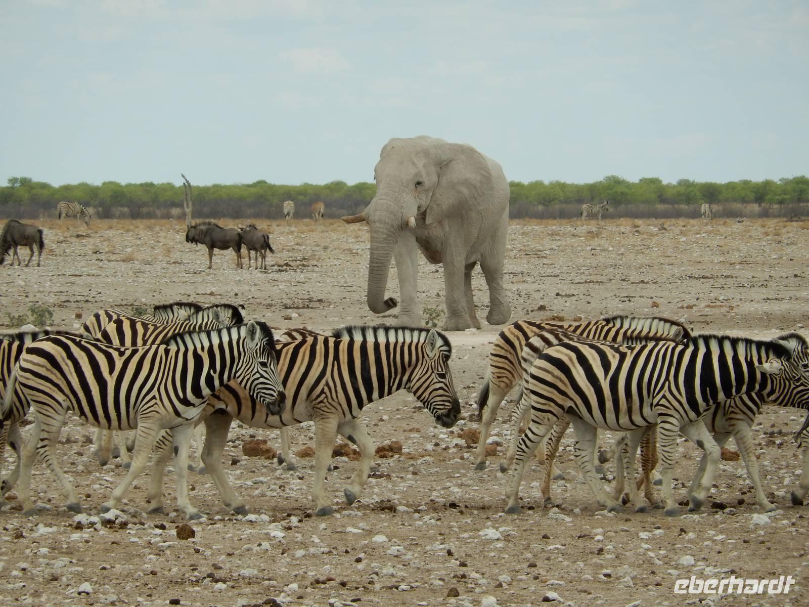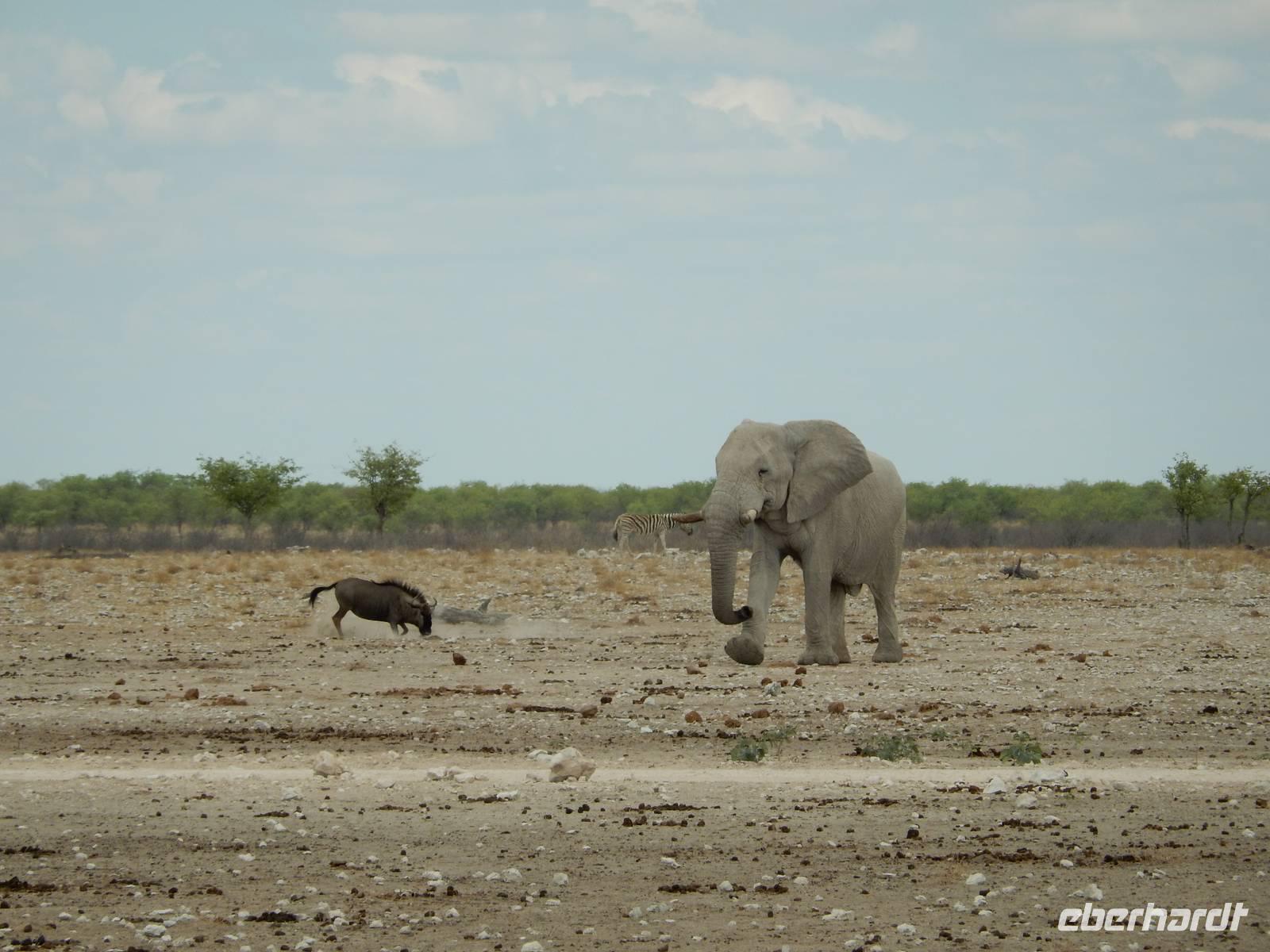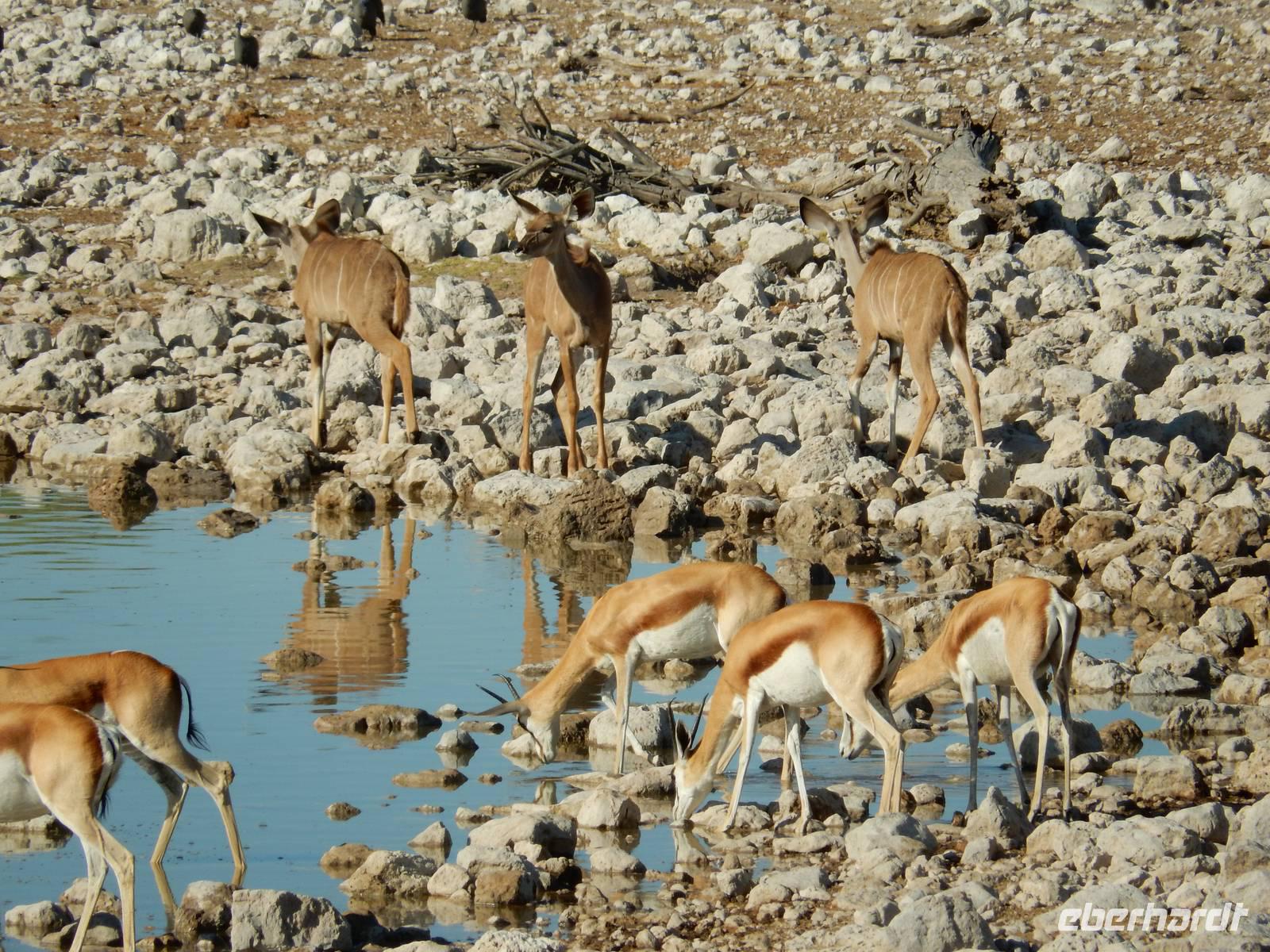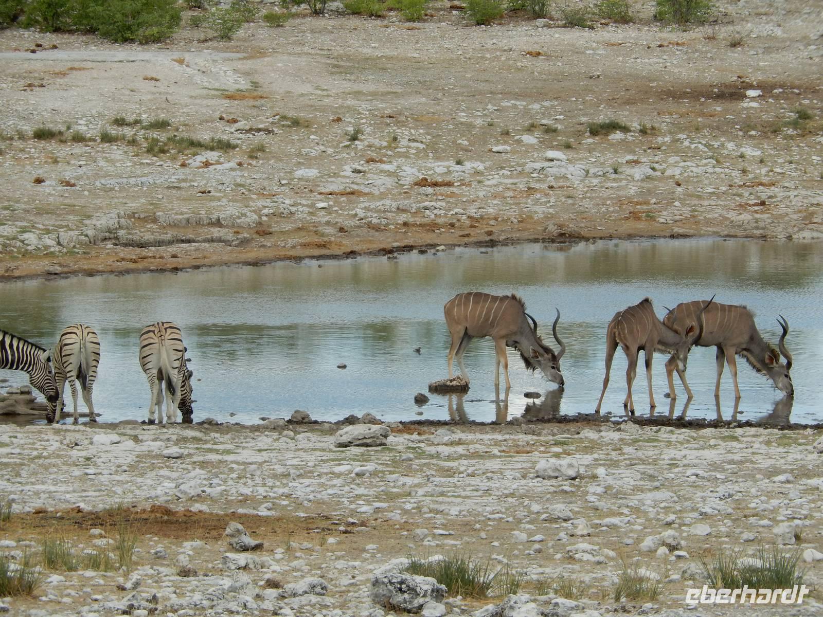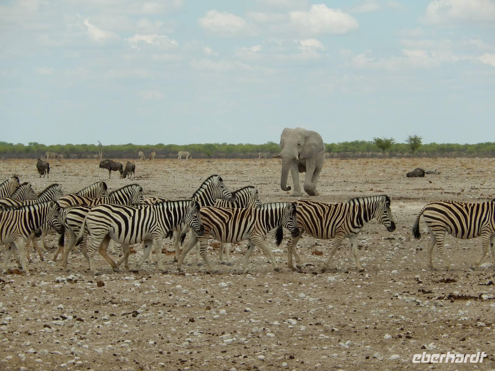 Nach dem Frühstück und dem Kofferladen war noch etwas Zeit bis zur Abfahrt. Einige der Gruppe flitzen nochmal hinunter zum Wasserloch um zu schauen, ob noch etwas zu sehen ist. Wir haben nicht wirklich daran geglaubt, aber es war wie bei "König der Löwen" - nur ohne Löwen. Wir bekamen das RICHTIGE Afrika-Bild geboten. Elefanten, Steppenzebras, Kudus und Springböcke stillten ihren Durst am morgendlichen Wasserloch direkt neben unserem Camp - so fing der Tag schon wieder "tierisch" gut an.
