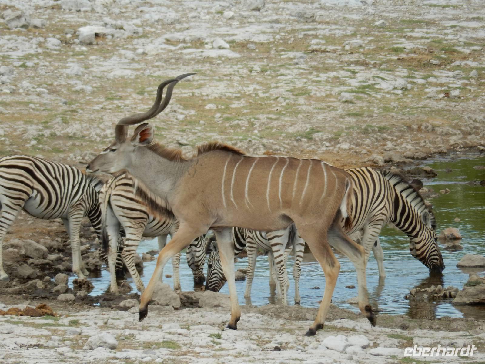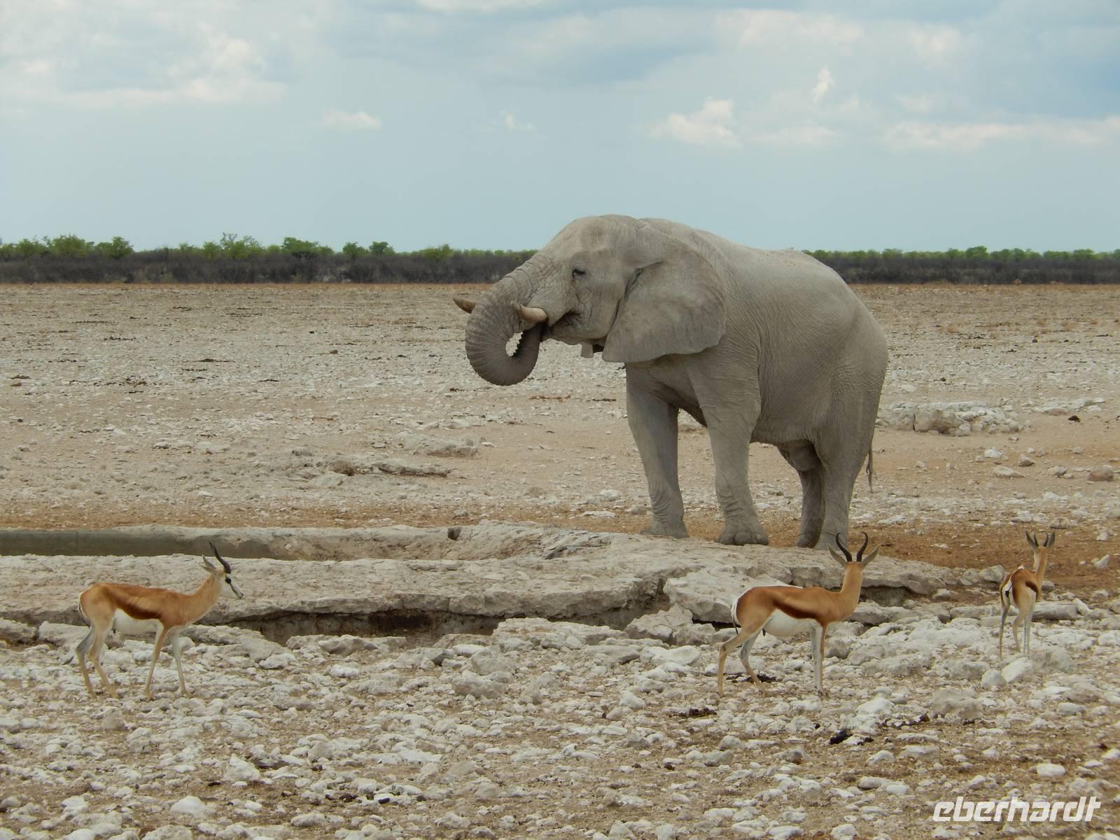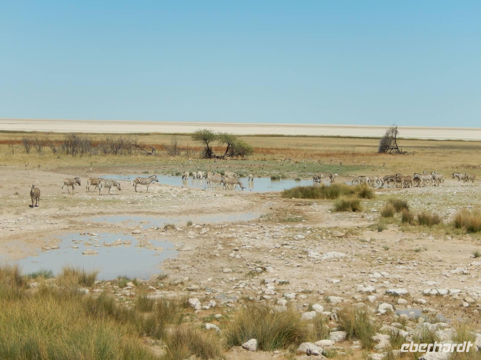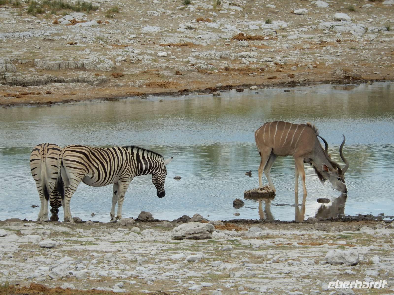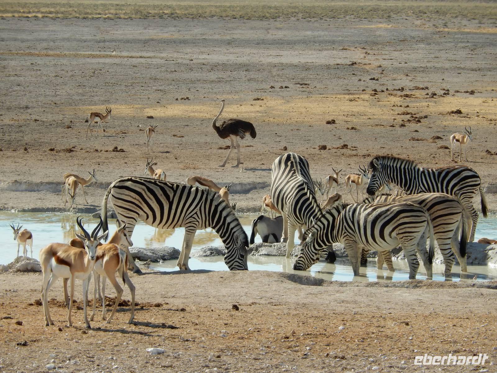 Nach dem Frühstück und dem Kofferladen war noch etwas Zeit bis zur Abfahrt. Einige der Gruppe flitzen nochmal hinunter zum Wasserloch um zu schauen, ob noch etwas zu sehen ist. Wir haben nicht wirklich daran geglaubt, aber es war wie bei "König der Löwen" - nur ohne Löwen. Wir bekamen das RICHTIGE Afrika-Bild geboten. Elefanten, Steppenzebras, Kudus und Springböcke stillten ihren Durst am morgendlichen Wasserloch direkt neben unserem Camp - so fing der Tag schon wieder "tierisch" gut an.