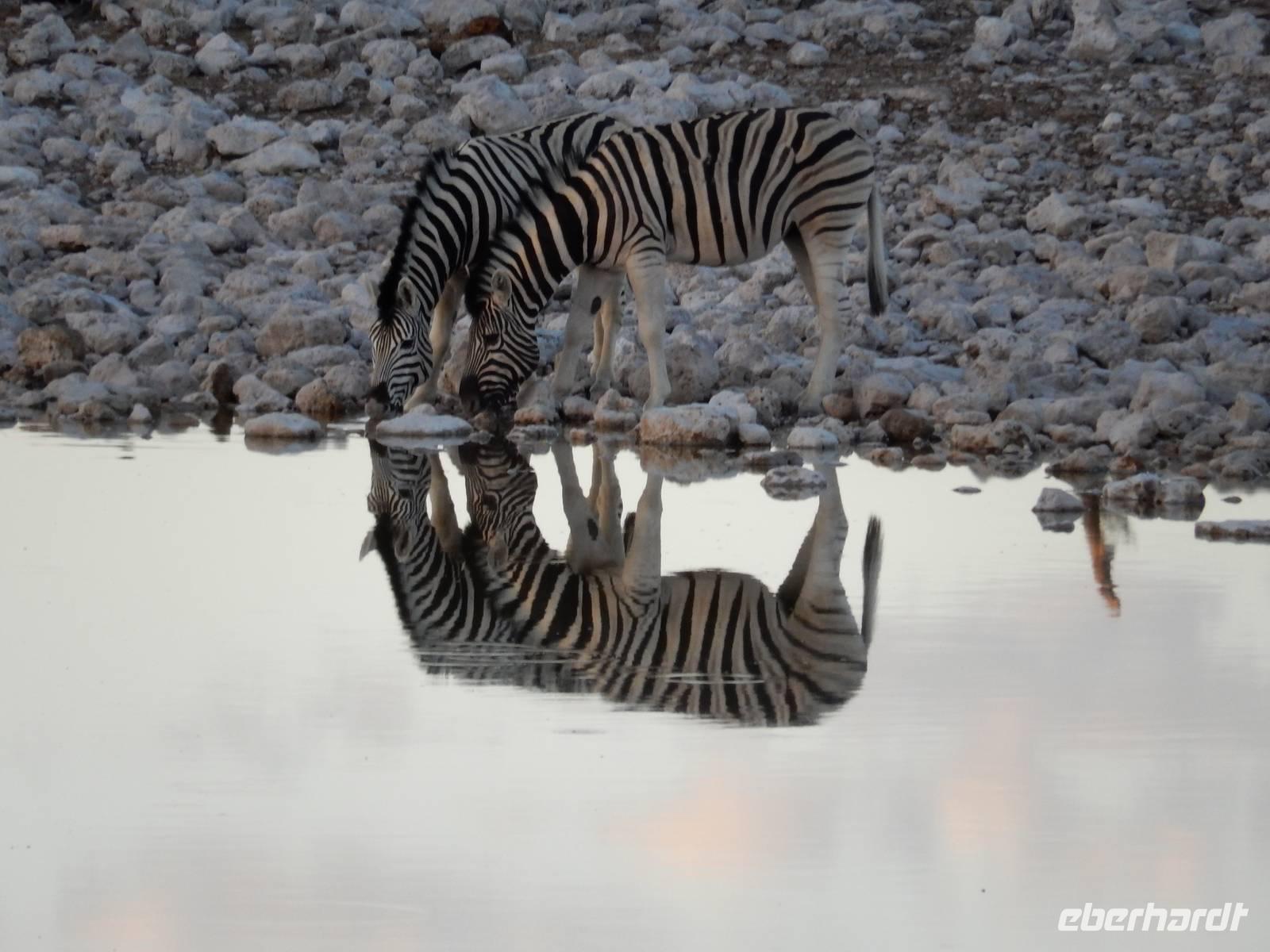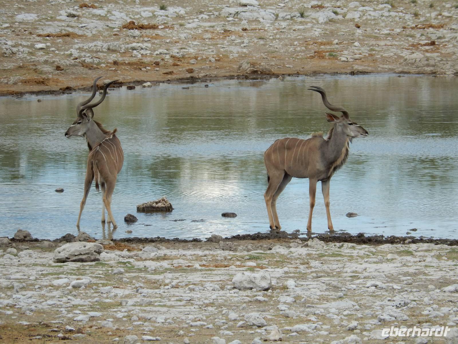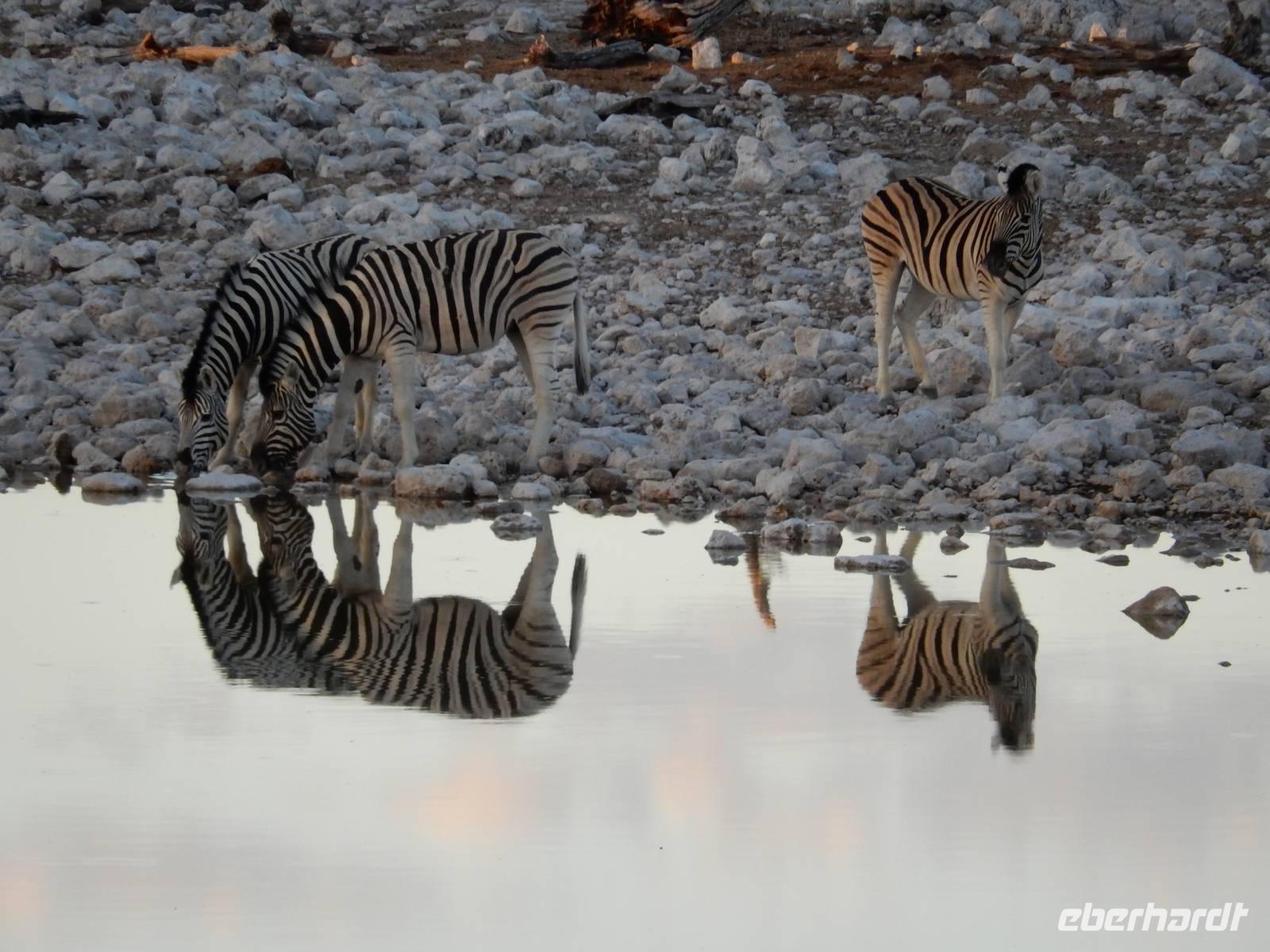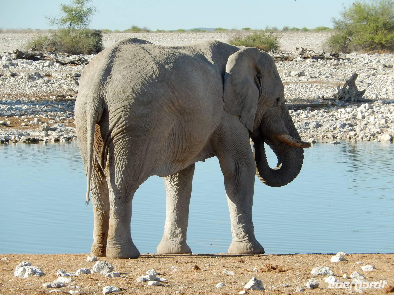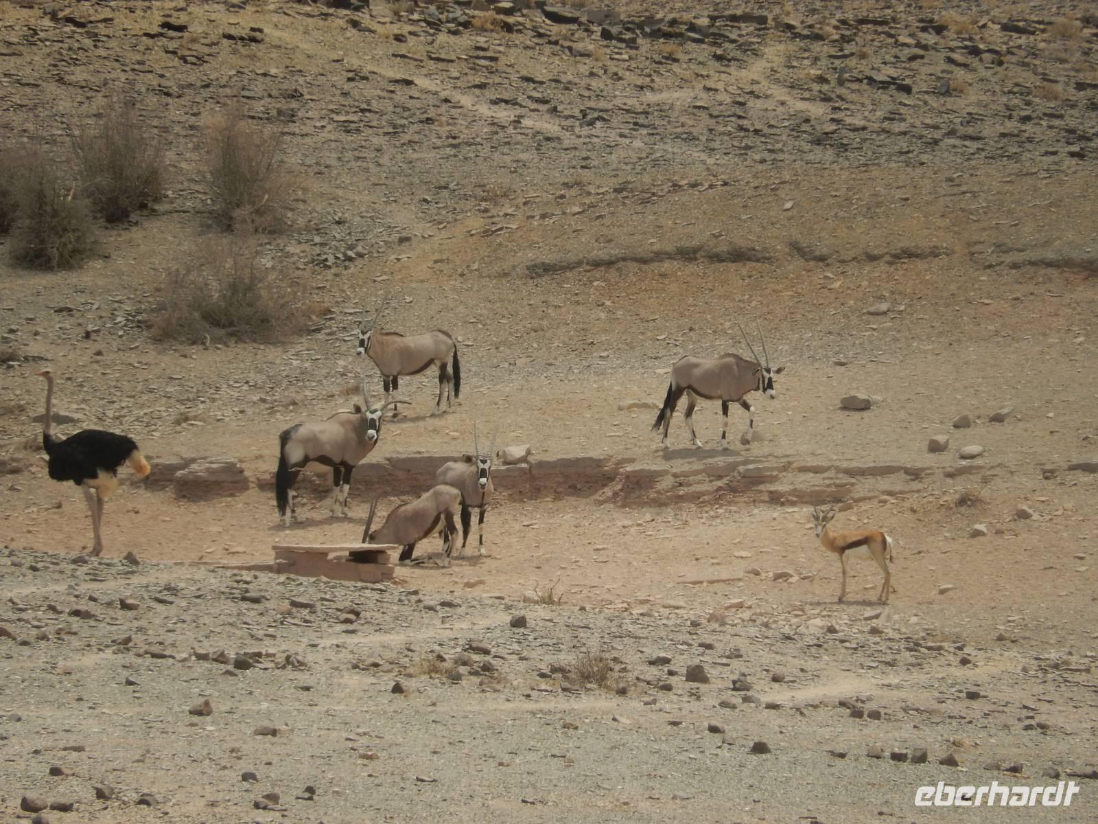 Nach dem Frühstück und dem Kofferladen war noch etwas Zeit bis zur Abfahrt. Einige der Gruppe flitzen nochmal hinunter zum Wasserloch um zu schauen, ob noch etwas zu sehen ist. Wir haben nicht wirklich daran geglaubt, aber es war wie bei "König der Löwen" - nur ohne Löwen. Wir bekamen das RICHTIGE Afrika-Bild geboten. Elefanten, Steppenzebras, Kudus und Springböcke stillten ihren Durst am morgendlichen Wasserloch direkt neben unserem Camp - so fing der Tag schon wieder "tierisch" gut an.