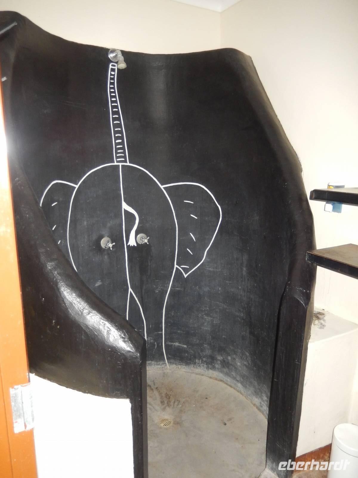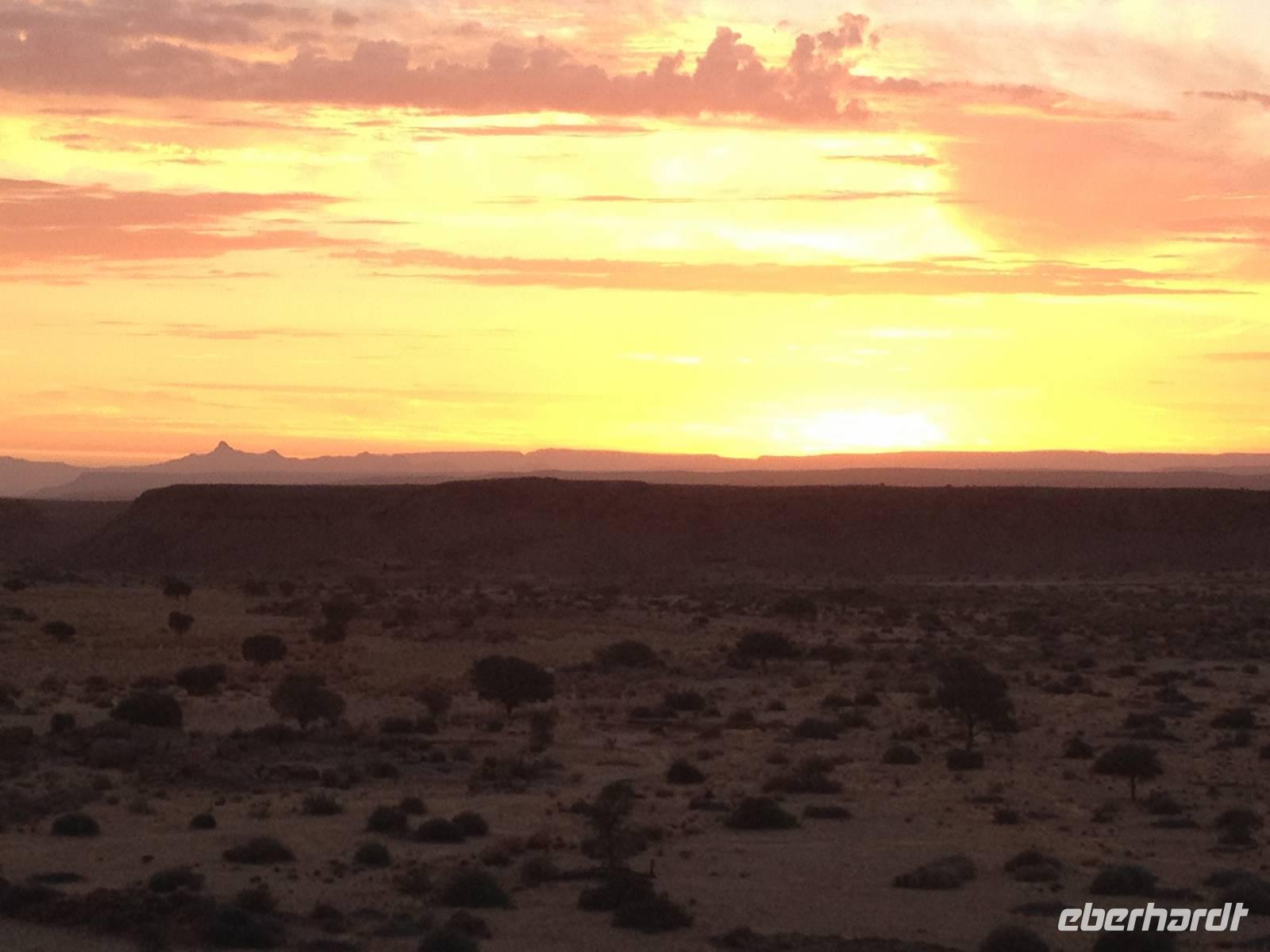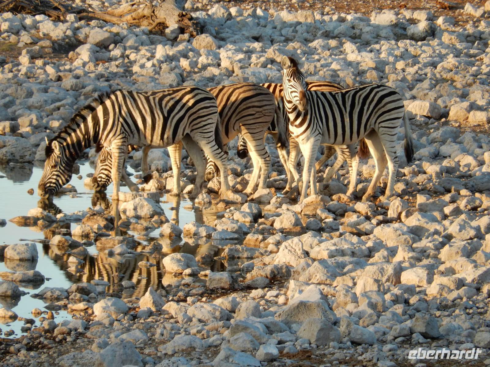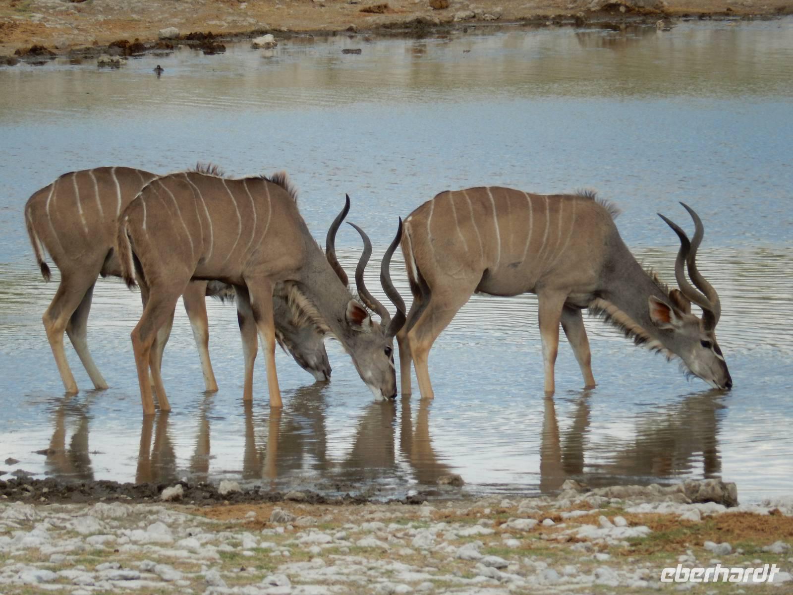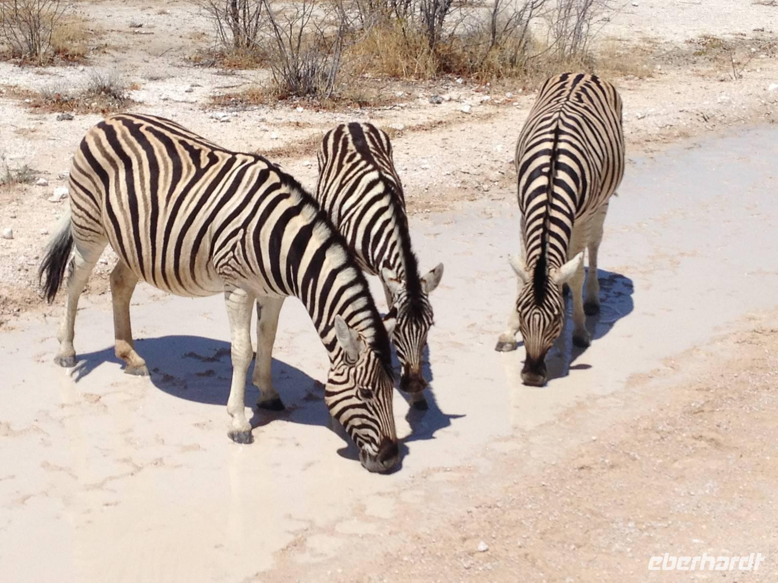 Nach dem Frühstück und dem Kofferladen war noch etwas Zeit bis zur Abfahrt. Einige der Gruppe flitzen nochmal hinunter zum Wasserloch um zu schauen, ob noch etwas zu sehen ist. Wir haben nicht wirklich daran geglaubt, aber es war wie bei "König der Löwen" - nur ohne Löwen. Wir bekamen das RICHTIGE Afrika-Bild geboten. Elefanten, Steppenzebras, Kudus und Springböcke stillten ihren Durst am morgendlichen Wasserloch direkt neben unserem Camp - so fing der Tag schon wieder "tierisch" gut an.
