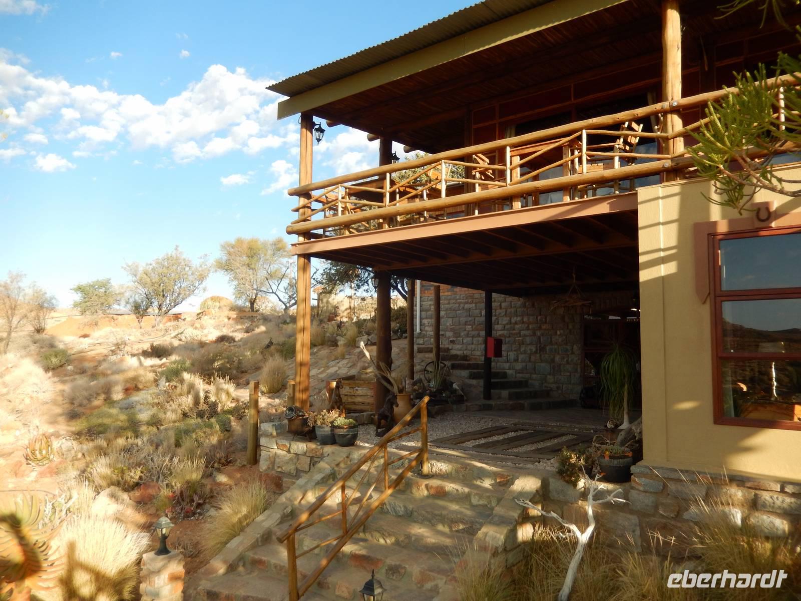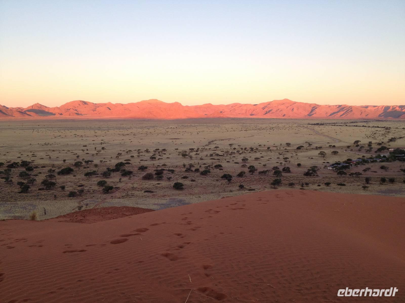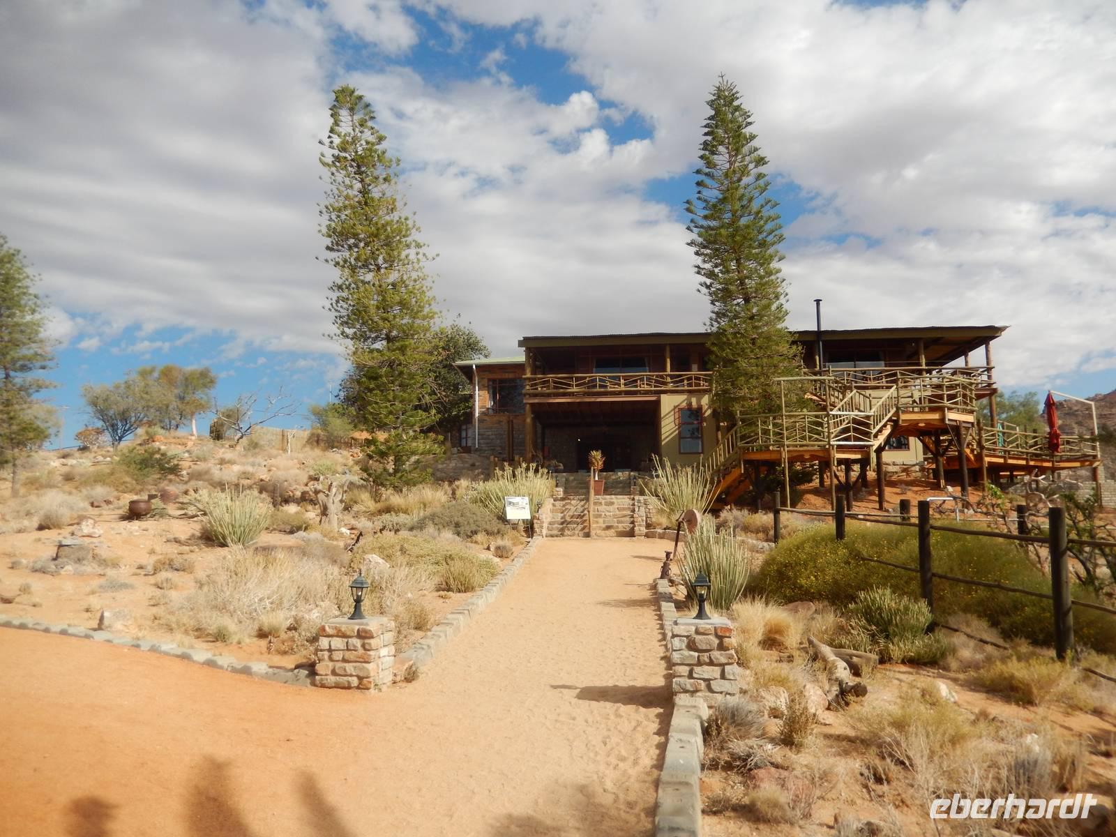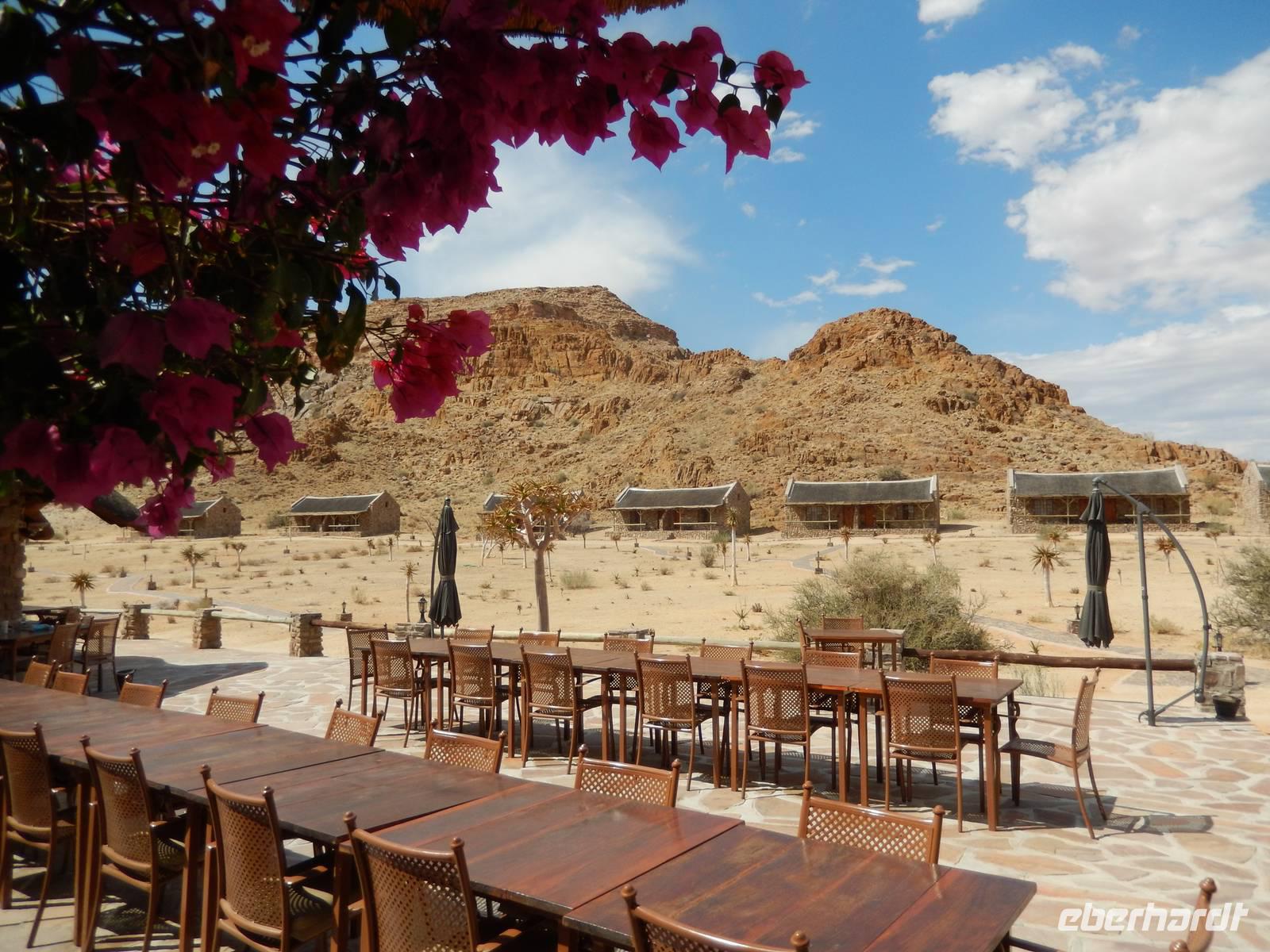 Ziel war anschließend die Namib Desert Lodge am Rande der Namib-Wüste und den Naukluftbergen. Dieses Bergmassiv bildet einen Teil der sogenannten Großen Randstufe, die das Küstengebiet vom Binnenhochland trennt. Das schroffe Gebirge ragt bis zu 2000 Meter in die Höhe.