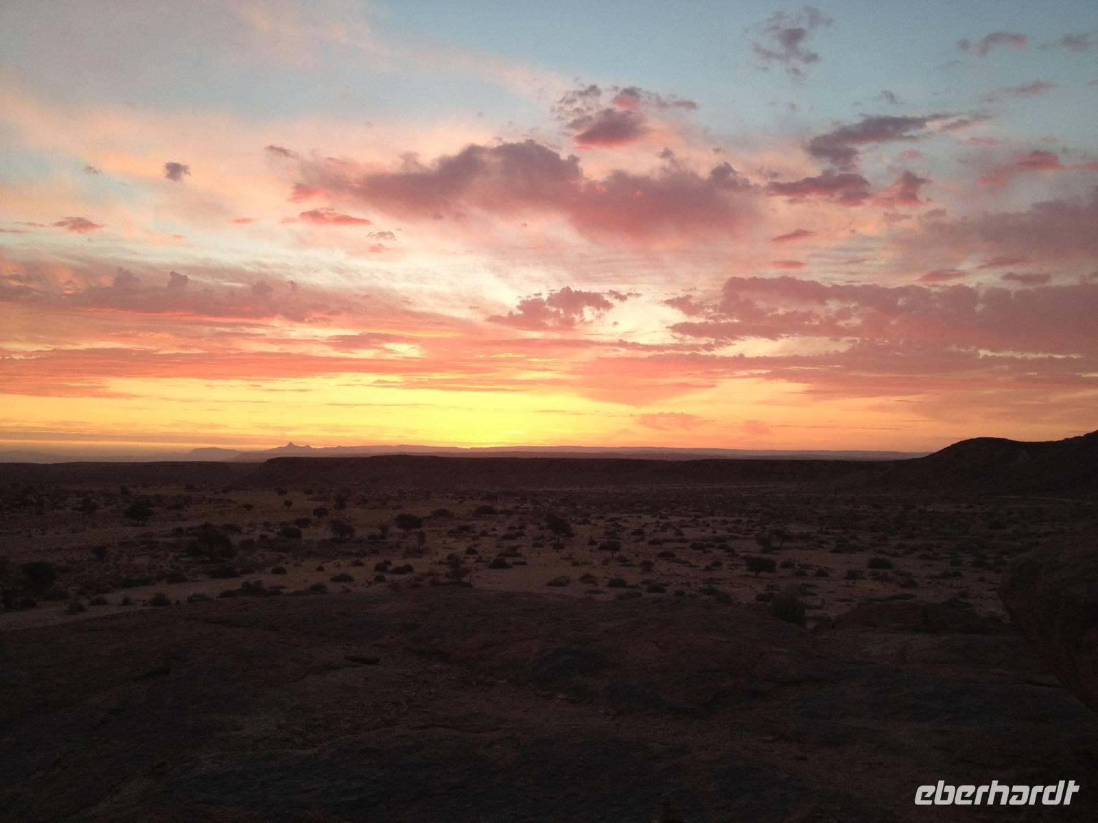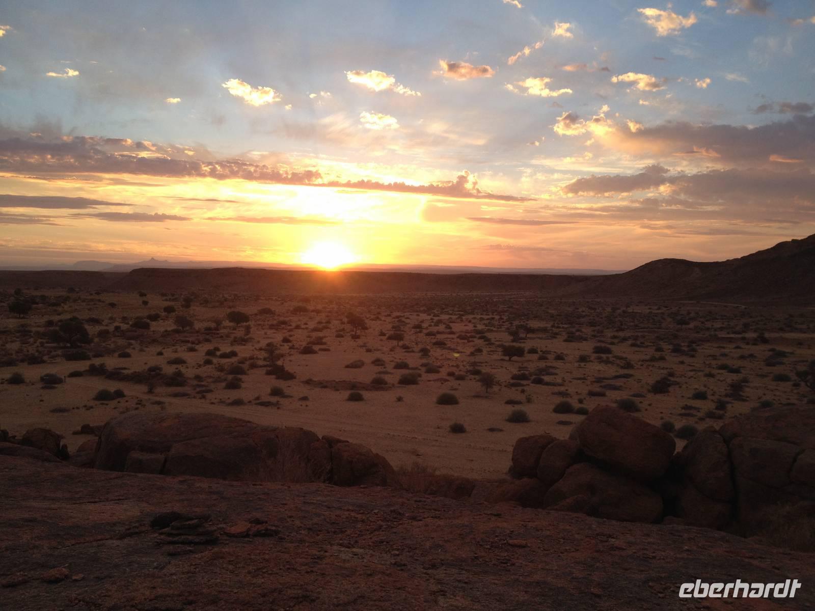 Entlang der Atlantikküste verließen wir an diesem Morgen Swakopmund und erblickten von Weitem die Salinen am Meer. Wir passierten Wlotzkasbaken. In dieser kleinen Ansiedlung am Meer leben nur ganz wenige Menschen dauerhaft. Vielmehr ist es heute ein Ferienort mit zahlreichen Privathäusern, die sich die gut betuchten Einwohner Namibias hier errichteten. Bei Henties Bay, ca. 70 Kilometer nördlich von Swakopmund, drehten wir ab und ratterten auf der Schotterpiste in Richtung Uis. Die karge Landschaft wurde lediglich durch ein paar Flechten bedeckt, hier und da ein Springbock oder eine Oryx-Antilope. Am Horizont, kurz vor der kleinen Ortschaft Uis, türmte sich das Brandbergmassiv in unseren Fokus. Der Name Brandberg stammt von der glühenden Farbe, in der der Berg erscheint, wenn die Sonne von Westen auf ihn scheint. Die Herero nennen den Brandberg auch Omukuruwaro (Berg der Götter). Im Mittel ist das Massiv 2.500 Meter hoch, die höchste Erhebung ist der Königstein, der mit 2.537 Metern der höchste Berg Namibias ist.