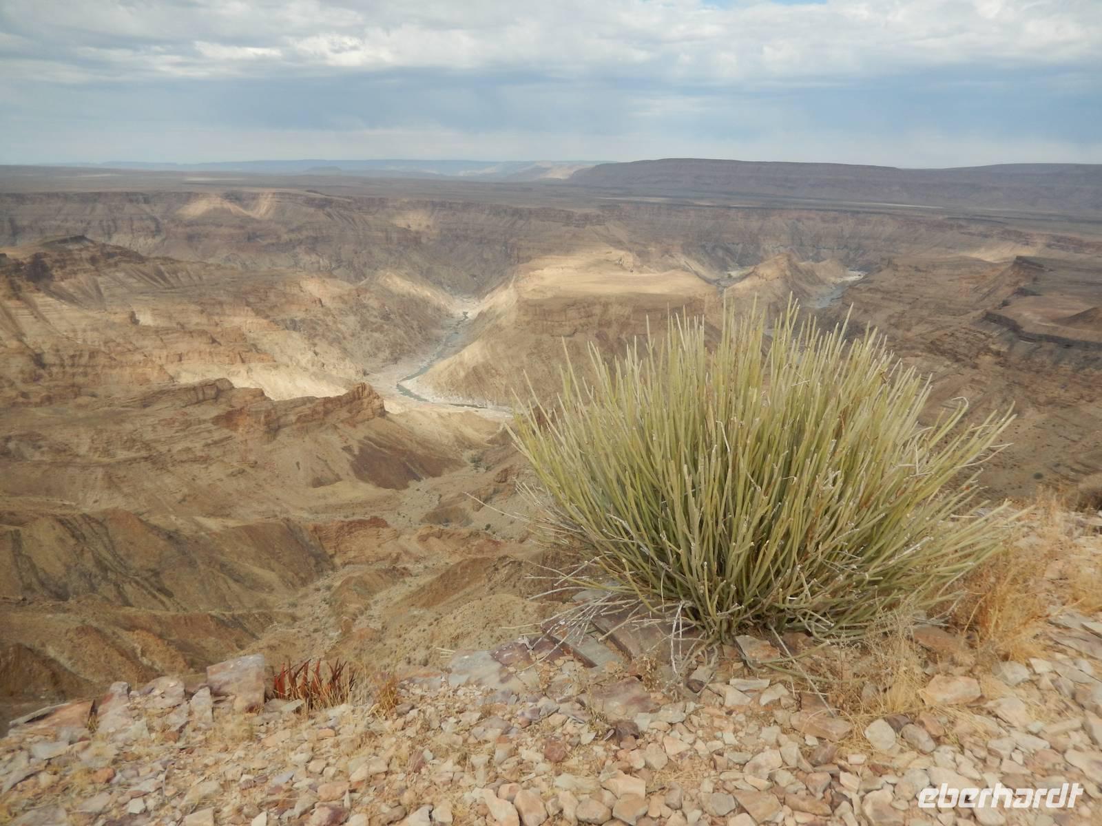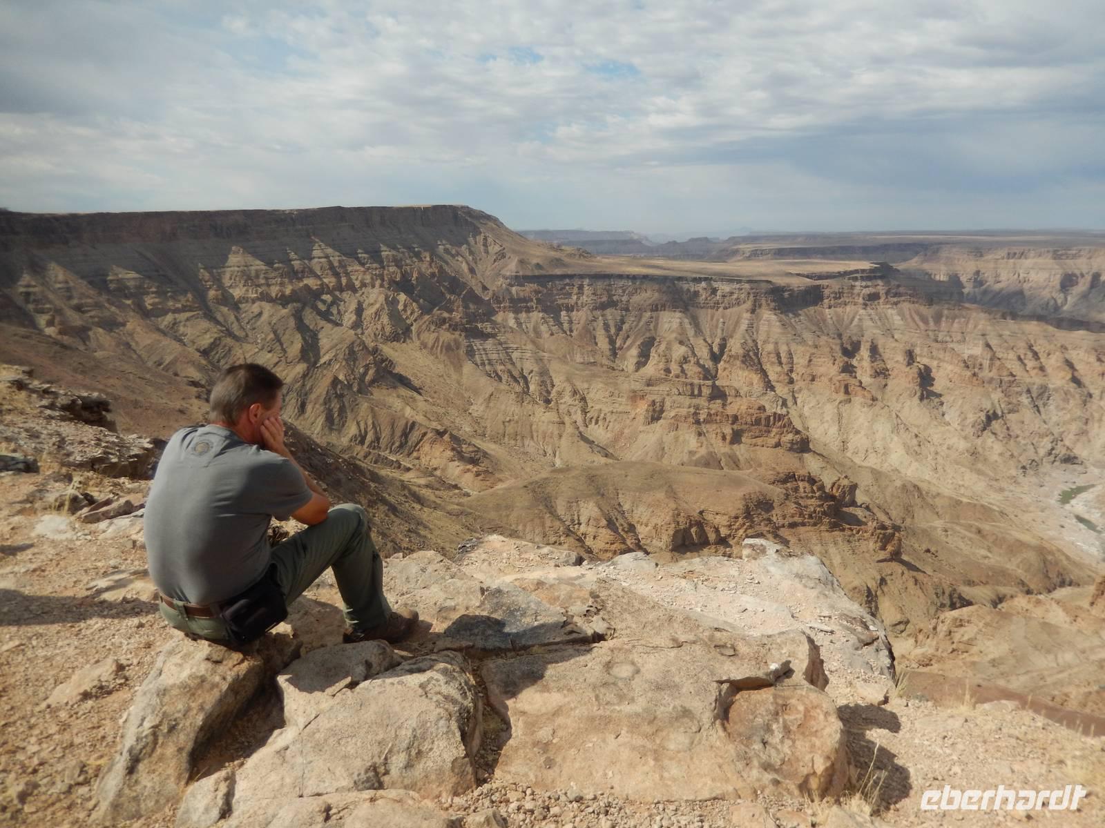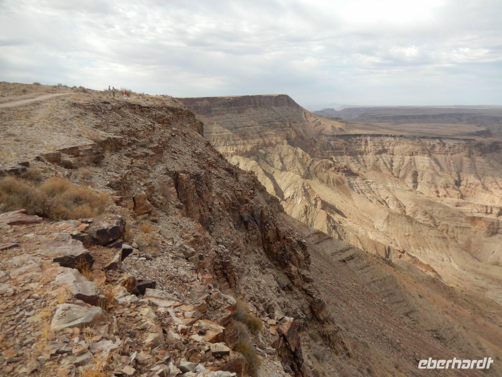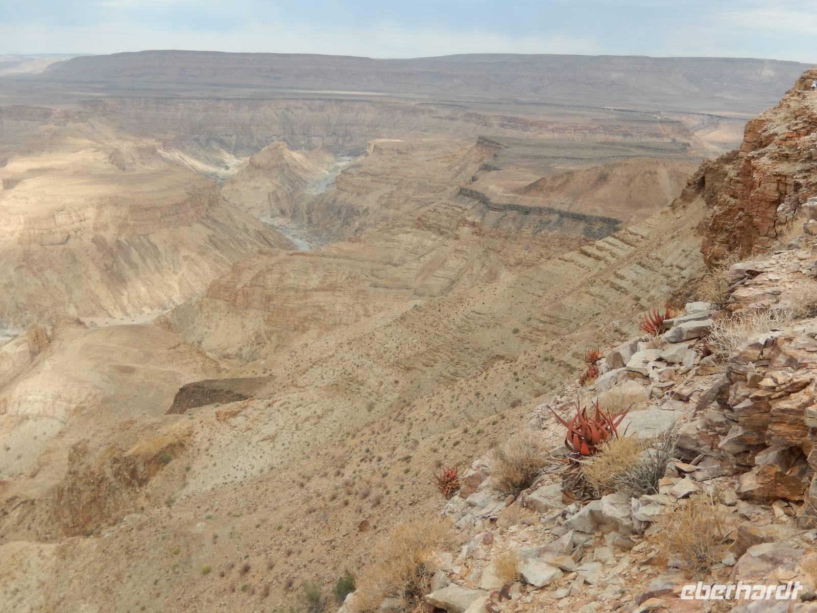 Eigentlich wollten wir gar nicht mehr weg hier, aber ein nächster Höhepunkt und ein besonderes Naturwunder war unser Ziel. Der Fish-River-Canyon am Unterlauf des gleichnamigen Flusses gehört mich Sicherheit zu den eindrucksvollsten Naturschönheiten im südlichen Namibia. Mit seiner Tiefe von bis zu 550 Metern gilt der Canyon - nach dem Grand Canyon in Amerika - als zweitgrößter Canyon der Welt. Die Schlucht windet sich über eine Distanz von rund 160 Kilometern durch das zerklüftete Koubis-Bergmassiv bis hinunter nach Ai-Ais, wo er nach 161 Kilometer endet. Vom Aussichtspunkt am Canyon-Rand machten wir uns ein Bild von der stattlichen Größe dieser Schlucht. Sehr beliebt sind Wanderungen durch den Fischfluss-Canyon. Sie erfordern allerdings gute Fitness, sind nur in den kühleren Wintermonaten zwischen Mai und August gestattet und dauern außerdem 5 Tage bei einer Länge von 86 Kilometern. Da wir nicht so viel Zeit hatten, spazierten wir entlang des Canyon-Randes und erhaschten immer wieder tolle Blicke!