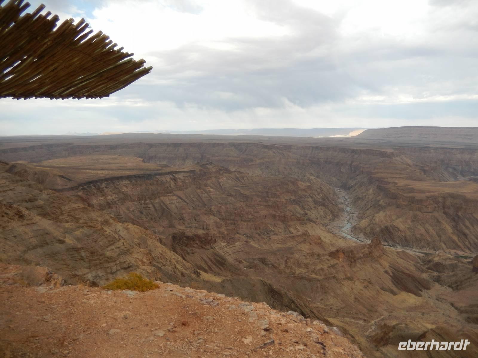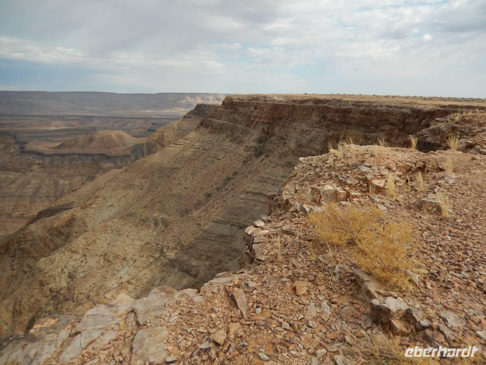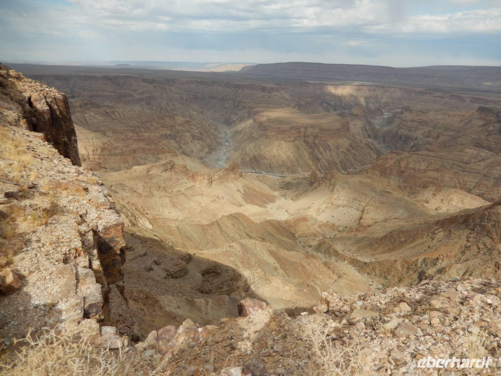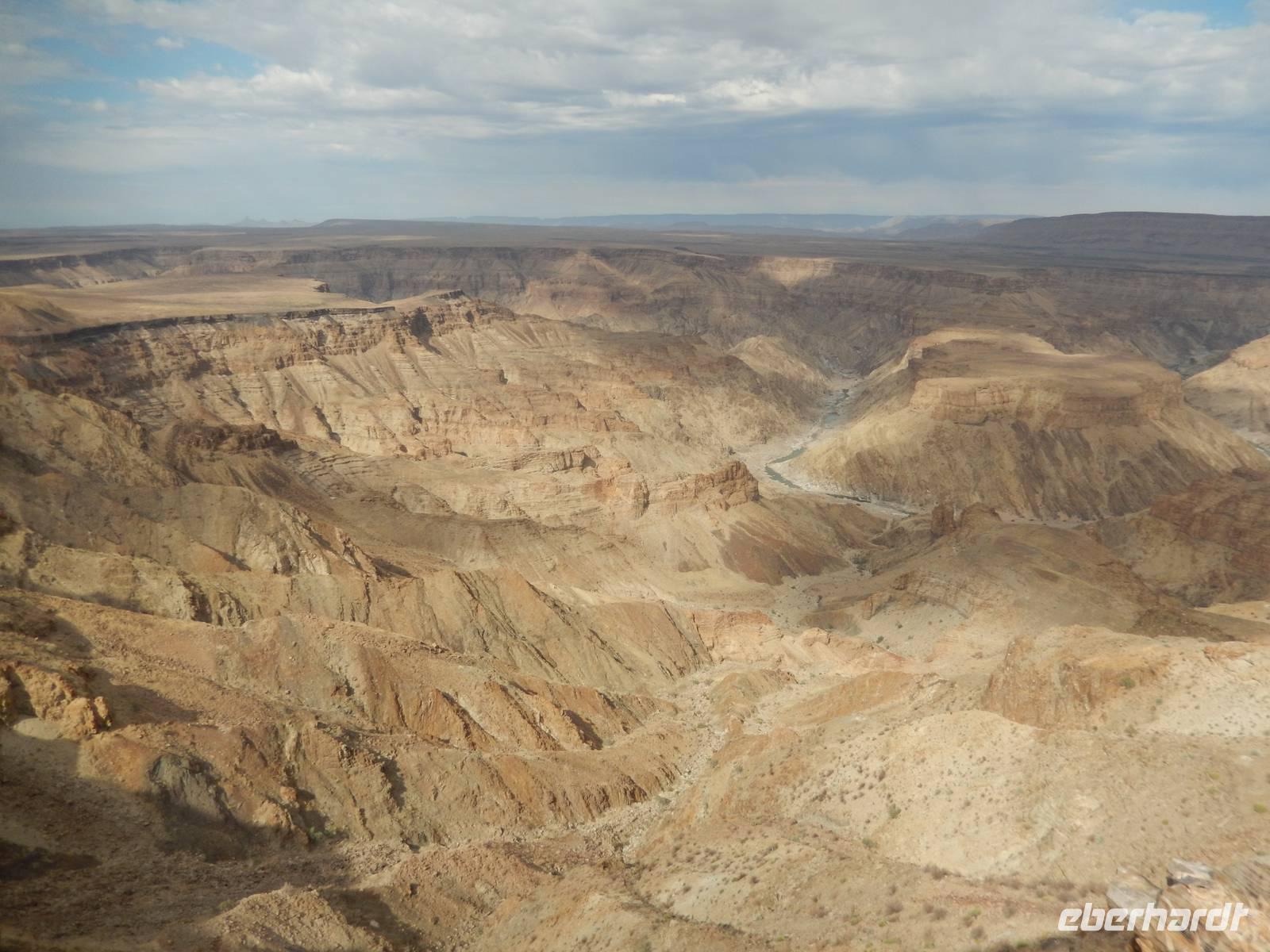 Eigentlich wollten wir gar nicht mehr weg hier, aber ein nächster Höhepunkt und ein besonderes Naturwunder war unser Ziel. Der Fish-River-Canyon am Unterlauf des gleichnamigen Flusses gehört mich Sicherheit zu den eindrucksvollsten Naturschönheiten im südlichen Namibia. Mit seiner Tiefe von bis zu 550 Metern gilt der Canyon - nach dem Grand Canyon in Amerika - als zweitgrößter Canyon der Welt. Die Schlucht windet sich über eine Distanz von rund 160 Kilometern durch das zerklüftete Koubis-Bergmassiv bis hinunter nach Ai-Ais, wo er nach 161 Kilometer endet. Vom Aussichtspunkt am Canyon-Rand machten wir uns ein Bild von der stattlichen Größe dieser Schlucht. Sehr beliebt sind Wanderungen durch den Fischfluss-Canyon. Sie erfordern allerdings gute Fitness, sind nur in den kühleren Wintermonaten zwischen Mai und August gestattet und dauern außerdem 5 Tage bei einer Länge von 86 Kilometern. Da wir nicht so viel Zeit hatten, spazierten wir entlang des Canyon-Randes und erhaschten immer wieder tolle Blicke!