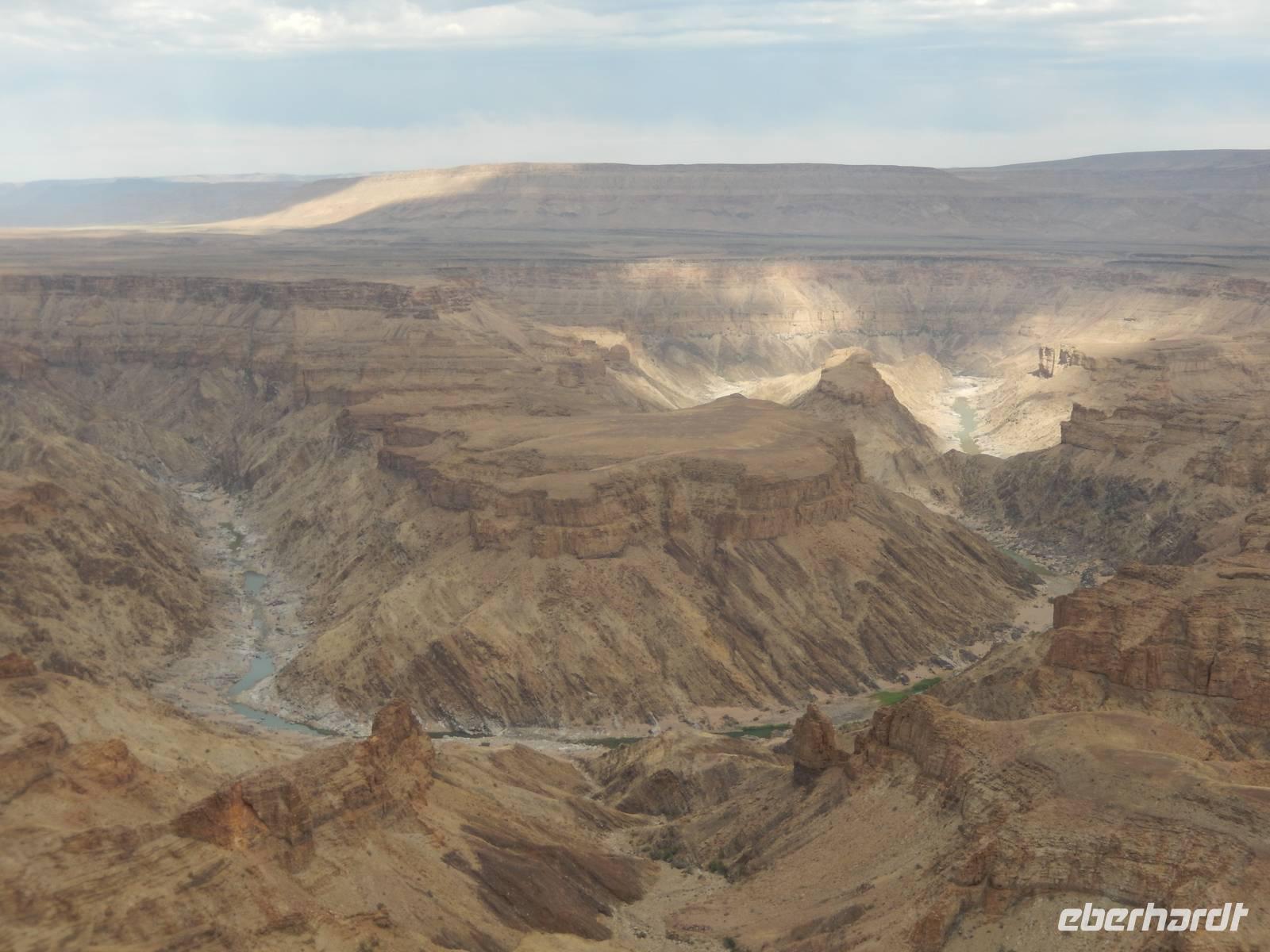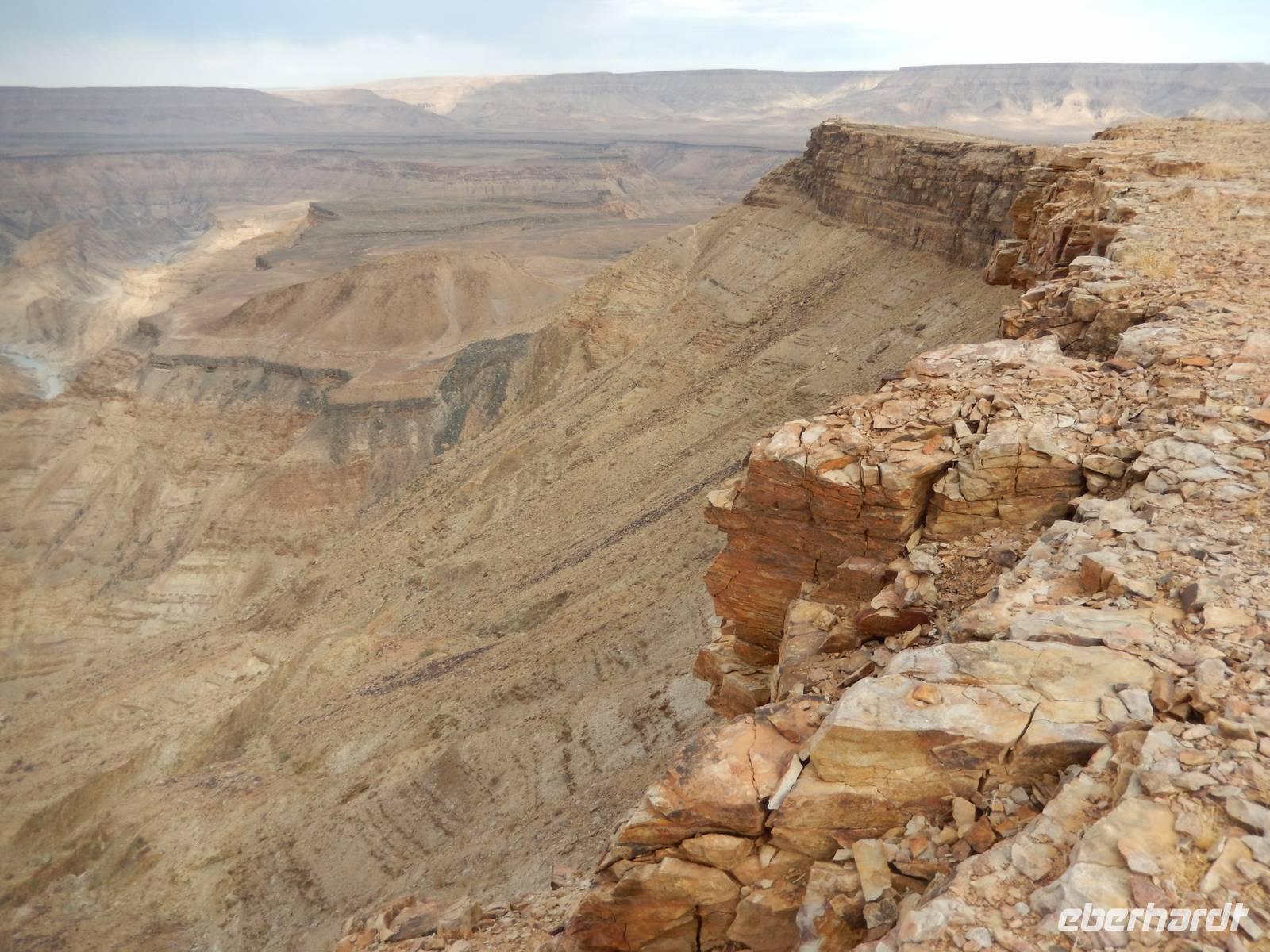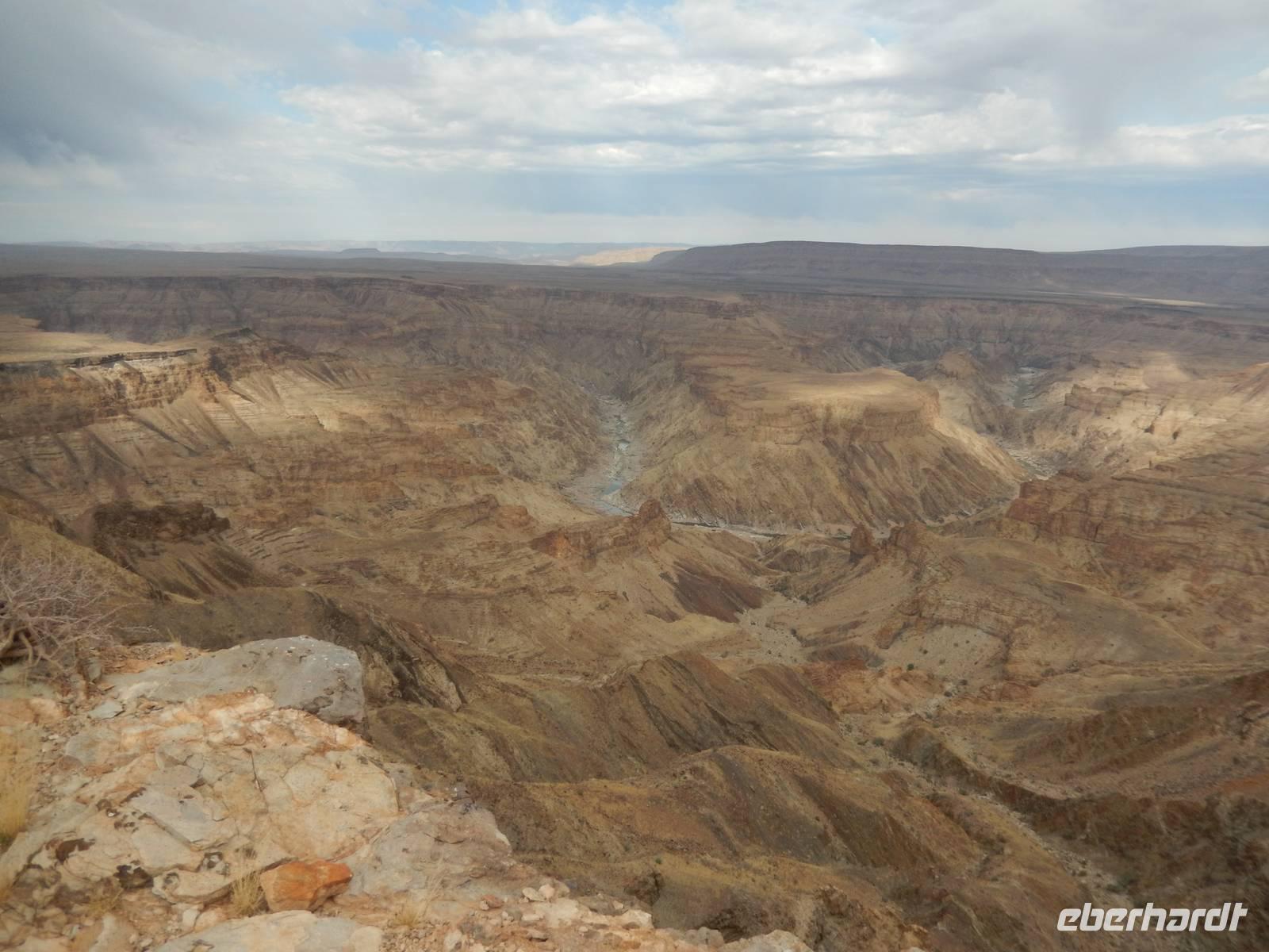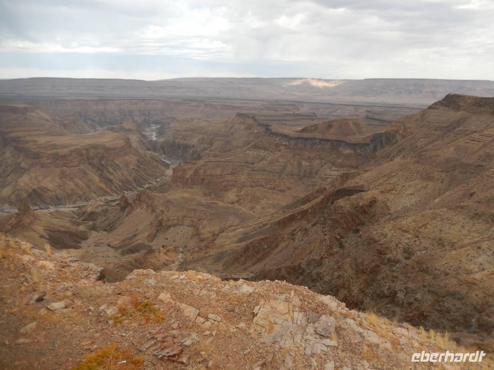 Eigentlich wollten wir gar nicht mehr weg hier, aber ein nächster Höhepunkt und ein besonderes Naturwunder war unser Ziel. Der Fish-River-Canyon am Unterlauf des gleichnamigen Flusses gehört mich Sicherheit zu den eindrucksvollsten Naturschönheiten im südlichen Namibia. Mit seiner Tiefe von bis zu 550 Metern gilt der Canyon - nach dem Grand Canyon in Amerika - als zweitgrößter Canyon der Welt. Die Schlucht windet sich über eine Distanz von rund 160 Kilometern durch das zerklüftete Koubis-Bergmassiv bis hinunter nach Ai-Ais, wo er nach 161 Kilometer endet. Vom Aussichtspunkt am Canyon-Rand machten wir uns ein Bild von der stattlichen Größe dieser Schlucht. Sehr beliebt sind Wanderungen durch den Fischfluss-Canyon. Sie erfordern allerdings gute Fitness, sind nur in den kühleren Wintermonaten zwischen Mai und August gestattet und dauern außerdem 5 Tage bei einer Länge von 86 Kilometern. Da wir nicht so viel Zeit hatten, spazierten wir entlang des Canyon-Randes und erhaschten immer wieder tolle Blicke!