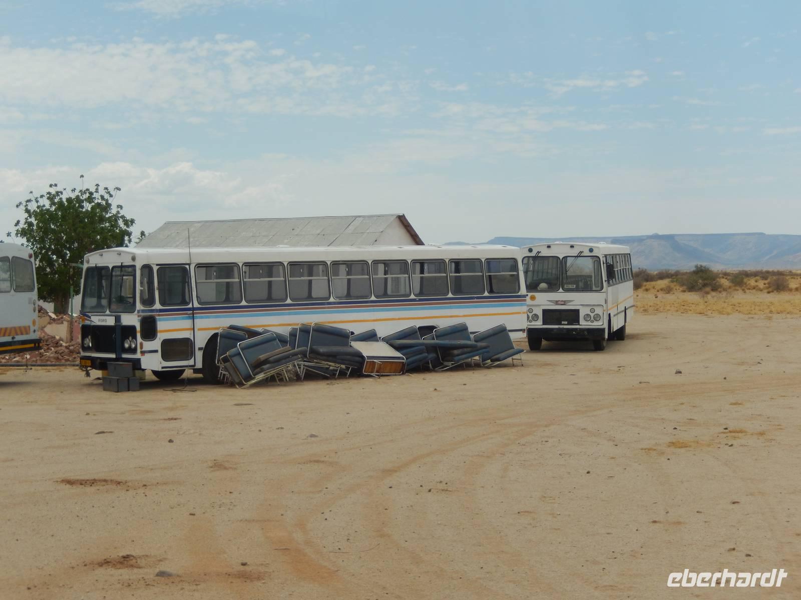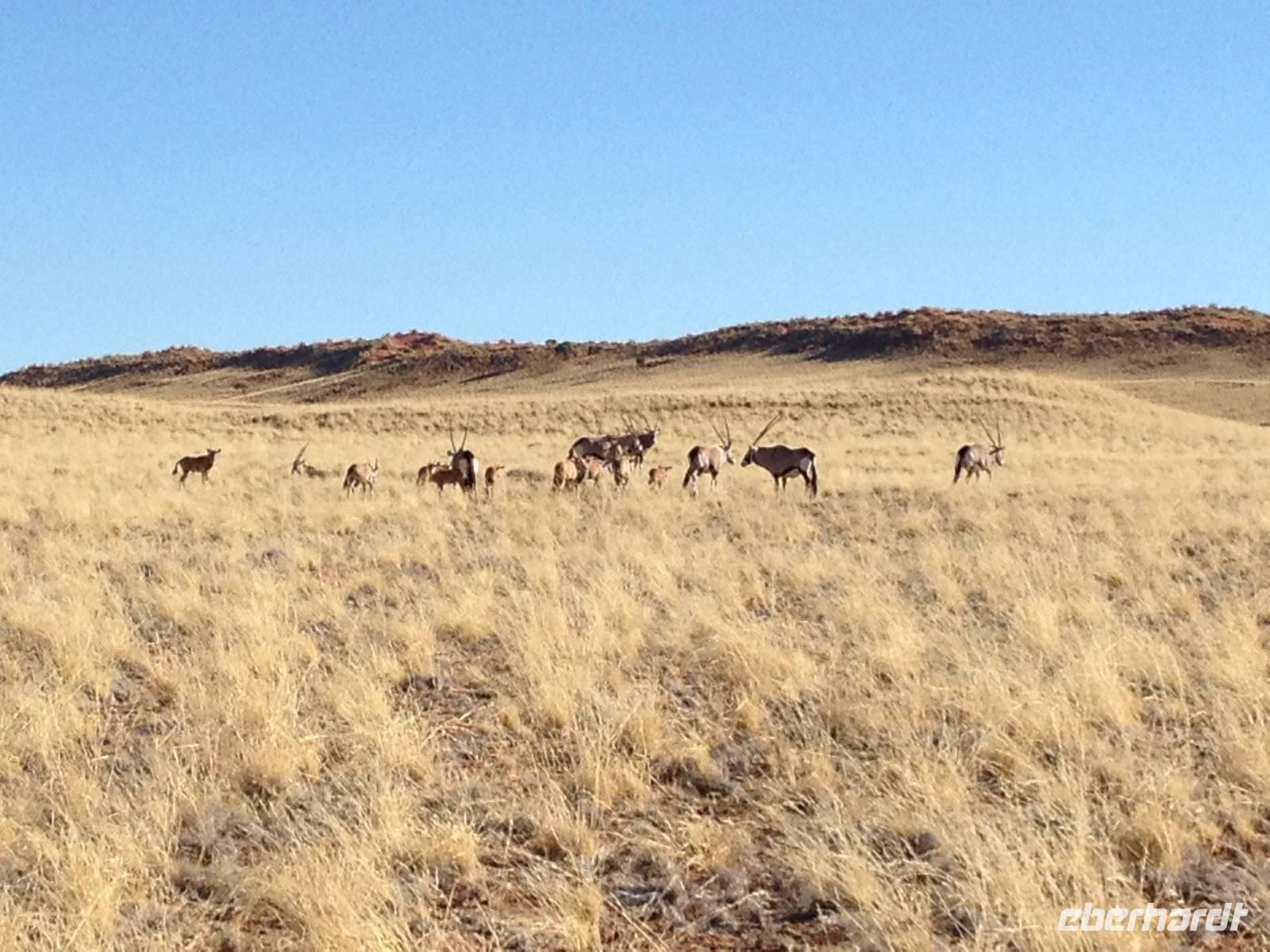 Eigentlich sah das Programm heute "nur" die Fahrt zur nächsten Unterkunft am Rande der Namib-Wüste vor. Doch schon die Fahrt auf der Piste in Richtung Norden durch den Namib-Naukluft-Nationalpark mit seinen 50.000 Quadratkilometern war ein Erlebnis. Die abwechslungsreiche Landschaft und die vielen Tiere wie Oryx-Antilopen, Springböcke, Hartmanns-Bergzebras und sogar Kudus haben uns sehr beeindruckt. In der kleinen Ortschaft Helmeringhausen mussten wir einen Nothalt einlegen, da der Bus eine kleine Panne hatte. Wir gönnten uns in der Zwischenzeit ein leckeres Stück Apfelkuchen und eine Tasse Kaffee im sehr liebevoll eingerichteten Hotel "Helmeringhausen".
