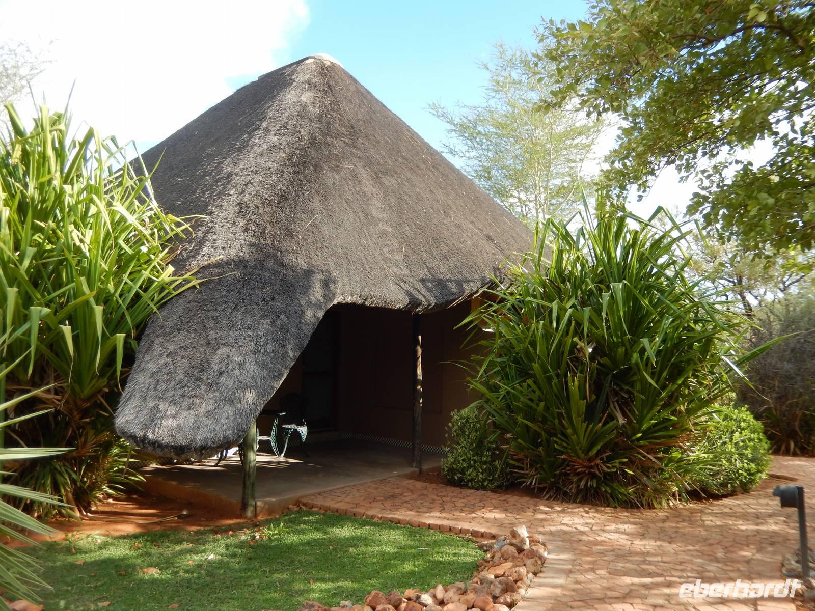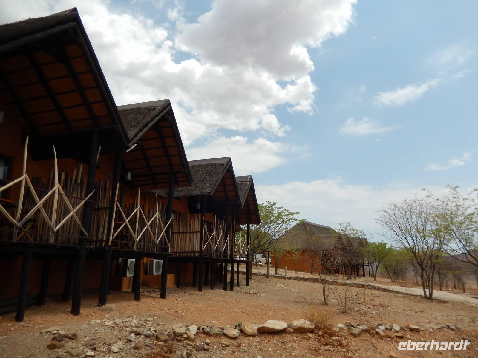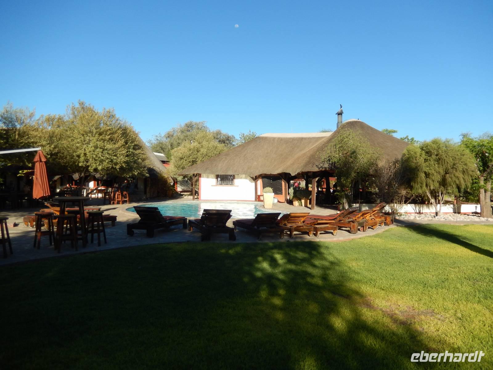 Endlich in unserer Unterkunft, der !Uris Safari Lodge, angekommen, entspannten wir im Pool oder auf den Terrassen unserer mit Stroh gedeckten Chalets. Da wir alleine in der kleinen Lodge waren, wurden wir herzlich versorgt und nach dem Abendessen haben die Kellner sogar noch für uns gesungen. In gemütlicher Runde ließen wir den Abend gemeinsam ausklingen.