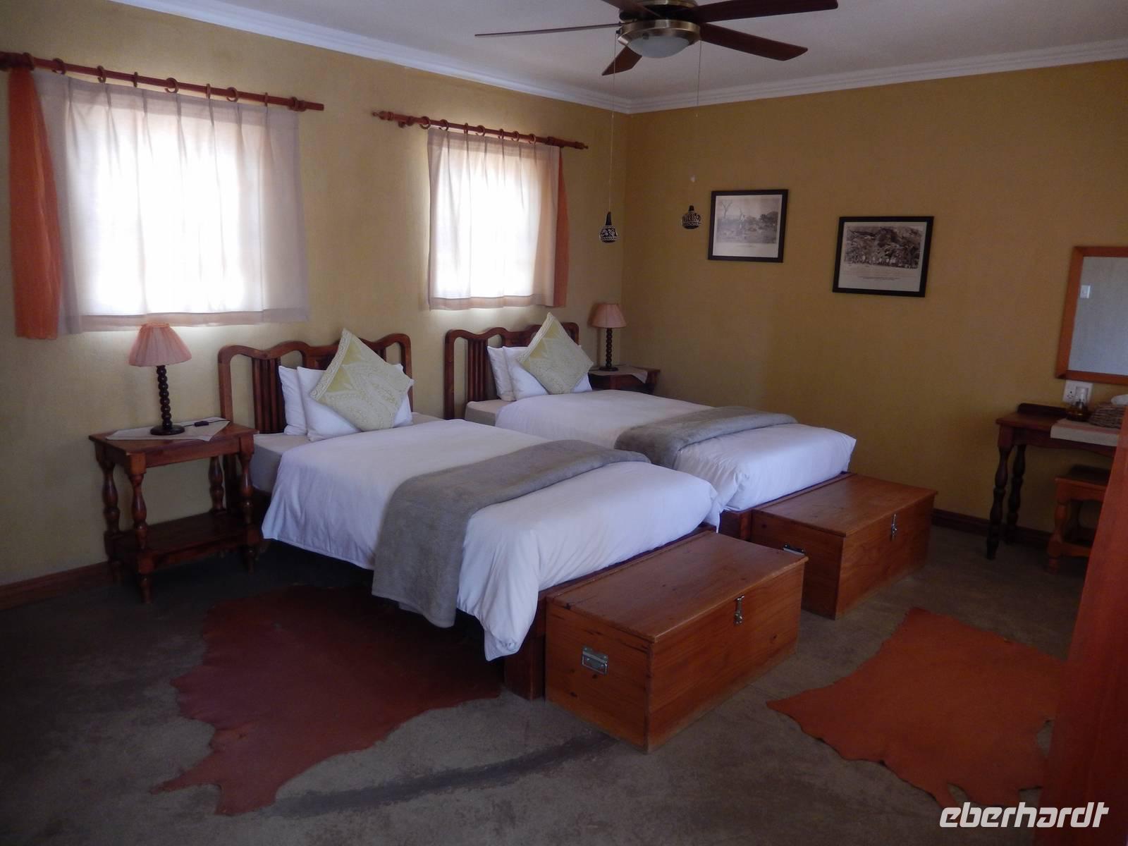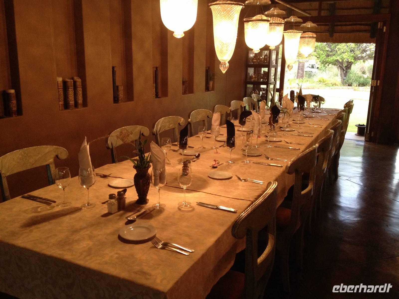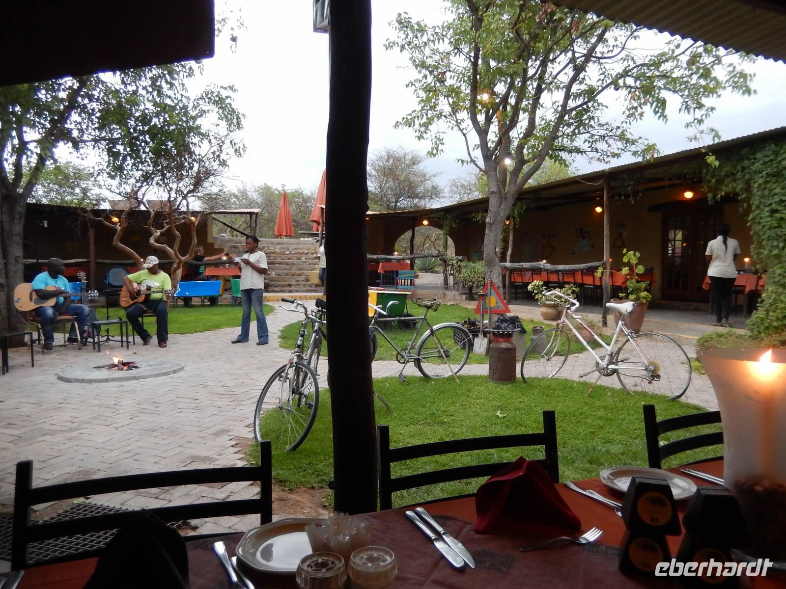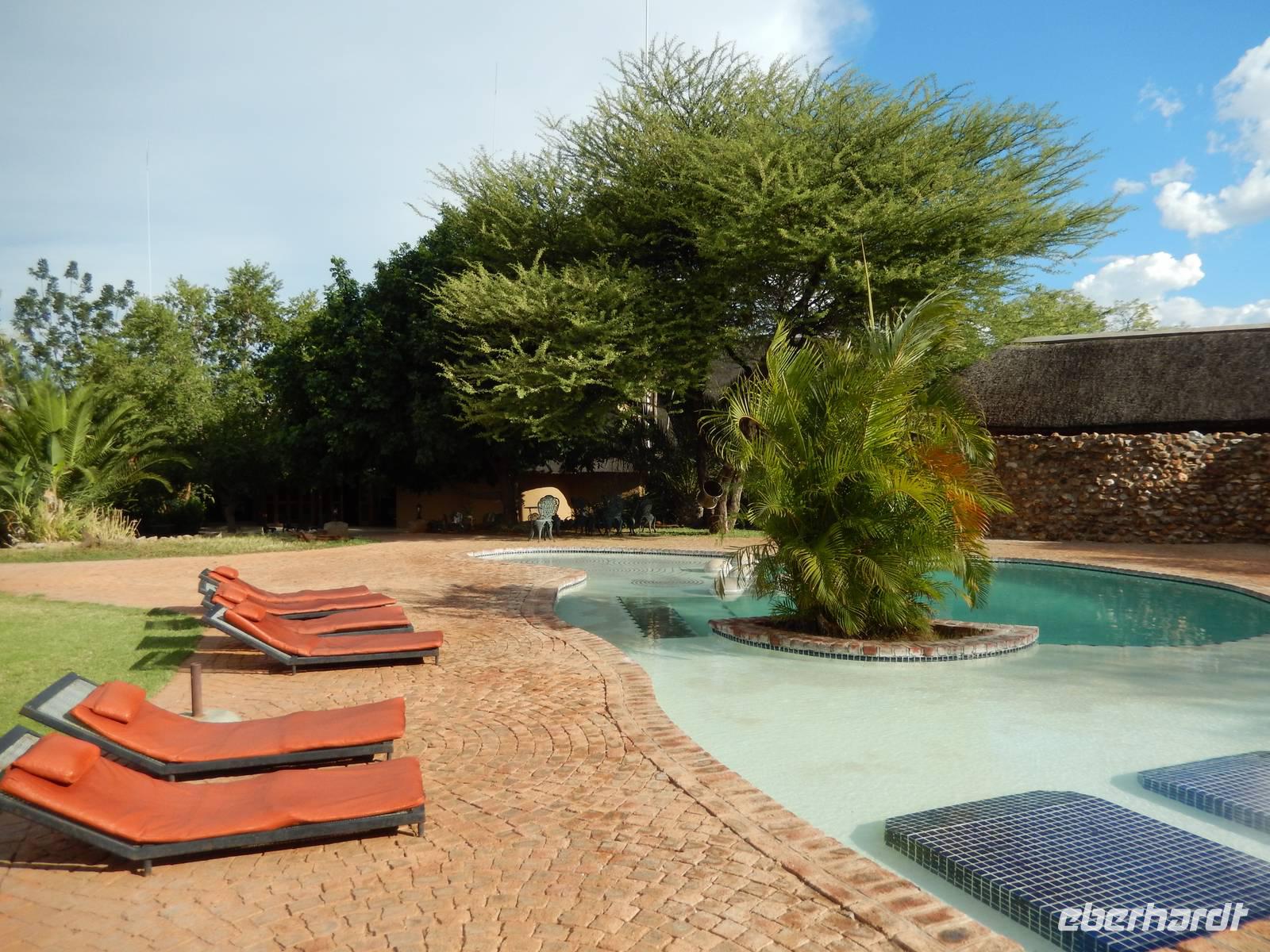Endlich in unserer Unterkunft, der !Uris Safari Lodge, angekommen, entspannten wir im Pool oder auf den Terrassen unserer mit Stroh gedeckten Chalets. Da wir alleine in der kleinen Lodge waren, wurden wir herzlich versorgt und nach dem Abendessen haben die Kellner sogar noch für uns gesungen. In gemütlicher Runde ließen wir den Abend gemeinsam ausklingen.