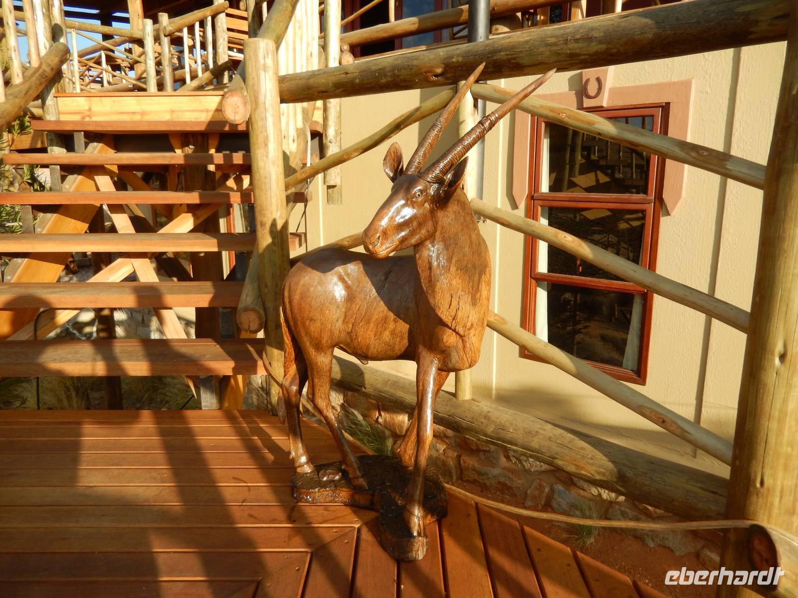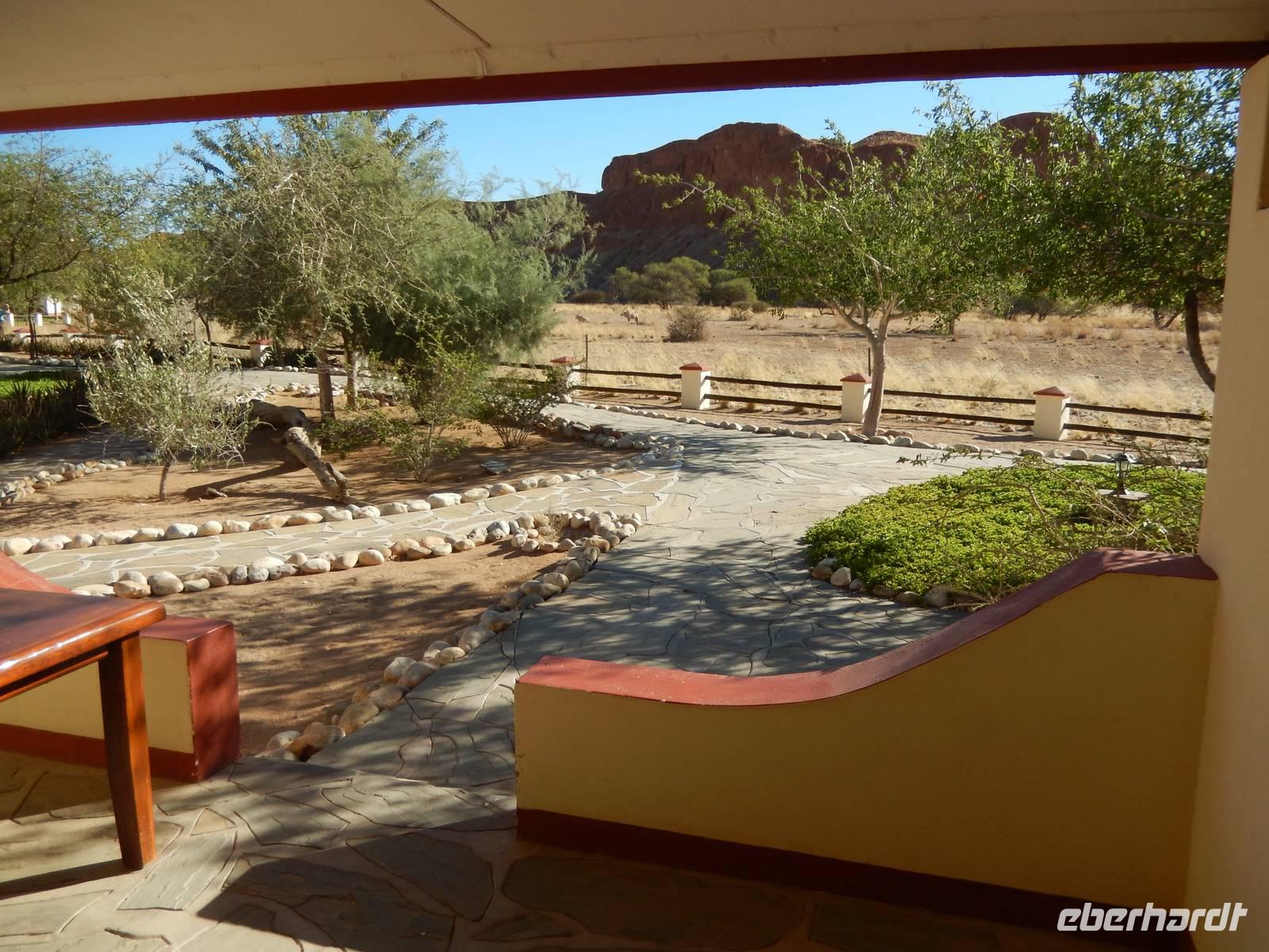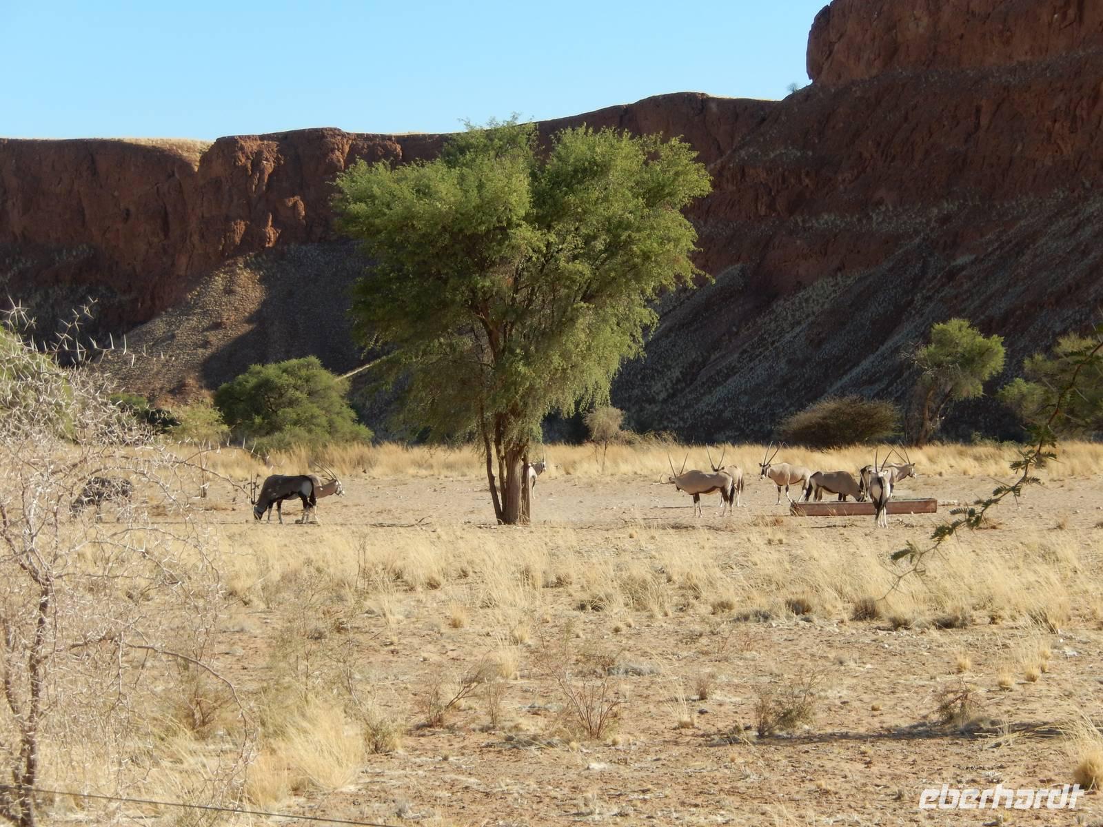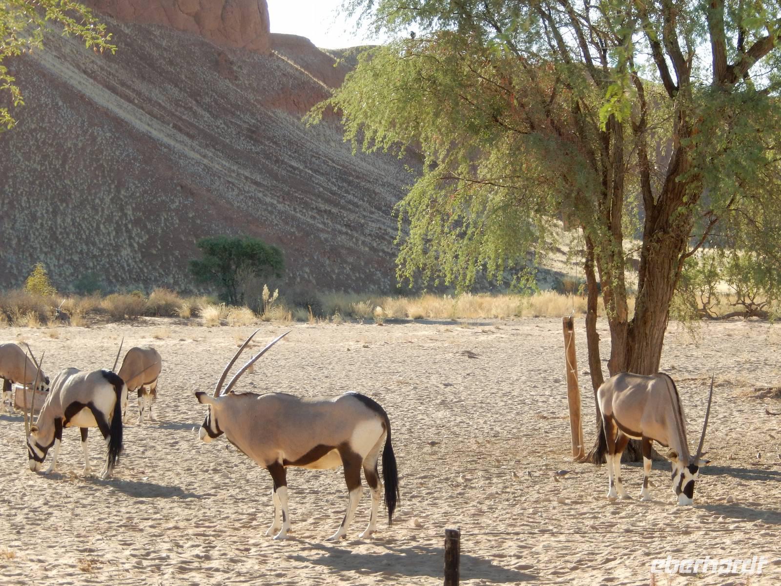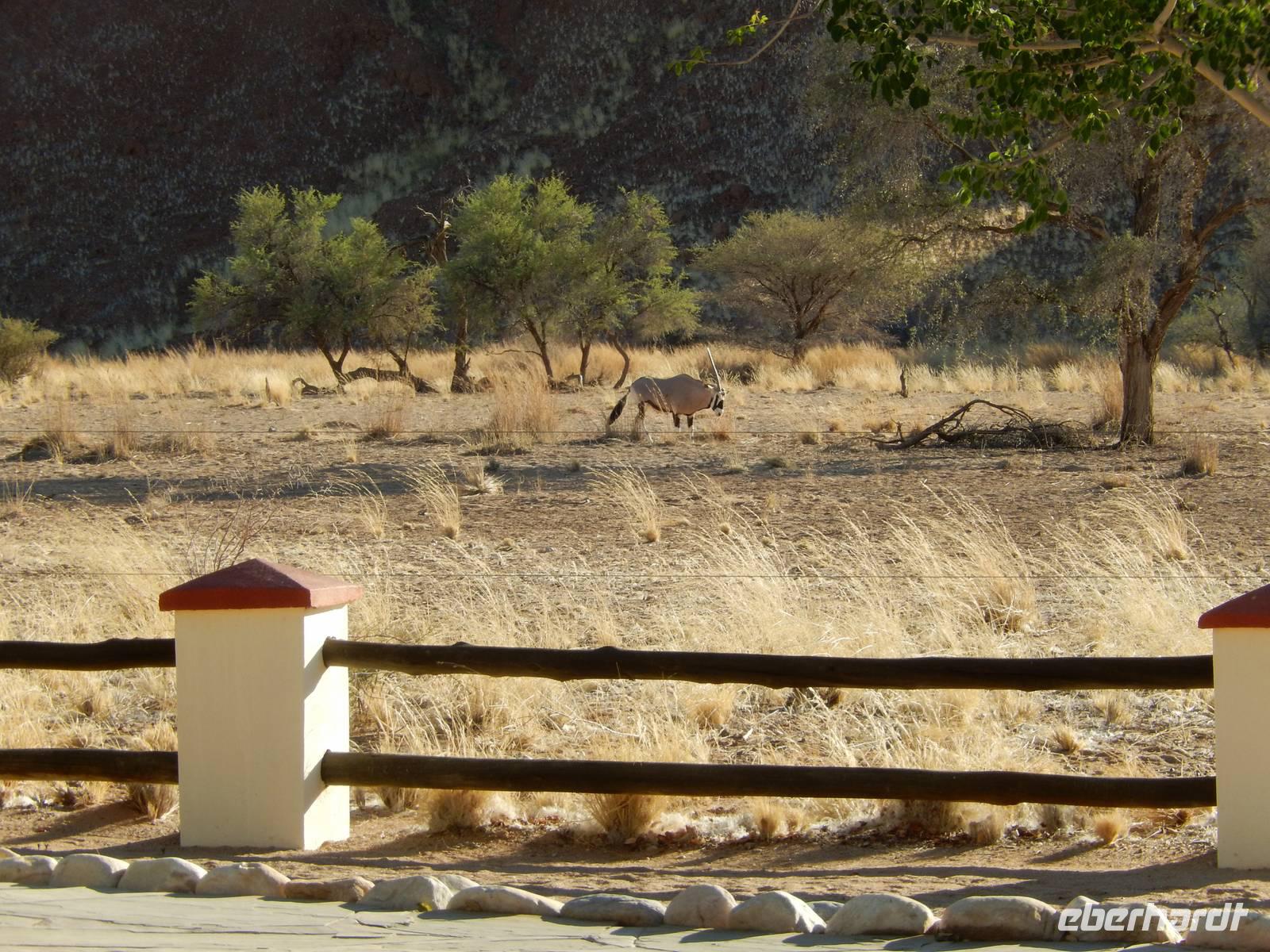 In der Lodge angekommen, waren wir von der Lage direkt am Wasserloch total begeistert und viele Oryx-Antilopen begrüßten uns schon vor unseren Bingalows.