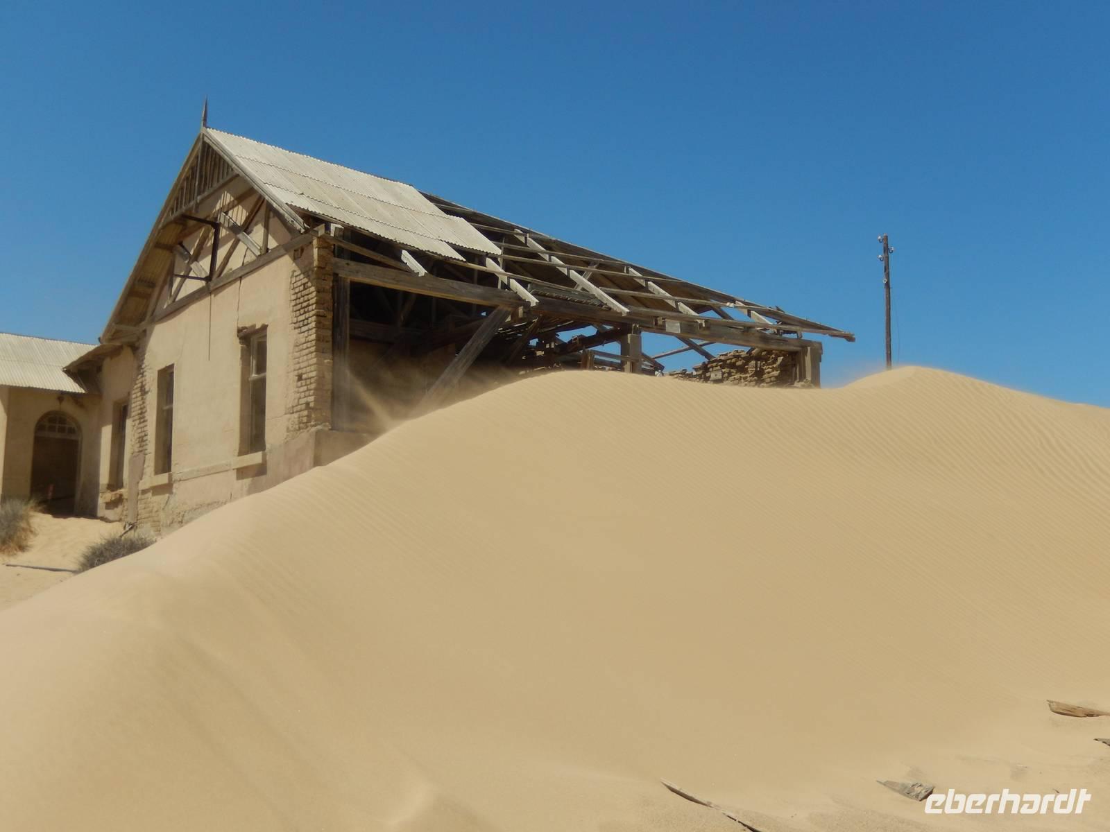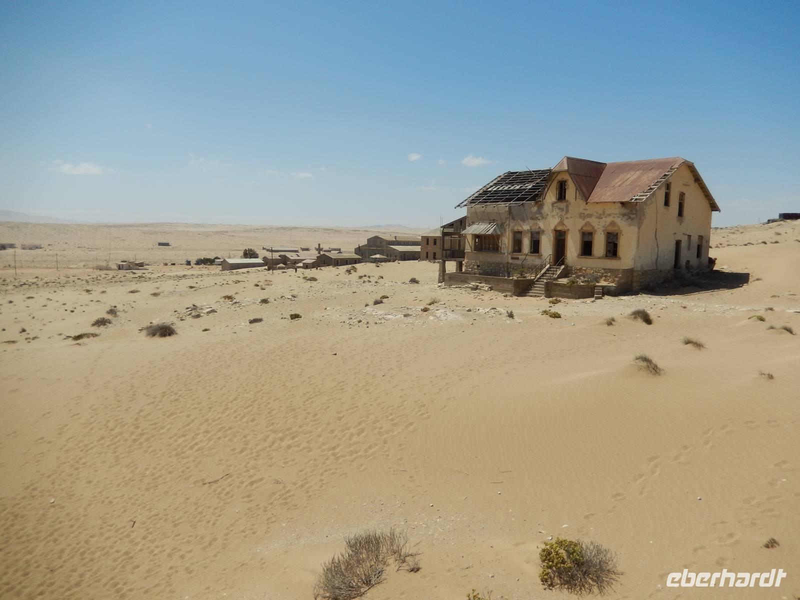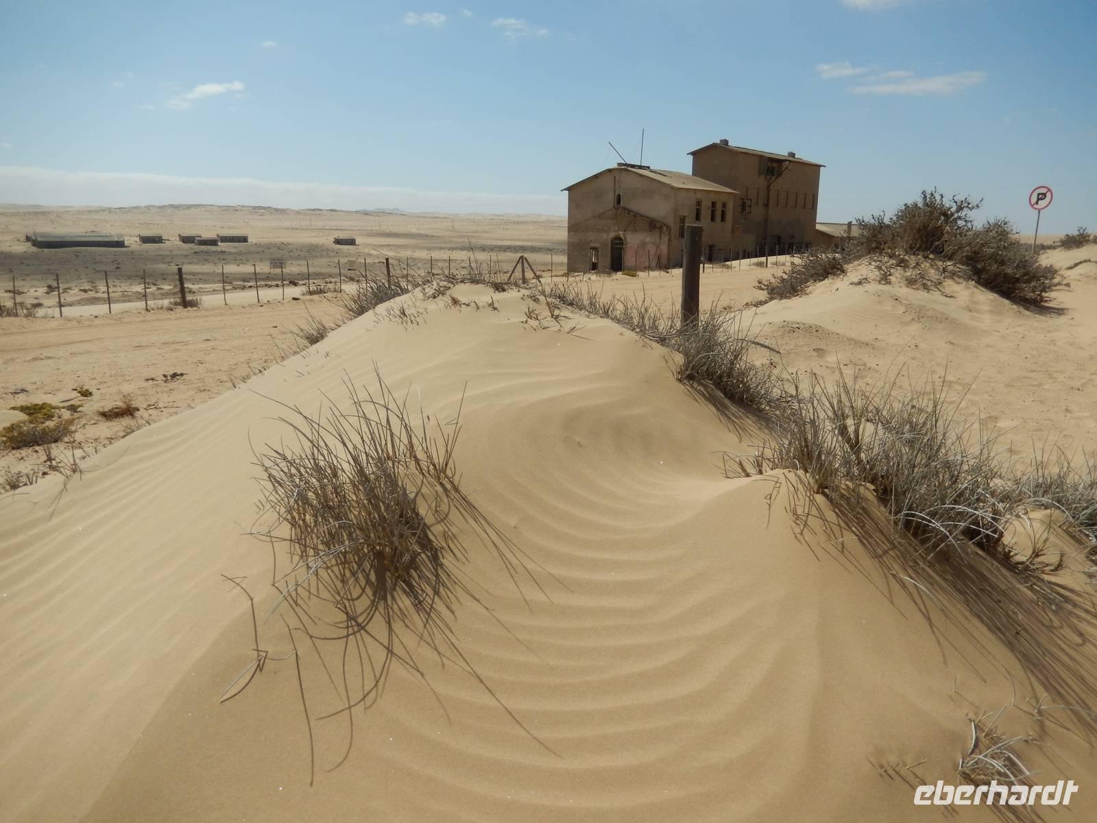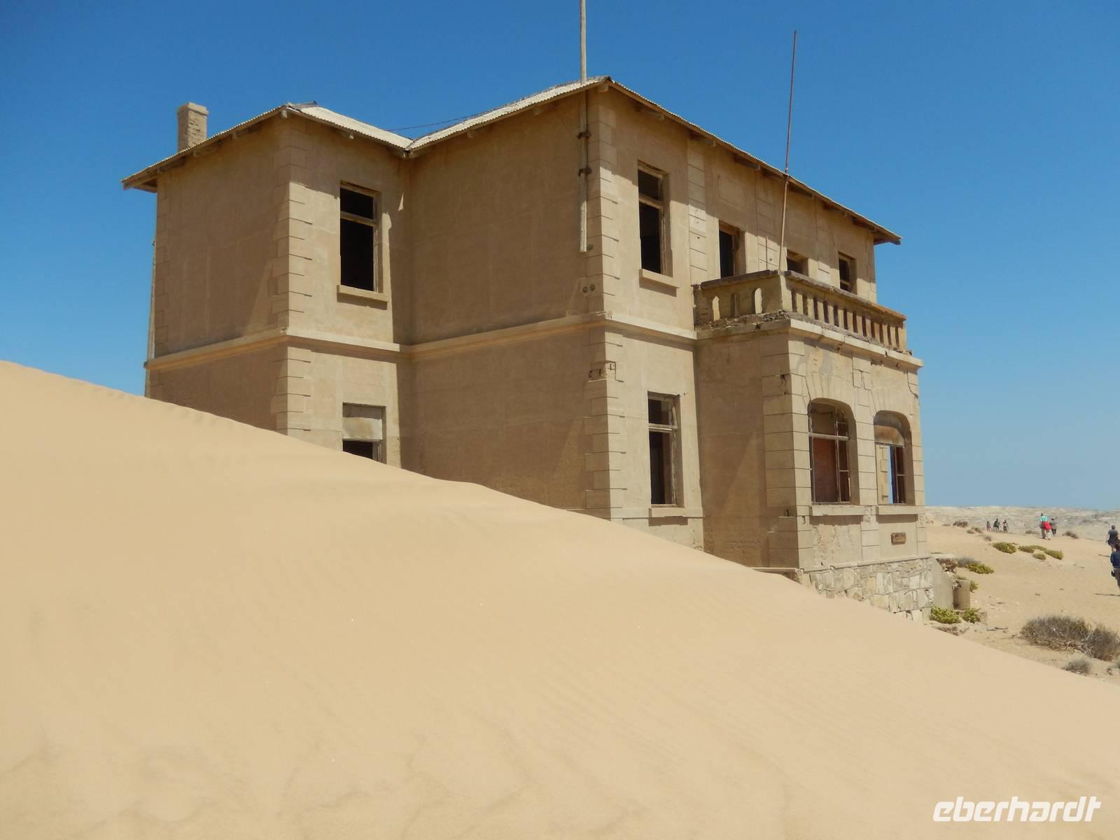 Immer entlang der Bahnschiene fuhren wir nach Westen, stetig bergab. Links und rechts der Straße warnen Schilder vor Sand und Wind. Und genau deswegen hatten die unerfahrenen Kolonialisten aus Deutschland im damaligen Südwestafrika alle Hände voll zu tun, die Schiene vom Sand zu befreien. Wir stoppten an der vegetationslosen, nur vom Wüstensand umgebenen Bahnstation Grasplatz, wo Oberbahnmeister August Stauch 1908 von seinem Mitarbeiter und "Schienenkehrer" eines Tages einen funkelnden Stein bekam. Härte: 10! In diesem Augenblick wurde er zum Diamantenkönig Südwestafrikas und der Diamantenrausch begann. Ein Diamanten-Sperrgebiet wurde proklamiert und innerhalb von zwei Jahren entstand Kolmanskop in der kargen Sandwüste, ein kompletter Ort mit Schule, einem bestens ausgestatteten Krankenhaus, einer Eisfabrik, einem Kasino mit Kegelbahn und exklusiven Wohnhäusern. Die Diamantenindustrie boomte, doch als es schwieriger wurde, die Diamanten an der Oberfläche einfach "abzulesen", wurde die industrielle Diamantenproduktion in Elizabeth Bay etwas südlich von Kolmanskop gegründet. Bis zum ersten Weltkrieg konnten so über 1000 Kilo Diamanten gefördert werden. Nach dem Krieg gingen die Diamantenfunde sehr stark zurück. Außerdem wurden weiter südlich bei Oranjemund erheblich größere Diamanten gefunden. Kolmanskop wurde - ebenso wie Elizabeth Bay - zur Geisterstadt! Mit dem örtlichen Guide William machten wir uns ein Bild von der Geisterstadt mitten im Wüstensand. Sand soweit das Auge reicht, nahezu verschluckt wurde Kolmanskop von ihm. Einsam und verlassen stehen die Häuser noch hier, Menschen leben hier nicht mehr, der letzte verließ seine Behausung in den 60er Jahren. Längst hat die Wüste den Ort eingenommen. Unaufhaltsam dringt der Sand durch Türen und Fenster in die Häuser, bedeckt den Boden, macht ein Leben hier unmöglich.
