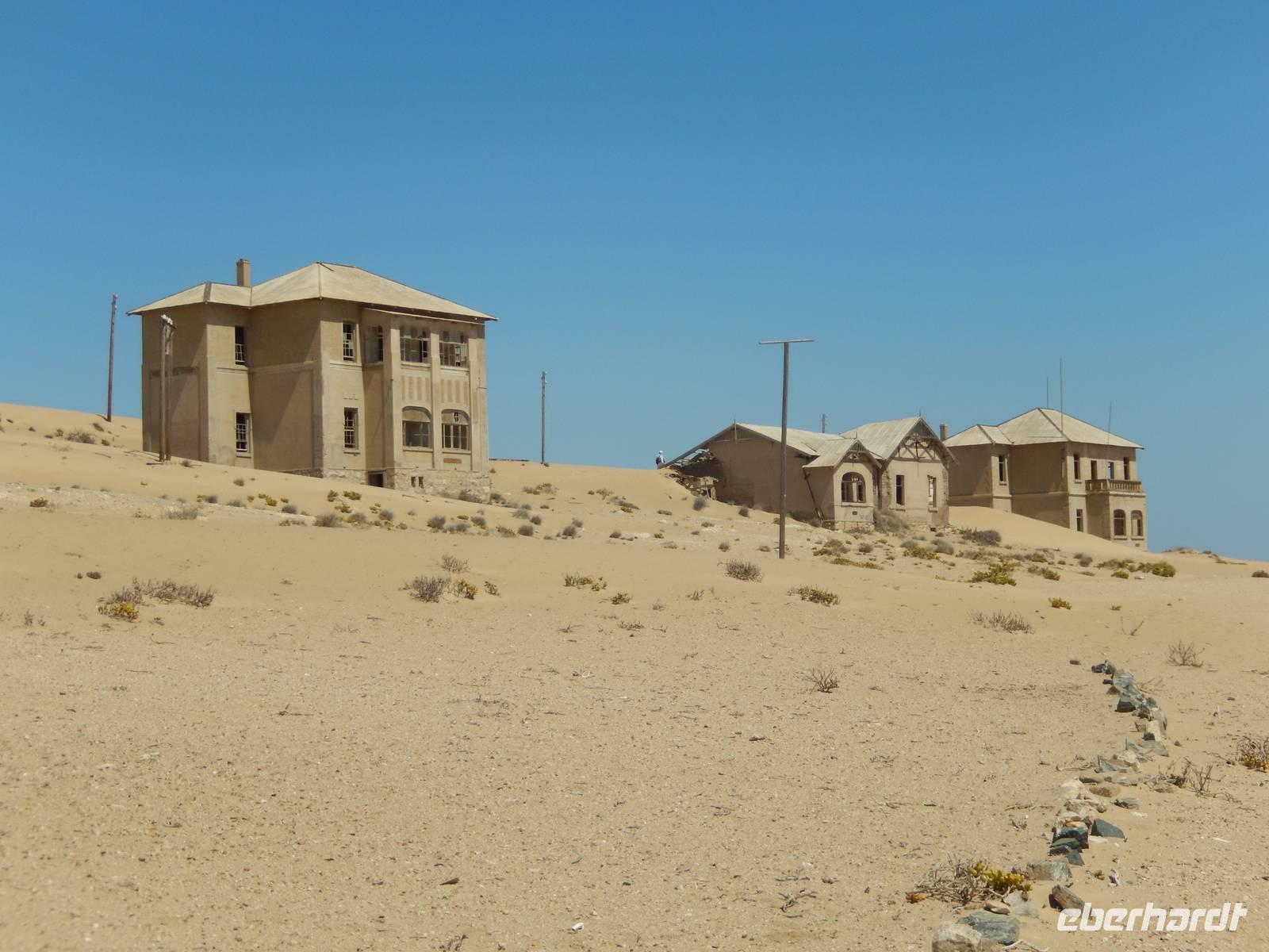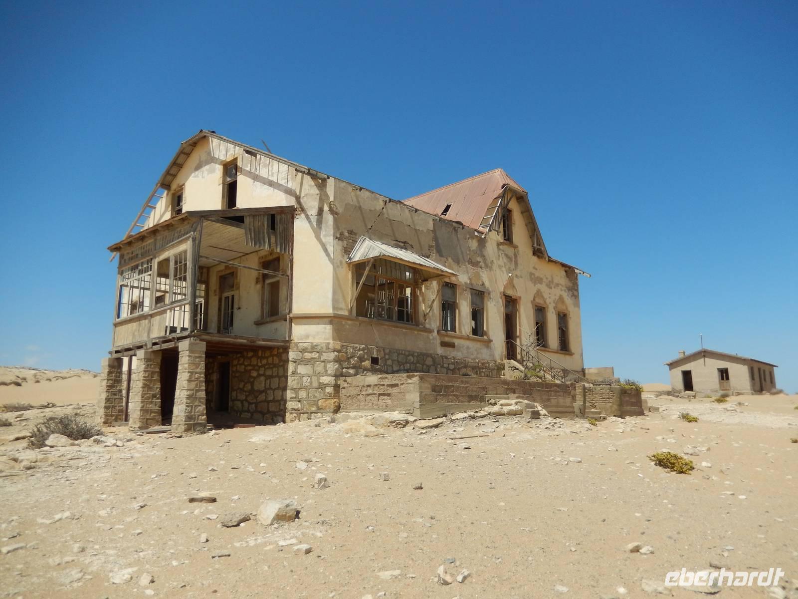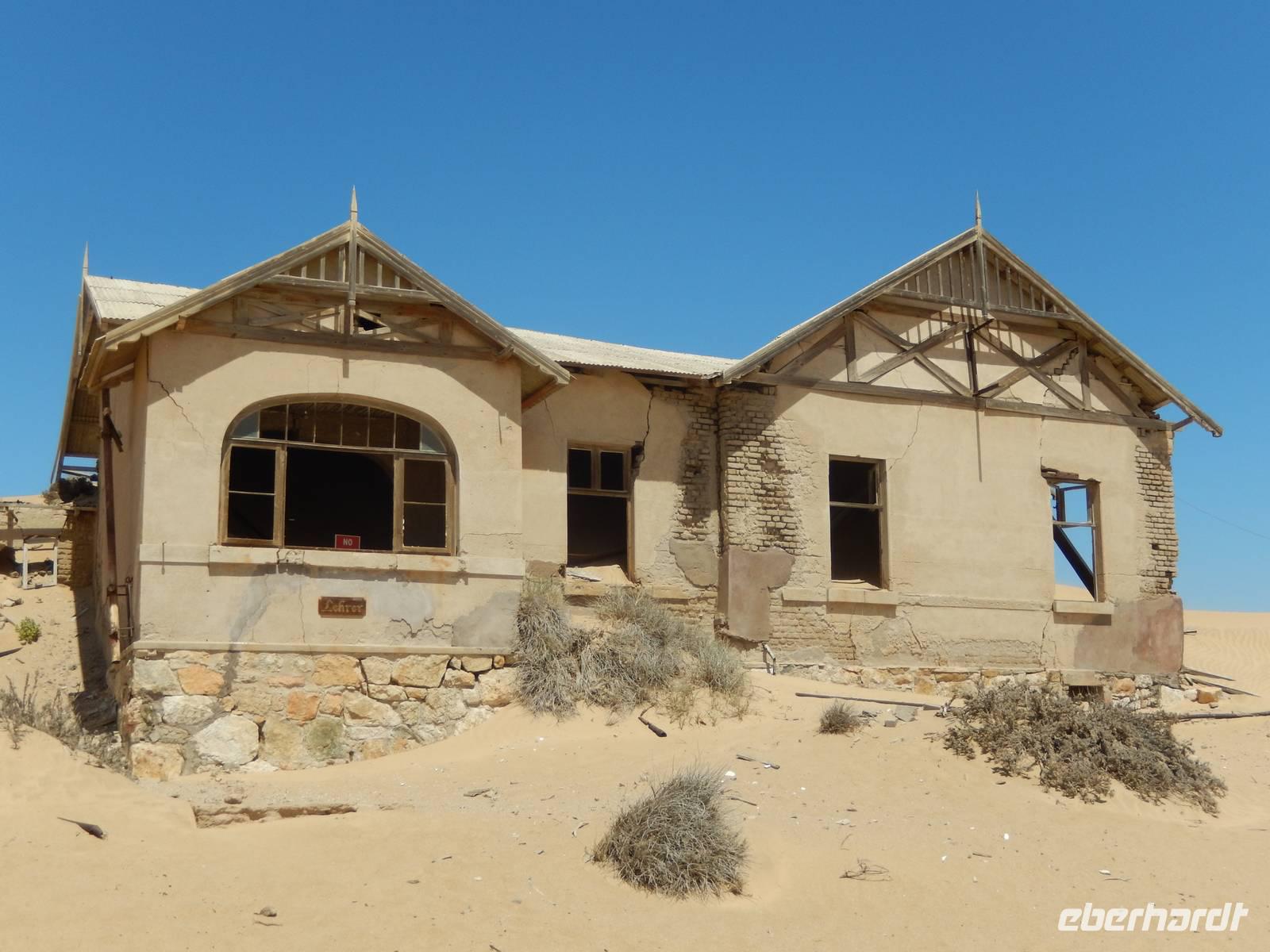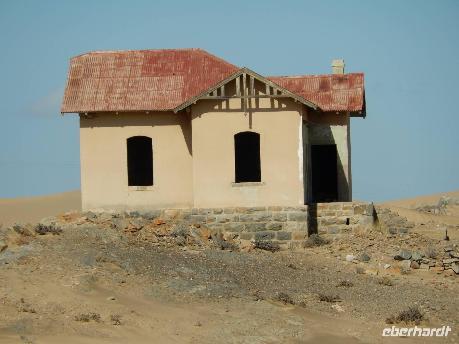 Immer entlang der Bahnschiene fuhren wir nach Westen, stetig bergab. Links und rechts der Straße warnen Schilder vor Sand und Wind. Und genau deswegen hatten die unerfahrenen Kolonialisten aus Deutschland im damaligen Südwestafrika alle Hände voll zu tun, die Schiene vom Sand zu befreien. Wir stoppten an der vegetationslosen, nur vom Wüstensand umgebenen Bahnstation Grasplatz, wo Oberbahnmeister August Stauch 1908 von seinem Mitarbeiter und "Schienenkehrer" eines Tages einen funkelnden Stein bekam. Härte: 10! In diesem Augenblick wurde er zum Diamantenkönig Südwestafrikas und der Diamantenrausch begann. Ein Diamanten-Sperrgebiet wurde proklamiert und innerhalb von zwei Jahren entstand Kolmanskop in der kargen Sandwüste, ein kompletter Ort mit Schule, einem bestens ausgestatteten Krankenhaus, einer Eisfabrik, einem Kasino mit Kegelbahn und exklusiven Wohnhäusern. Die Diamantenindustrie boomte, doch als es schwieriger wurde, die Diamanten an der Oberfläche einfach "abzulesen", wurde die industrielle Diamantenproduktion in Elizabeth Bay etwas südlich von Kolmanskop gegründet. Bis zum ersten Weltkrieg konnten so über 1000 Kilo Diamanten gefördert werden. Nach dem Krieg gingen die Diamantenfunde sehr stark zurück. Außerdem wurden weiter südlich bei Oranjemund erheblich größere Diamanten gefunden. Kolmanskop wurde - ebenso wie Elizabeth Bay - zur Geisterstadt! Mit dem örtlichen Guide William machten wir uns ein Bild von der Geisterstadt mitten im Wüstensand. Sand soweit das Auge reicht, nahezu verschluckt wurde Kolmanskop von ihm. Einsam und verlassen stehen die Häuser noch hier, Menschen leben hier nicht mehr, der letzte verließ seine Behausung in den 60er Jahren. Längst hat die Wüste den Ort eingenommen. Unaufhaltsam dringt der Sand durch Türen und Fenster in die Häuser, bedeckt den Boden, macht ein Leben hier unmöglich.