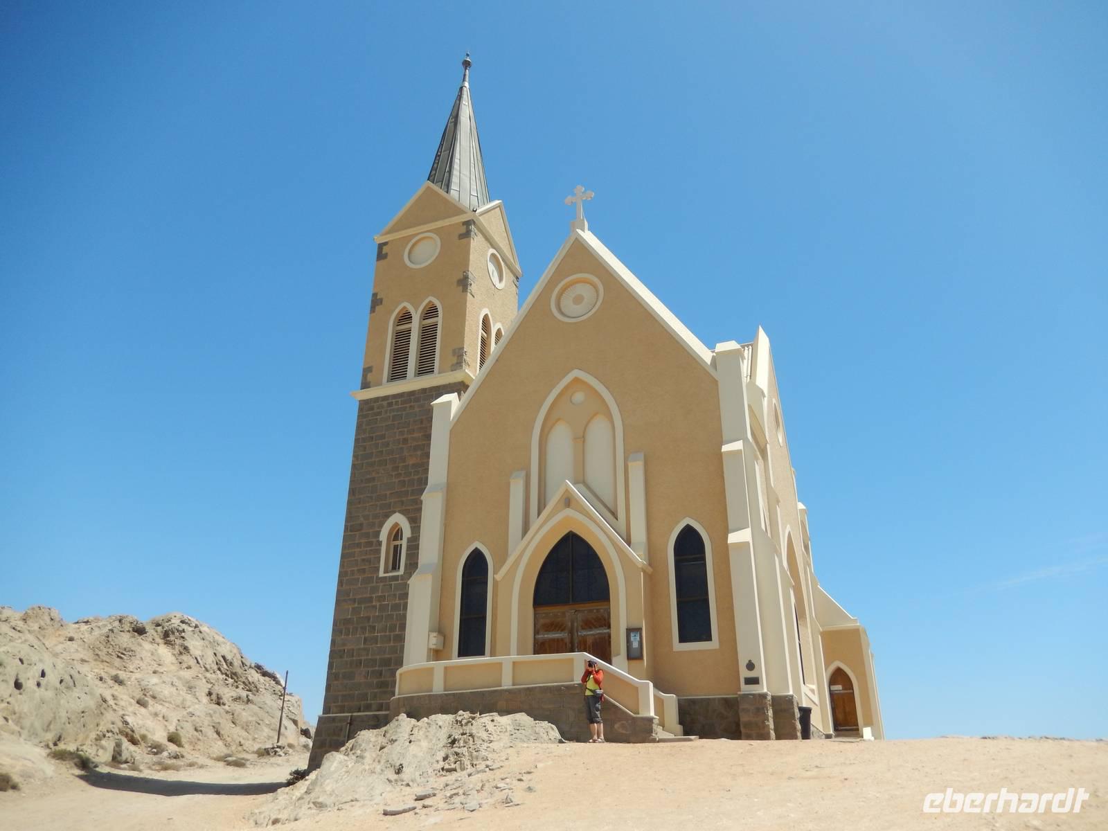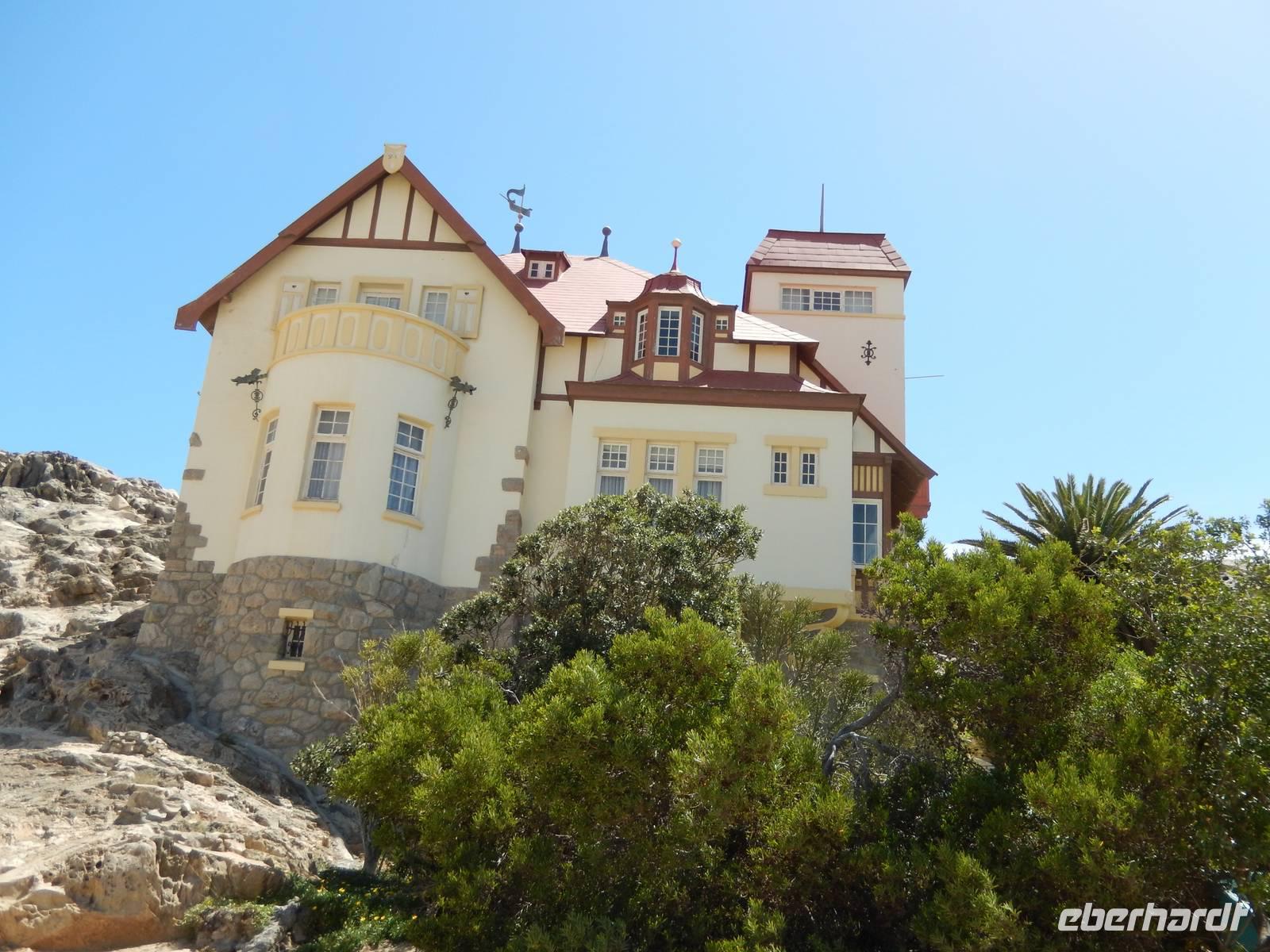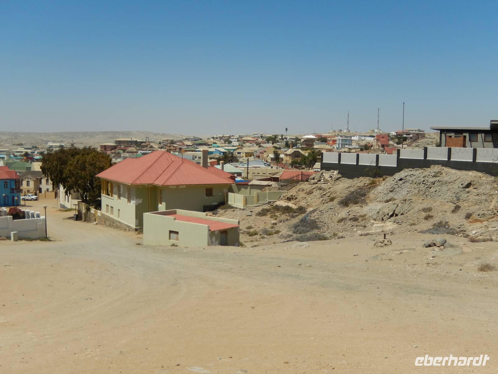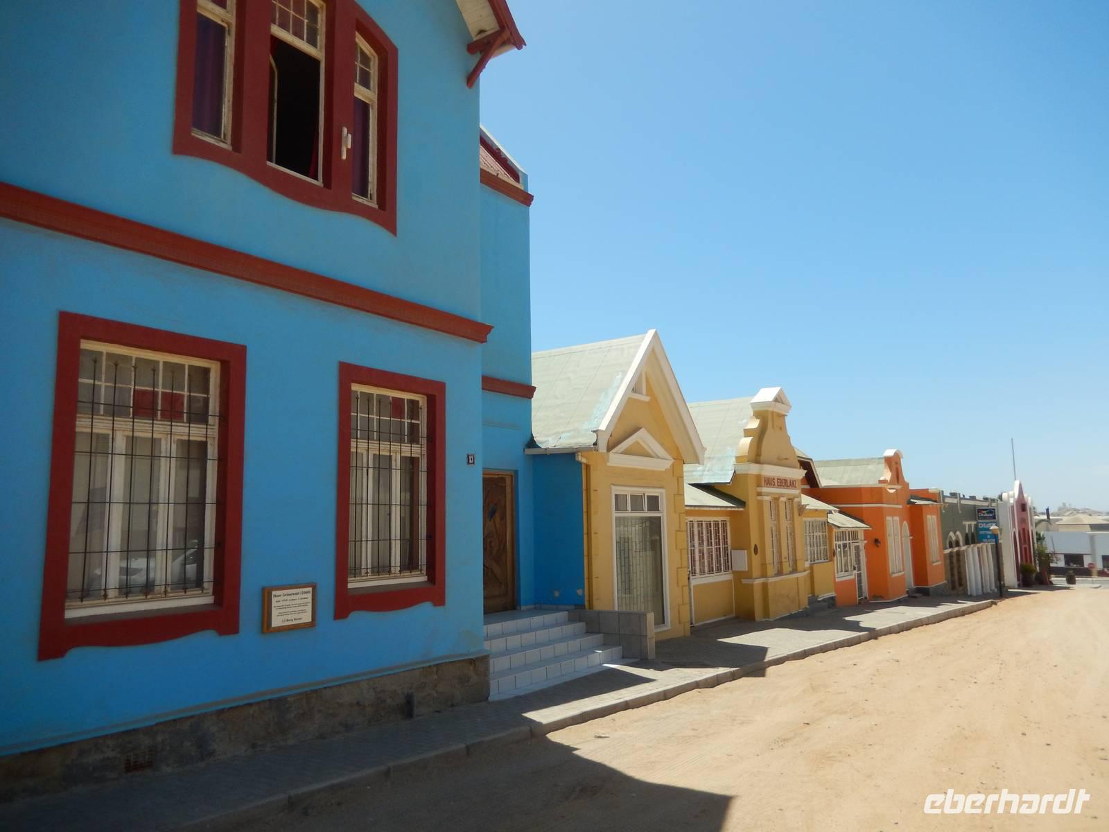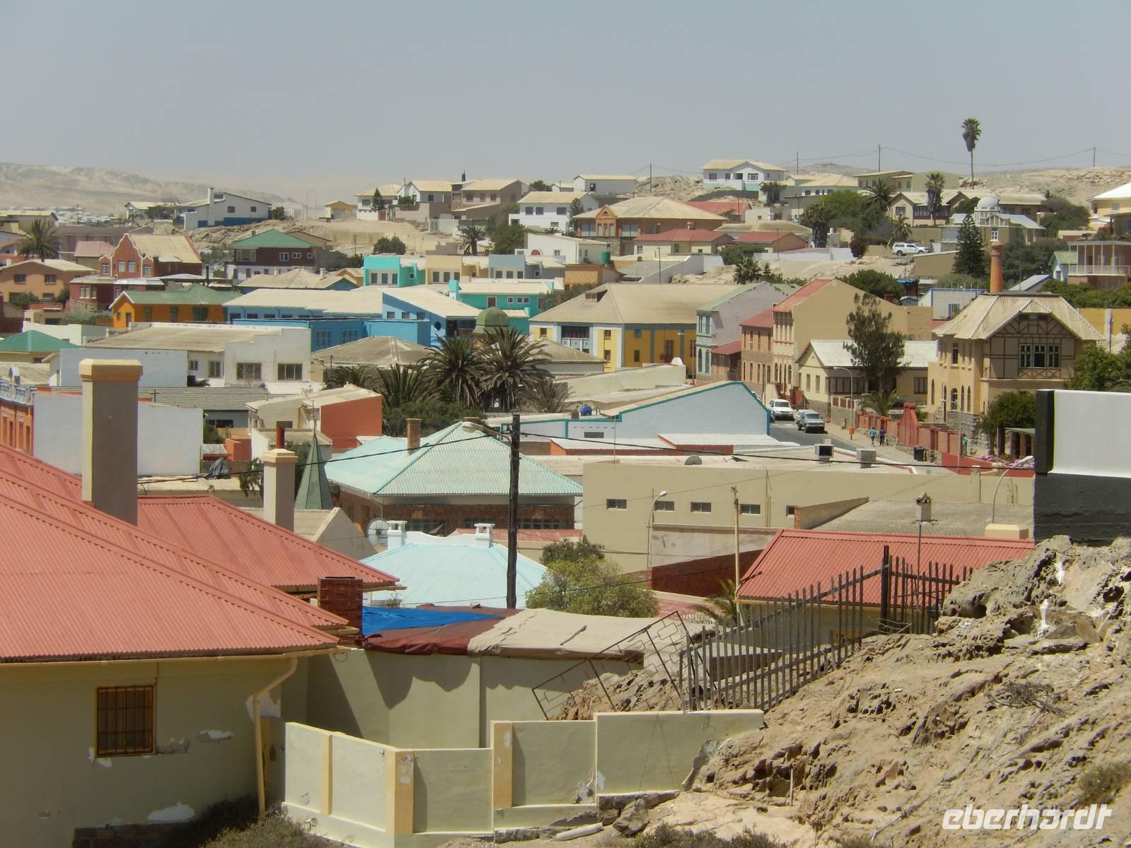Beeindruckt setzten wir unsere Tour in Richtung Lüderitz fort, die Gründerstadt Namibias an der rauen Atlantikküste. Hier war das Klima schon etwas anders als noch ein paar Kilometer im Landesinneren. Schnell füllten wir unseren Wasservorrat wieder auf und drehten eine Runde durch das kleine Städtchen mit ca. 20.000 Einwohnern. Das nostalgische Lüderitz präsentierte sich als eine sehr farbenprächtige kleine Stadt, bedingt durch die zahlreichen aus der deutschen Kolonialzeit stammenden und liebevoll gepflegten Bauten im damals beliebten Jugendstil und wilhelminischen Baustil. Überragt wird die Stadt von der evangelisch-lutherischen Felsenkirche aus dem Jahre 1911 sowie vom Goerke-Haus mit seinem knallblauen Dach.
