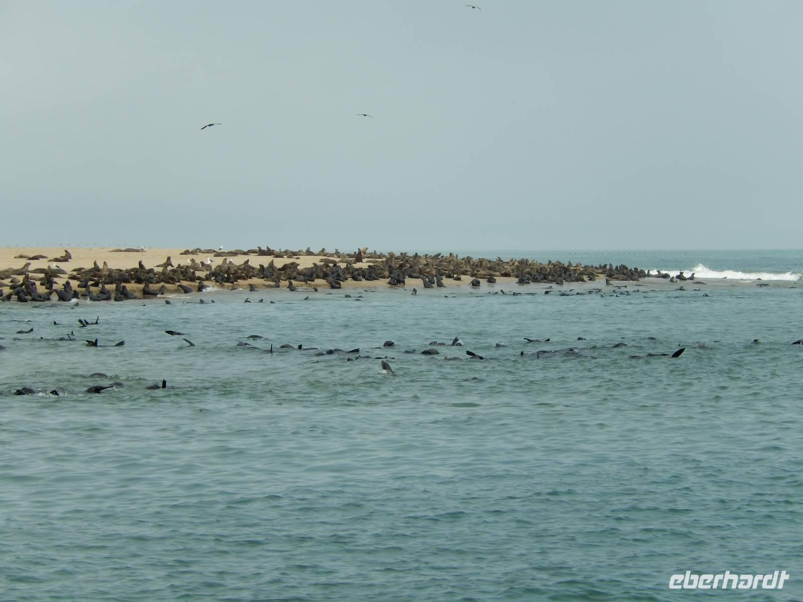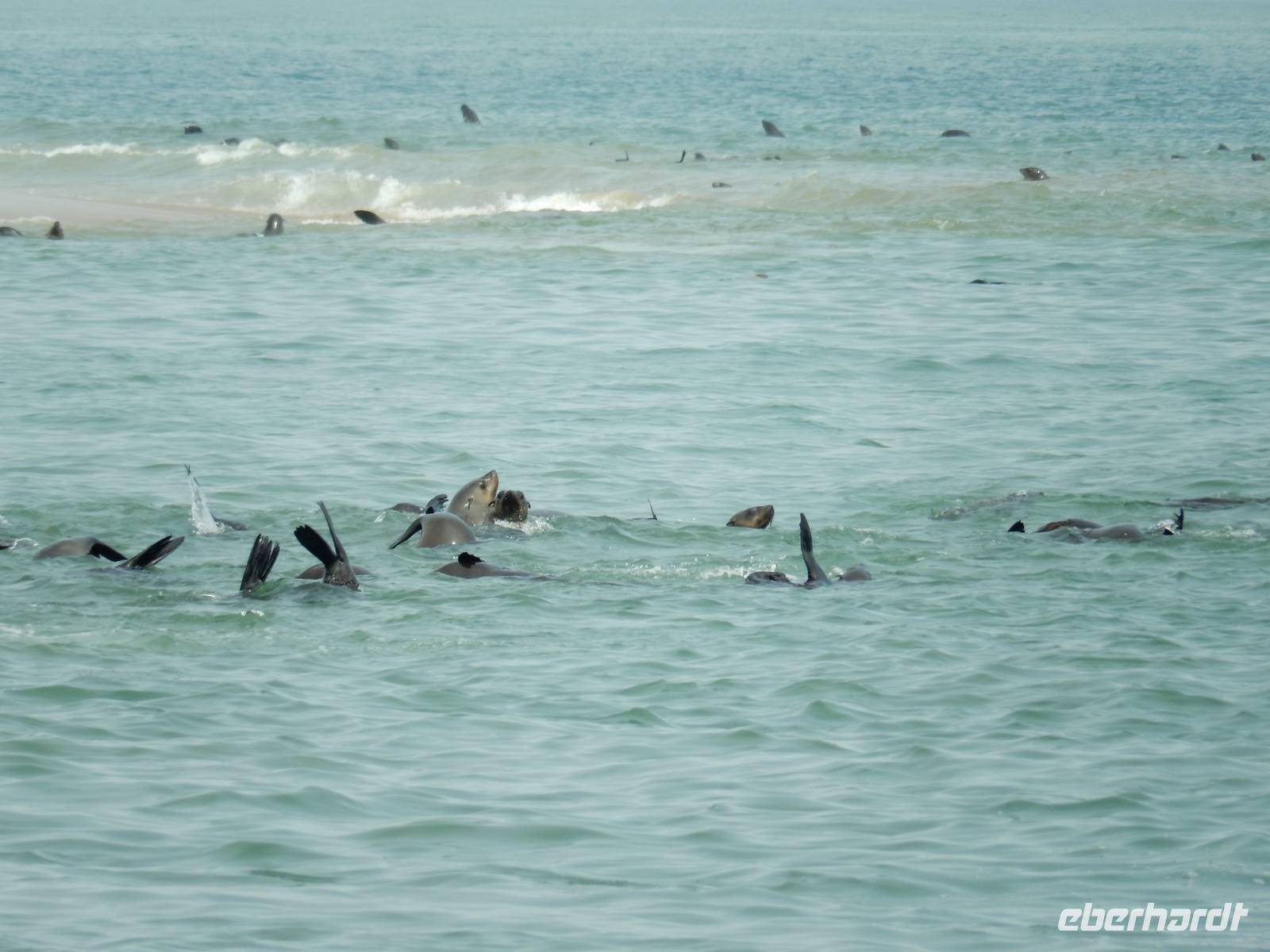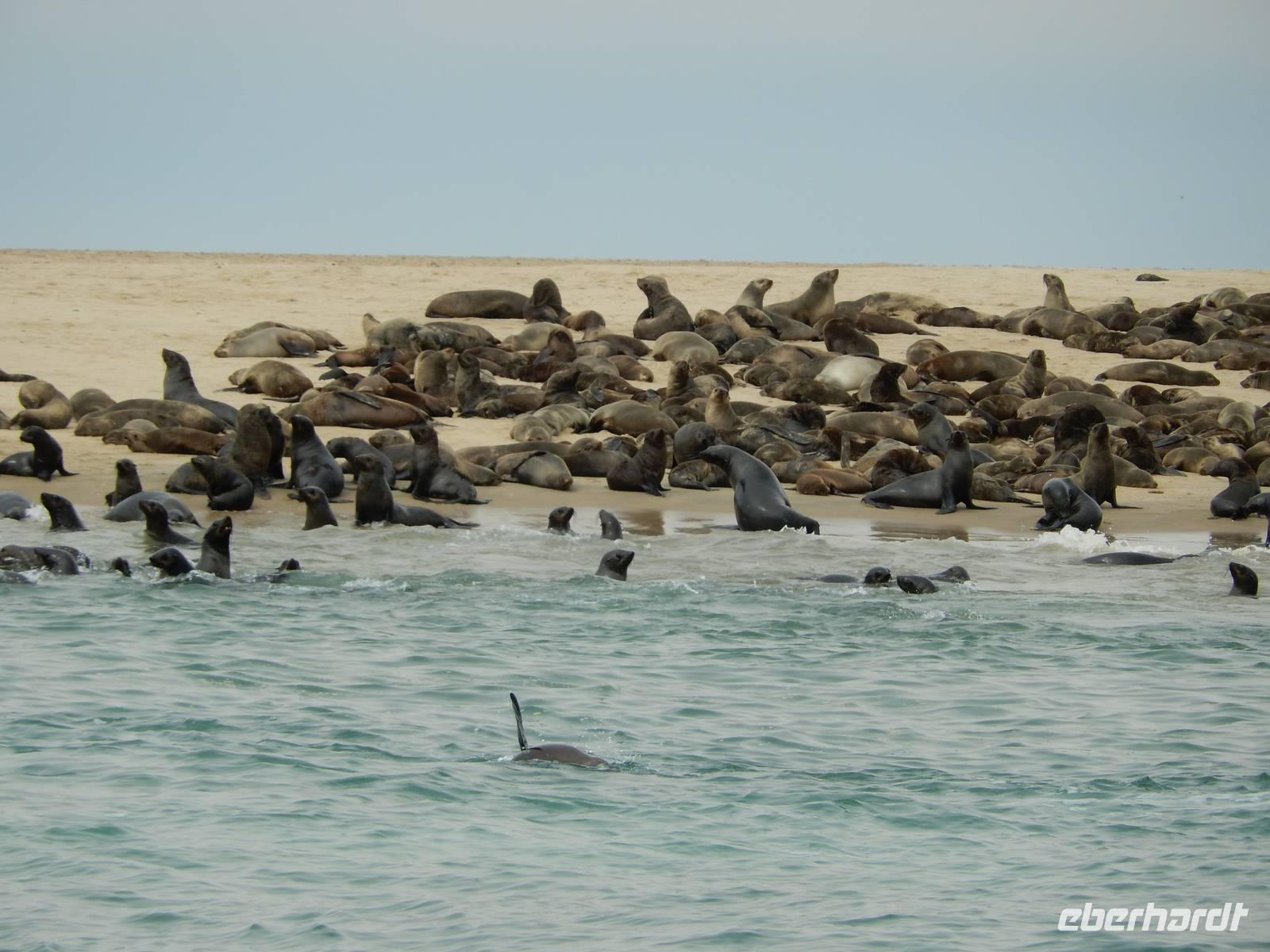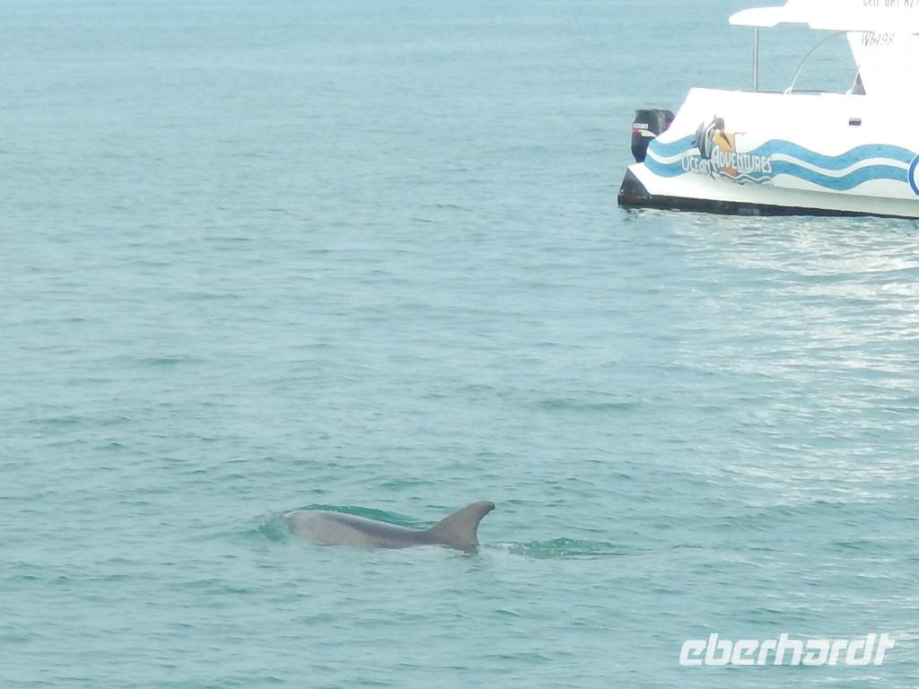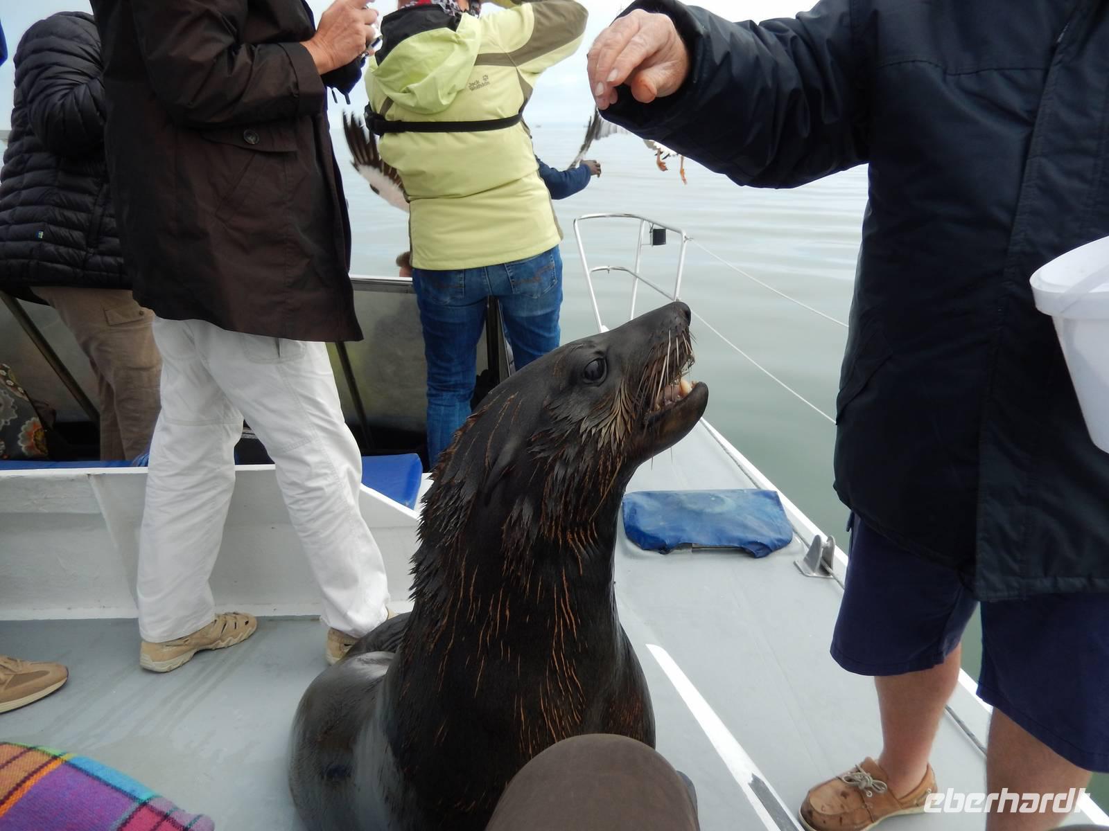 Nun bekamen wir erneut Besuch an Bord. Ein junger Robbenbulle sprang an Deck und robbte gemütlich durch uns durch, wollte gestreichelt, fotografiert und natürlich gefüttert werden. Das war ein Erlebnis! So schipperten wir durch die Lagune und ließen es uns gut gehen. In der Ferne erblickten wir auf der Landzunge den schwarz-weißen Leuchtturm und unzählige Robben auf einer Sandbank. Auf einmal tauchten neben uns die Flossen von Delfinen auf, die rings um unseren Katamaran spielten - einfach toll!