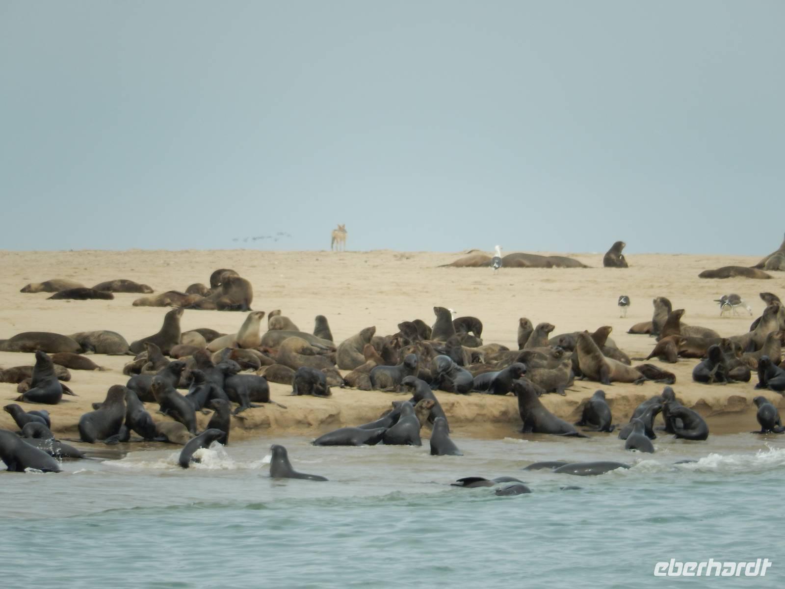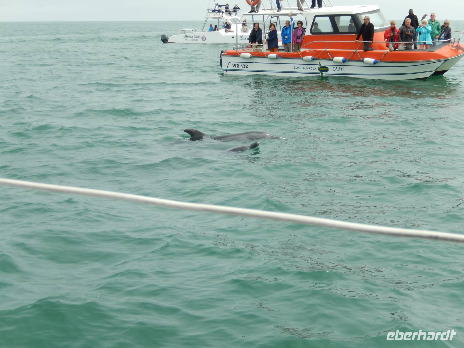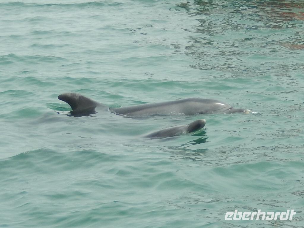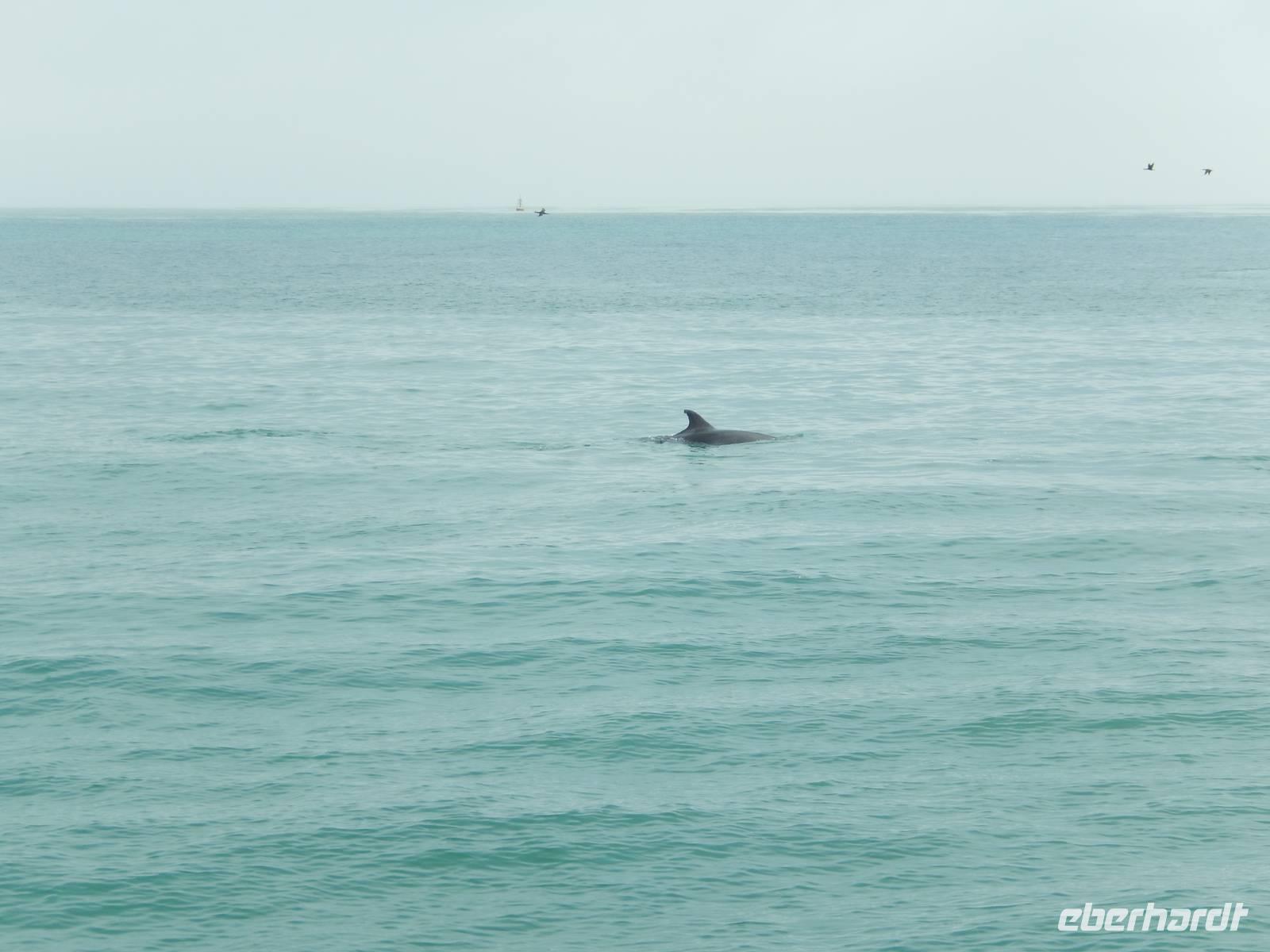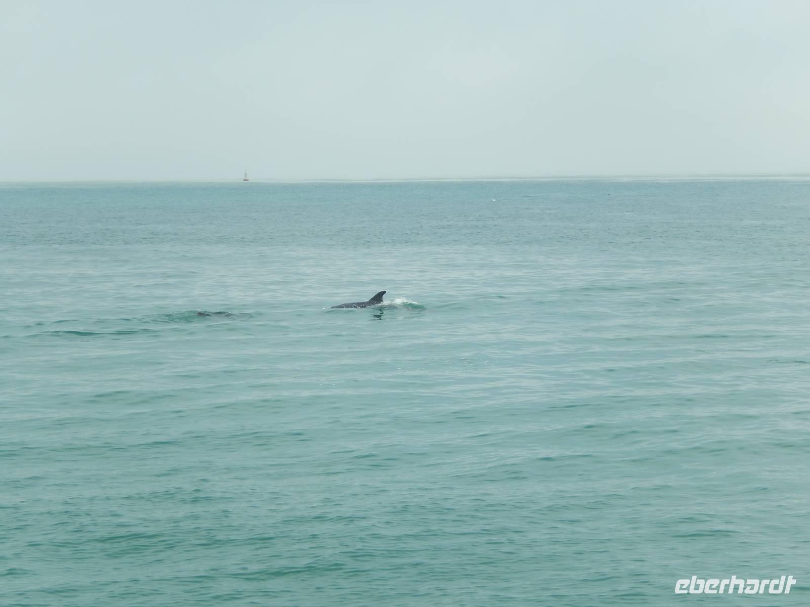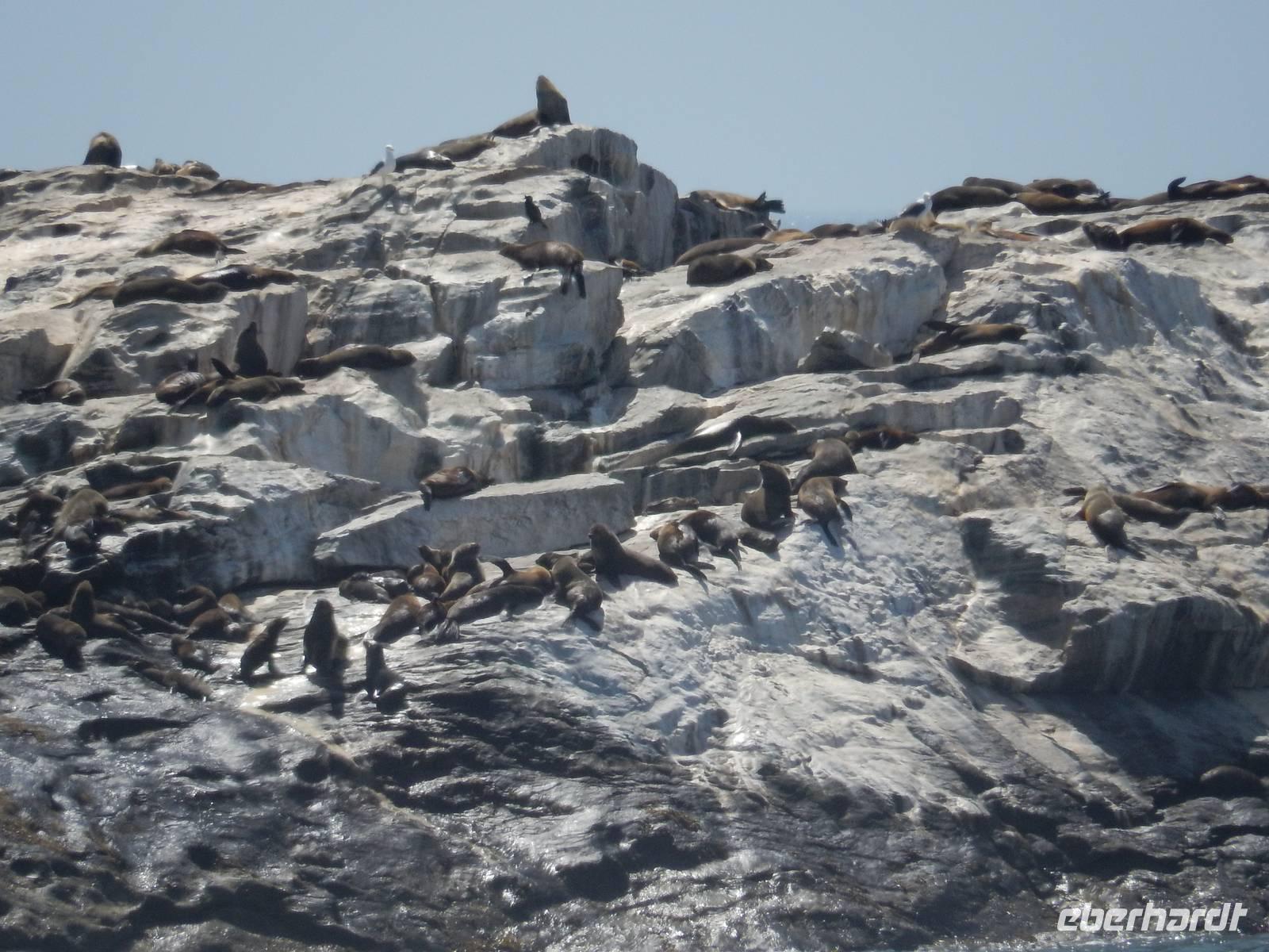 Nun bekamen wir erneut Besuch an Bord. Ein junger Robbenbulle sprang an Deck und robbte gemütlich durch uns durch, wollte gestreichelt, fotografiert und natürlich gefüttert werden. Das war ein Erlebnis! So schipperten wir durch die Lagune und ließen es uns gut gehen. In der Ferne erblickten wir auf der Landzunge den schwarz-weißen Leuchtturm und unzählige Robben auf einer Sandbank. Auf einmal tauchten neben uns die Flossen von Delfinen auf, die rings um unseren Katamaran spielten - einfach toll!
