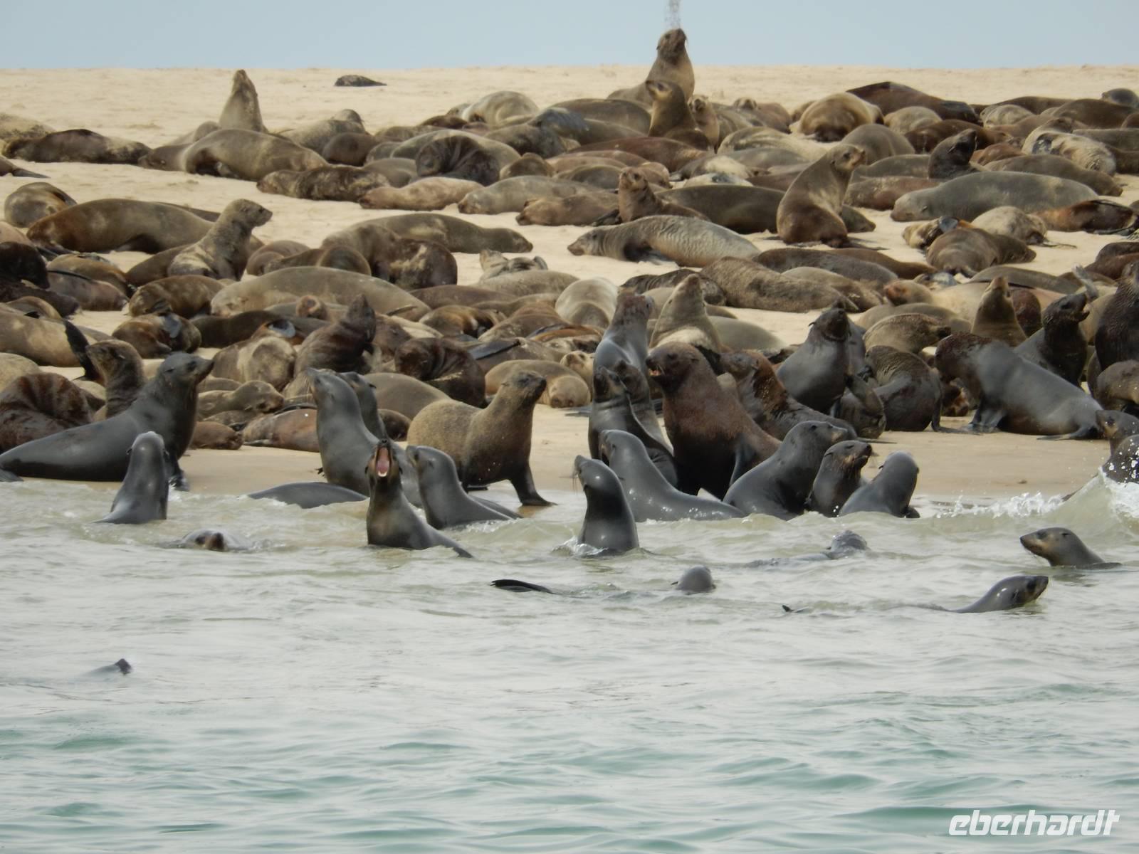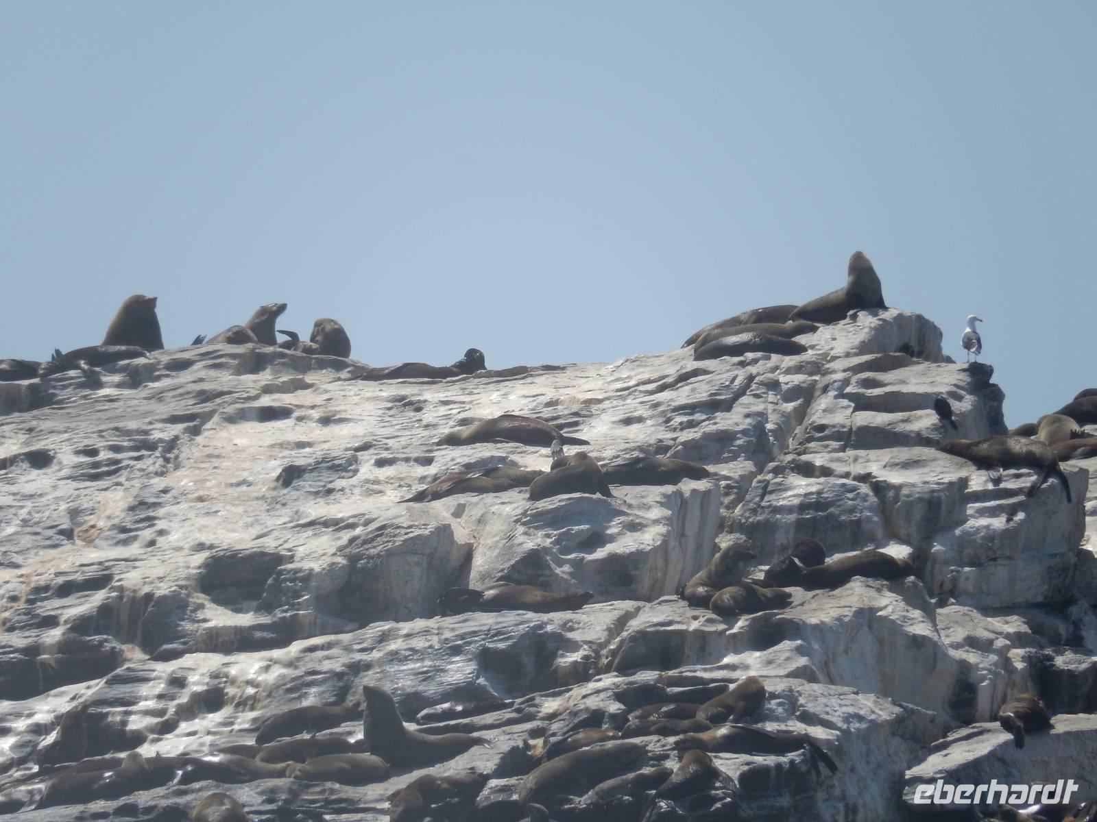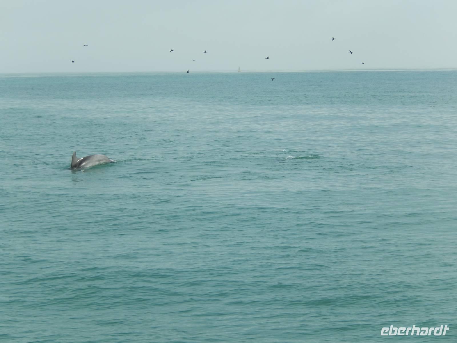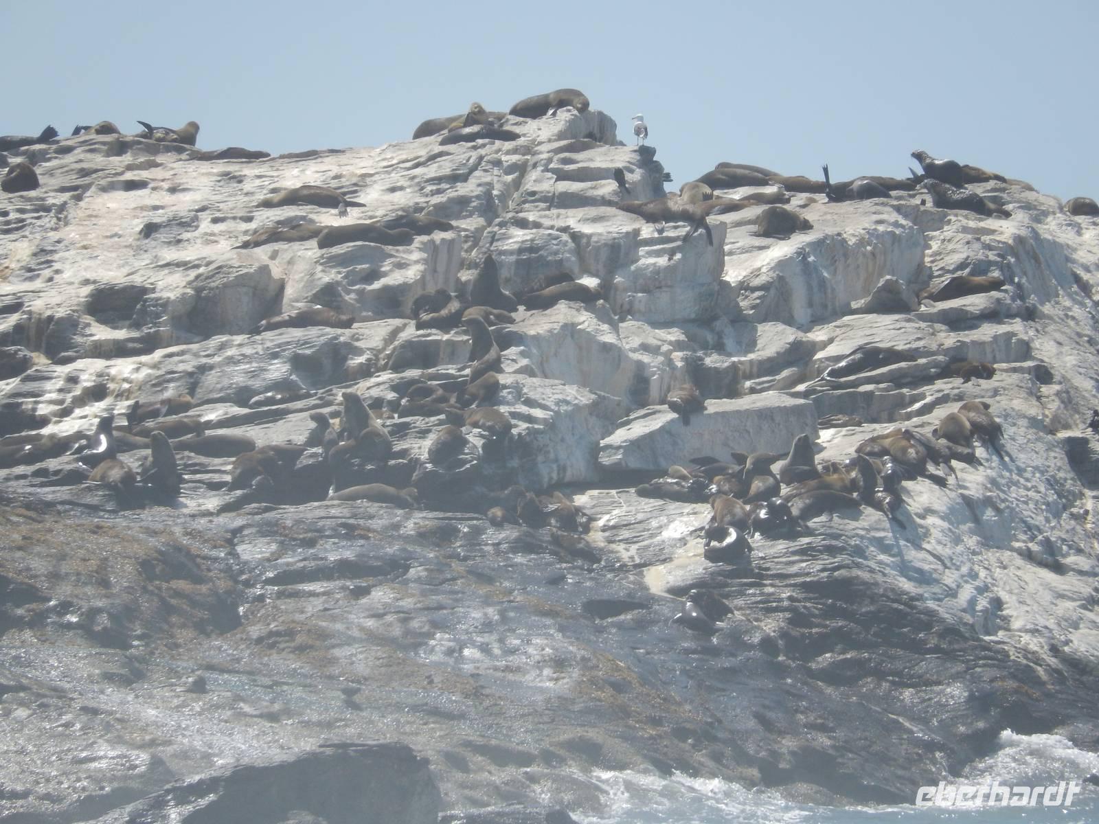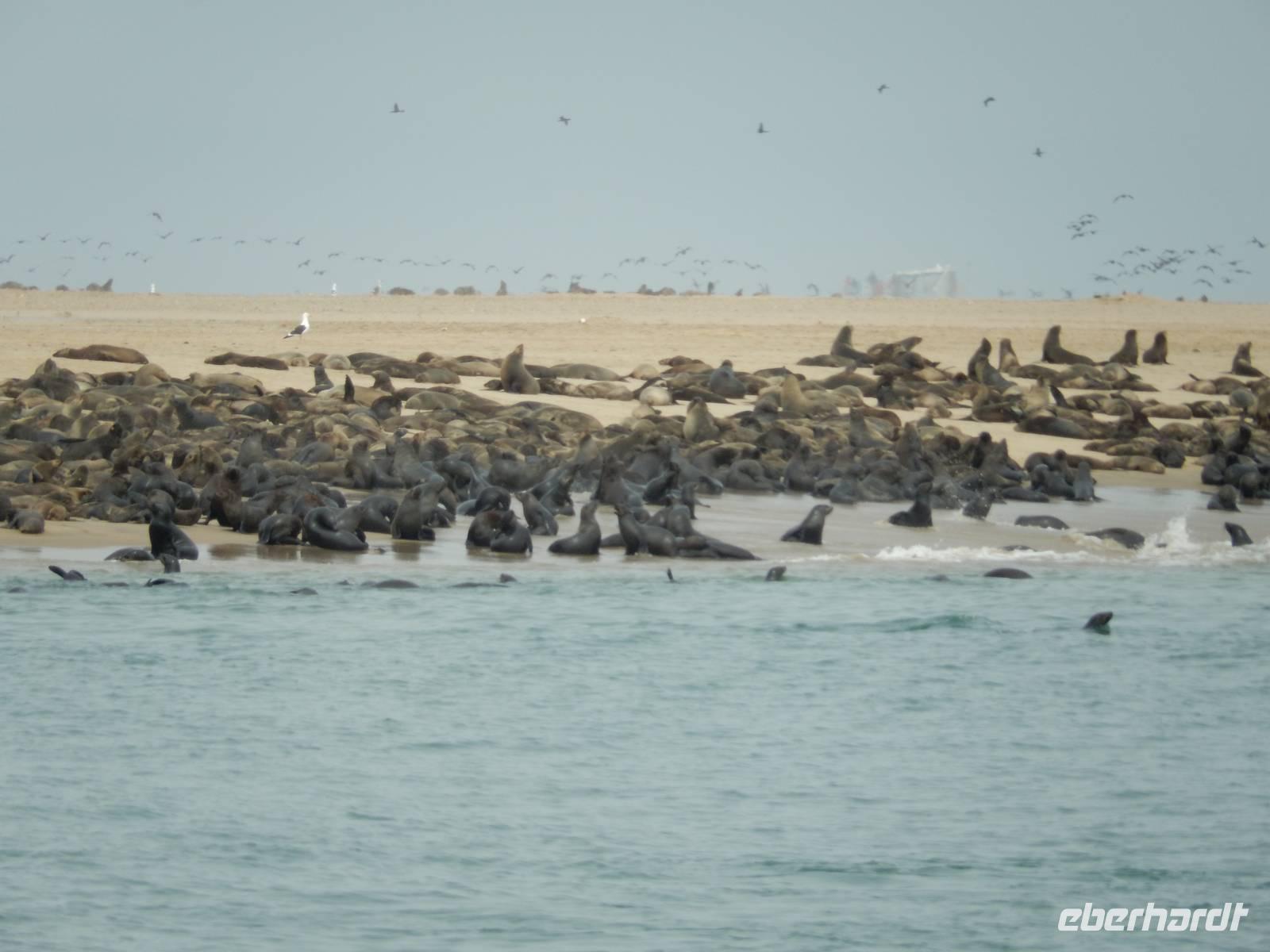 Nun bekamen wir erneut Besuch an Bord. Ein junger Robbenbulle sprang an Deck und robbte gemütlich durch uns durch, wollte gestreichelt, fotografiert und natürlich gefüttert werden. Das war ein Erlebnis! So schipperten wir durch die Lagune und ließen es uns gut gehen. In der Ferne erblickten wir auf der Landzunge den schwarz-weißen Leuchtturm und unzählige Robben auf einer Sandbank. Auf einmal tauchten neben uns die Flossen von Delfinen auf, die rings um unseren Katamaran spielten - einfach toll!