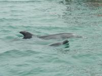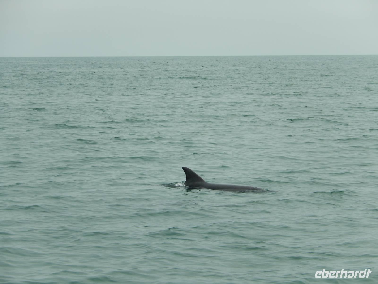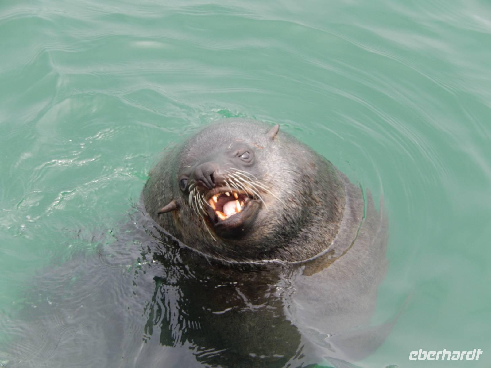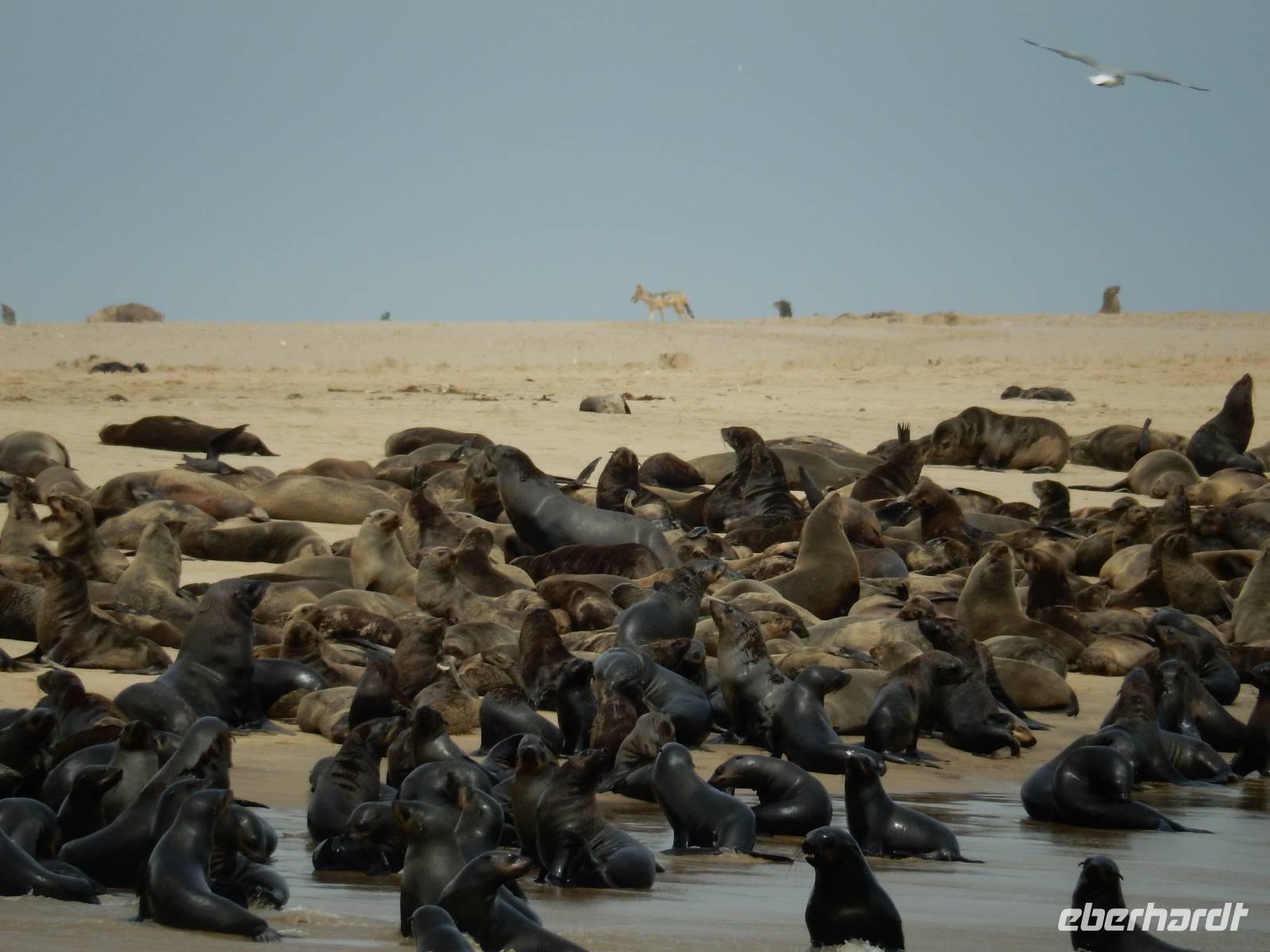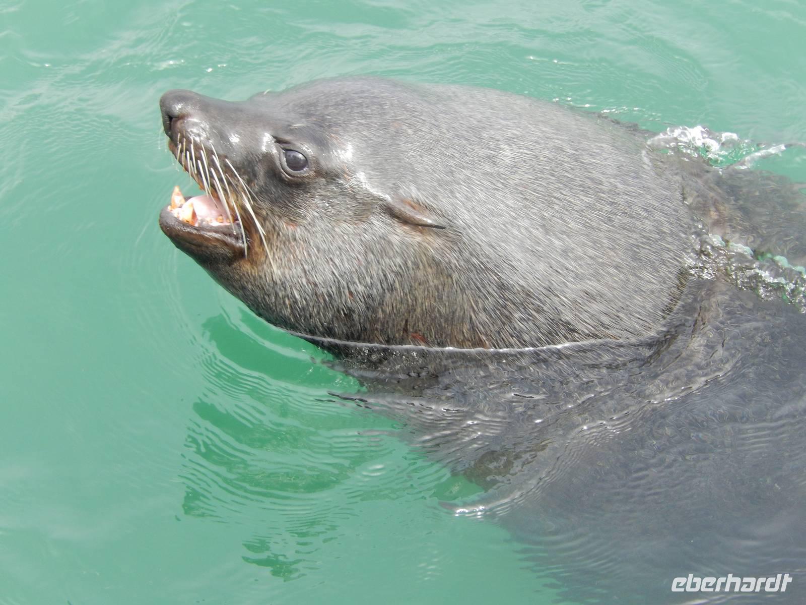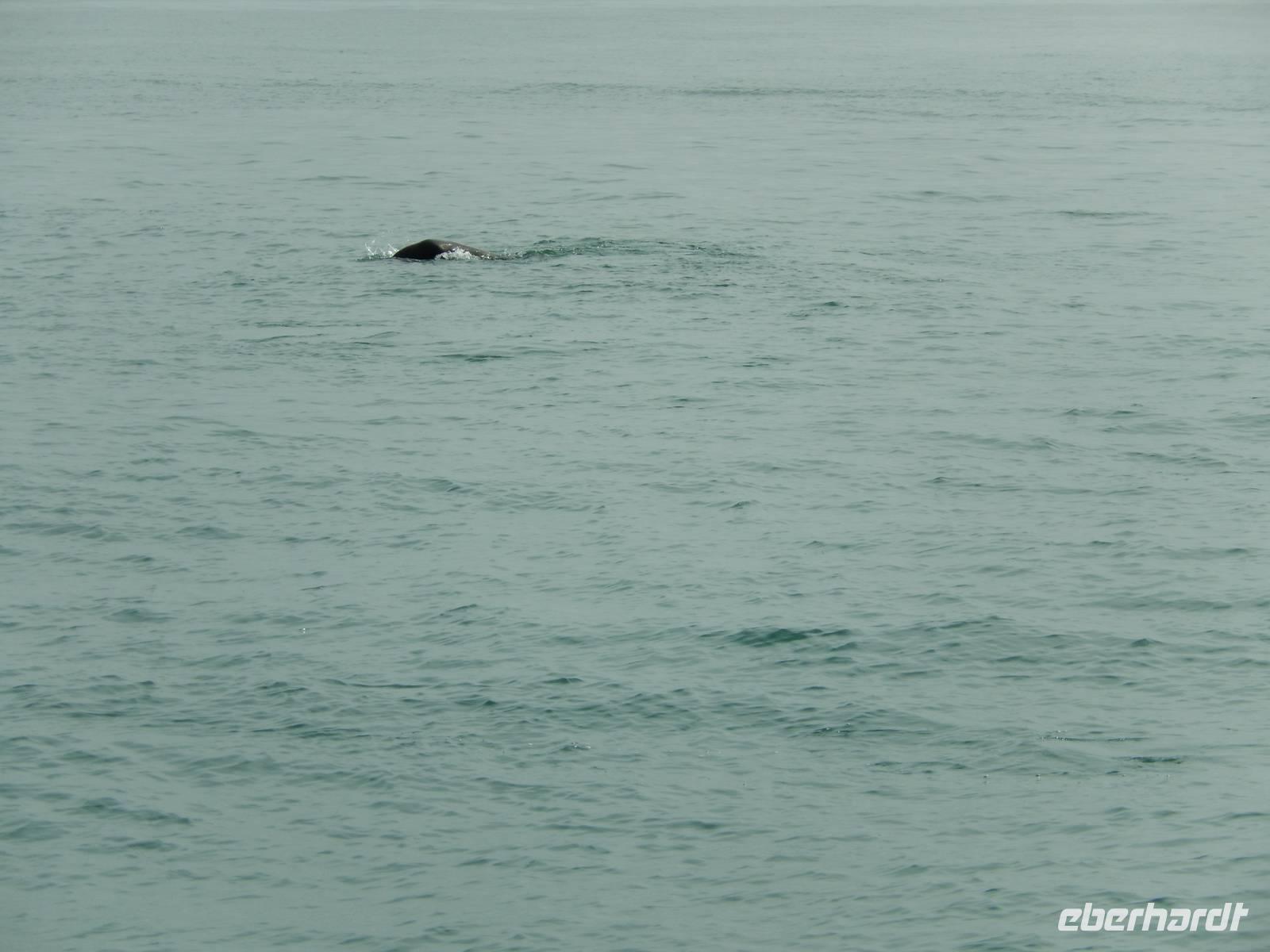 Nun bekamen wir erneut Besuch an Bord. Ein junger Robbenbulle sprang an Deck und robbte gemütlich durch uns durch, wollte gestreichelt, fotografiert und natürlich gefüttert werden. Das war ein Erlebnis! So schipperten wir durch die Lagune und ließen es uns gut gehen. In der Ferne erblickten wir auf der Landzunge den schwarz-weißen Leuchtturm und unzählige Robben auf einer Sandbank. Auf einmal tauchten neben uns die Flossen von Delfinen auf, die rings um unseren Katamaran spielten - einfach toll!