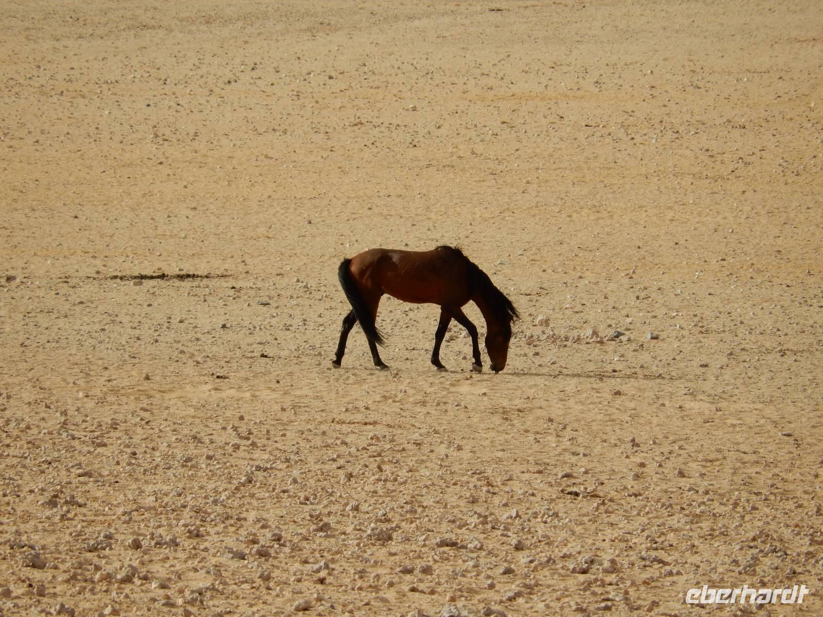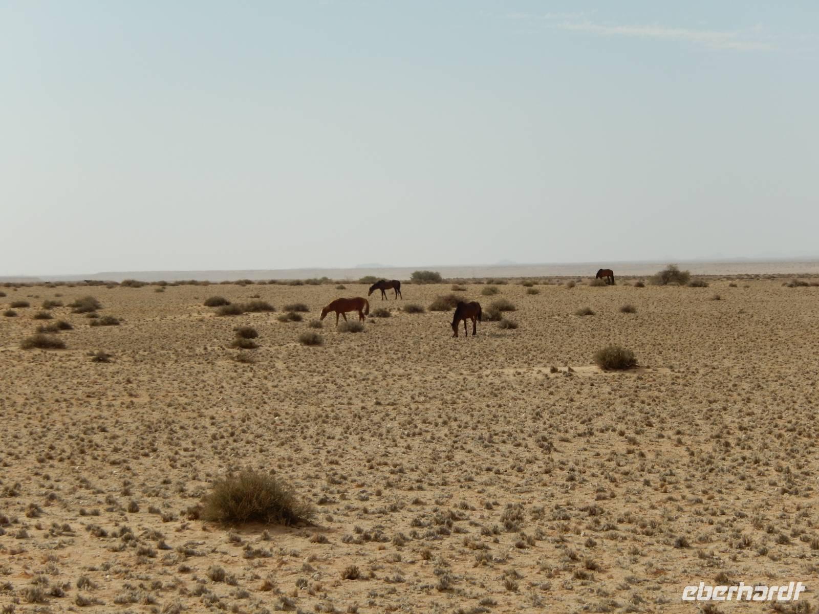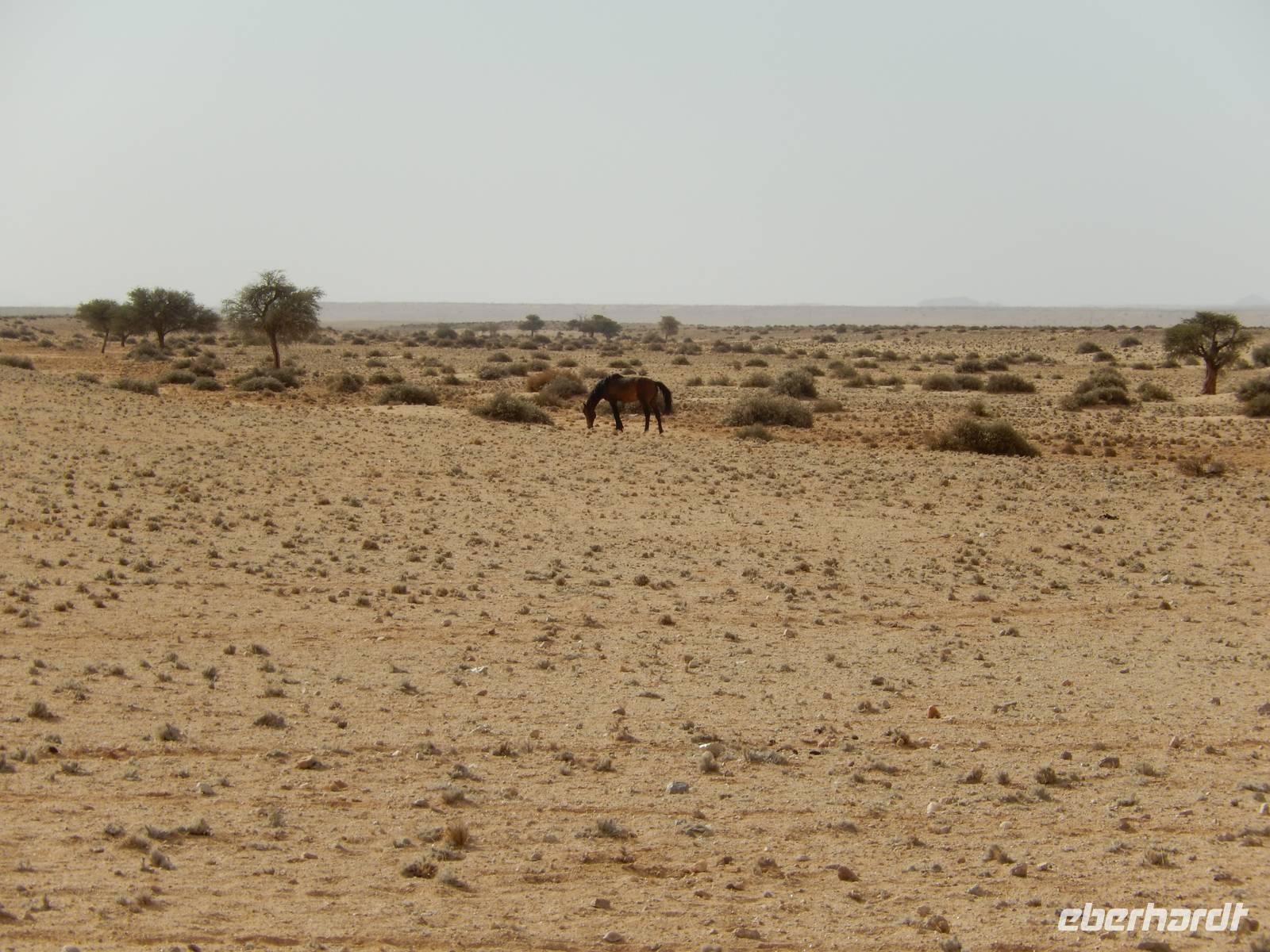 Auf der gut ausgebauten Straße, die sich von Keetmanshoop durch die ausgebrannte, gelblich-braune Landschaft zieht, kommen wir immer weiter in Richtung Küste. Rechts von uns befindet sich der Namib-Naukluft Park und links von uns schon das ehemalige Diamantensperrgebiet. Mitten im Nichts tauchte dann plötzlich ein Hinweisschild auf: "Vorsicht Pferde!" Das war keinesfalls ein Scherz, aber um diese Vierbeiner kümmerten wir uns später.