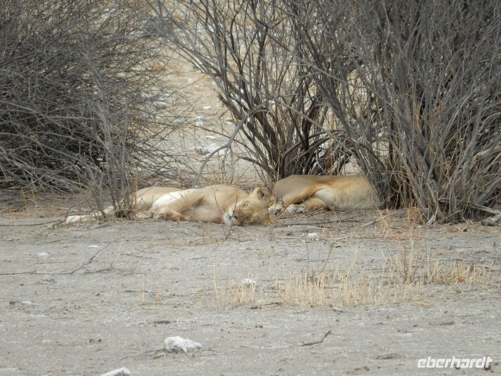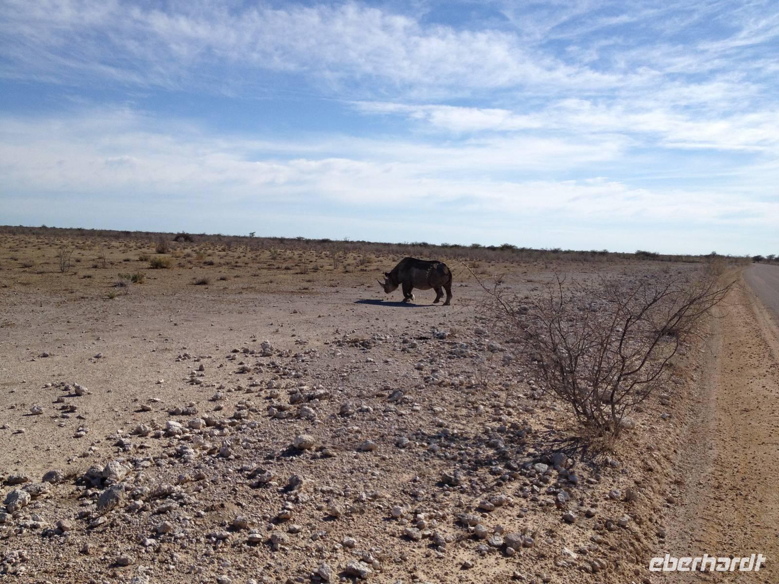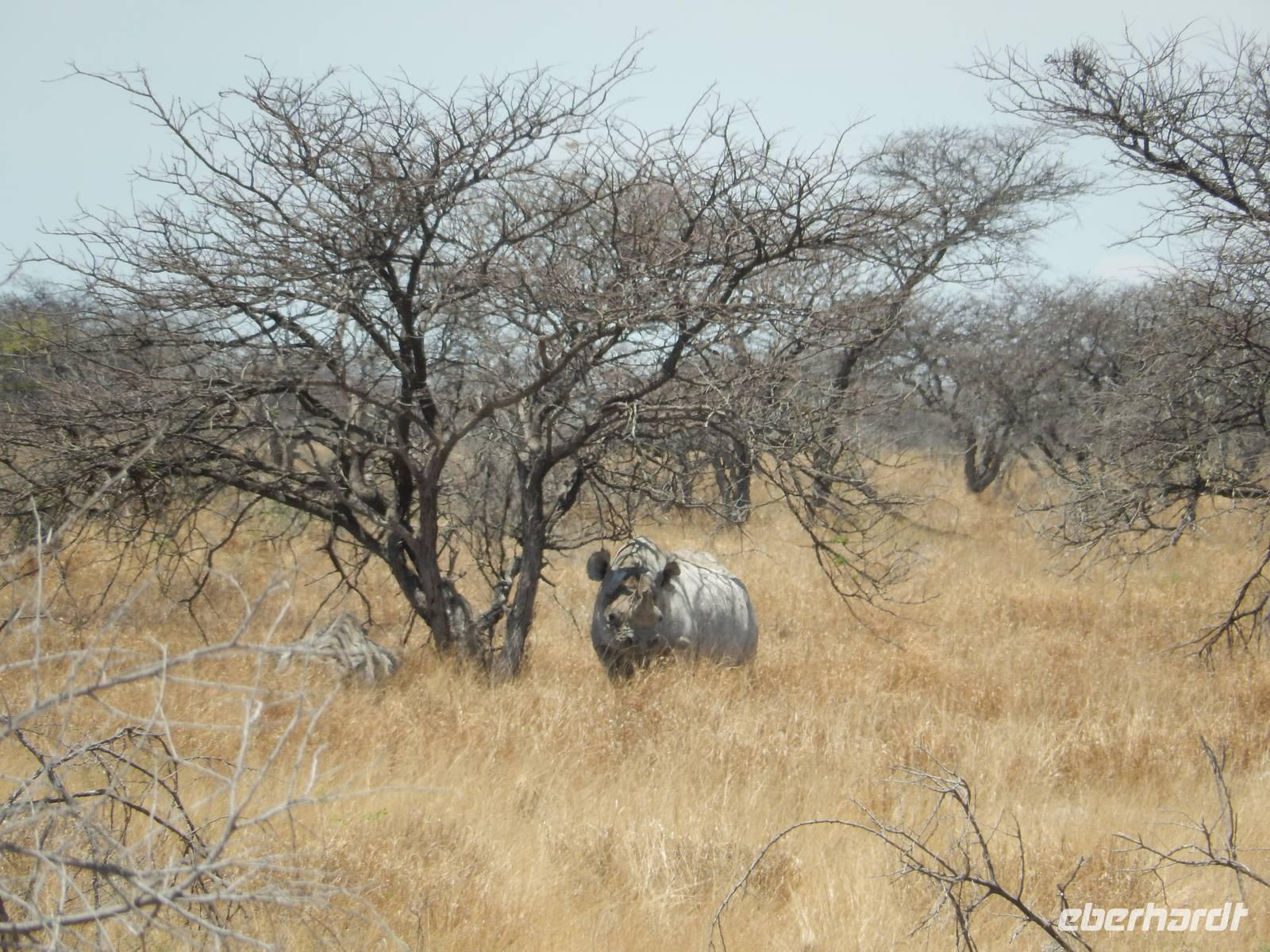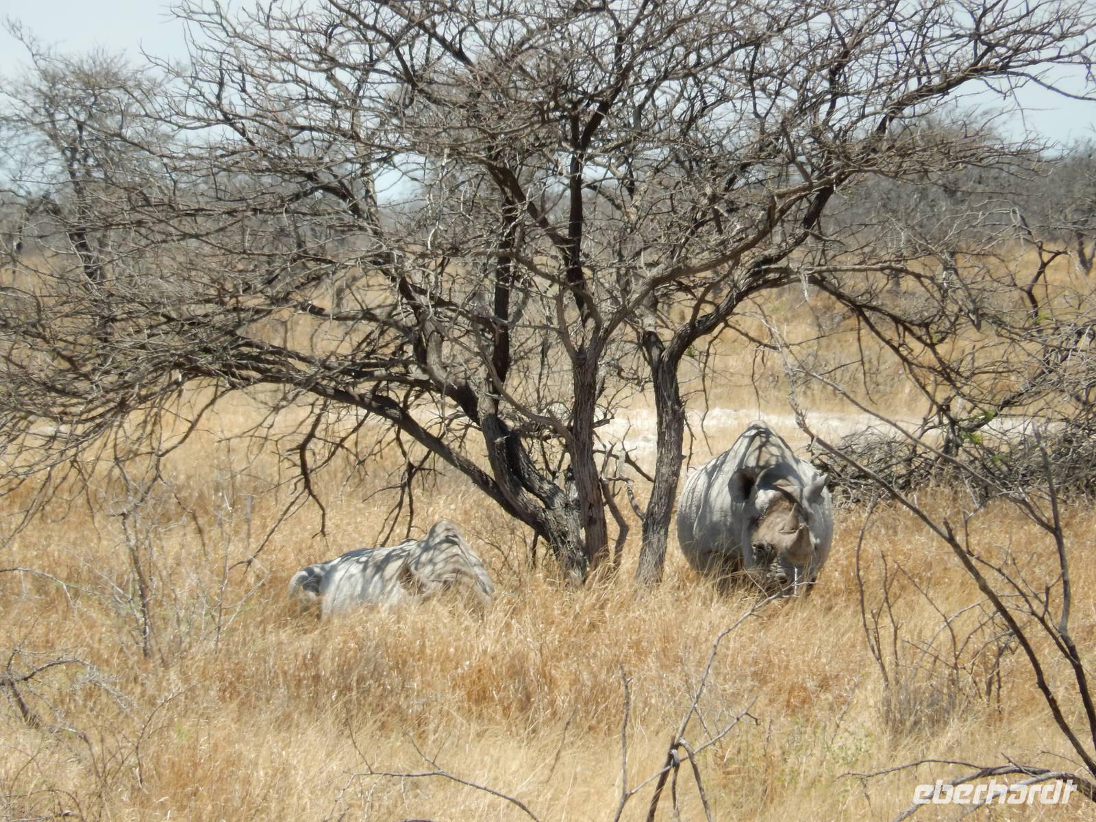 Dann machten wir uns langsam aber sicher auf den Weg in Richtung Lindequist Gate, dem östlichen Ausgang des Parks. Doch erst sahen wir noch zwei Breitmaulnashörner, die sich in den Schatten eines Baumes gelegt hatten.