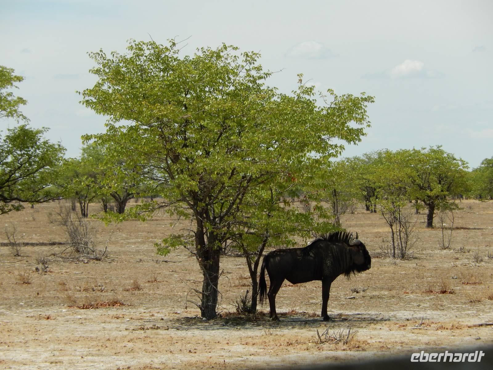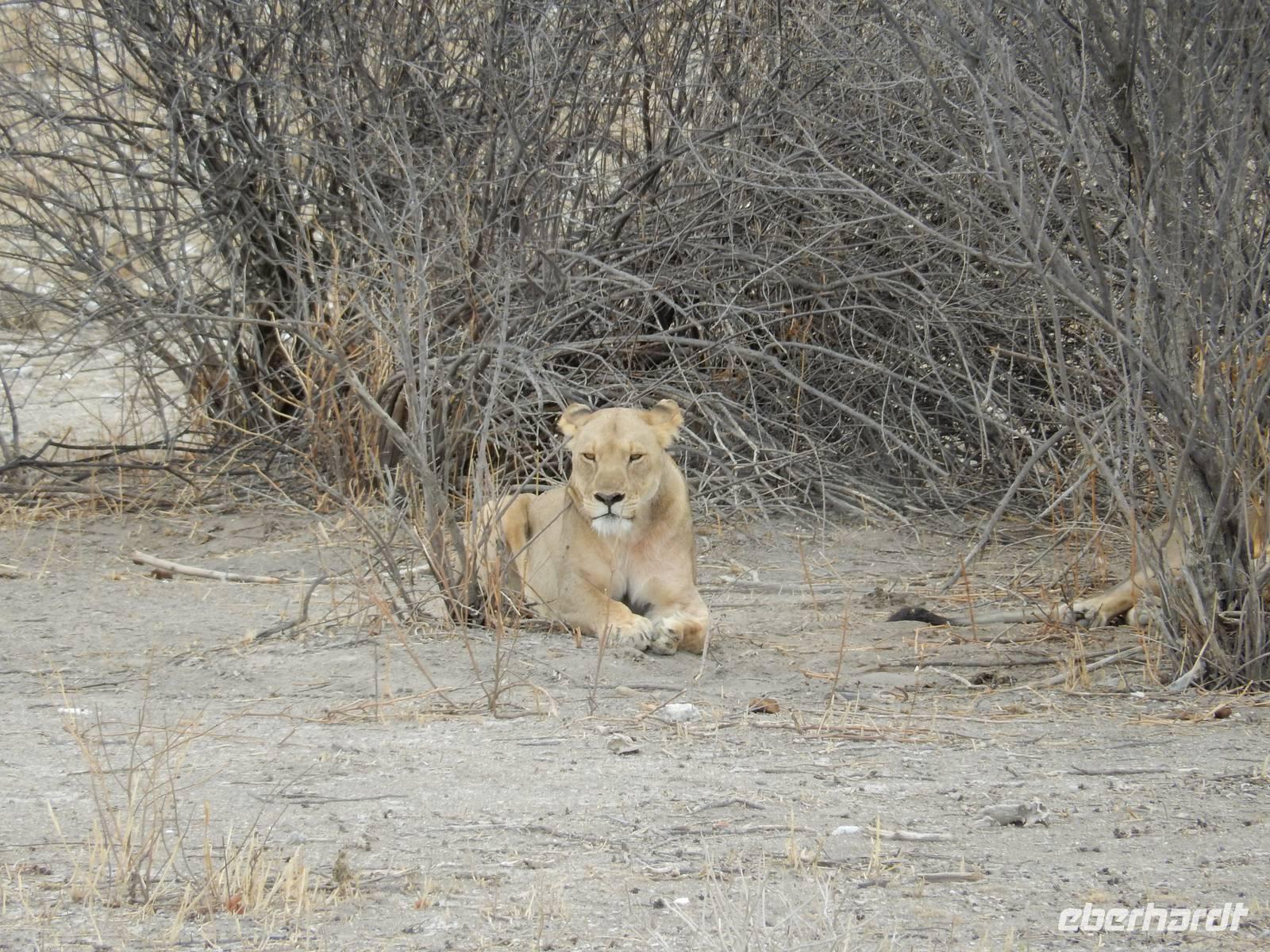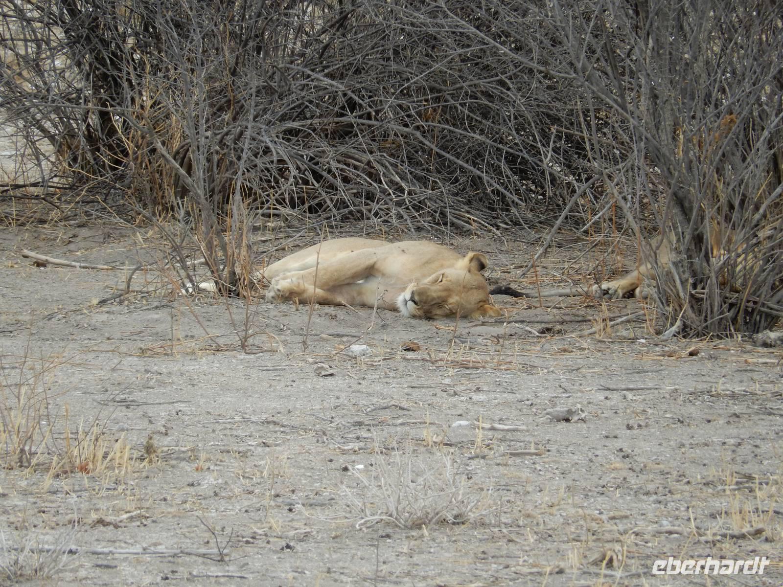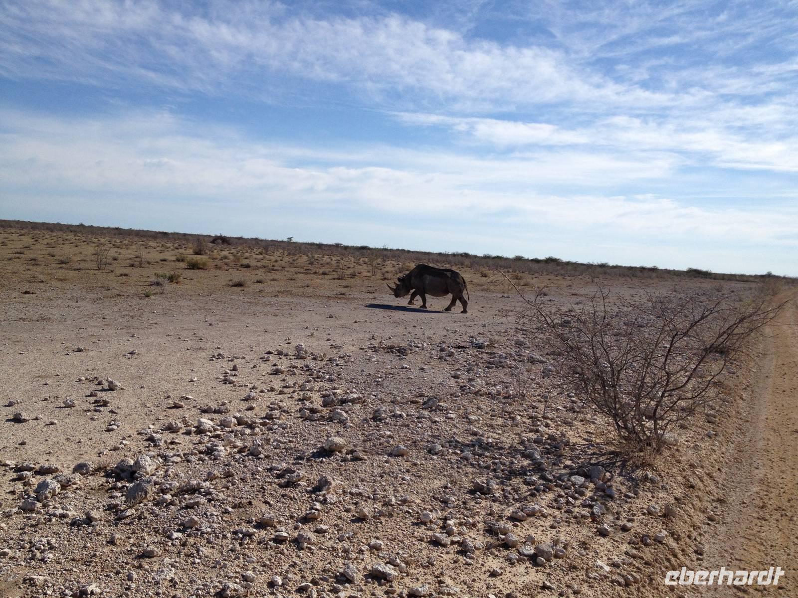 Dann machten wir uns langsam aber sicher auf den Weg in Richtung Lindequist Gate, dem östlichen Ausgang des Parks. Doch erst sahen wir noch zwei Breitmaulnashörner, die sich in den Schatten eines Baumes gelegt hatten.