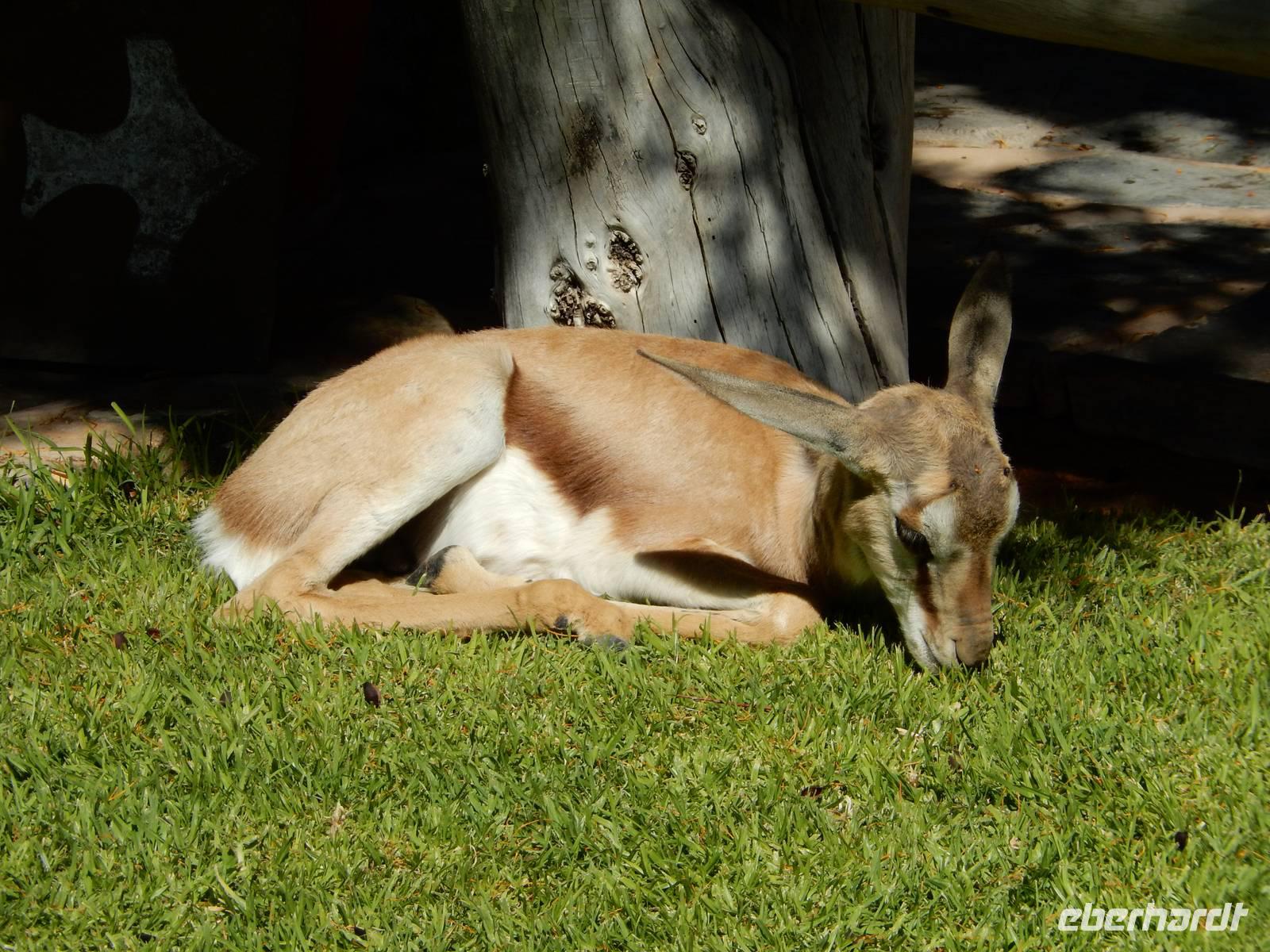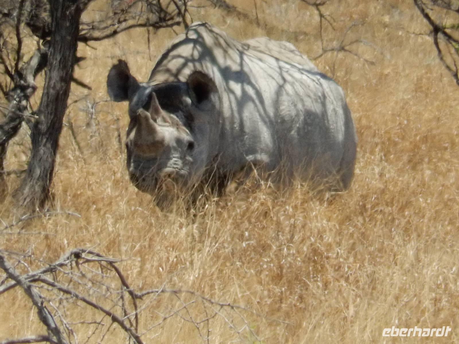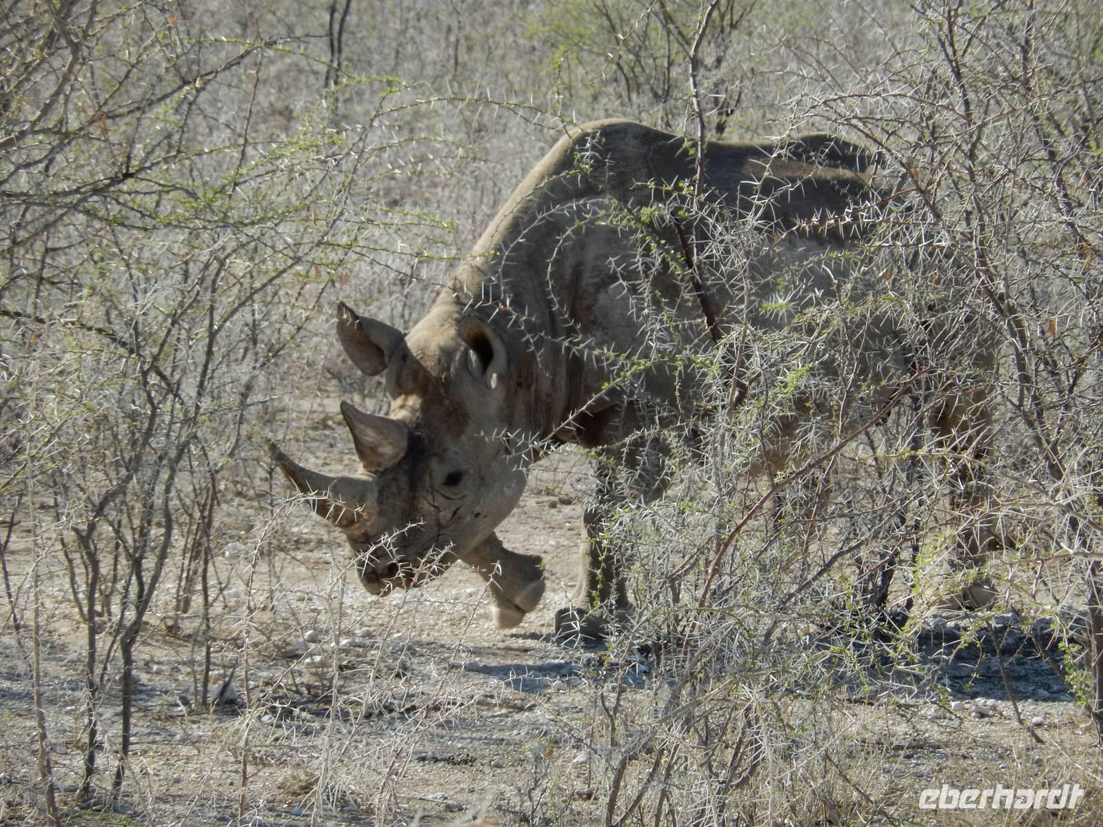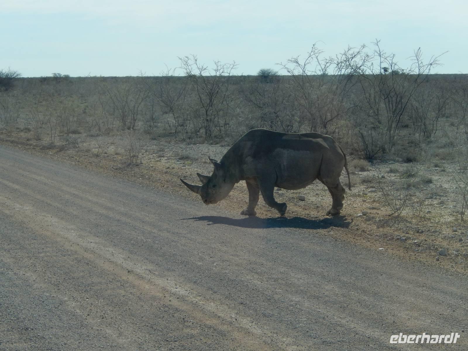 Dann machten wir uns langsam aber sicher auf den Weg in Richtung Lindequist Gate, dem östlichen Ausgang des Parks. Doch erst sahen wir noch zwei Breitmaulnashörner, die sich in den Schatten eines Baumes gelegt hatten.