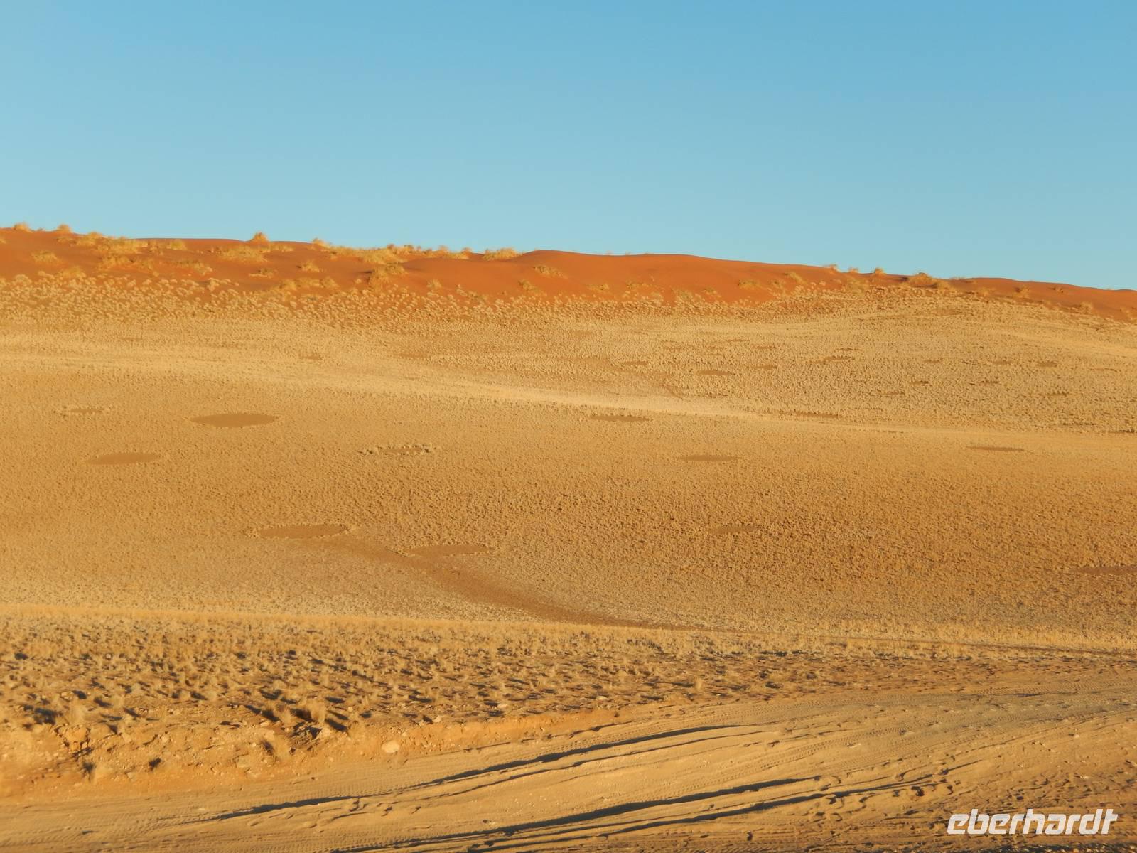 Wir hielten an den Feenkreisen - rätselhaft und mystisch wirken sie, denn die kreisrunden Stellen sind komplett vegetationslos und die Wissenschaft streitet sich noch heute um den Grund dafür. Die wahrscheinlichste Variante ist die, dass die unterirdischen Termitengänge und -nester den Boden unfruchtbar machen. Doch warten wir ab, was die Wissenschaftler noch so erkunden.