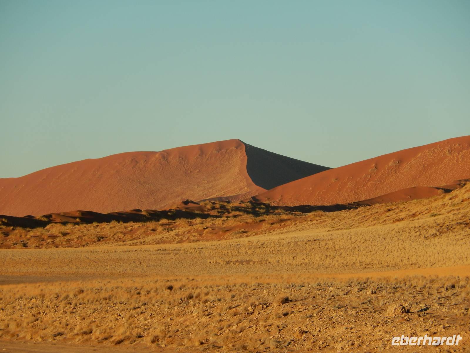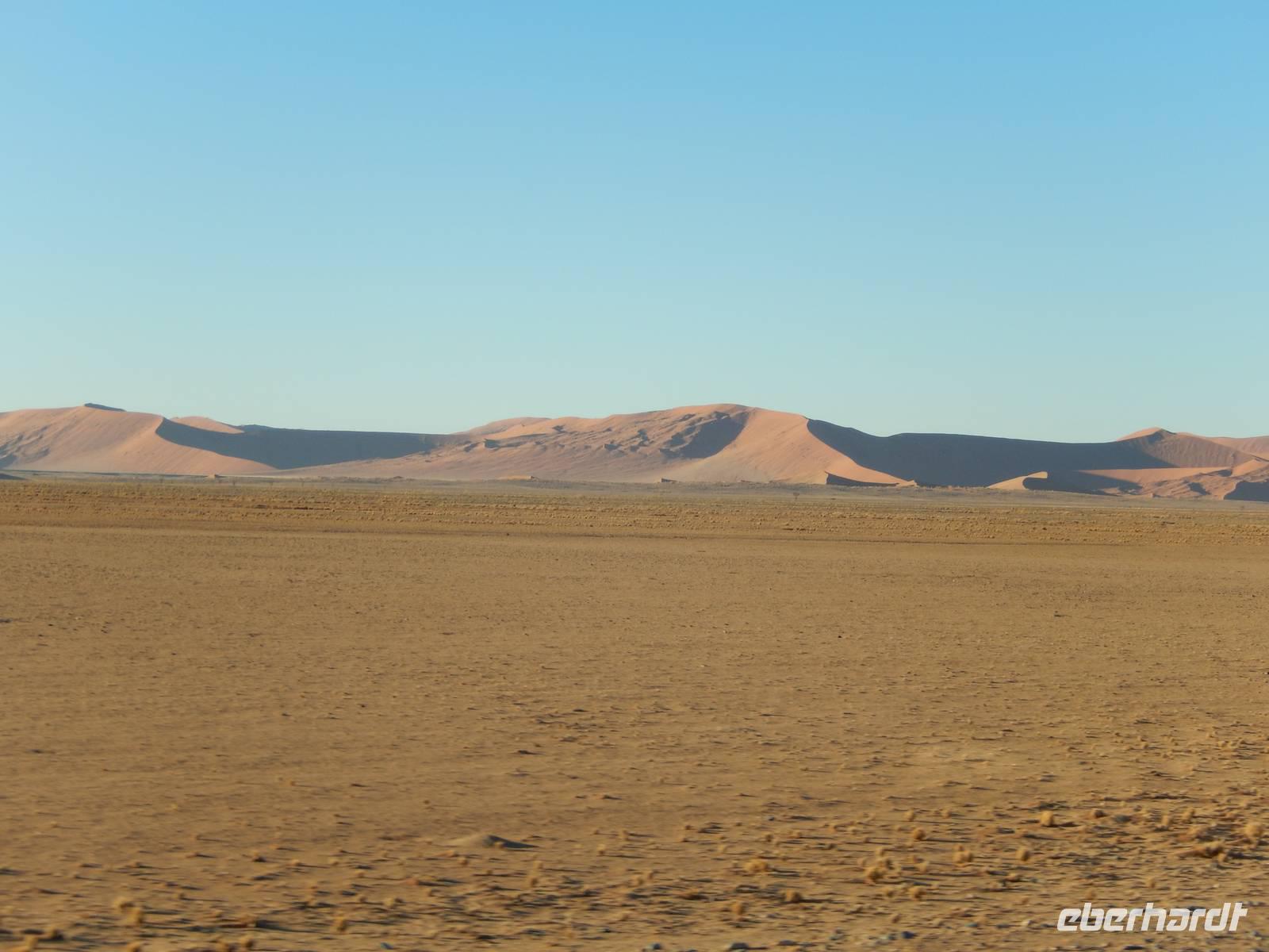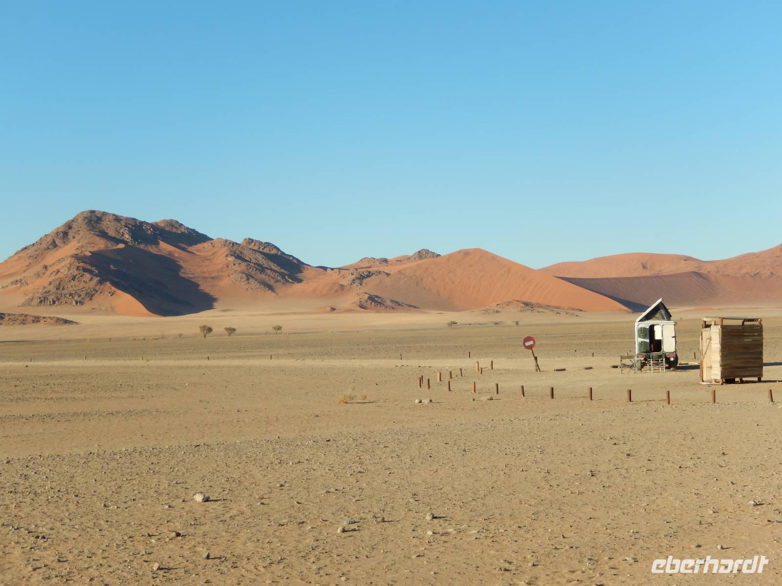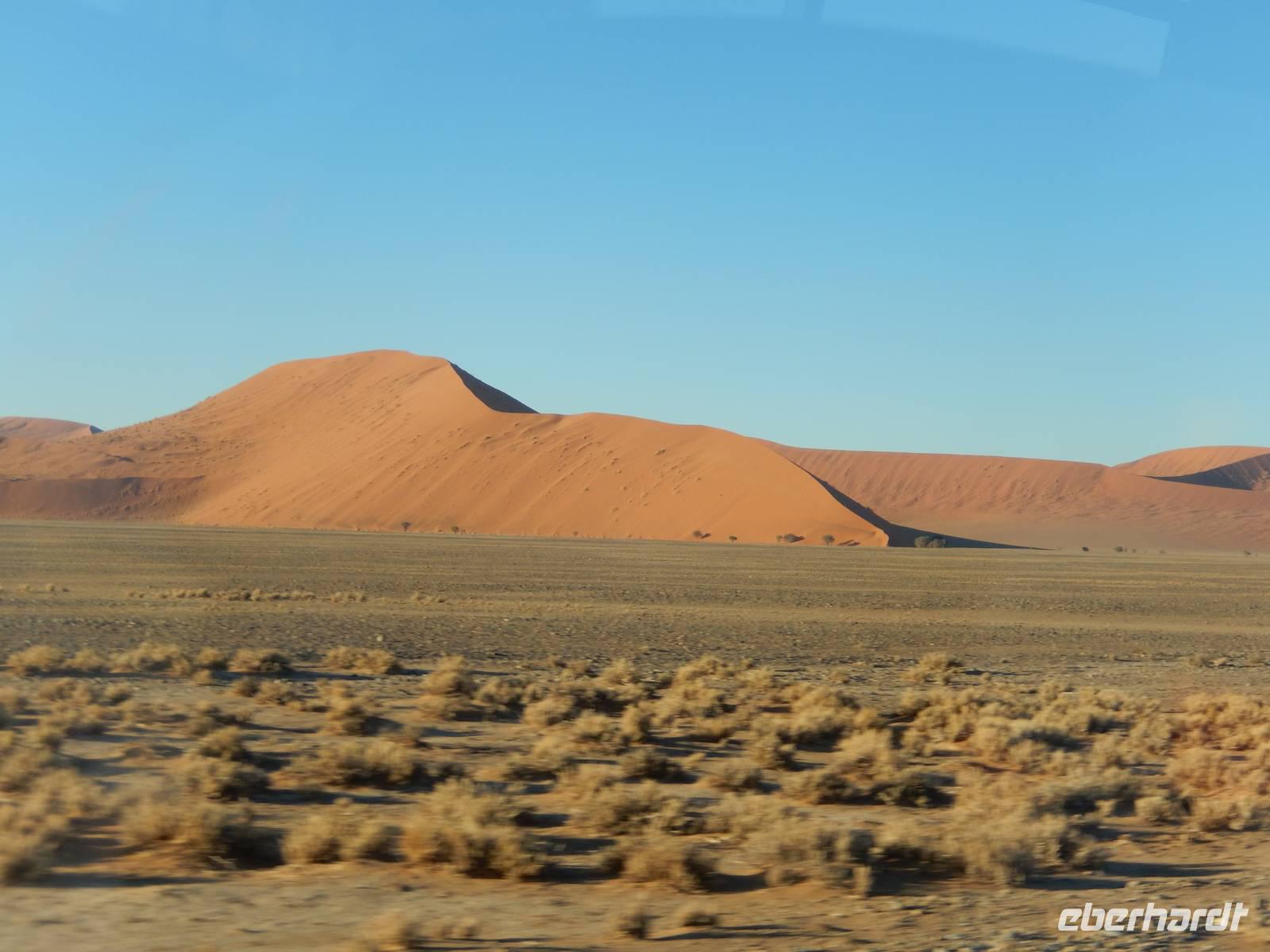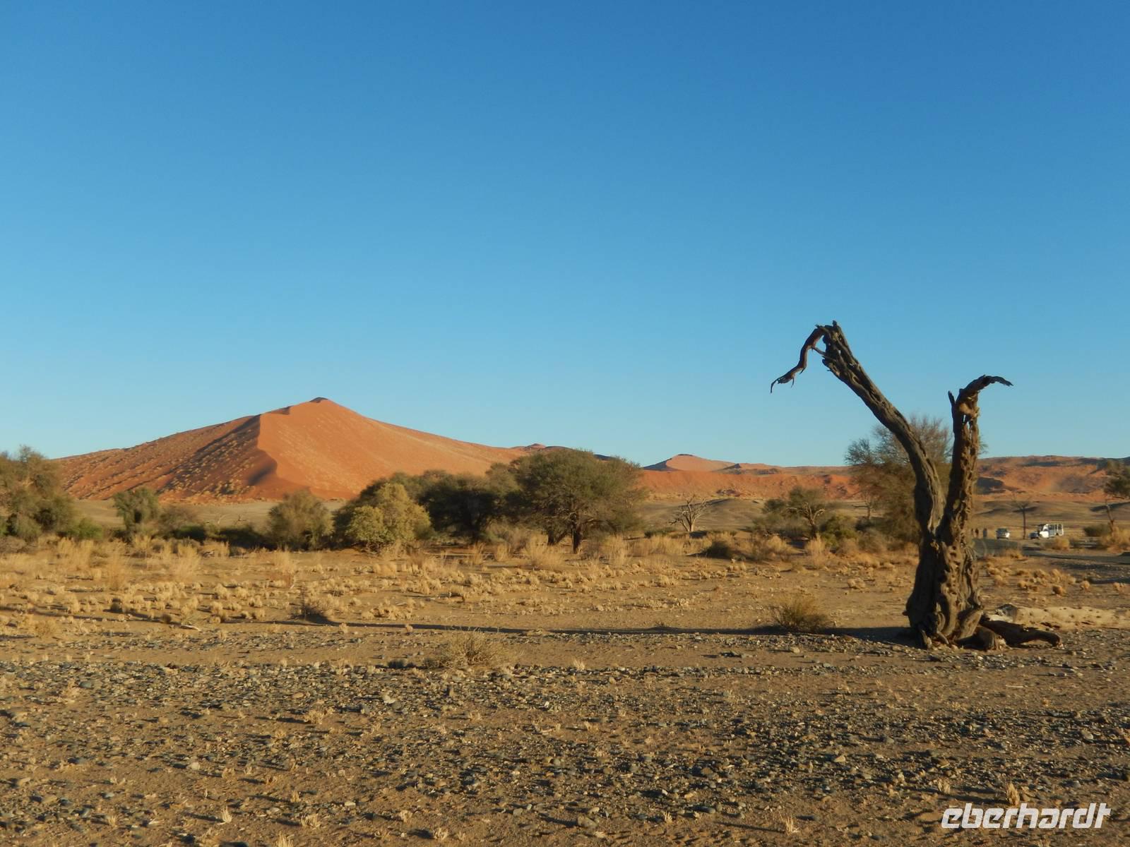 Als der Wecker um 04:15 Uhr klingelte, wollten wir ihn am liebsten wegwerfen. Doch es nützte nichts. Wir hatten heute Großes vor! Mit unseren Frühstückspaketen bewaffnet fuhren wir noch in der Dunkelheit in Richtung Sossusvlei, eine von Namibsand-Dünen umschlossene Salz-Ton-Pfanne ("Vlei") in der Namib-Wüste, die nur in sehr seltenen guten Regenjahren Wasser führt. Pünktlich zum Sonnenaufgang waren wir am Einganstor zum Sossusvlei - einer weiteren unglaublichen Naturschönheit Namibias!