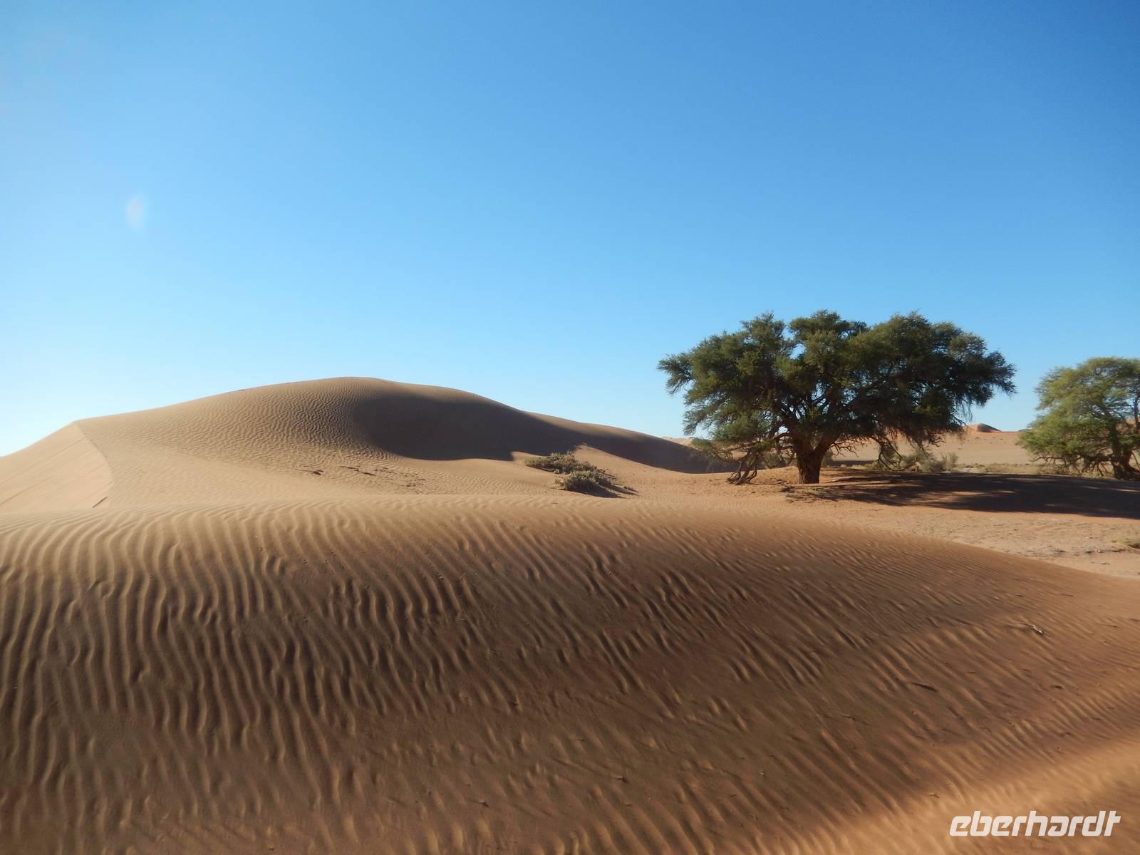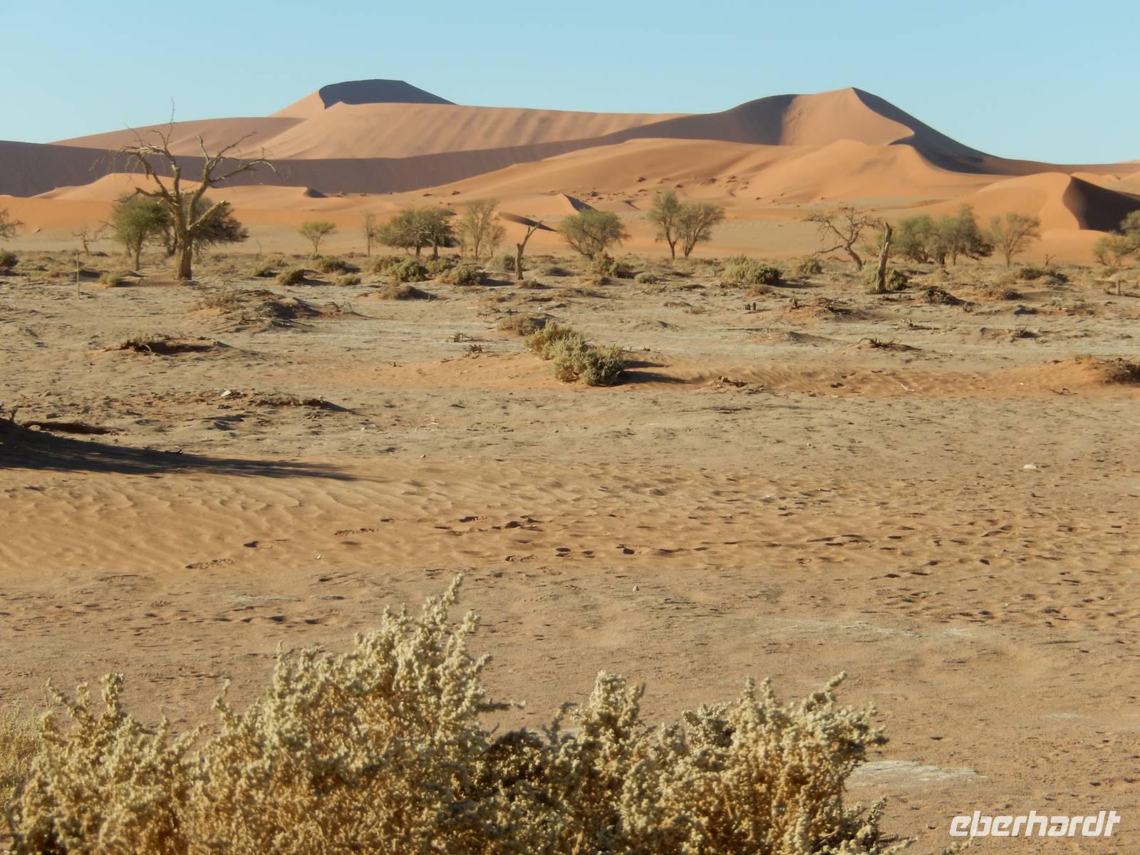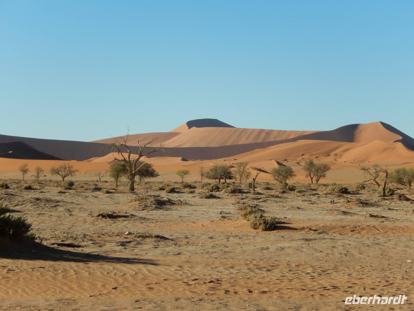 Schon bei der Fahrt hinein in das Namib-Sandmeer, was übrigens seit 2013 auf der Liste der UNESCO steht, standen wir den hohen, roten Sanddünen gegenüber. Und gerade in den frühen Morgenstunden, wenn sich die bis zu 380 Meter hohen Dünen im Spiel von Licht und Schatten befinden, ist dieser Anblick ein wahrer Genuss! Es entstanden Postkartenmotive von den Dünen, die vor etwa 5 Millionen Jahren entstanden. In dieser Zeit ist rund um das Sossusvlei auch eine einzigartige Landschaft aus Lehmböden und Bäumen entstanden, die sich der Wüste perfekt angepasst haben. Wir sahen die Spuren der Nacht im warmen Sand.