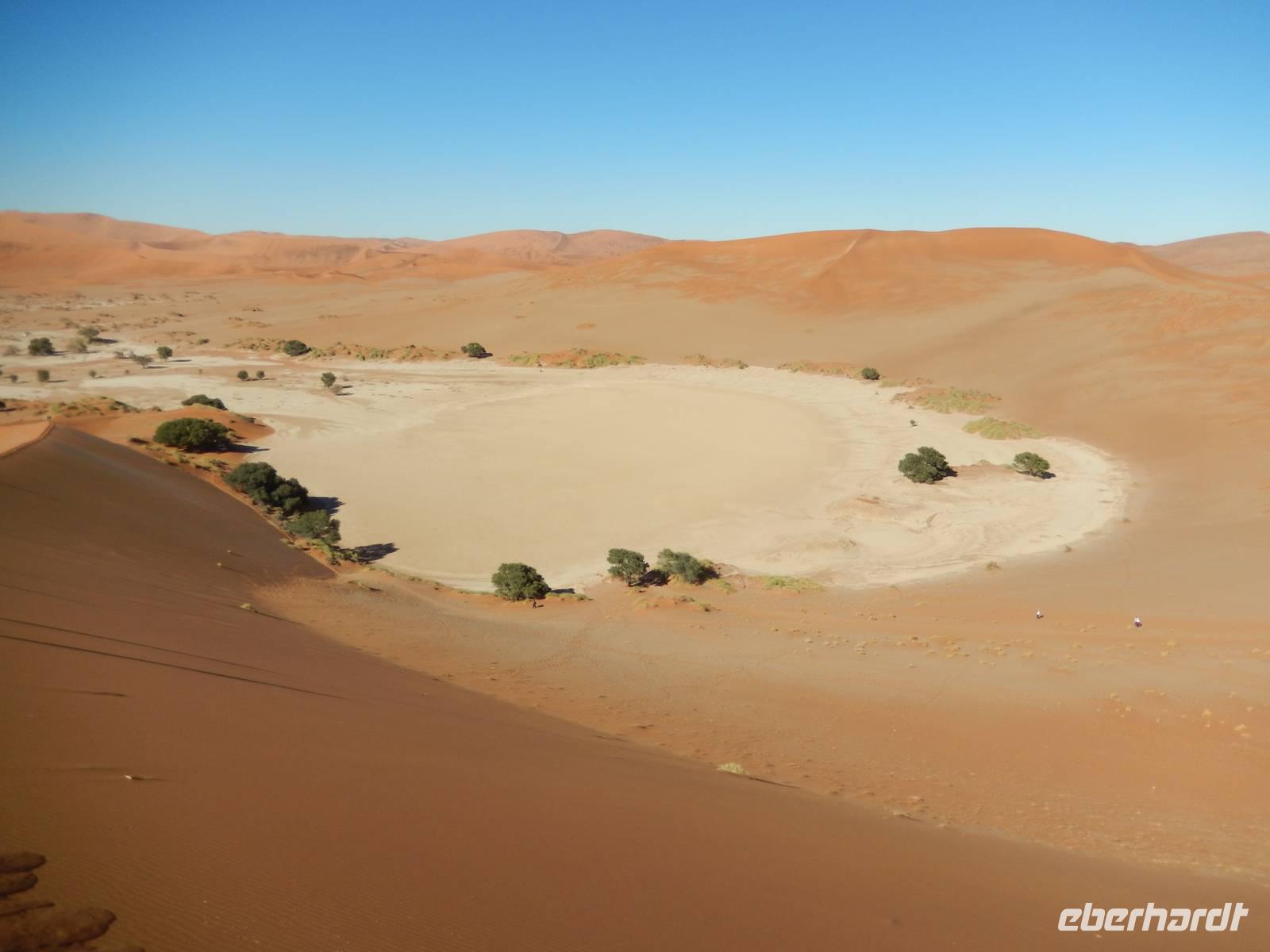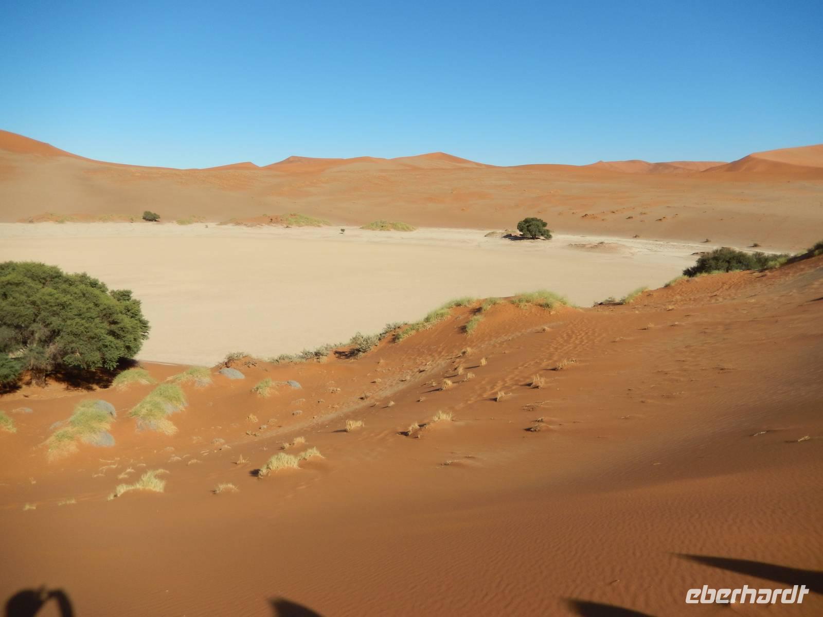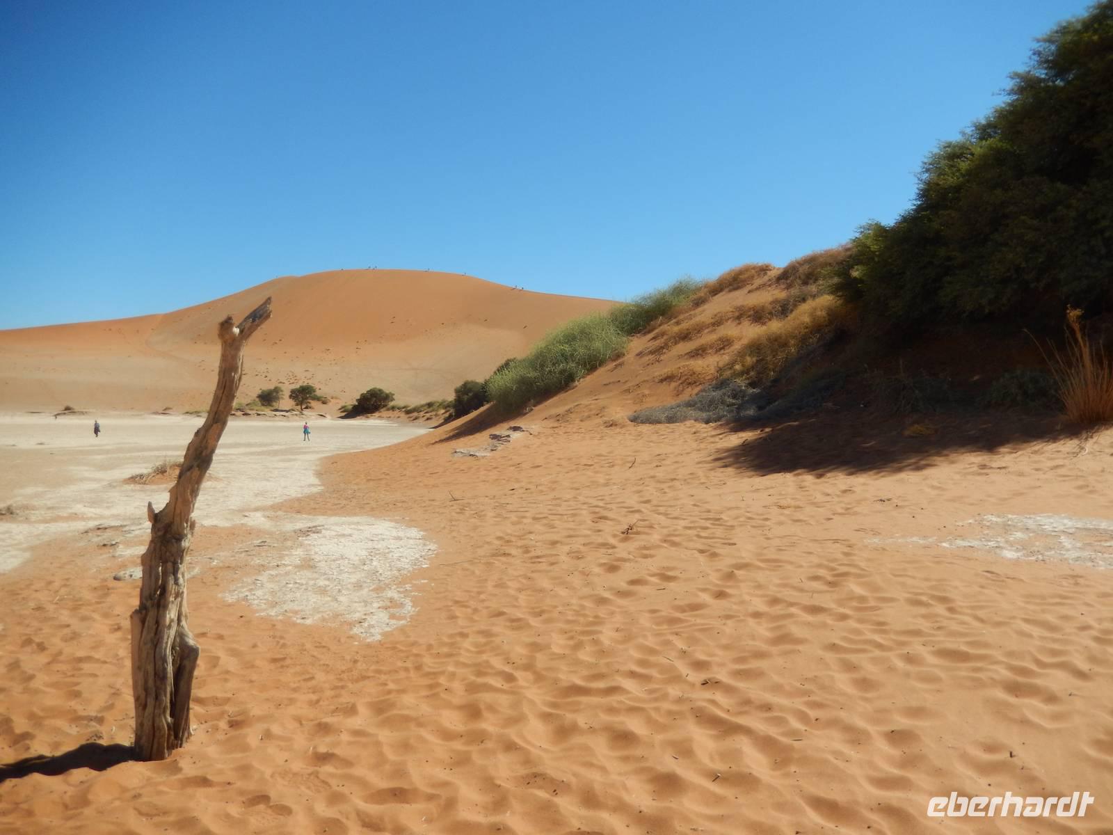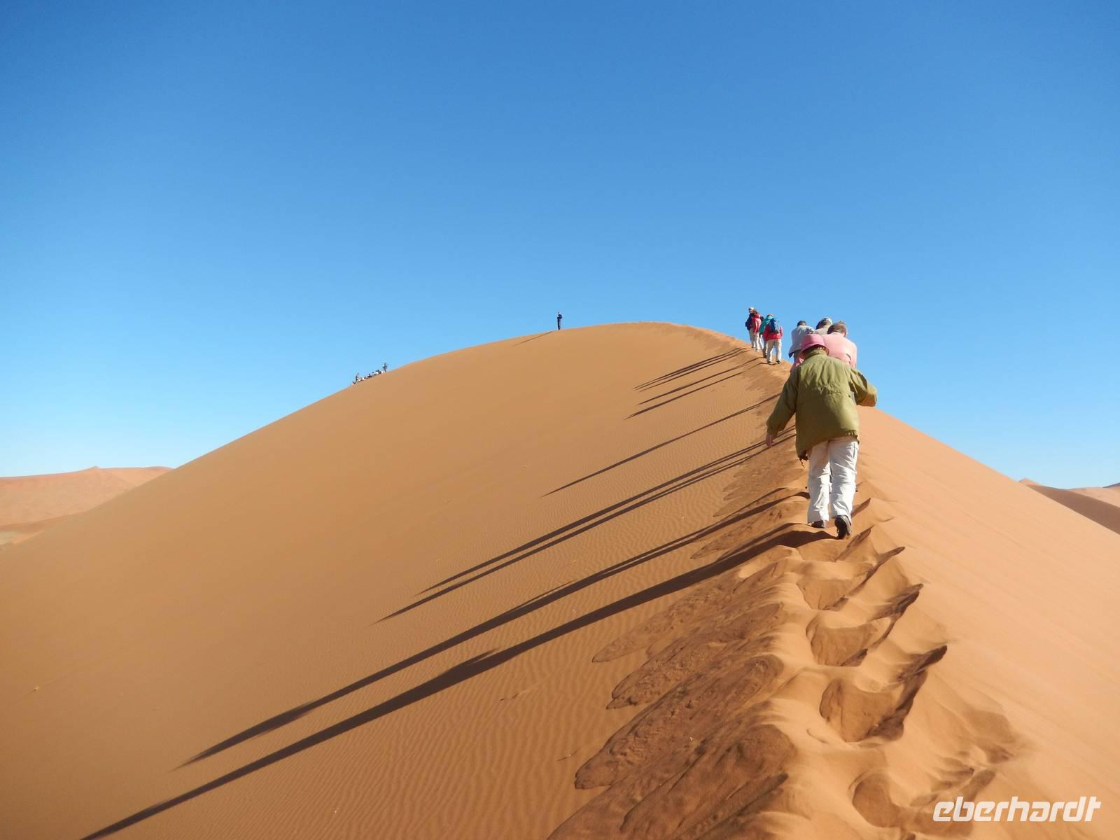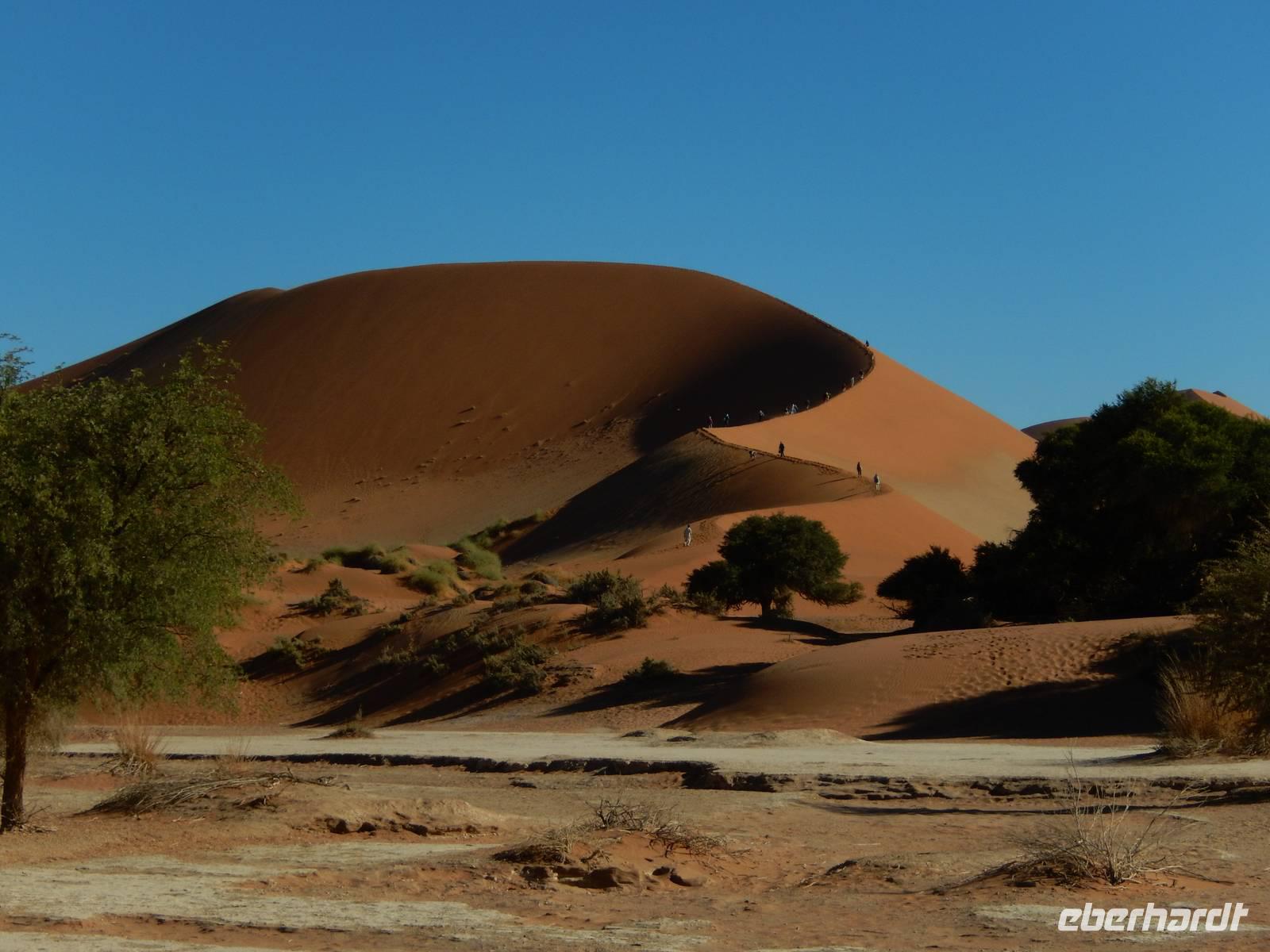 Die "Big Mama" ist eine der wenigen Dünen, die man besteigen darf. Also nichts wie hoch! Langsam, doch im gleichmäßigen Schritt stapften wir am Grat der Düne hinauf. Oben angekommen, wurden wir Dünenbesteiger mit einem wundervollen Blick auf die umliegenden Dünen und auf die Pfanne an sich belohnt! Ein Erlebnis, das wir so schnell sicher nicht vergessen werden!