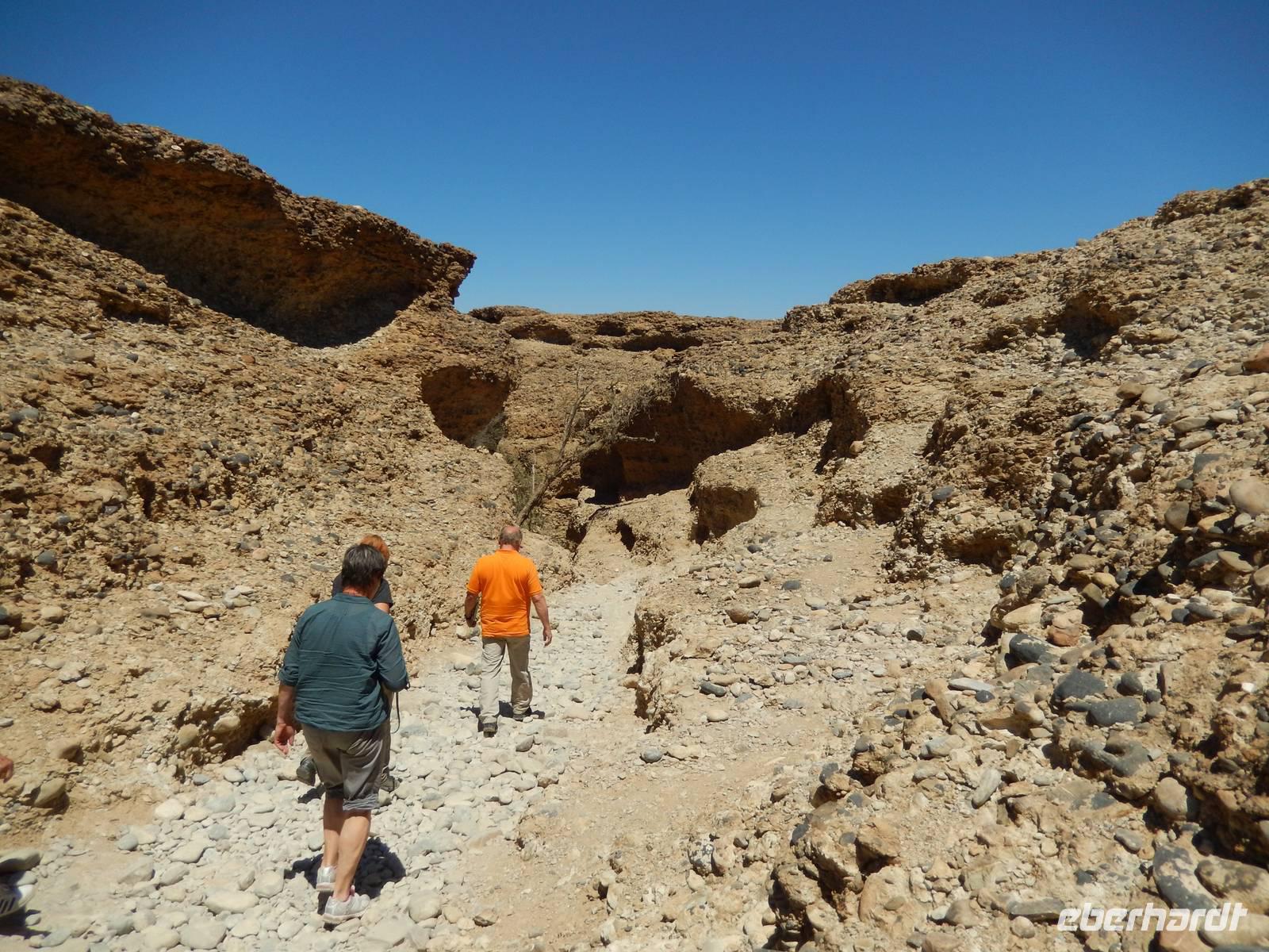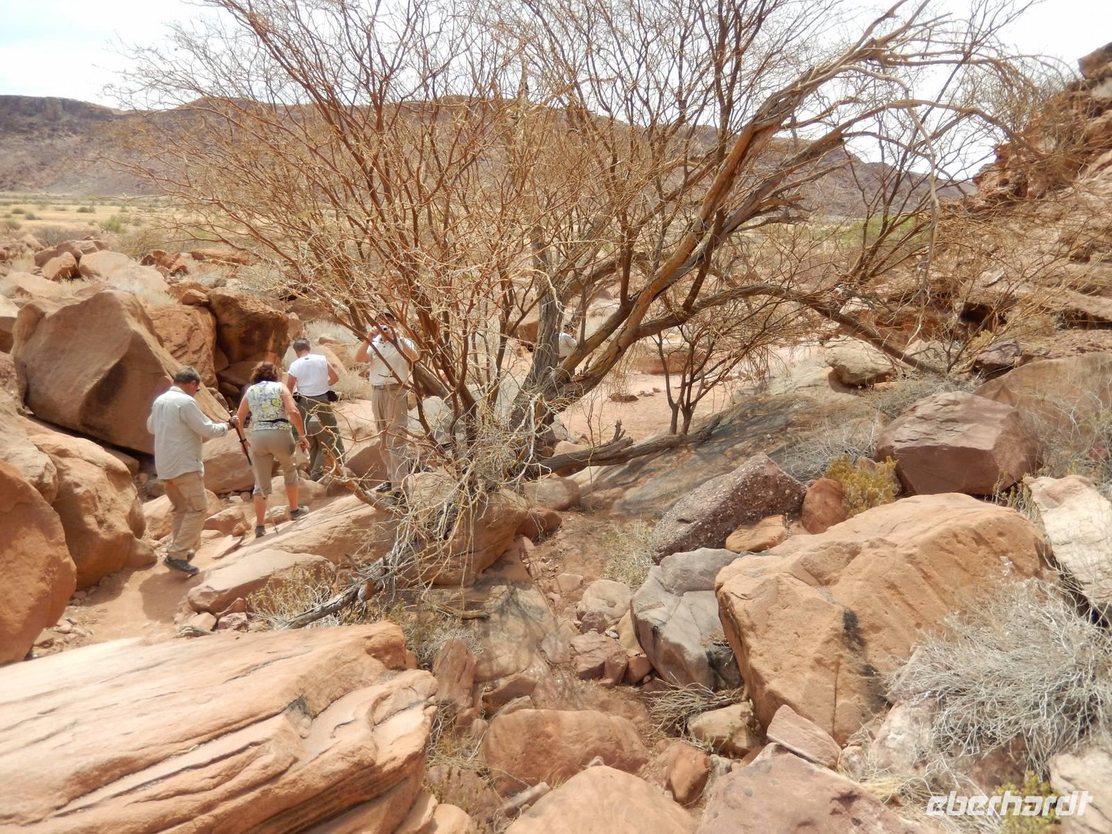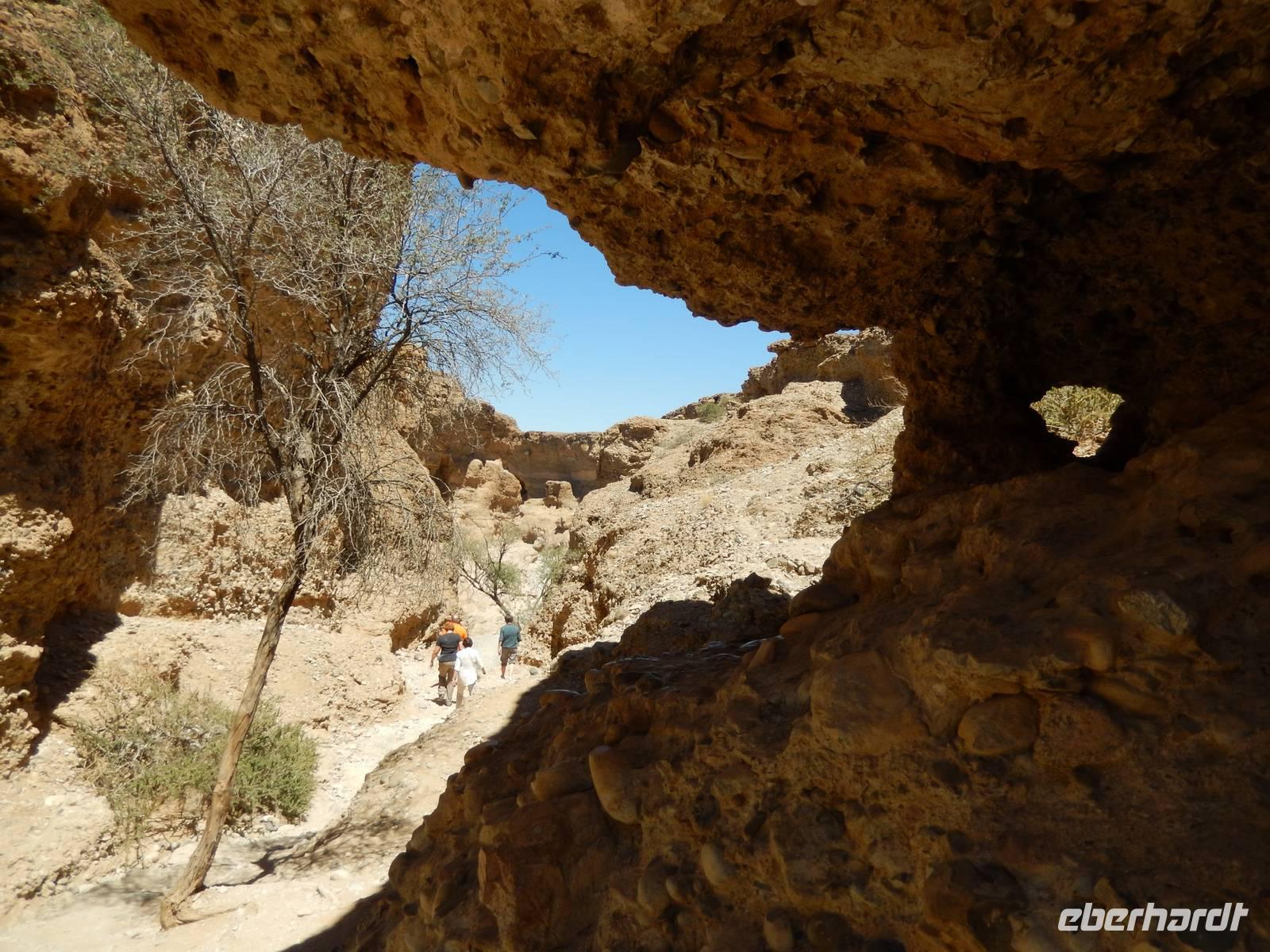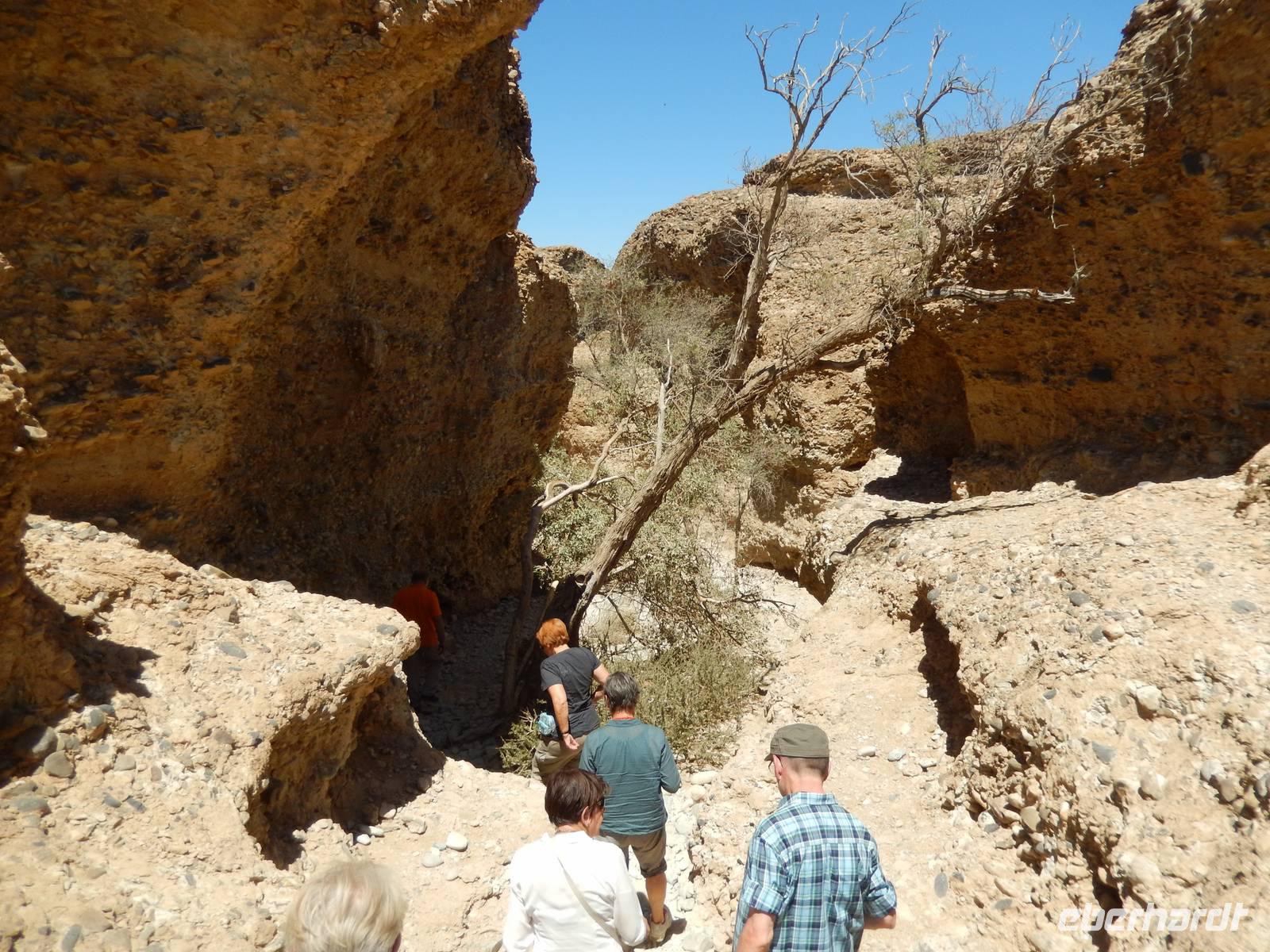 Nach einem Stopp gegenüber einer Grotte, die den beiden Geologen Henno Martin und Hermann Korn zeitweise als Zufluchtsort diente, kamen wir hinunter in das Flussbett des Kuiseb, welcher vollkommen ausgetrocknet war. Hier, im ganzen Gebiet des Canyons lebten die beiden zuvor erwähnten deutschen Geologen gut zweieinhalb Jahre unter primitivsten Bedingungen, um der Internierung und dem Zweiten Weltkrieg zu entgehen. Im Buch "Wenn es Krieg gibt, gehen wir in die Wüste" sind ihre Erlebnisse sehr eindrucksvoll geschildert.