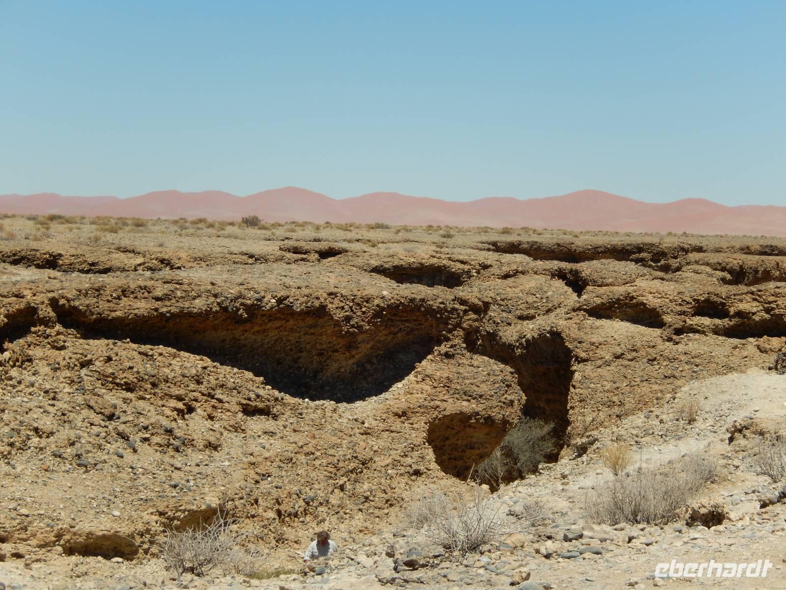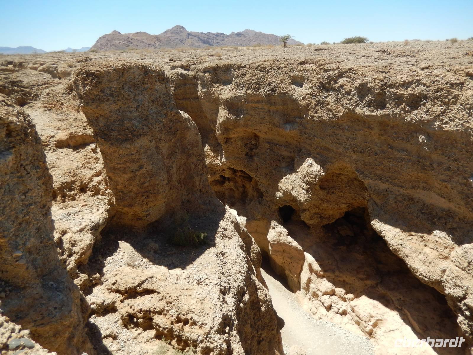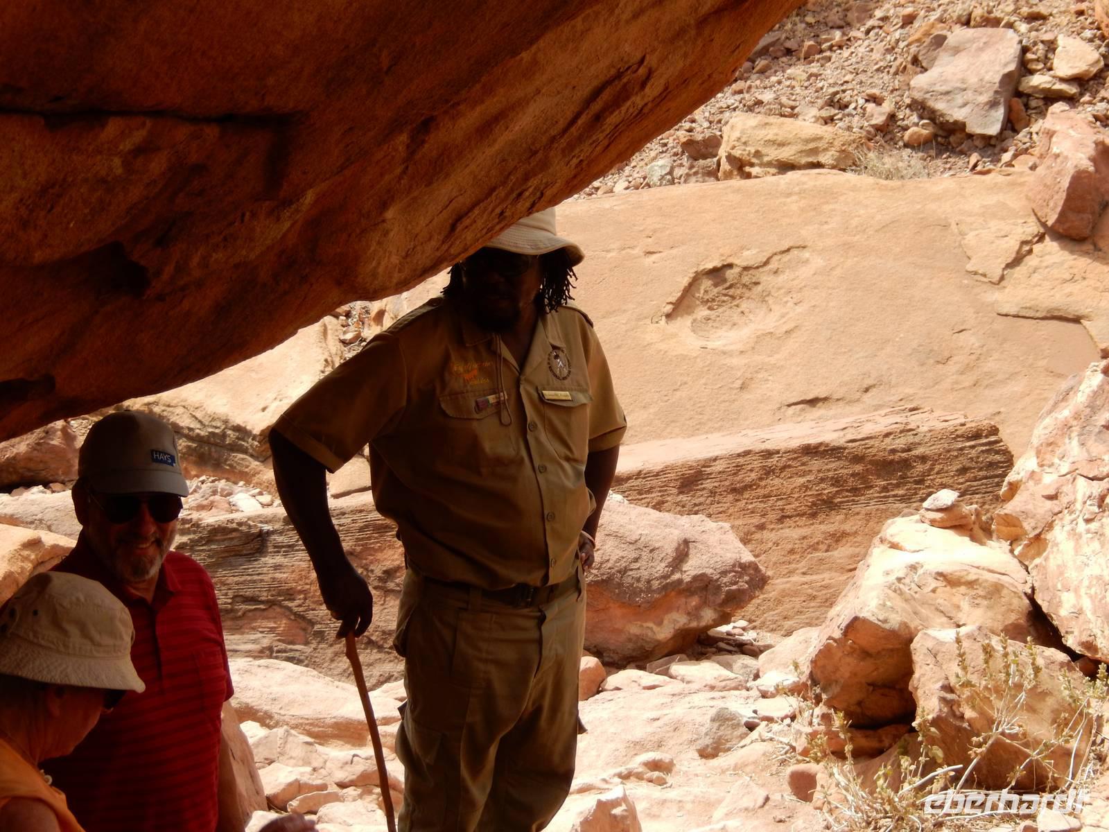 Nach einem Stopp gegenüber einer Grotte, die den beiden Geologen Henno Martin und Hermann Korn zeitweise als Zufluchtsort diente, kamen wir hinunter in das Flussbett des Kuiseb, welcher vollkommen ausgetrocknet war. Hier, im ganzen Gebiet des Canyons lebten die beiden zuvor erwähnten deutschen Geologen gut zweieinhalb Jahre unter primitivsten Bedingungen, um der Internierung und dem Zweiten Weltkrieg zu entgehen. Im Buch "Wenn es Krieg gibt, gehen wir in die Wüste" sind ihre Erlebnisse sehr eindrucksvoll geschildert.