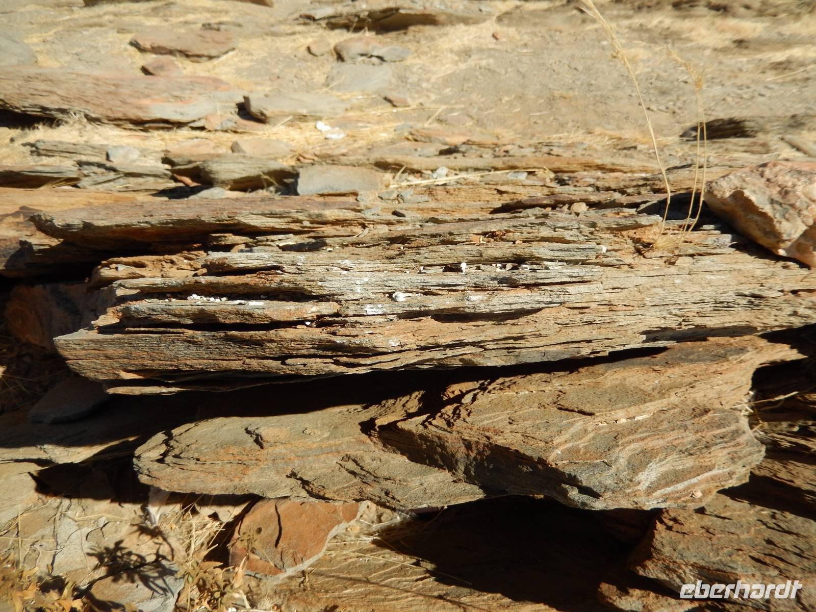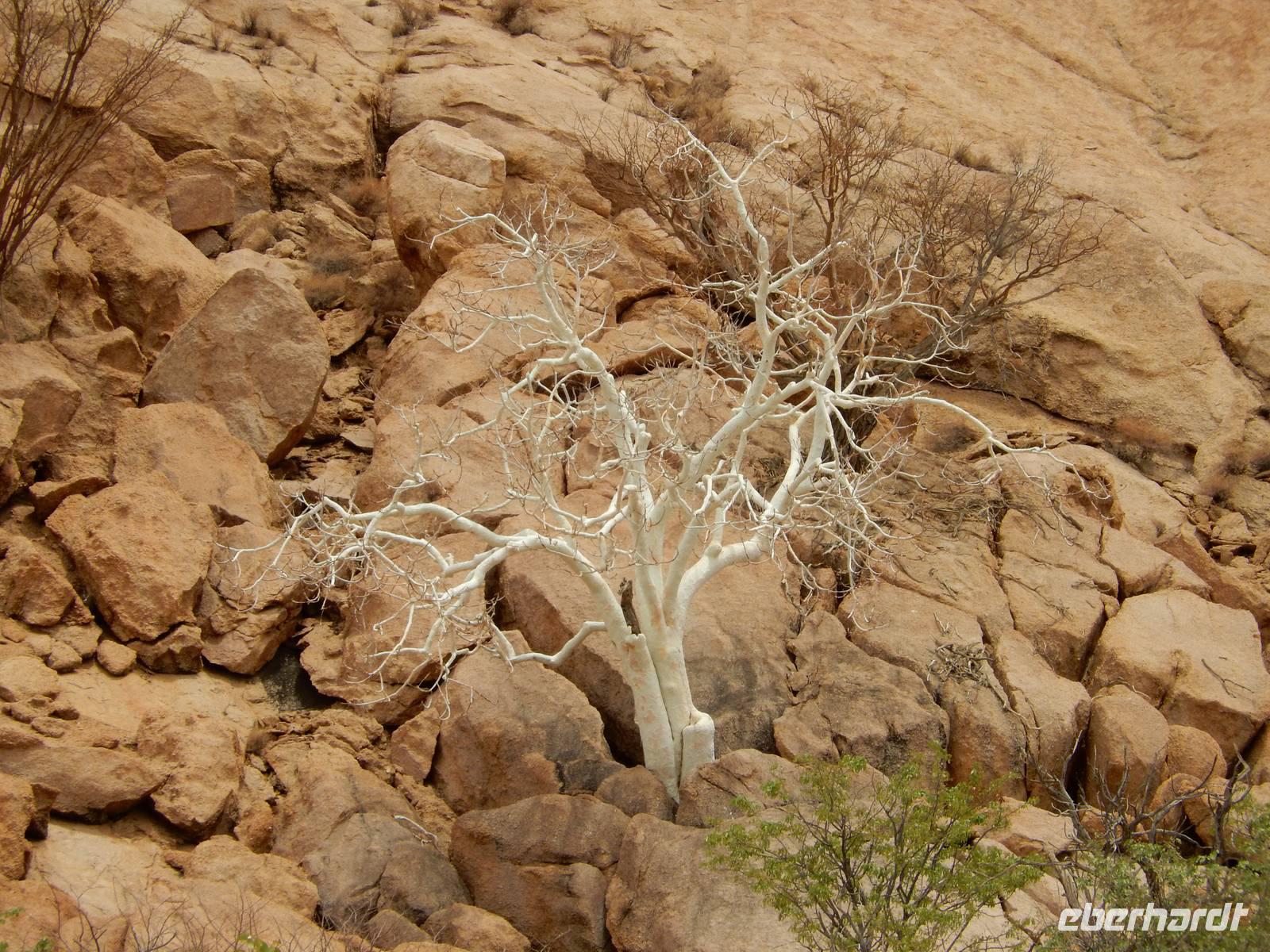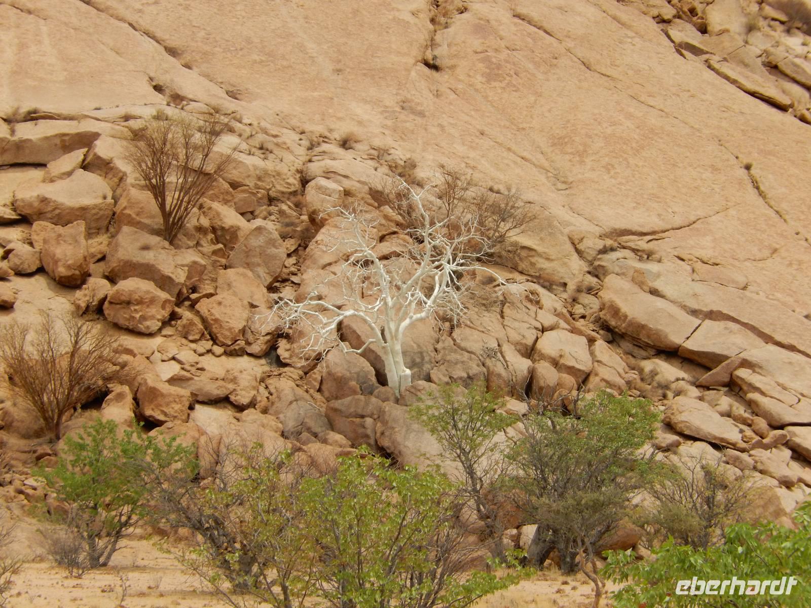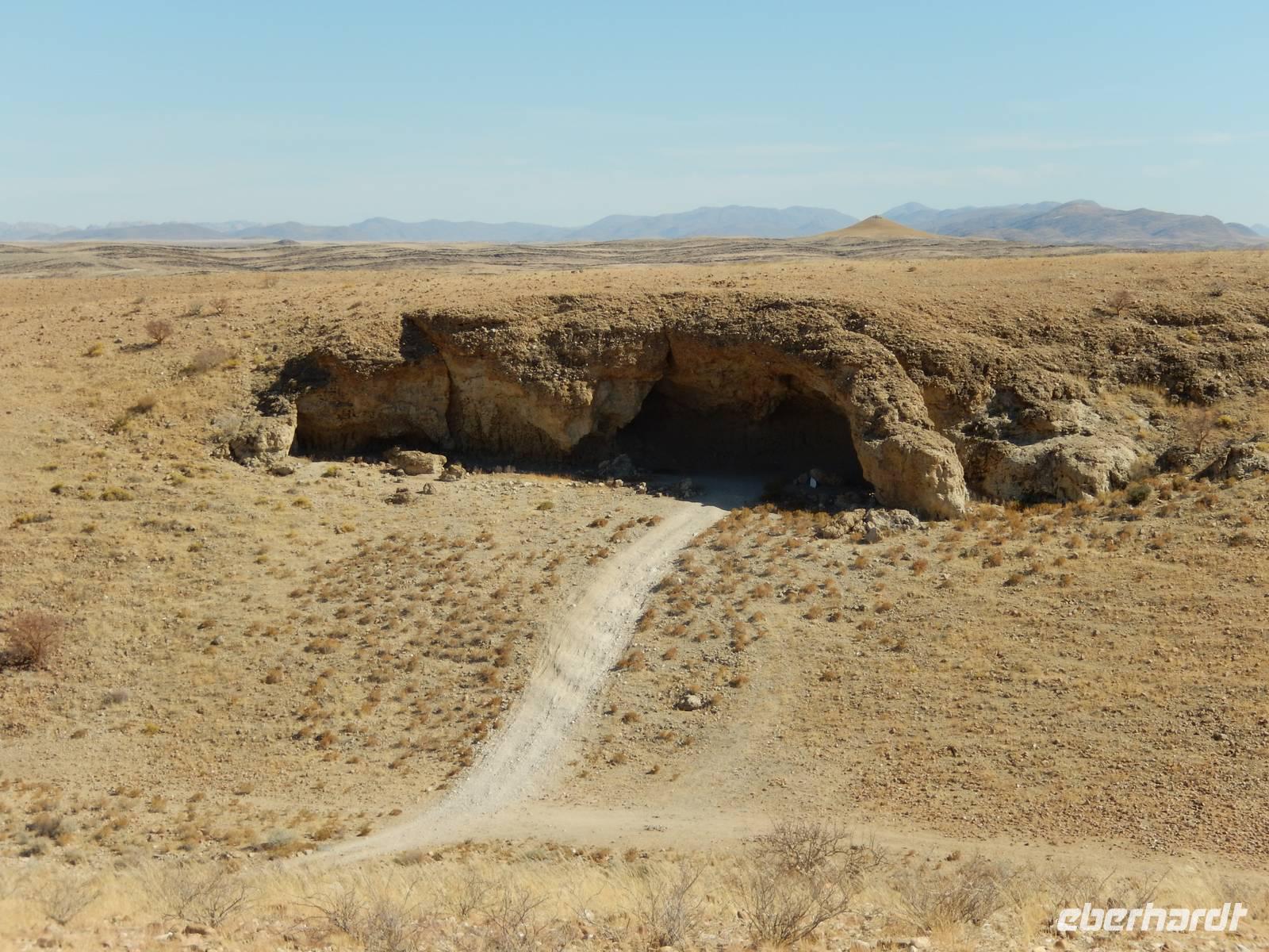 Nach einem Stopp gegenüber einer Grotte, die den beiden Geologen Henno Martin und Hermann Korn zeitweise als Zufluchtsort diente, kamen wir hinunter in das Flussbett des Kuiseb, welcher vollkommen ausgetrocknet war. Hier, im ganzen Gebiet des Canyons lebten die beiden zuvor erwähnten deutschen Geologen gut zweieinhalb Jahre unter primitivsten Bedingungen, um der Internierung und dem Zweiten Weltkrieg zu entgehen. Im Buch "Wenn es Krieg gibt, gehen wir in die Wüste" sind ihre Erlebnisse sehr eindrucksvoll geschildert.