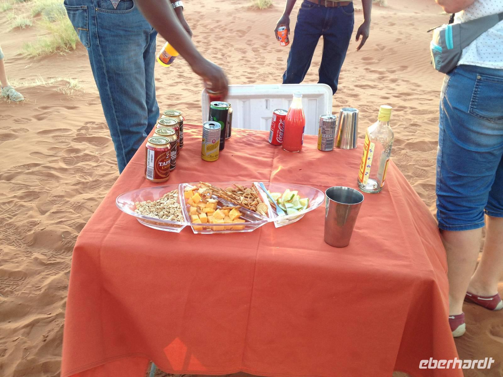 Am zeitigen Nachmittag kehrten wir in unsere Lodge zurück und genossen die Zeit am Pool oder auf der Terrasse unserer netten Hütten. Vor dem Abendessen begaben wir uns dann noch zu einer Sundowner-Fahrt mit dem Jeep auf dem Gelände der Lodge. Inmitten der einmaligen Landschaft aus versteinerten Dünen, dem hohen Bergmassiv der Naukluftberge und den zarten Sanddünen genossen wir bei einem Gin Tonic den Sonnenuntergang!