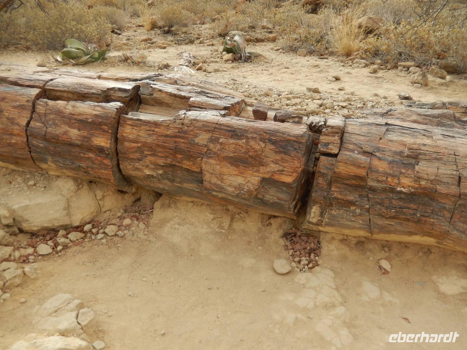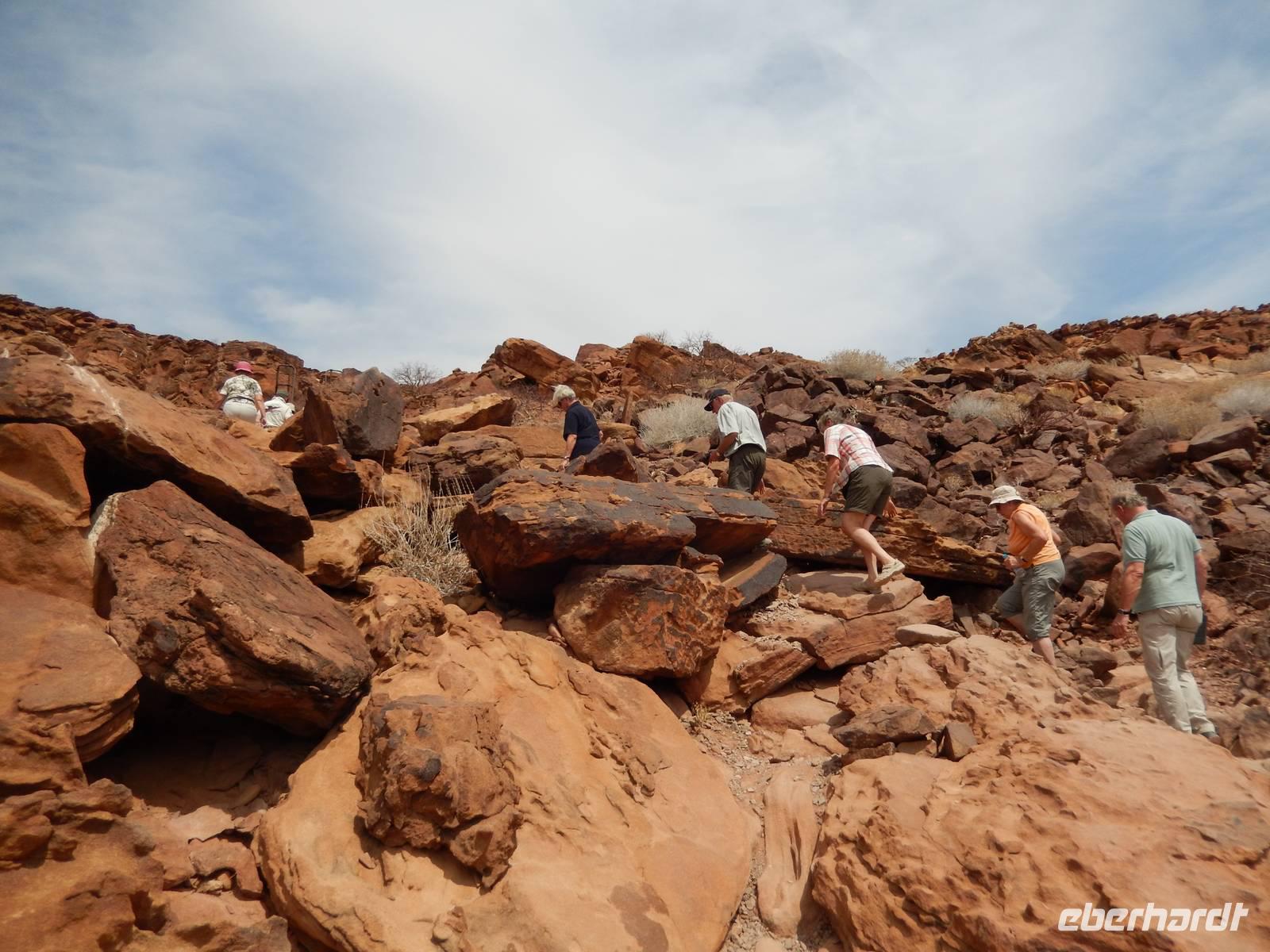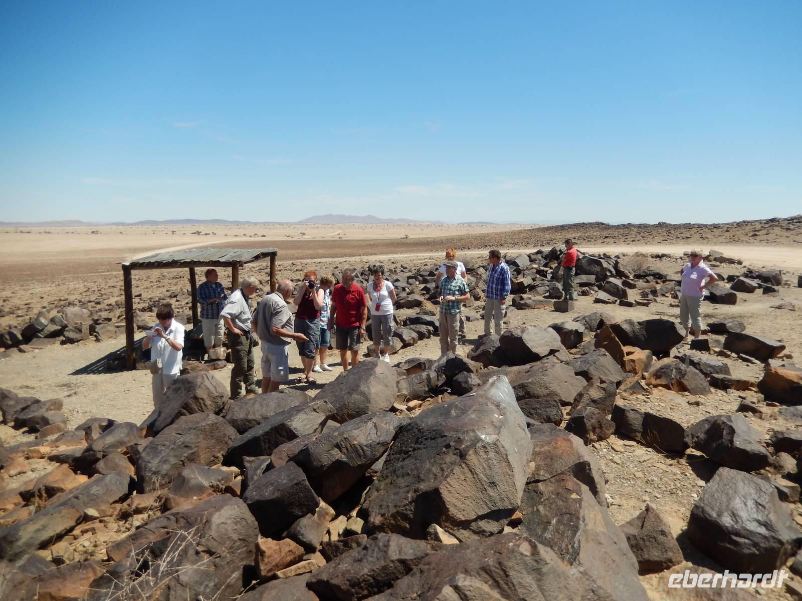 Kurz vor Khorixas, der staubigen Hauptstadt der Region, drehten wir links ab und eine Schotterpiste führte uns zur Hauptattraktion der Region. Wir besichtigten die mehr als 2.500 prähistorischen Felsgravuren von Twyfelfontein, die von der UNESCO zum Weltkulturerbe deklariert wurden. Die Hitze machte uns etwas zu schaffen, denn bei 43°C suchten wir uns ständig ein schattiges Plätzchen. Nachdem wir auch noch die Orgelpfeifen und den Verbrannten Berg besuchten, machten wir uns auf den Weg zum Versteinerten Wald. Mit unserer lustigen Führerin Susanna bestaunten wir die ca. 60 fossilen Baumstämme, die in einem Areal von ca. 300 mal 800 Metern verstreut liegen. Diese pflanzlichen Fossilien sind bis zu 30 Meter lang und haben dabei einen Umfang von bis zu sechs Metern. Berücksichtigt man die Schrumpfung, die die Bäume beim Prozess des Versteinerns erfahren haben, so darf davon ausgegangen werden, dass die Bäume zu Lebzeiten noch wesentlich imposanter in den Himmel ragten. Was wir heute dort sahen, hatte für uns Menschen ein unvorstellbares Alter zwischen 240 und 300 Millionen Jahren.