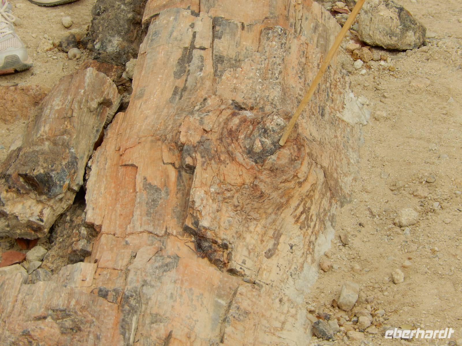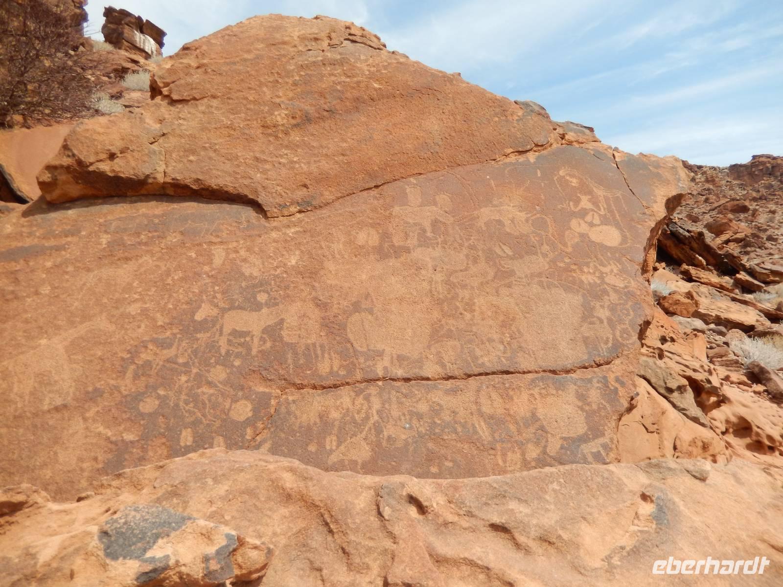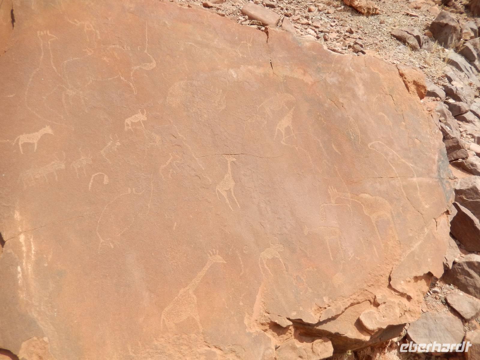 Kurz vor Khorixas, der staubigen Hauptstadt der Region, drehten wir links ab und eine Schotterpiste führte uns zur Hauptattraktion der Region. Wir besichtigten die mehr als 2.500 prähistorischen Felsgravuren von Twyfelfontein, die von der UNESCO zum Weltkulturerbe deklariert wurden. Die Hitze machte uns etwas zu schaffen, denn bei 43°C suchten wir uns ständig ein schattiges Plätzchen. Nachdem wir auch noch die Orgelpfeifen und den Verbrannten Berg besuchten, machten wir uns auf den Weg zum Versteinerten Wald. Mit unserer lustigen Führerin Susanna bestaunten wir die ca. 60 fossilen Baumstämme, die in einem Areal von ca. 300 mal 800 Metern verstreut liegen. Diese pflanzlichen Fossilien sind bis zu 30 Meter lang und haben dabei einen Umfang von bis zu sechs Metern. Berücksichtigt man die Schrumpfung, die die Bäume beim Prozess des Versteinerns erfahren haben, so darf davon ausgegangen werden, dass die Bäume zu Lebzeiten noch wesentlich imposanter in den Himmel ragten. Was wir heute dort sahen, hatte für uns Menschen ein unvorstellbares Alter zwischen 240 und 300 Millionen Jahren.