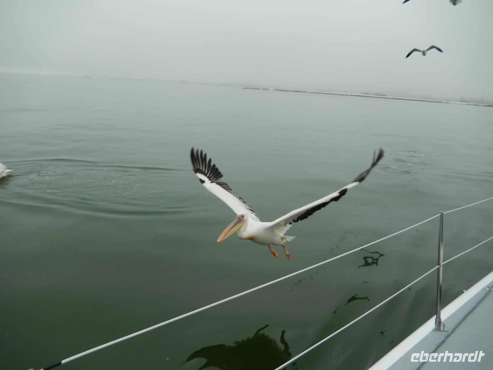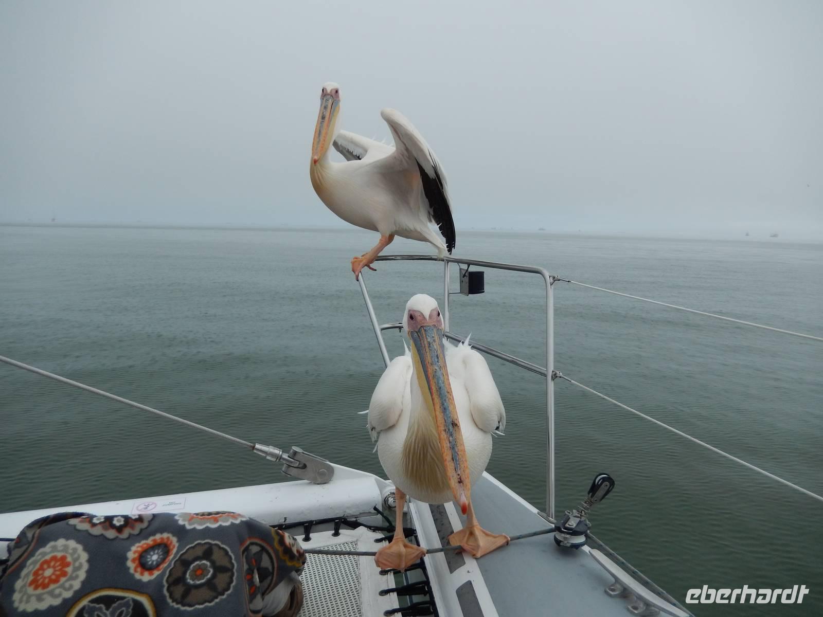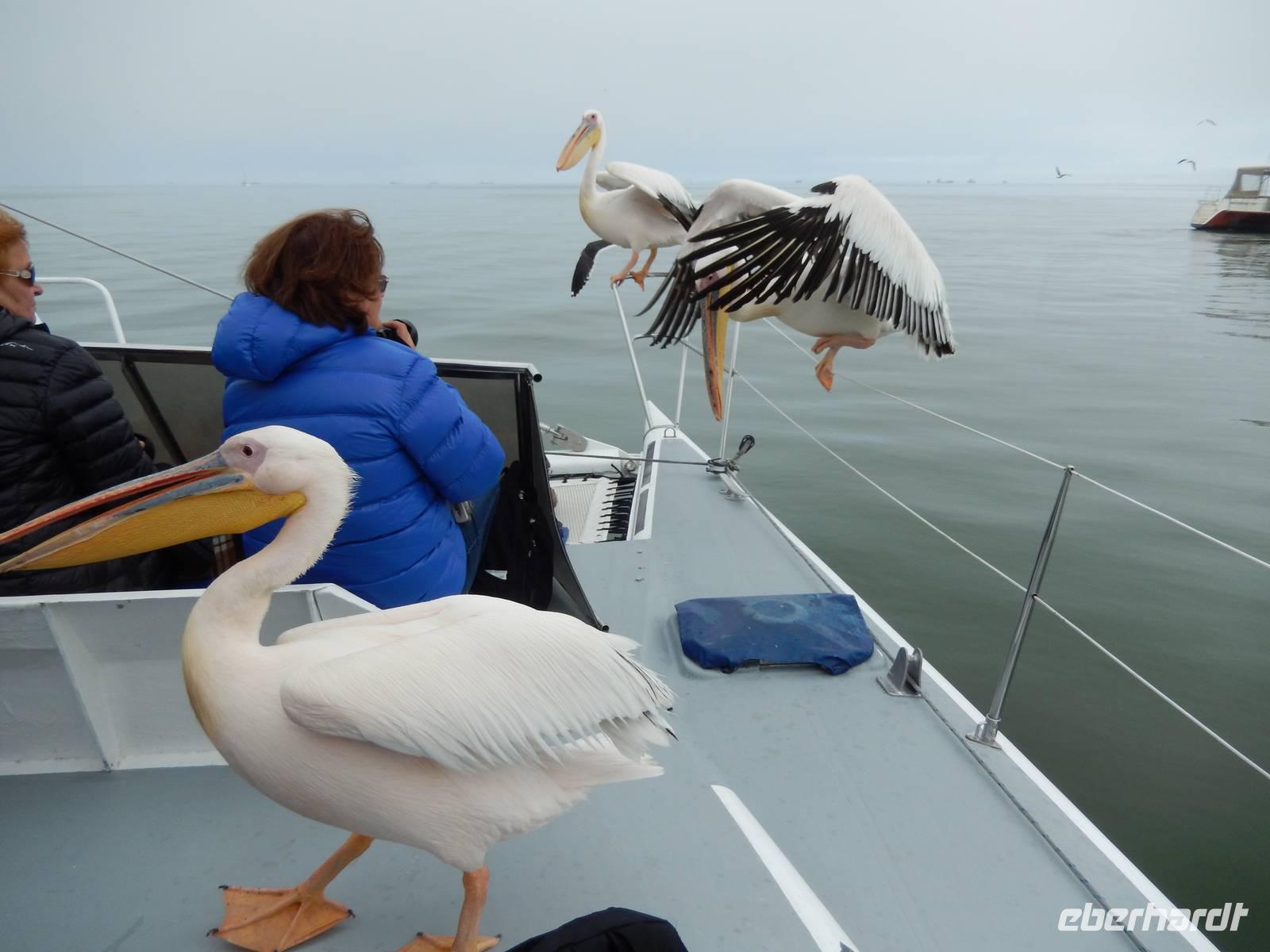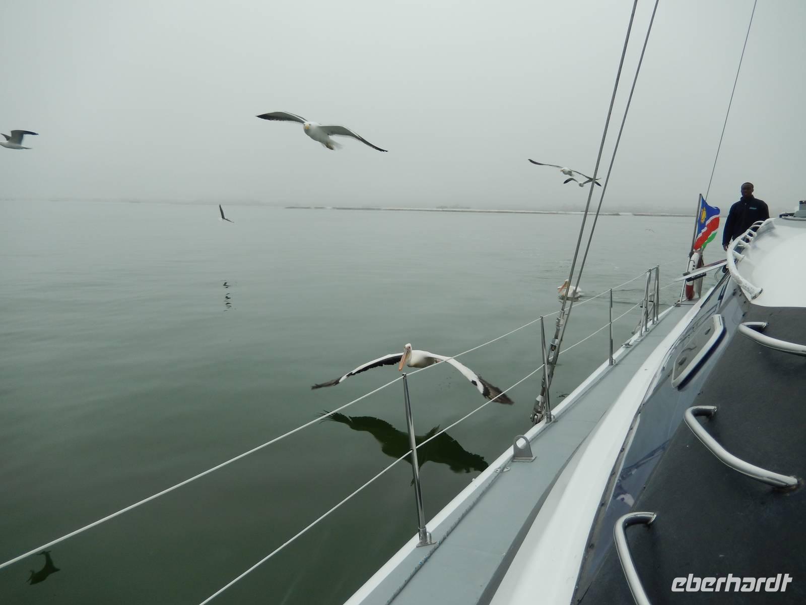 Es dauerte nicht lange und dann kam auch schon die "namibianische Luftwaffe" an Bord. Stattliche Pelikane, die mit einer Spannweite bis zu 3,50 Metern und einem Gewicht von 13 Kilo zu den schwersten flugfähigen Vögeln zählen, ließen sich auf unserer Reling nieder. Dann gesellten sich noch weitere Vögel wie Kormorane und Möwen hinzu. Von unserem Reiseleiter bekamen sie natürlich den geliebten Fisch! Die Sonne zeigte sich nun auch und die Decken und dicken Jacken waren überflüssig. Der von der Besatzung gereichte Sherry tat sein übriges.