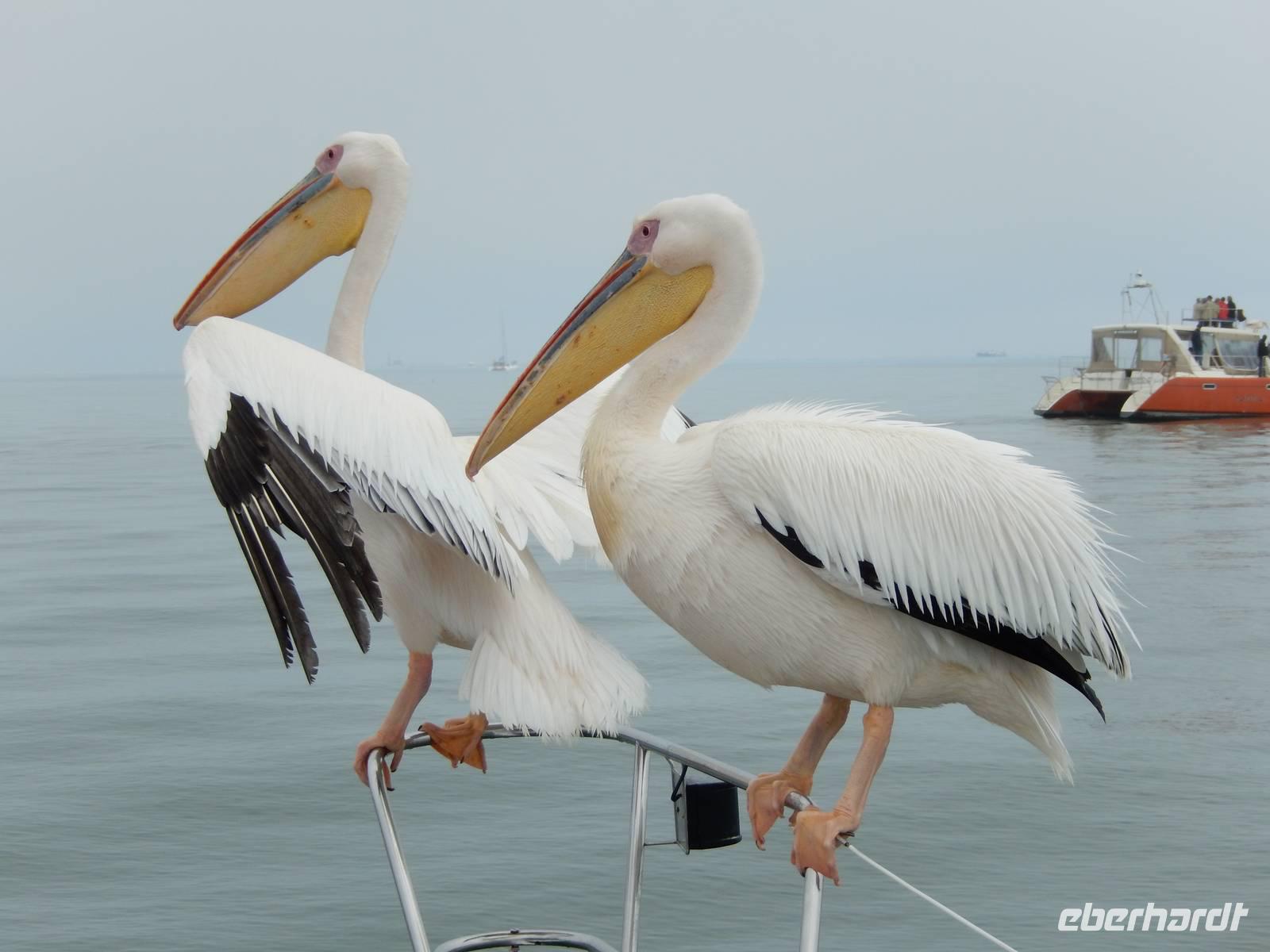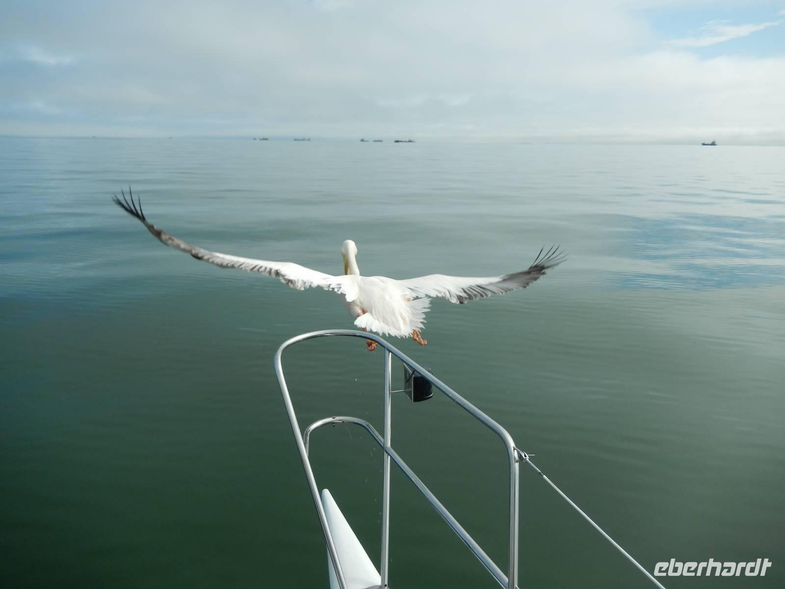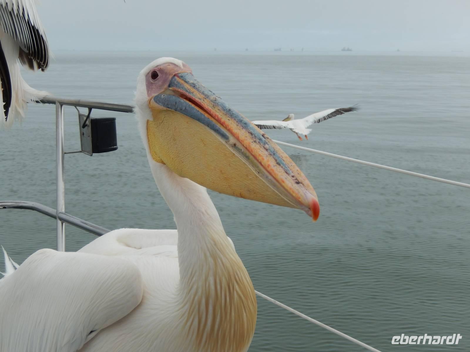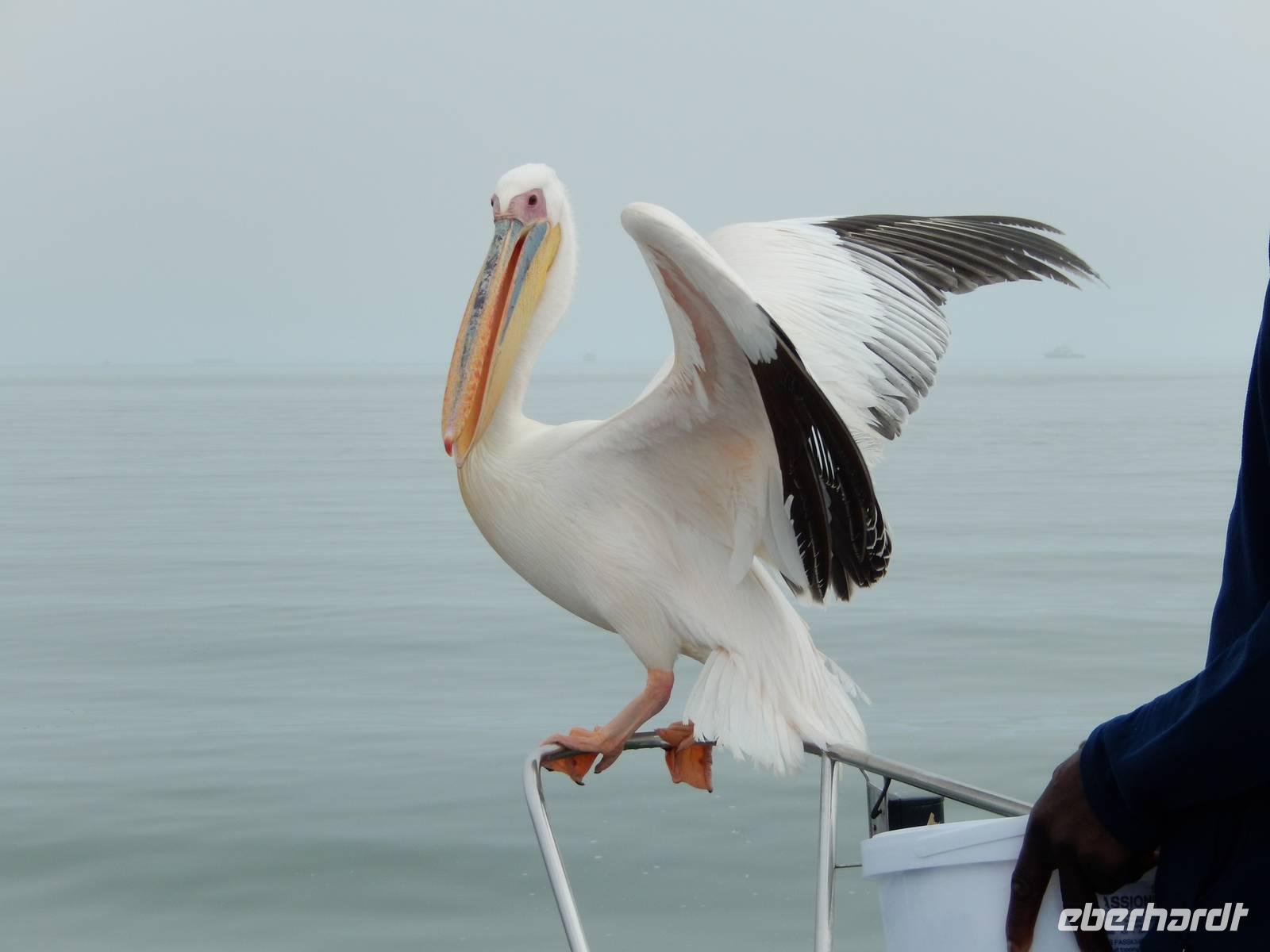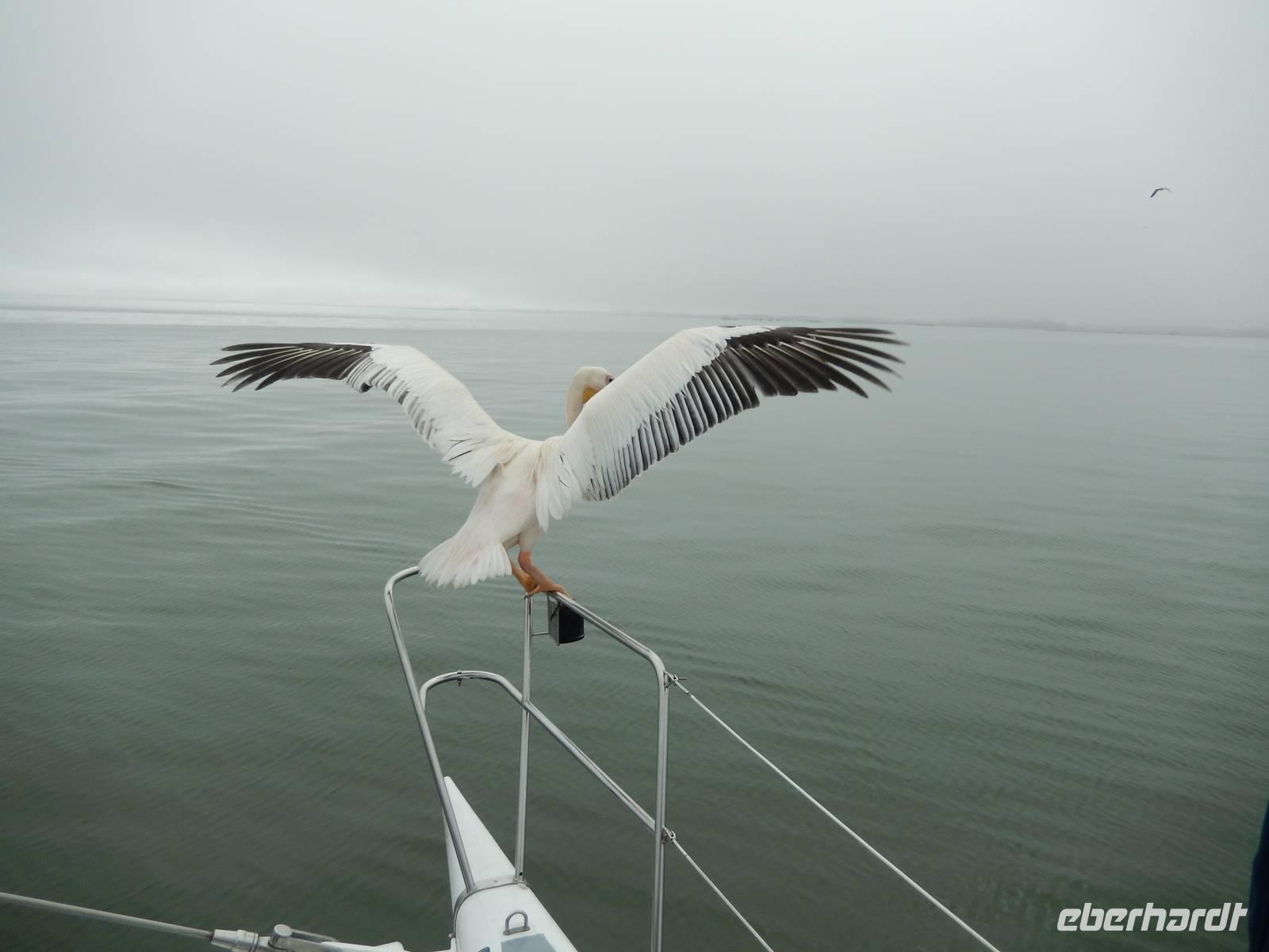 Es dauerte nicht lange und dann kam auch schon die "namibianische Luftwaffe" an Bord. Stattliche Pelikane, die mit einer Spannweite bis zu 3,50 Metern und einem Gewicht von 13 Kilo zu den schwersten flugfähigen Vögeln zählen, ließen sich auf unserer Reling nieder. Dann gesellten sich noch weitere Vögel wie Kormorane und Möwen hinzu. Von unserem Reiseleiter bekamen sie natürlich den geliebten Fisch! Die Sonne zeigte sich nun auch und die Decken und dicken Jacken waren überflüssig. Der von der Besatzung gereichte Sherry tat sein übriges.