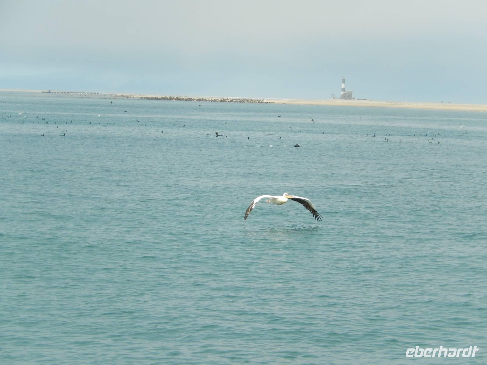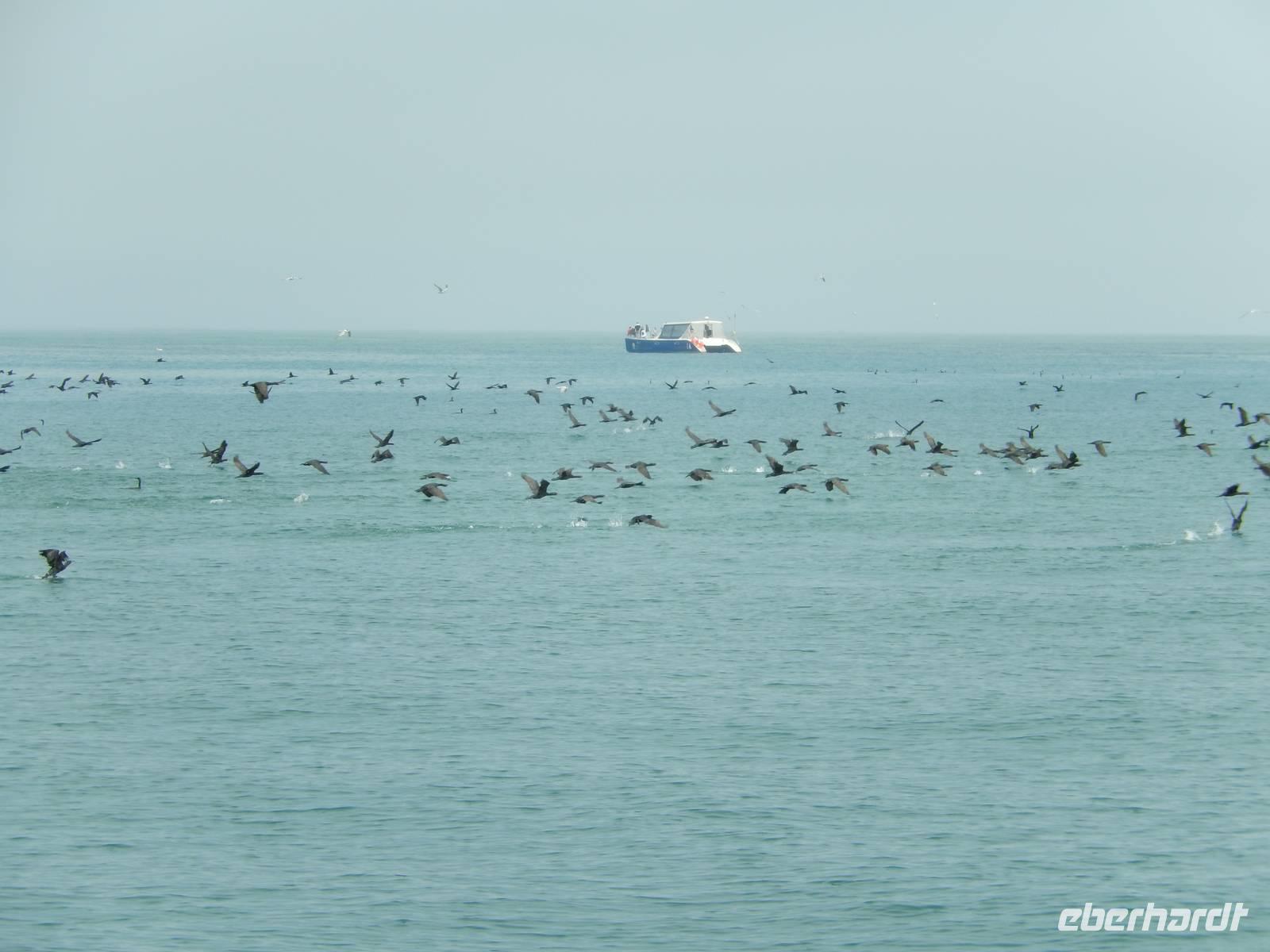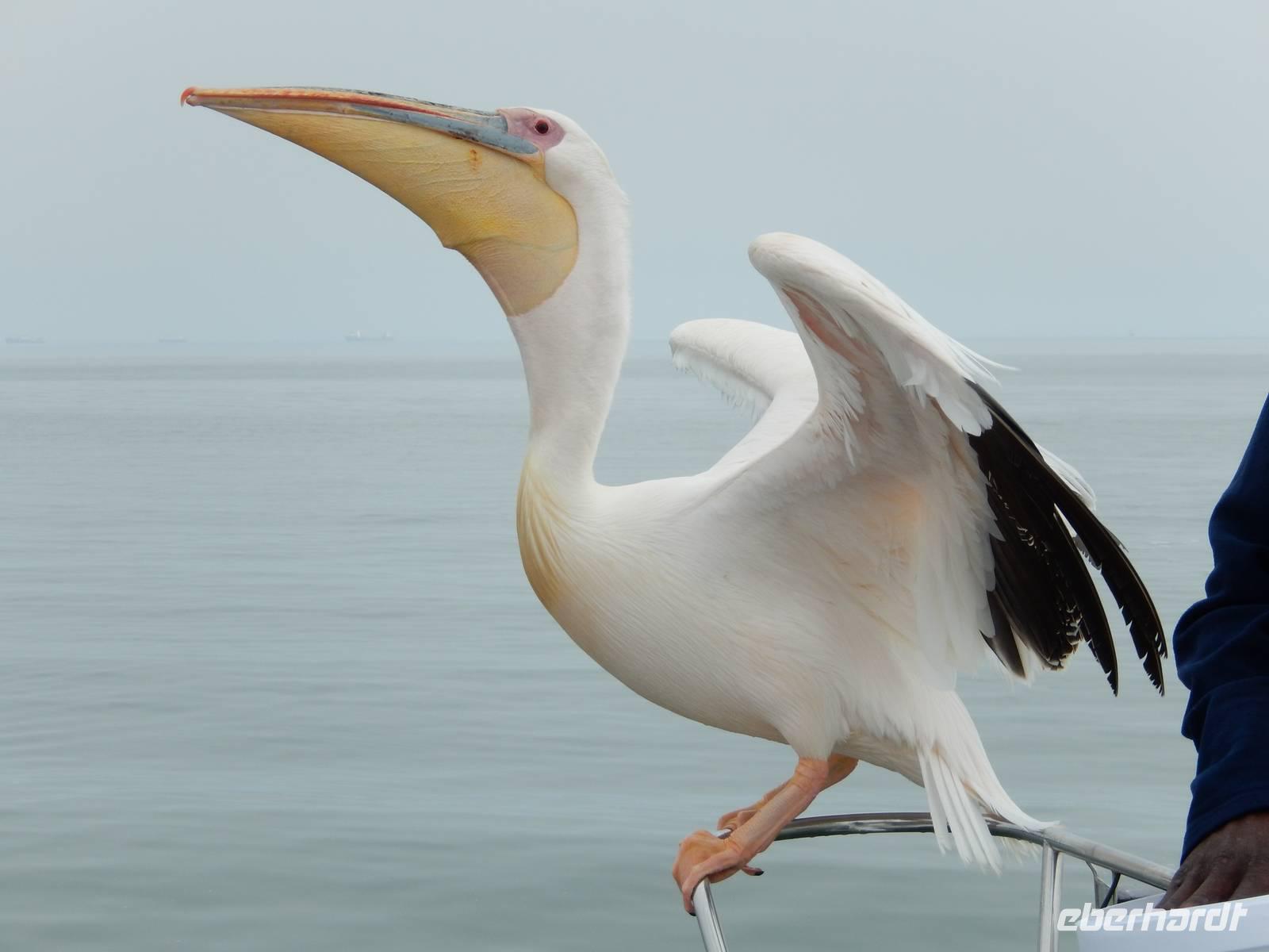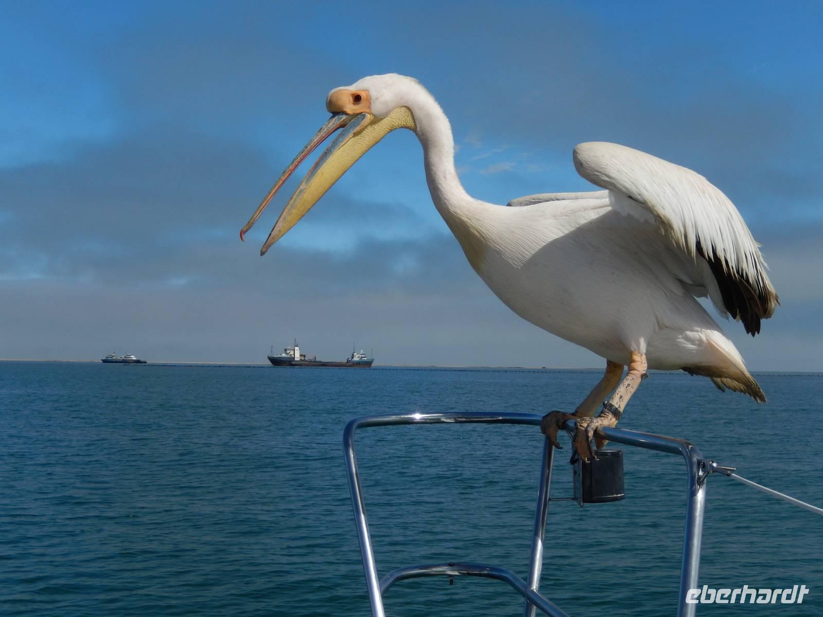 Es dauerte nicht lange und dann kam auch schon die "namibianische Luftwaffe" an Bord. Stattliche Pelikane, die mit einer Spannweite bis zu 3,50 Metern und einem Gewicht von 13 Kilo zu den schwersten flugfähigen Vögeln zählen, ließen sich auf unserer Reling nieder. Dann gesellten sich noch weitere Vögel wie Kormorane und Möwen hinzu. Von unserem Reiseleiter bekamen sie natürlich den geliebten Fisch! Die Sonne zeigte sich nun auch und die Decken und dicken Jacken waren überflüssig. Der von der Besatzung gereichte Sherry tat sein übriges.