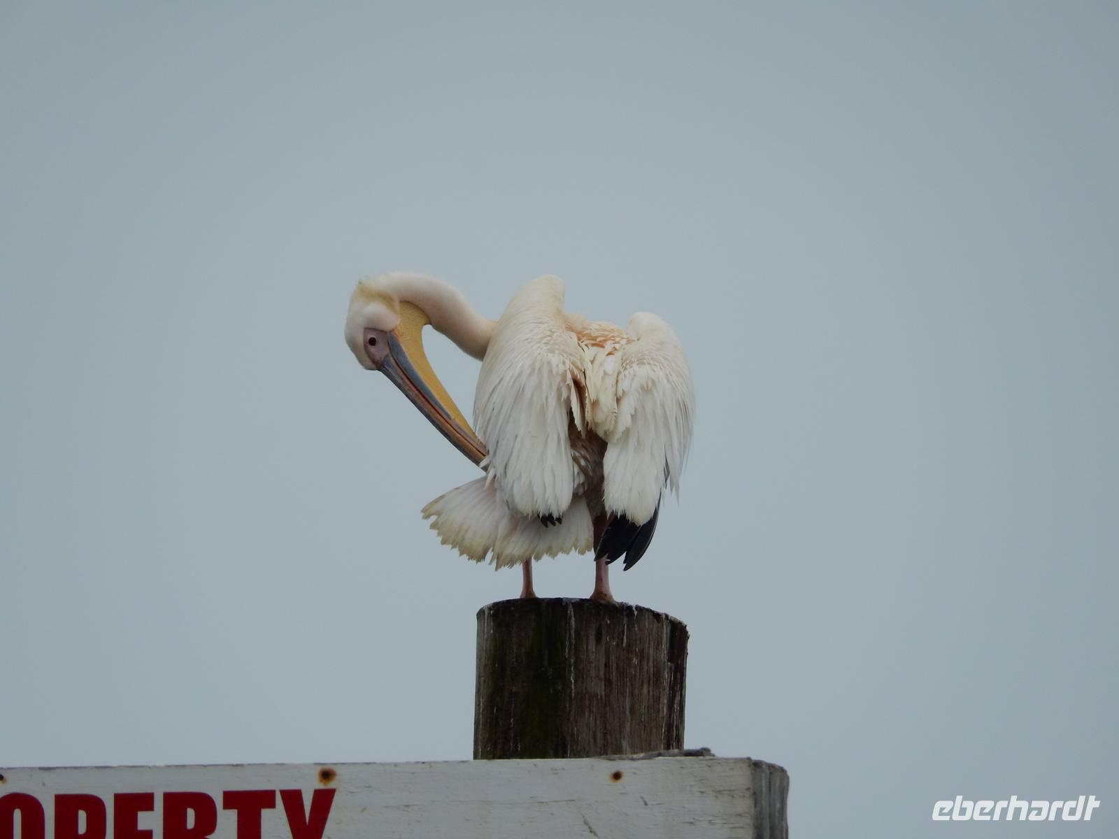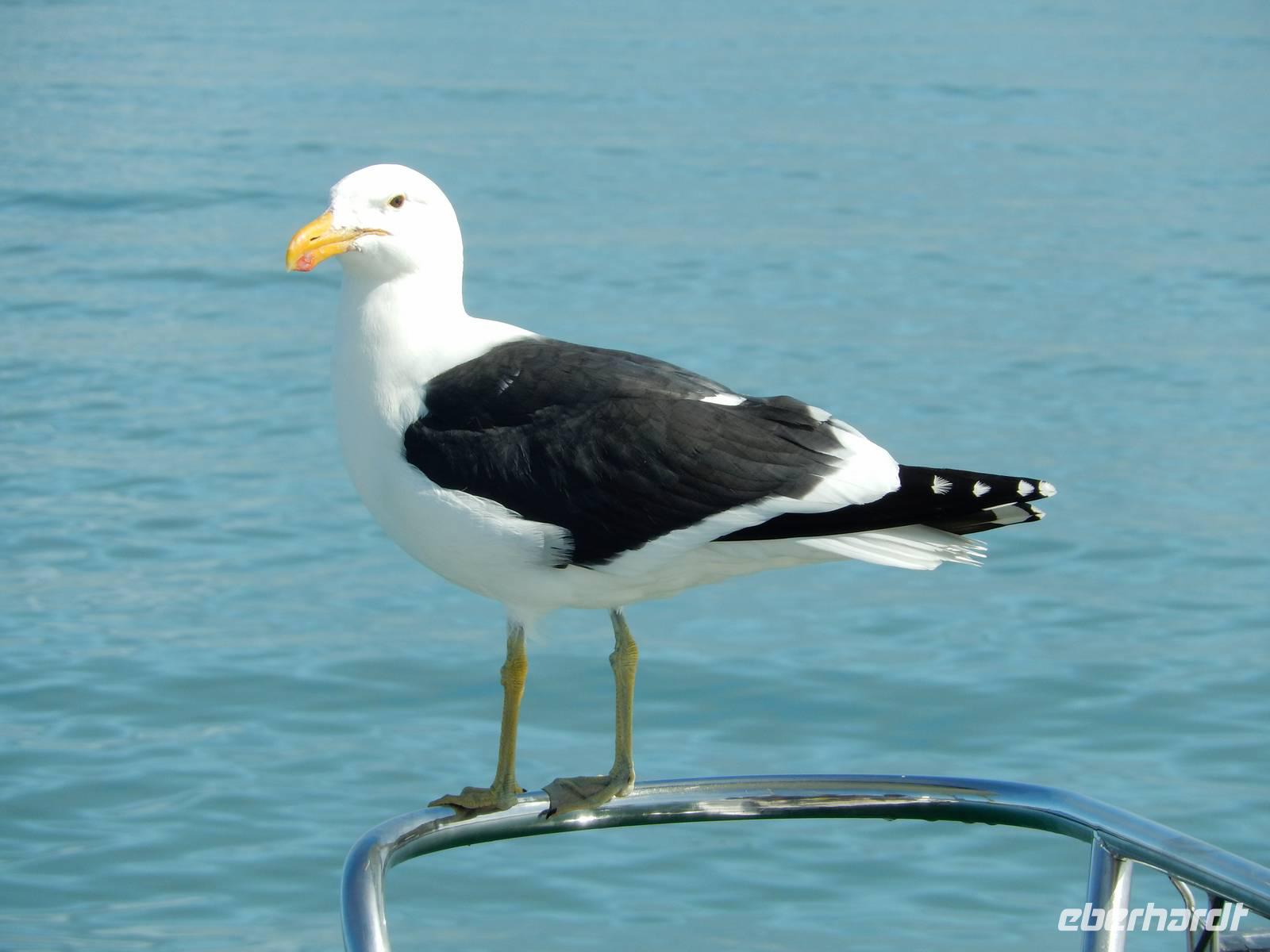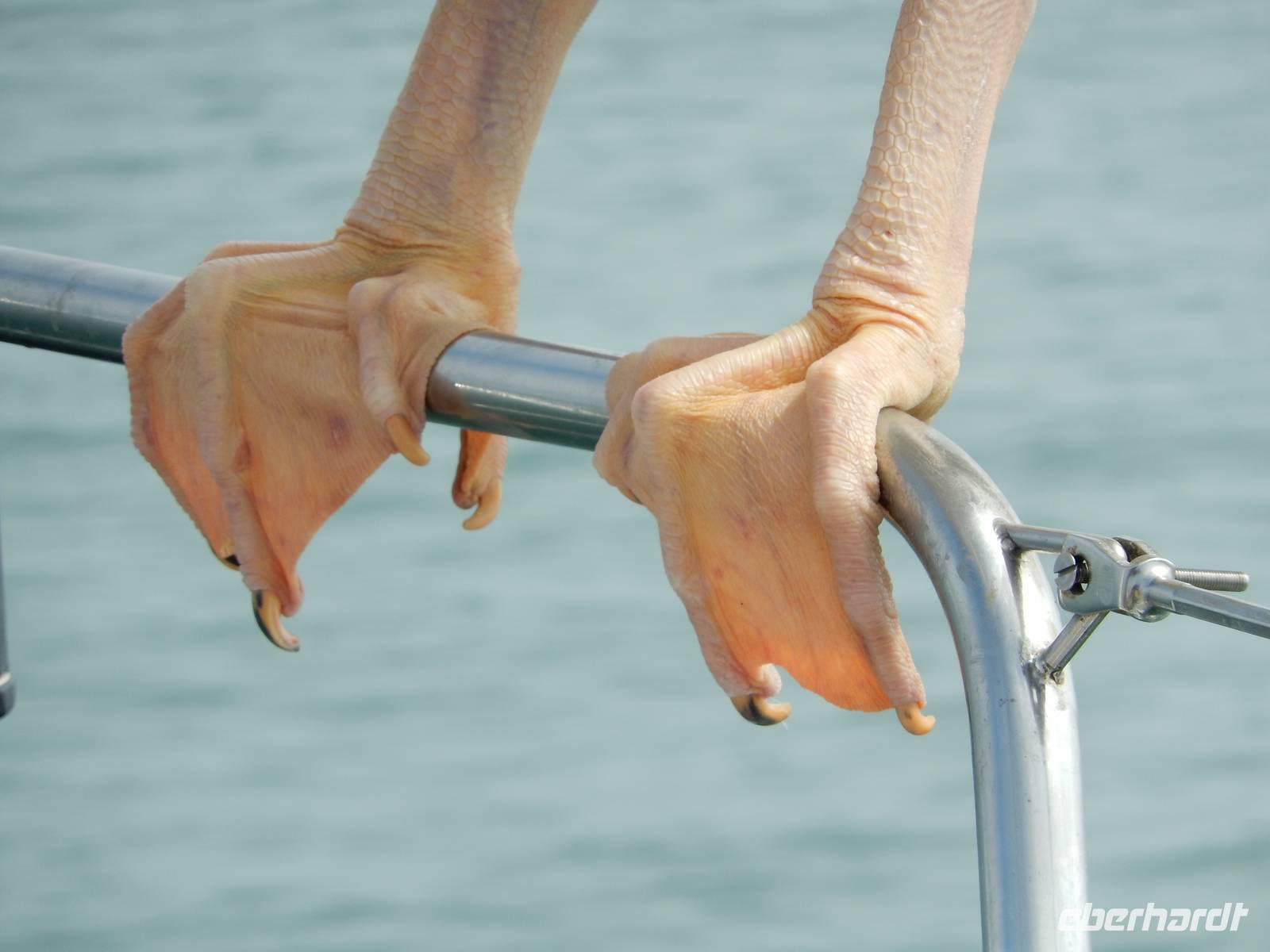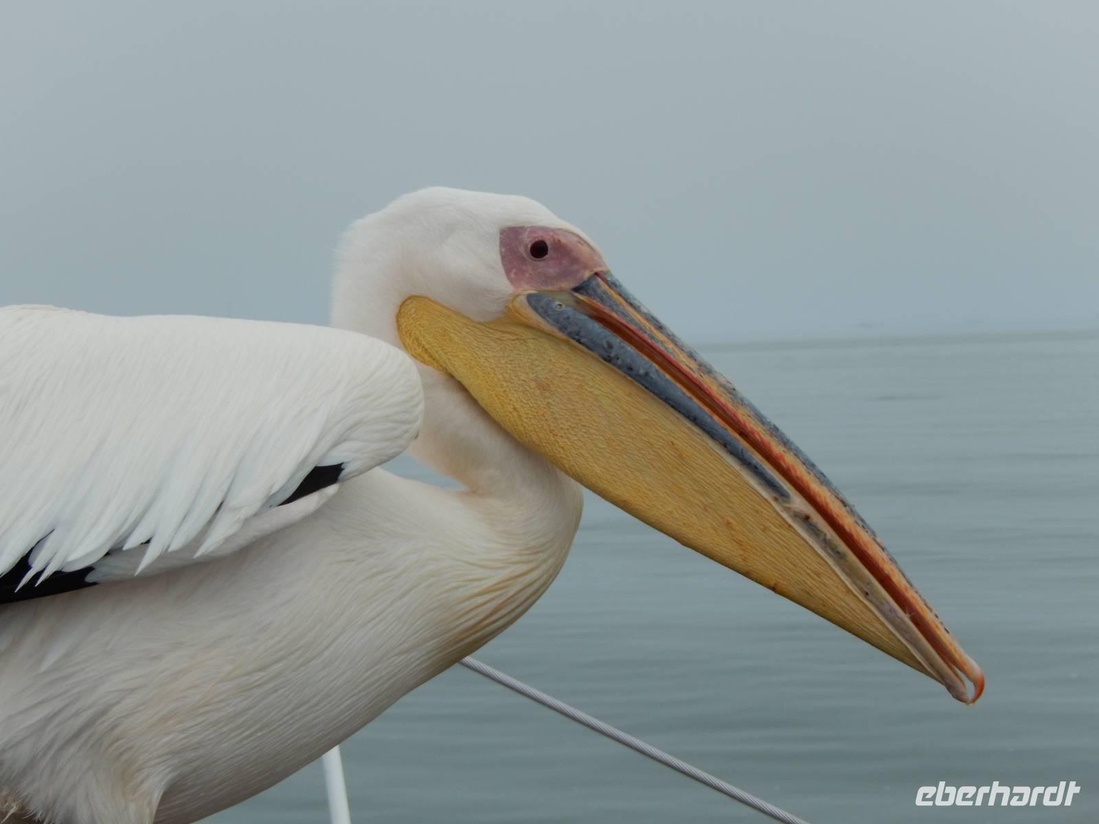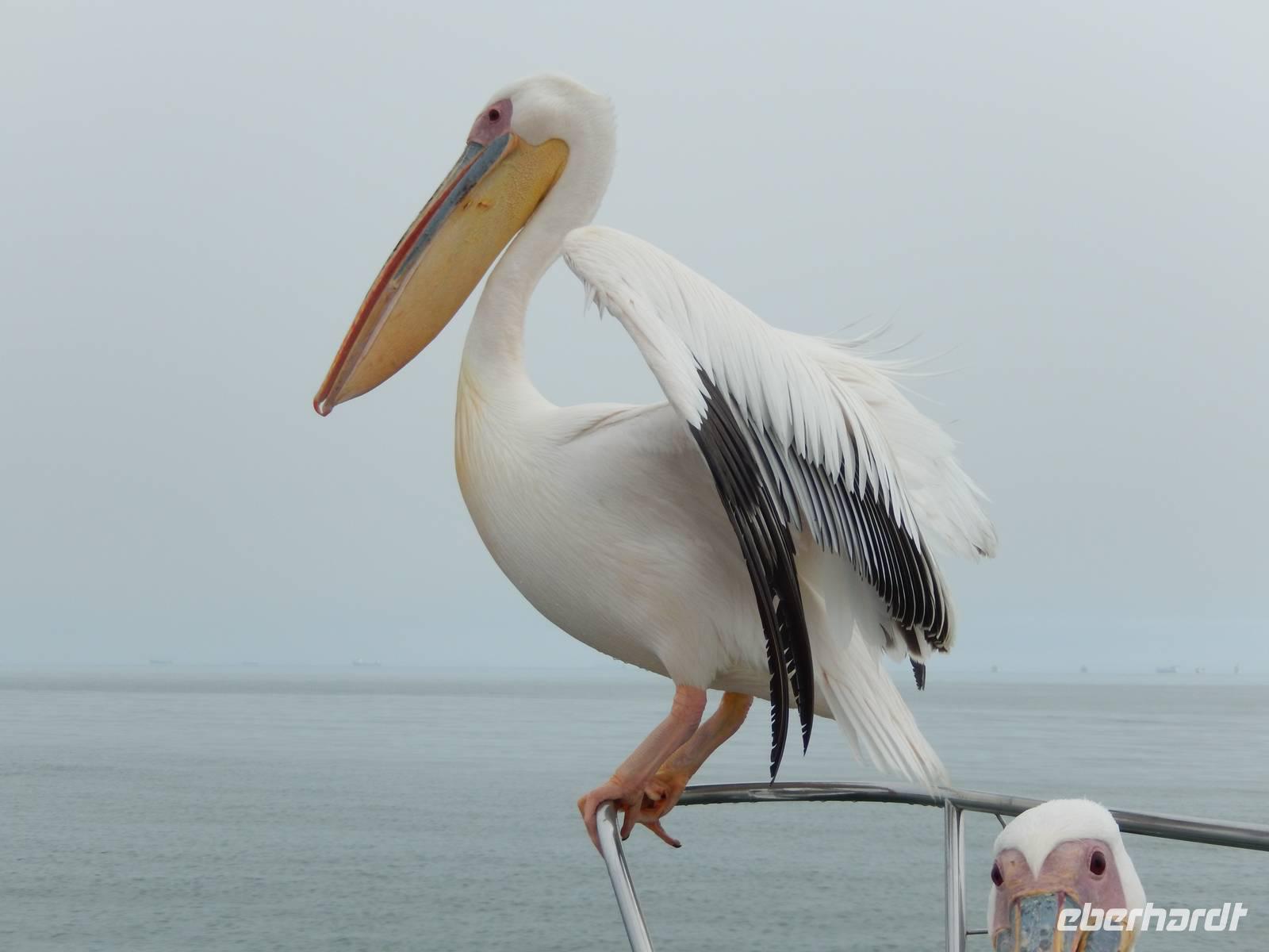 Es dauerte nicht lange und dann kam auch schon die "namibianische Luftwaffe" an Bord. Stattliche Pelikane, die mit einer Spannweite bis zu 3,50 Metern und einem Gewicht von 13 Kilo zu den schwersten flugfähigen Vögeln zählen, ließen sich auf unserer Reling nieder. Dann gesellten sich noch weitere Vögel wie Kormorane und Möwen hinzu. Von unserem Reiseleiter bekamen sie natürlich den geliebten Fisch! Die Sonne zeigte sich nun auch und die Decken und dicken Jacken waren überflüssig. Der von der Besatzung gereichte Sherry tat sein übriges.