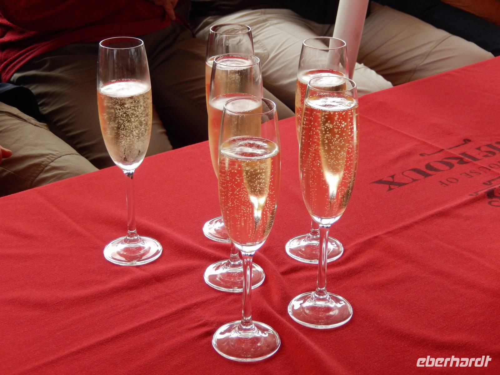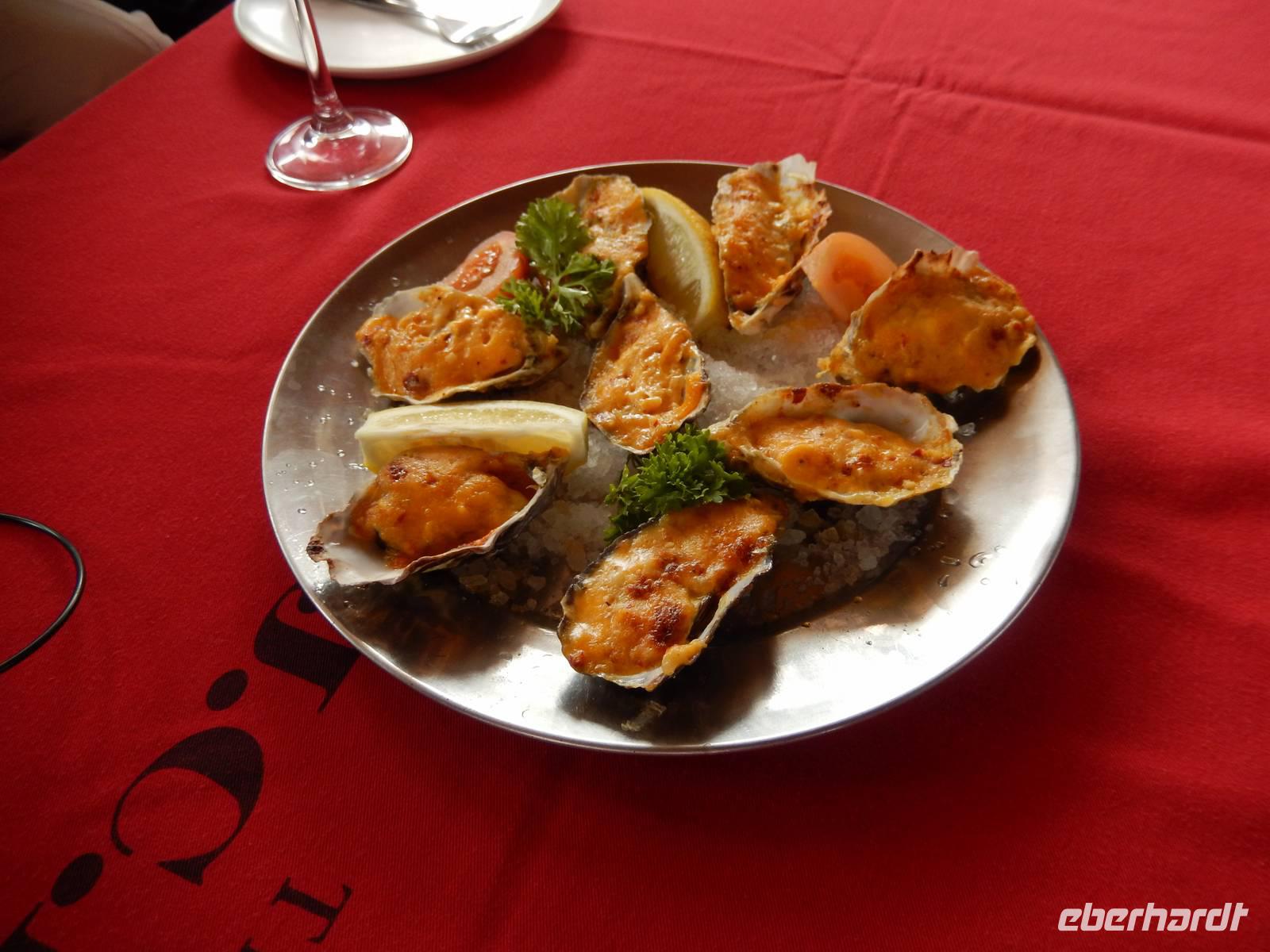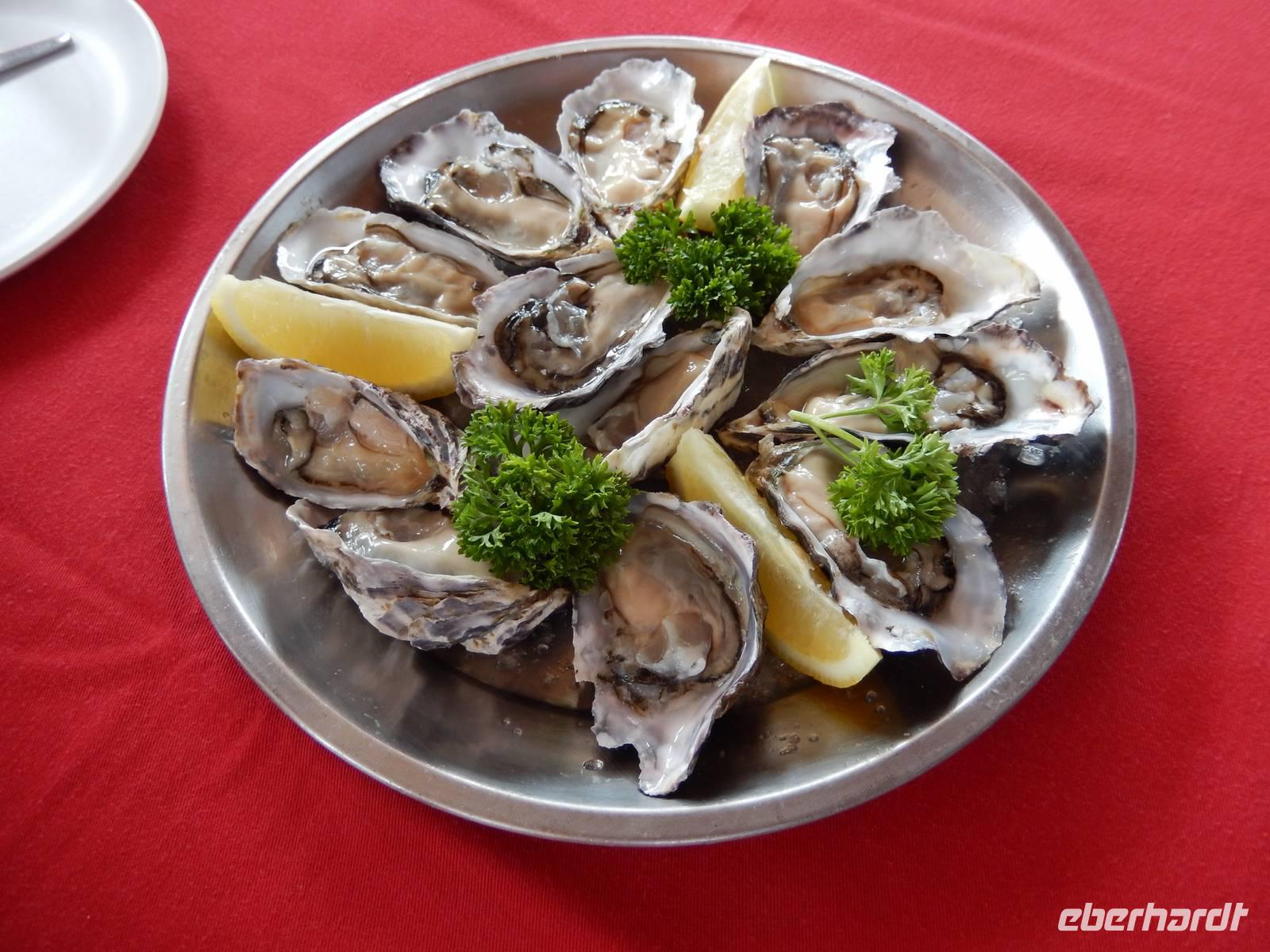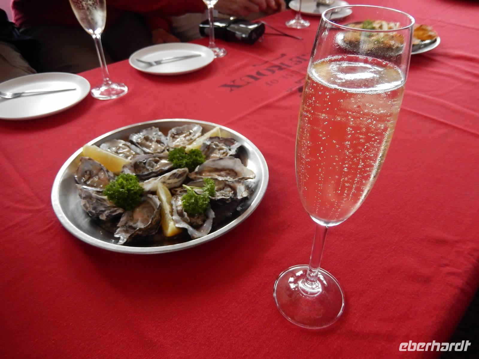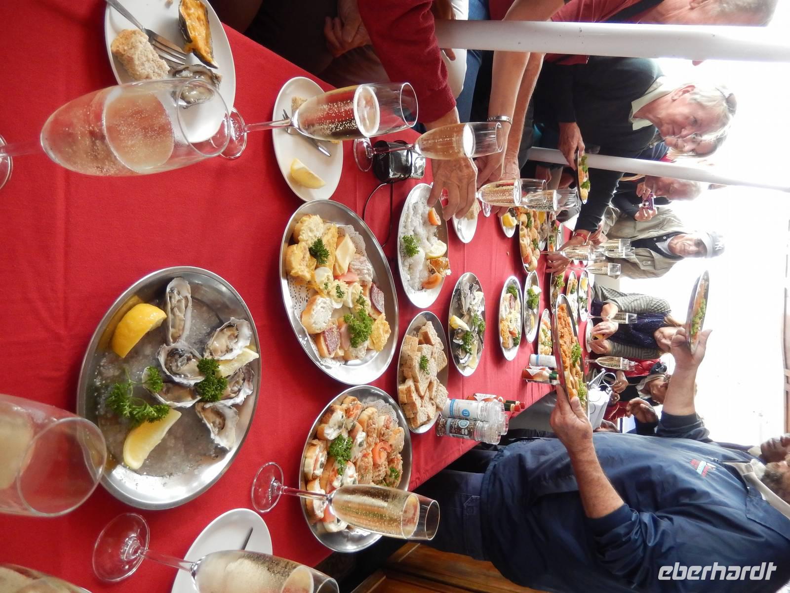 In der Zwischenzeit, wir waren ja alle mit Fotografieren und Ausschau halten beschäftigt, zauberte die Crew einen leckeren Mittagsimbiss mit frischen Austern, überbackenen Austern, diversen Meerestierchen und belegten Brötchen. Die Champagnergläser waren gut gefüllt und einem guten Austernessen stand nichts im Wege!